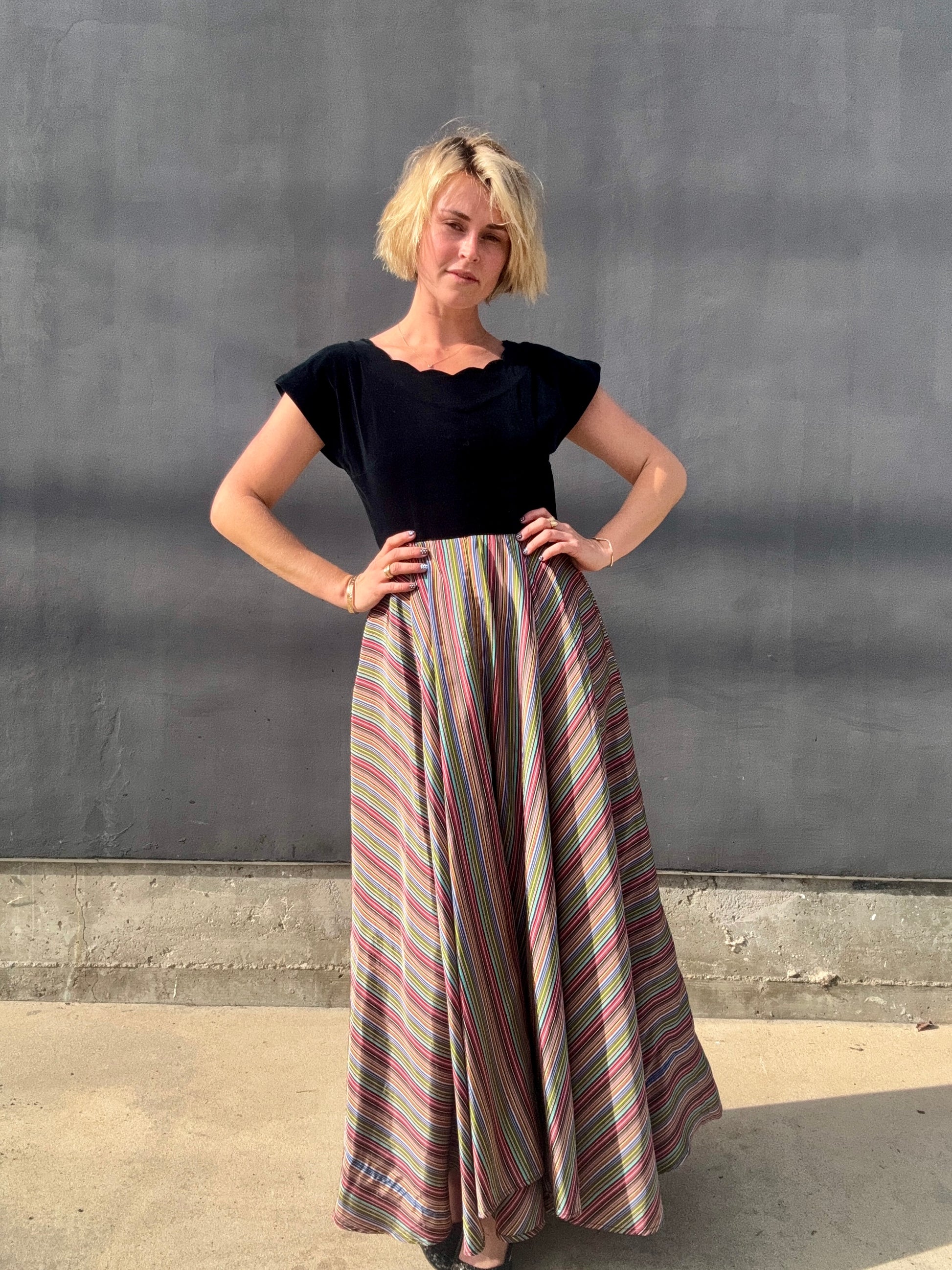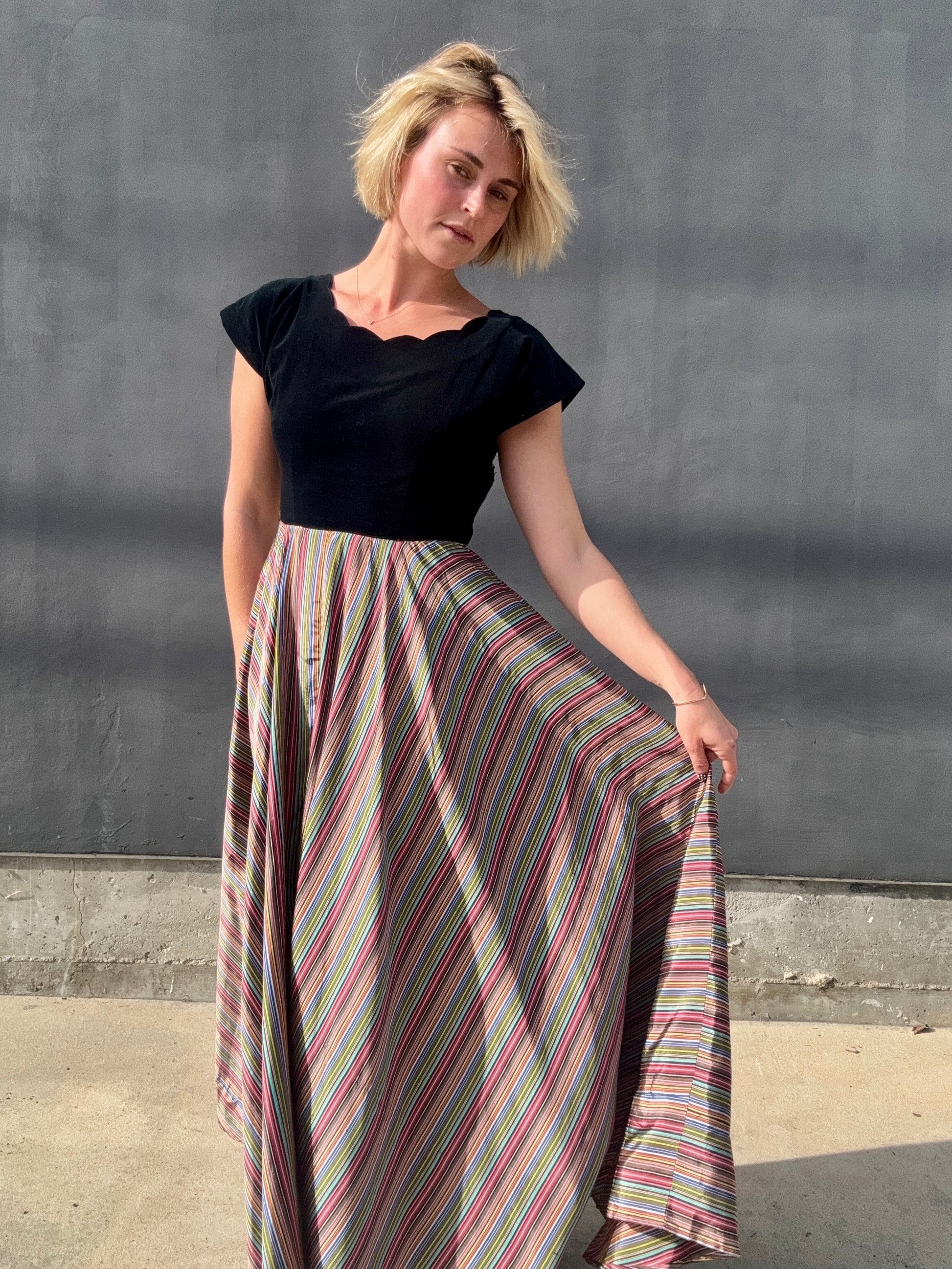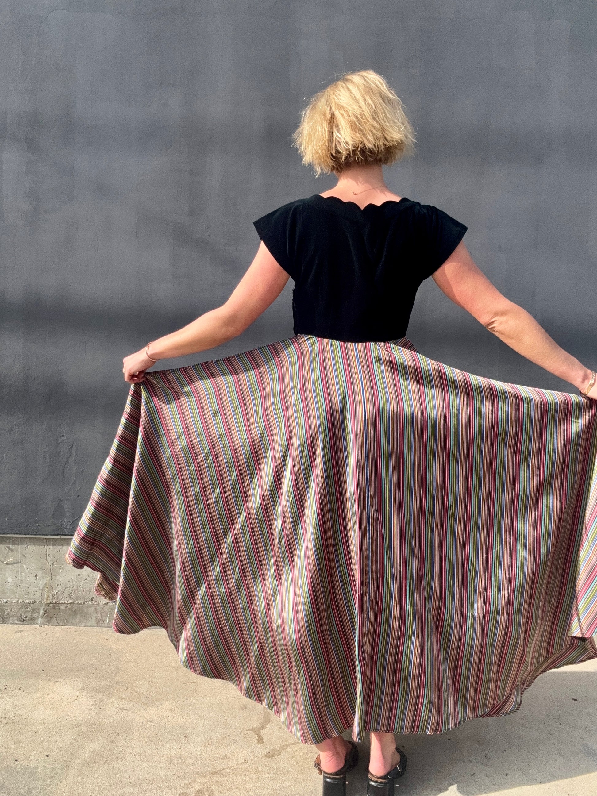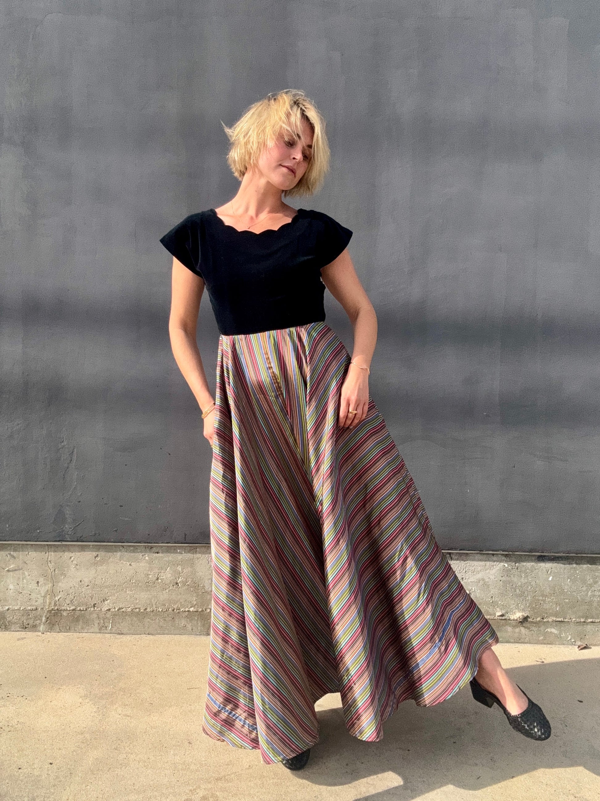 The skirt has these beautiful multicolored diagonal stripes that catch the light and move so effortlessly when you walk (or dance). The contrast between the plush velvet top and the crisp, swishy skirt feels playful, bold, and really special.