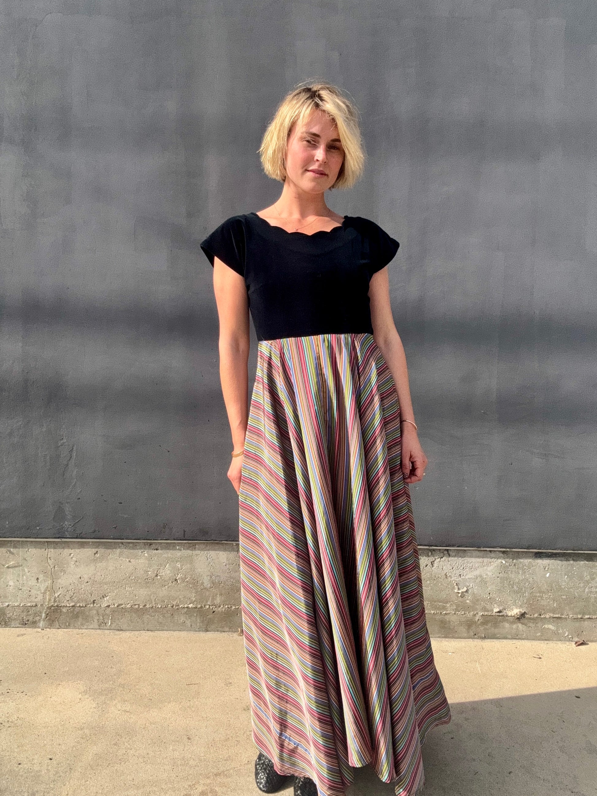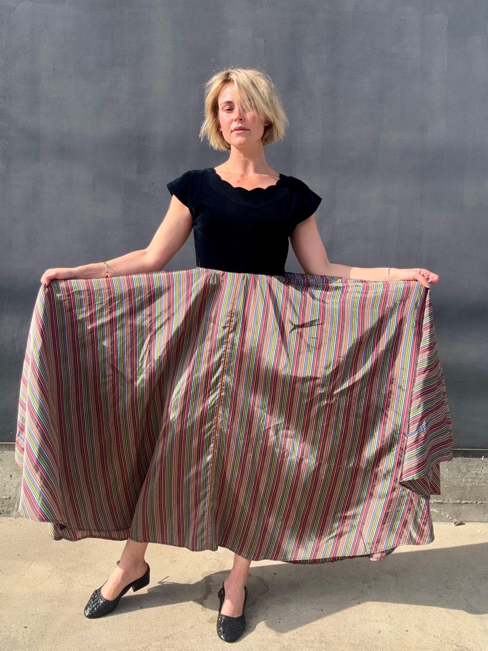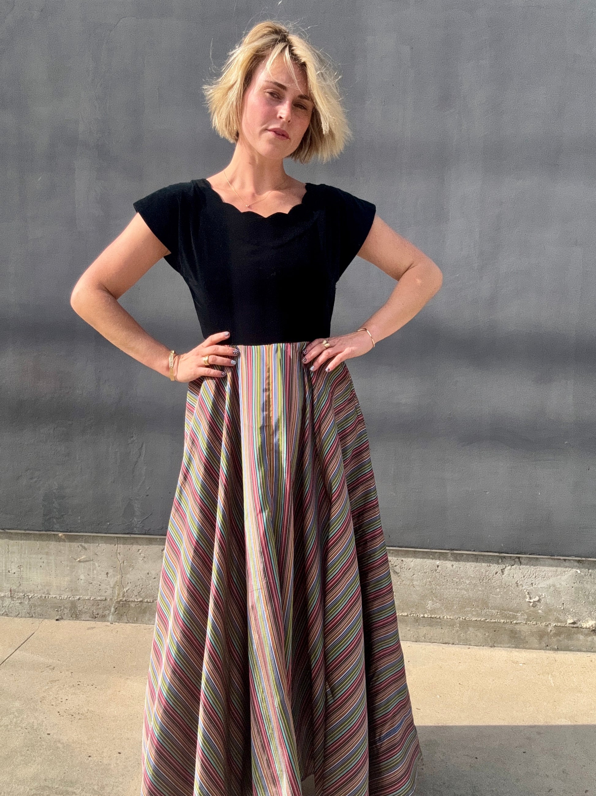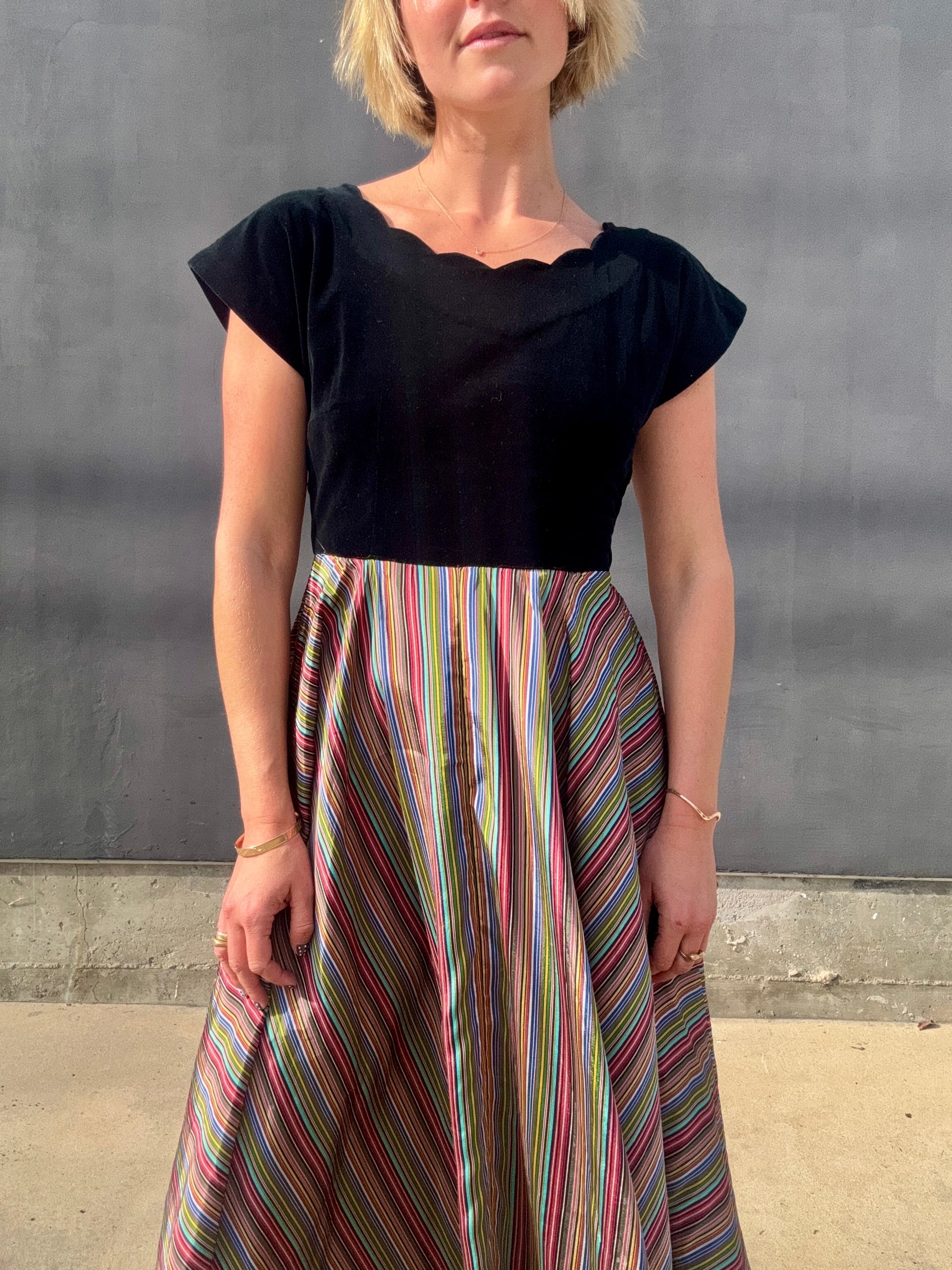 The skirt has these beautiful multicolored diagonal stripes that catch the light and move so effortlessly when you walk (or dance). The contrast between the plush velvet top and the crisp, swishy skirt feels playful, bold, and really special.