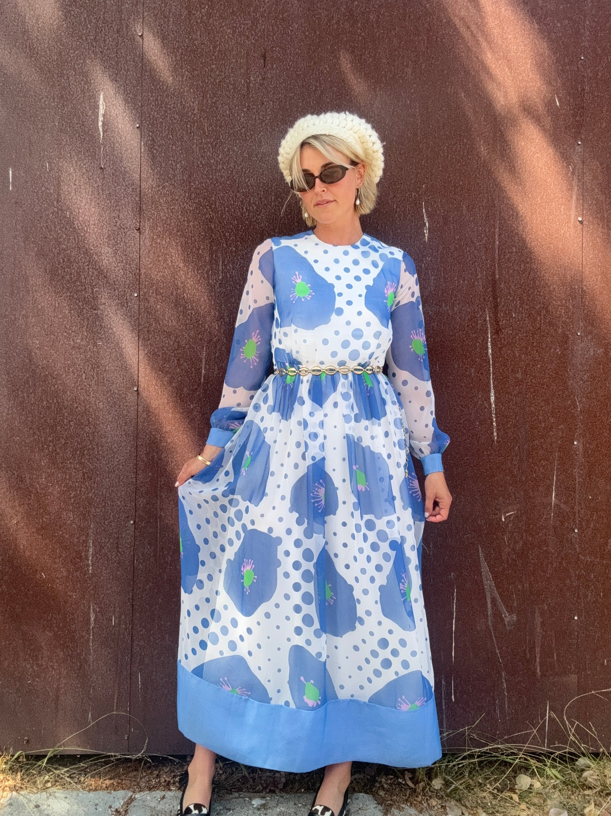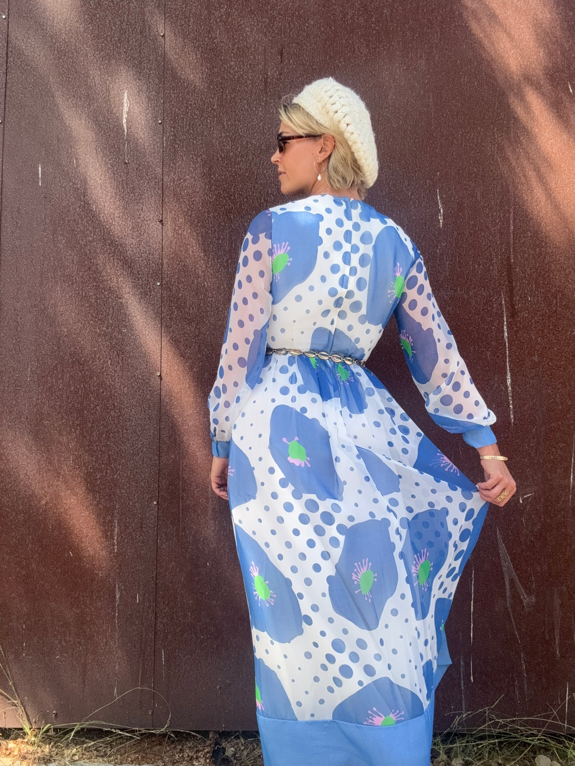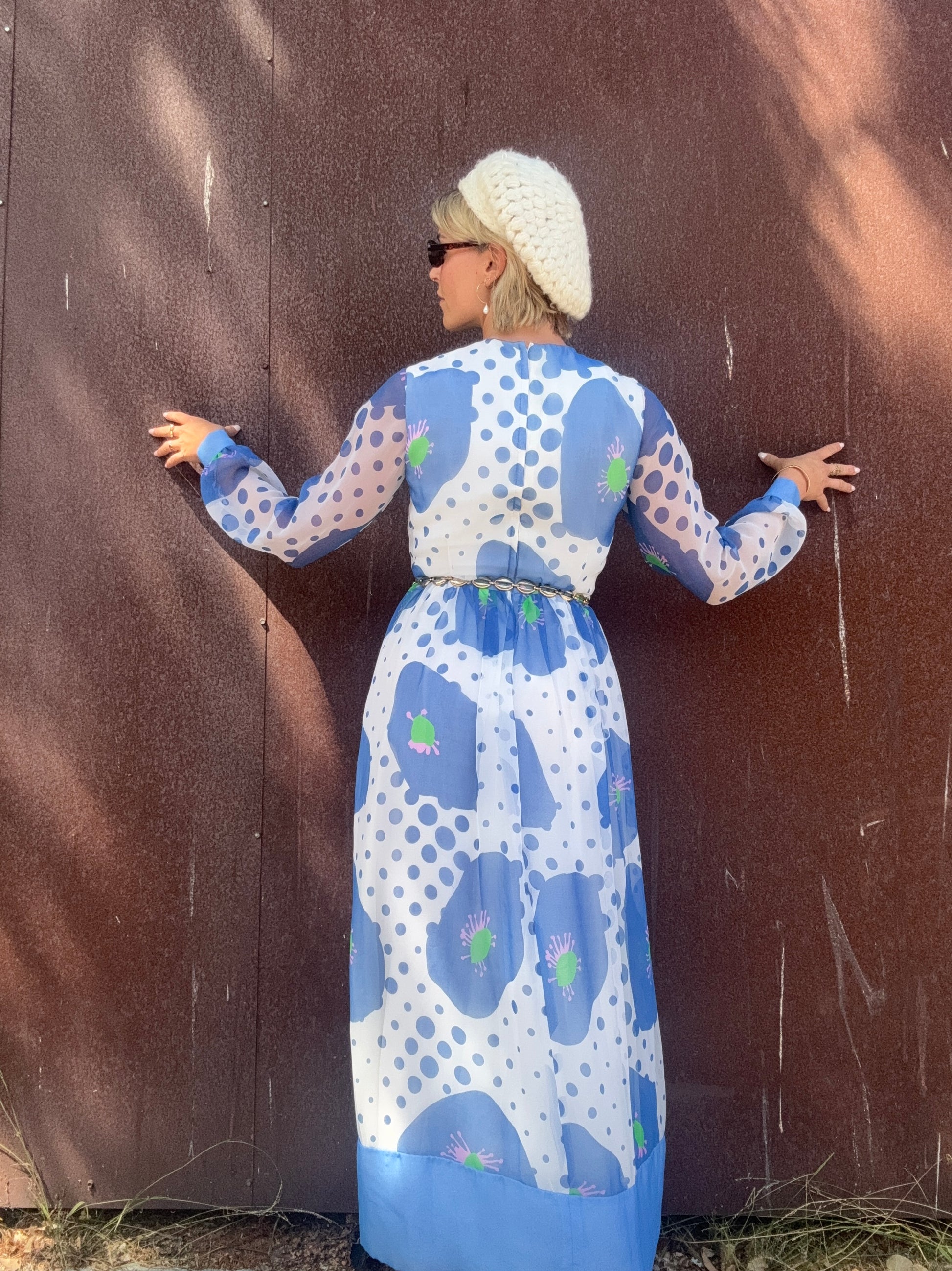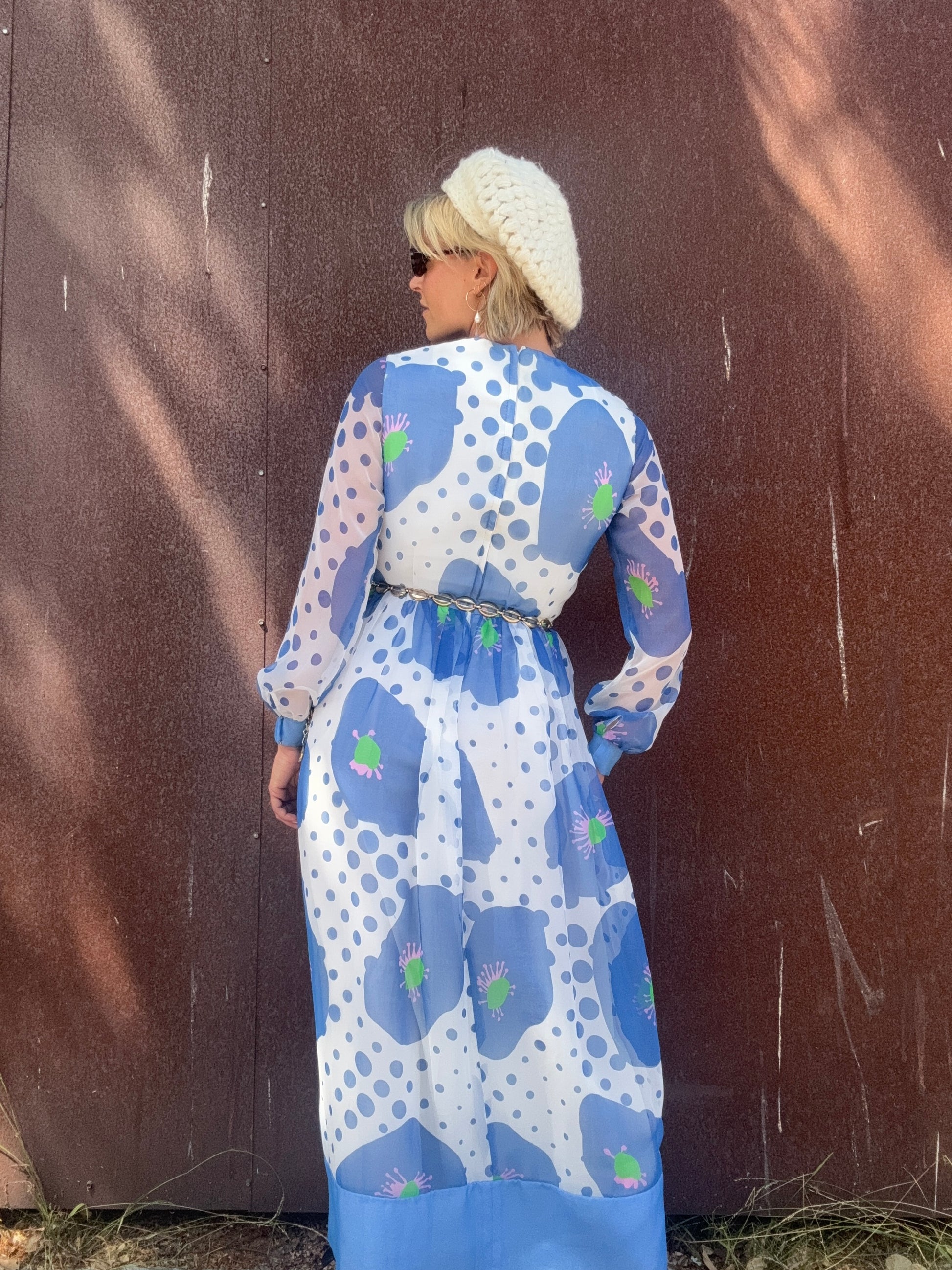 The Alice 1970s Handmade Maxi Dress is a study in playful contrasts, with oversized blue florals layered against scattered polka dots. A back zipper closure secures the silhouette, while the body is lined for coverage and the long sleeves remain fully sheer. The dress finishes with a solid blue hem and cuffs that ground its airy print. Style her with metallic hoops and a sleek clutch for an artful look that moves easily from day to evening. This would also be stunning layered with some tights, boots, and a coat or shag vest as we transition into Fall.