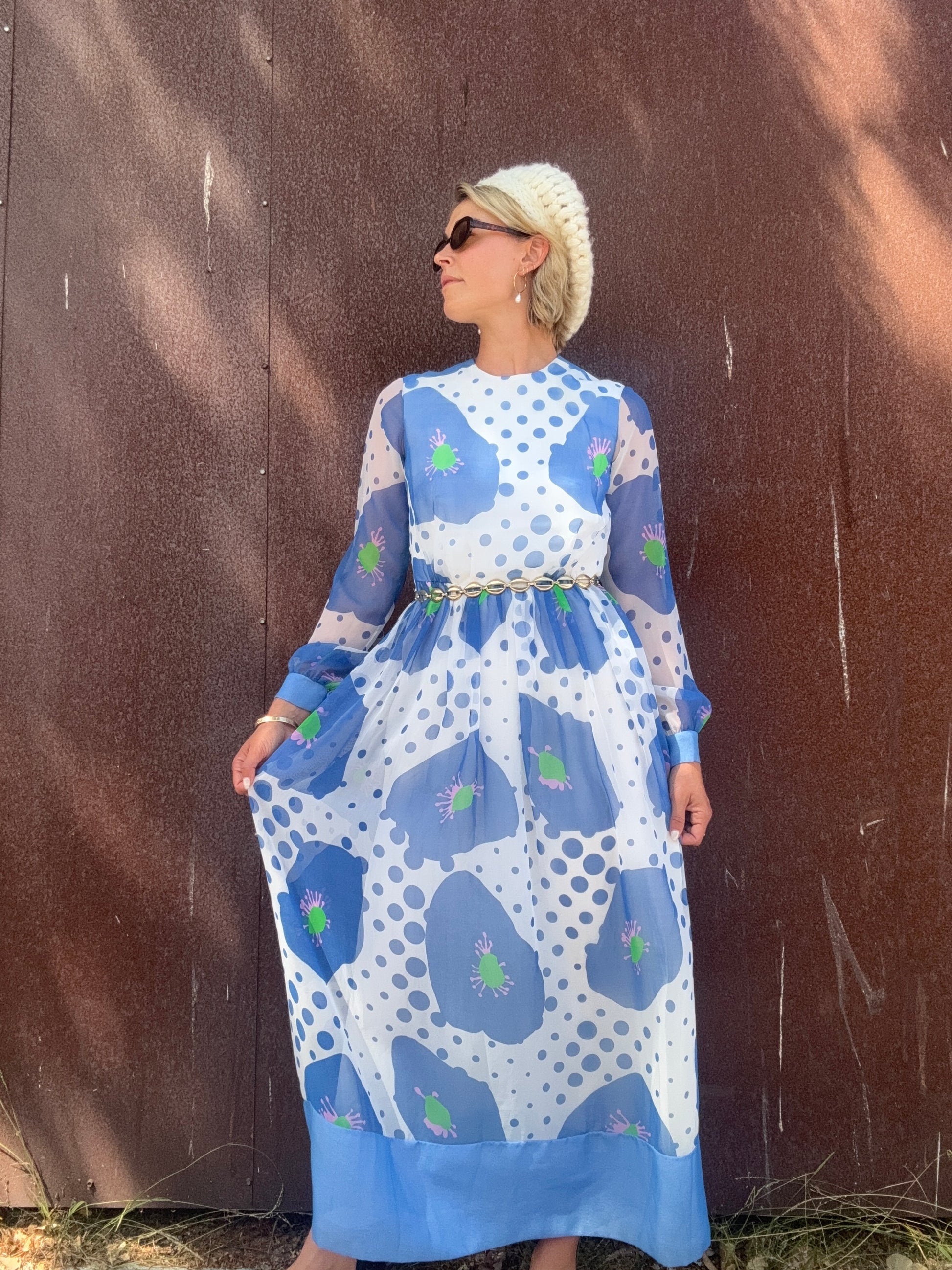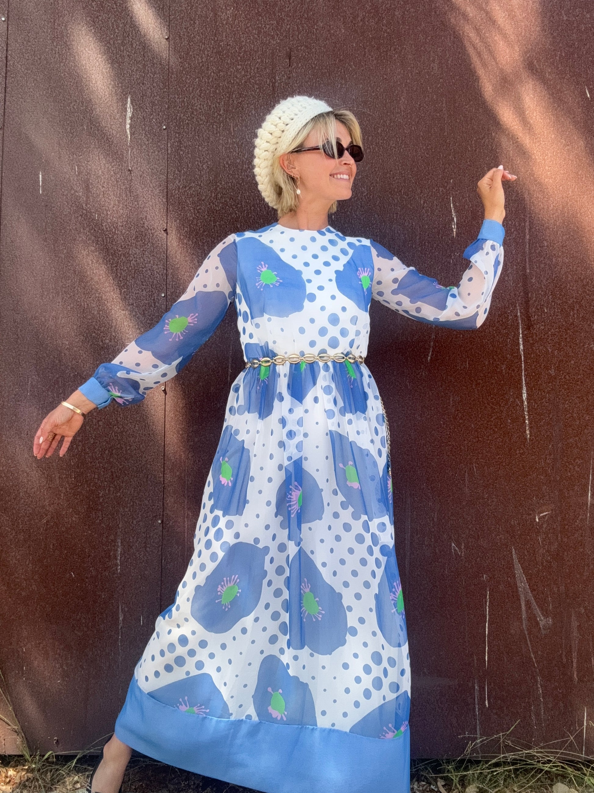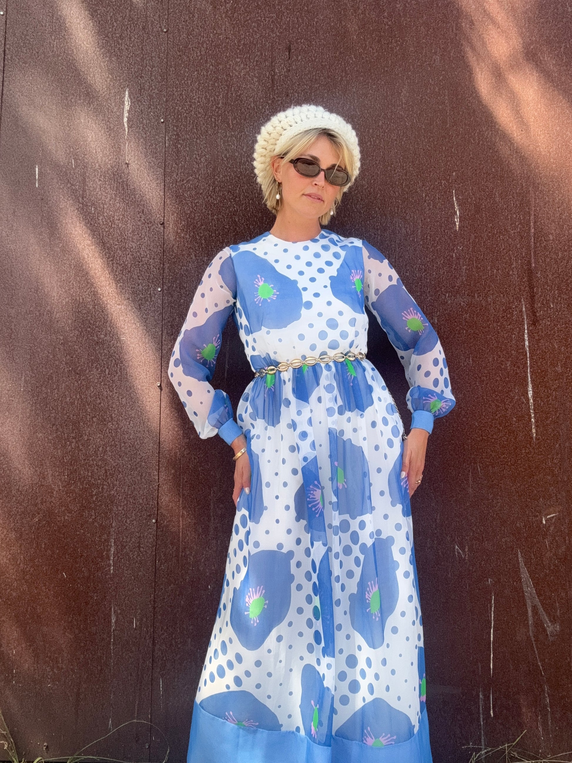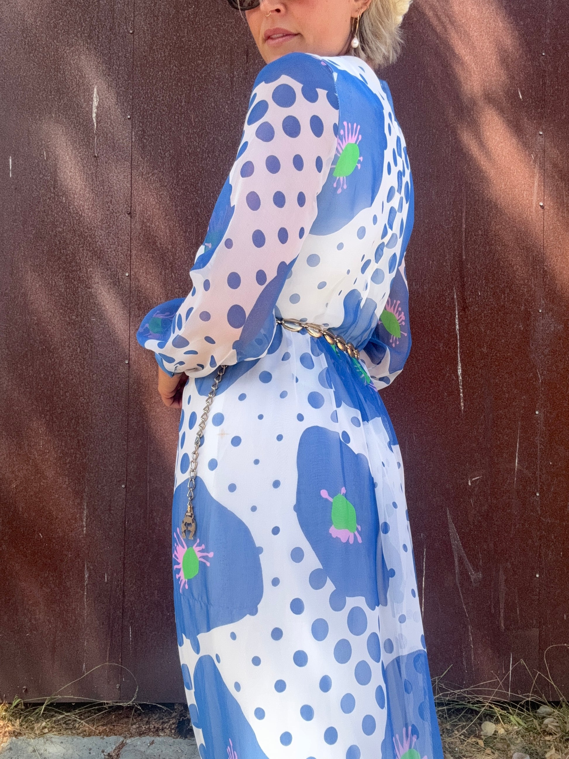 The Alice 1970s Handmade Maxi Dress is a study in playful contrasts, with oversized blue florals layered against scattered polka dots. A back zipper closure secures the silhouette, while the body is lined for coverage and the long sleeves remain fully sheer. The dress finishes with a solid blue hem and cuffs that ground its airy print. Style her with metallic hoops and a sleek clutch for an artful look that moves easily from day to evening. This would also be stunning layered with some tights, boots, and a coat or shag vest as we transition into Fall.
