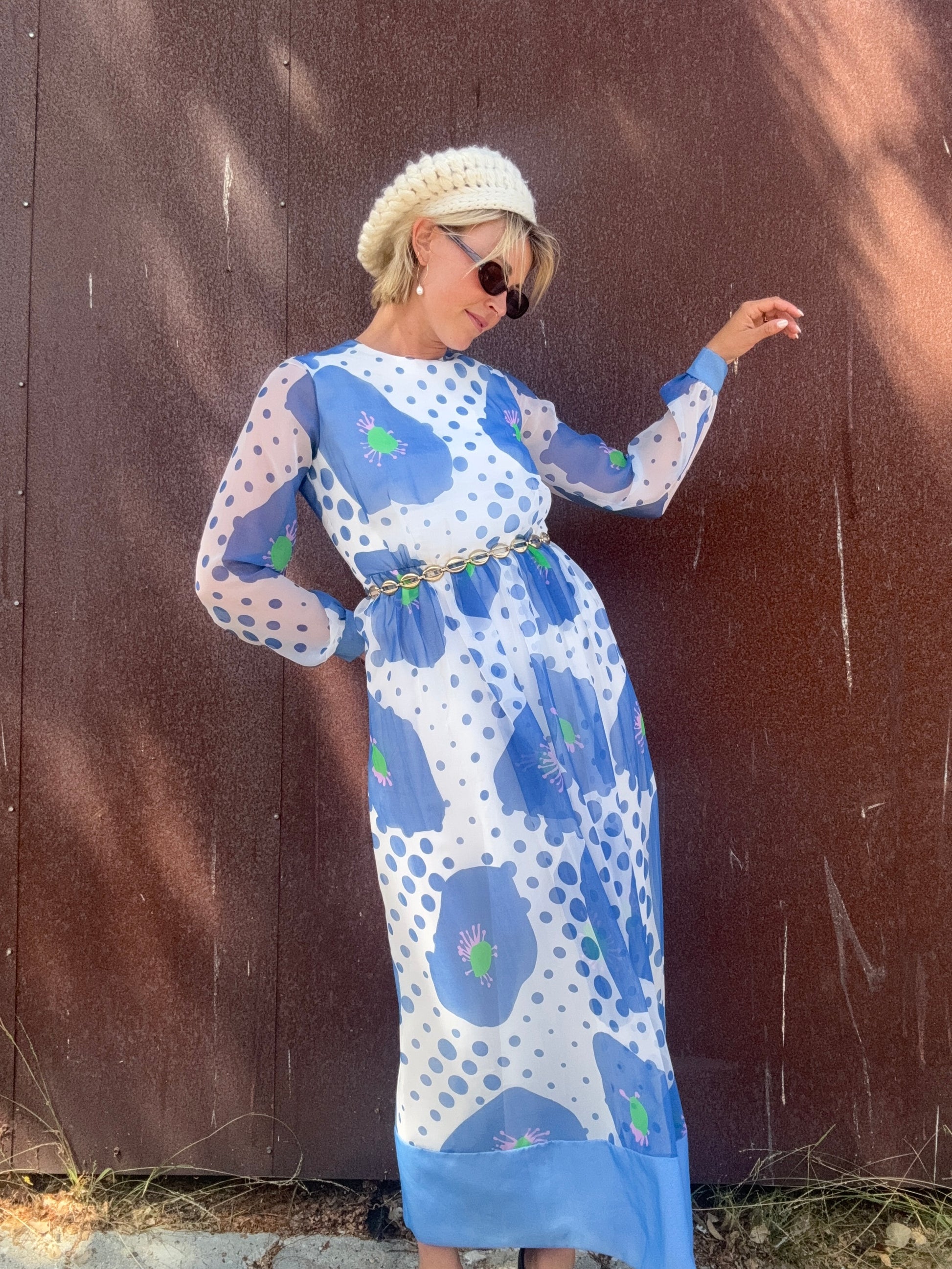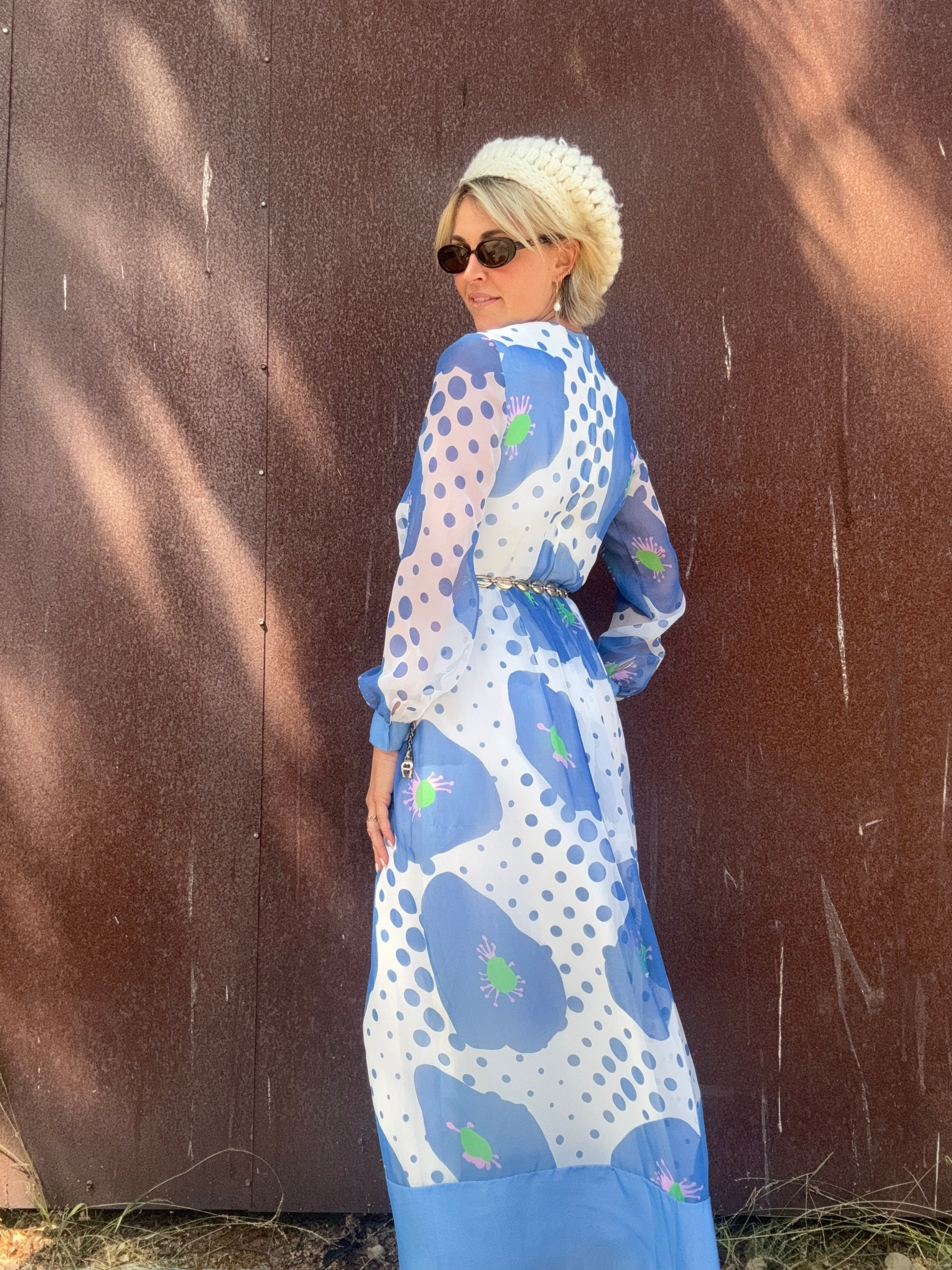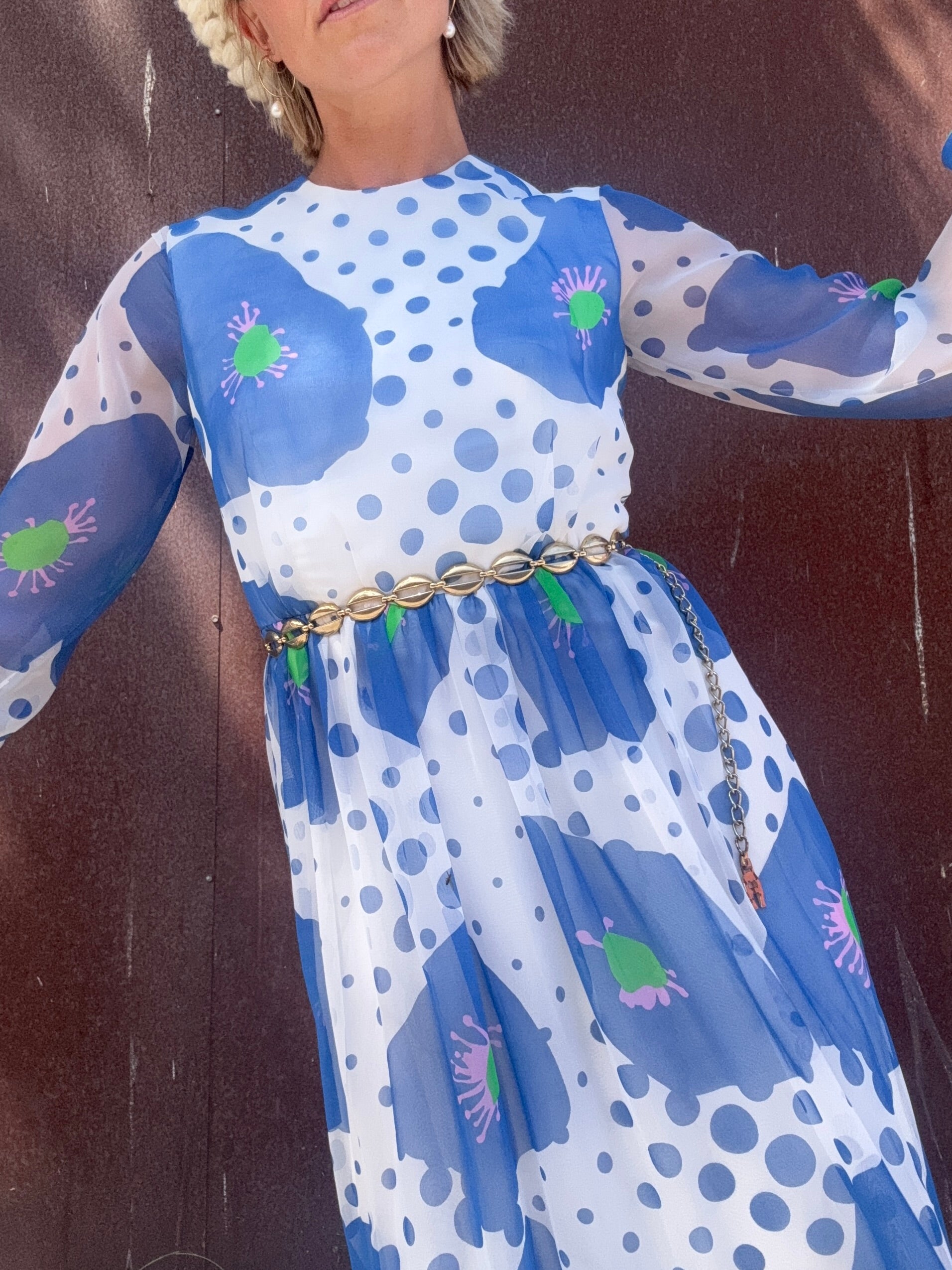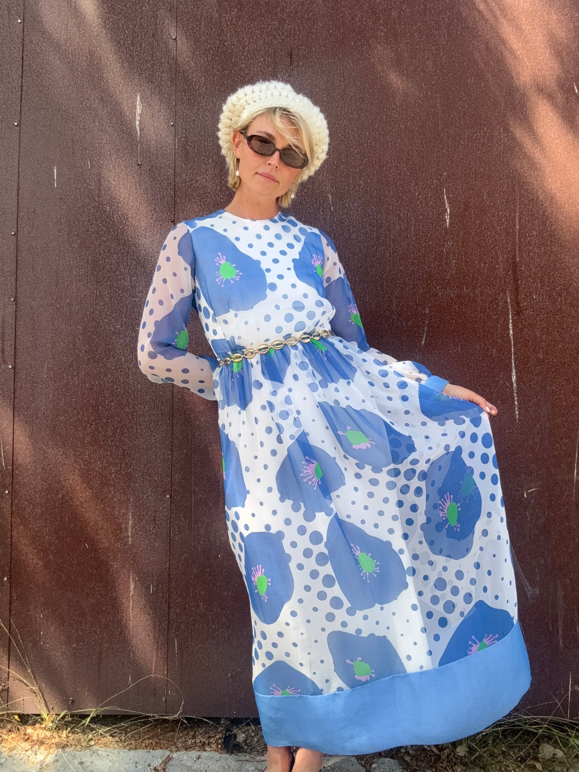 The Alice 1970s Handmade Maxi Dress is a study in playful contrasts, with oversized blue florals layered against scattered polka dots. A back zipper closure secures the silhouette, while the body is lined for coverage and the long sleeves remain fully sheer. The dress finishes with a solid blue hem and cuffs that ground its airy print. Style her with metallic hoops and a sleek clutch for an artful look that moves easily from day to evening. This would also be stunning layered with some tights, boots, and a coat or shag vest as we transition into Fall.
