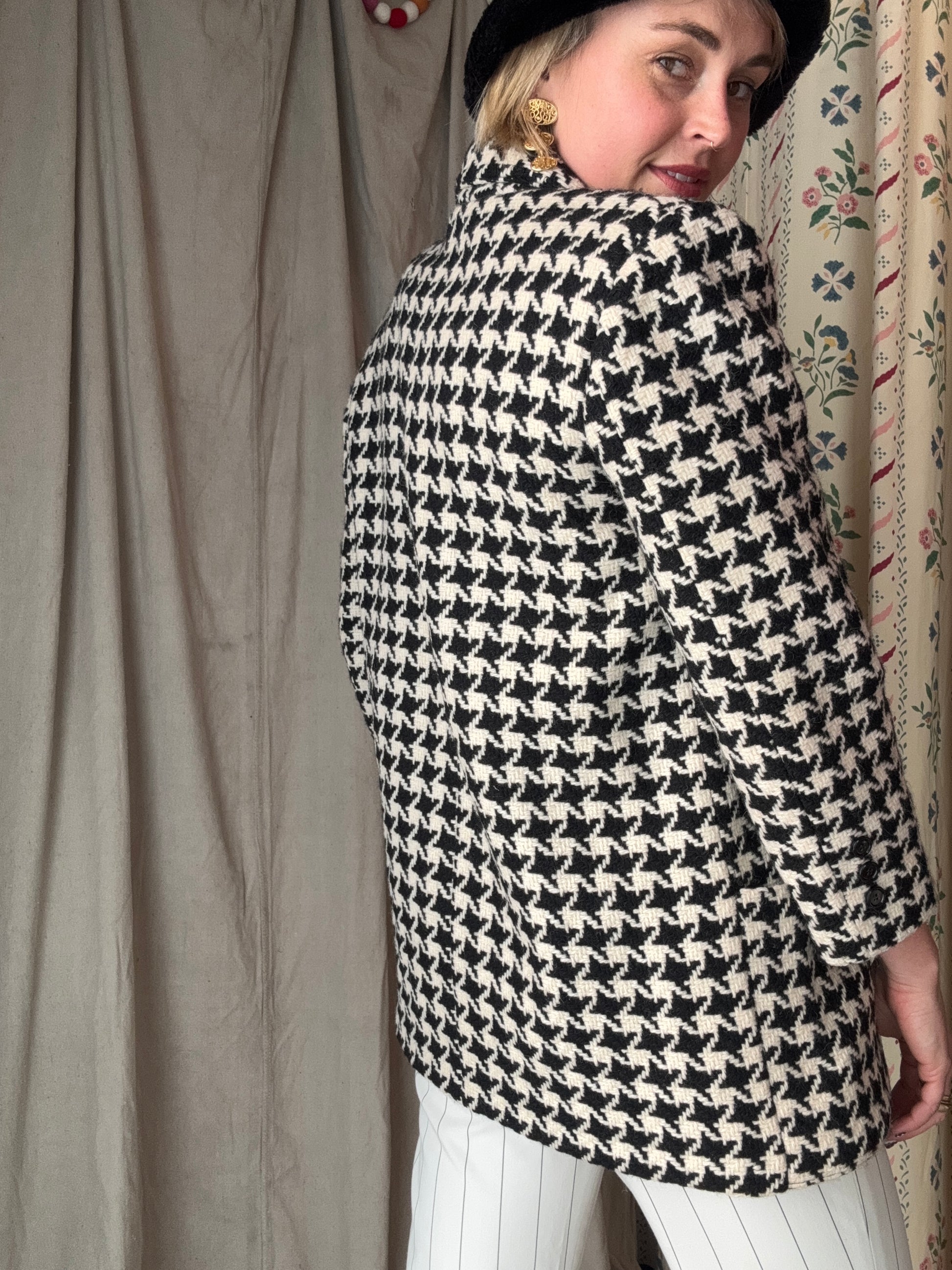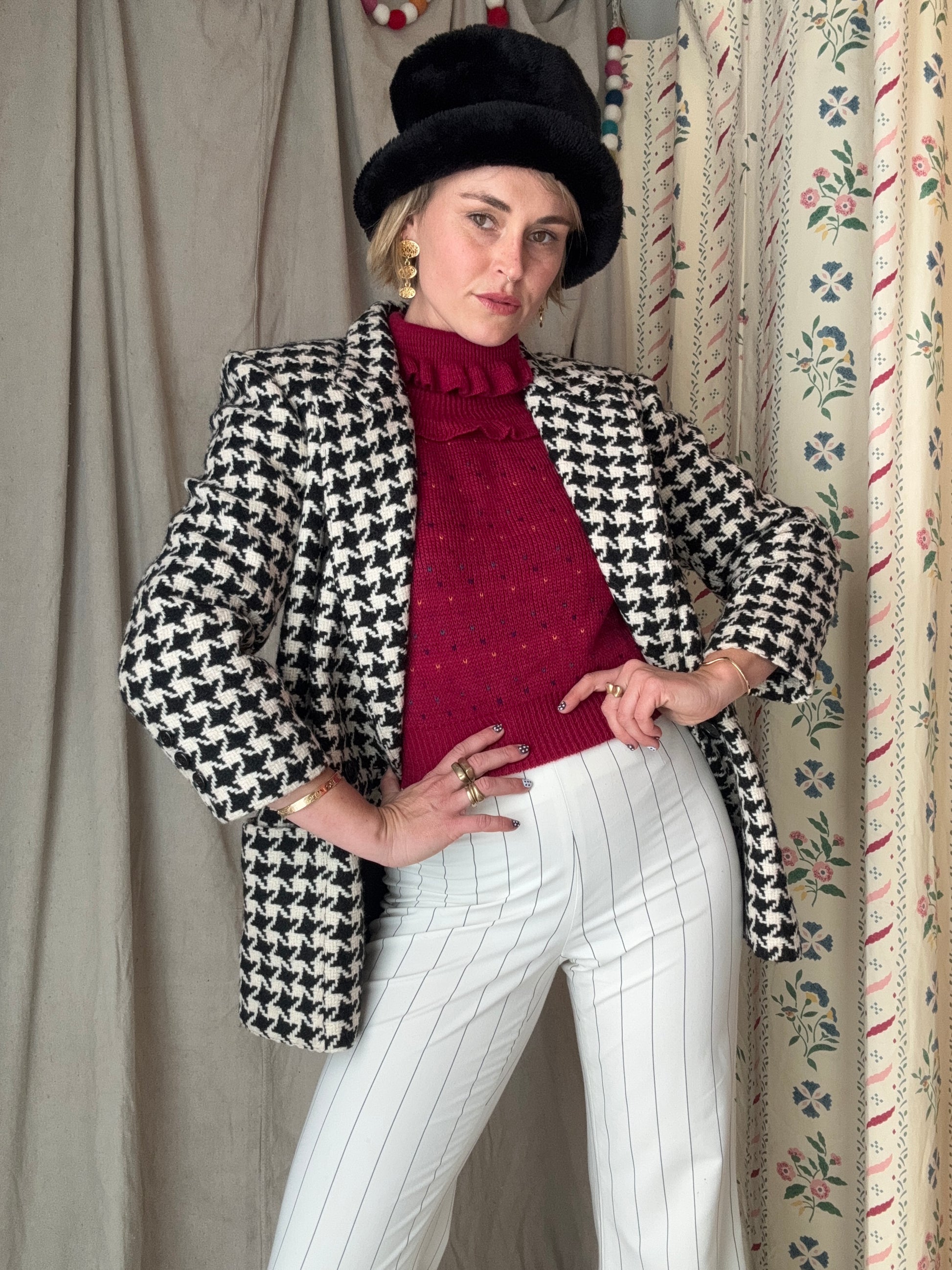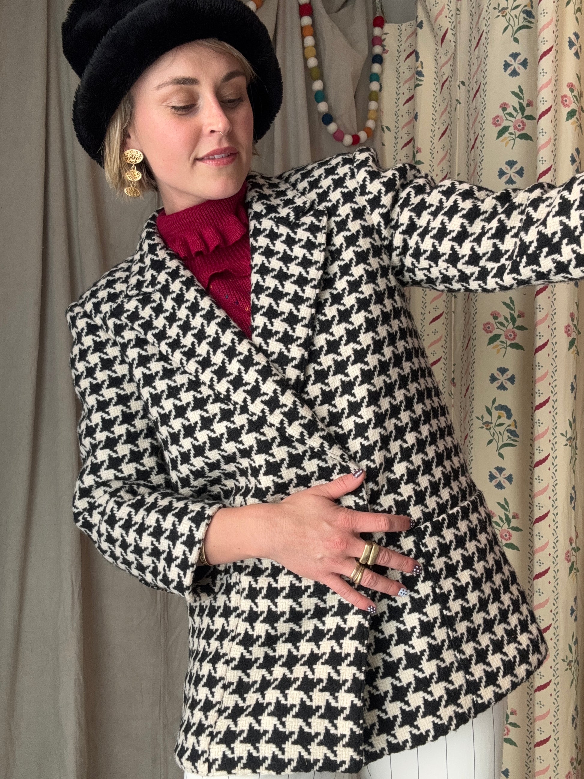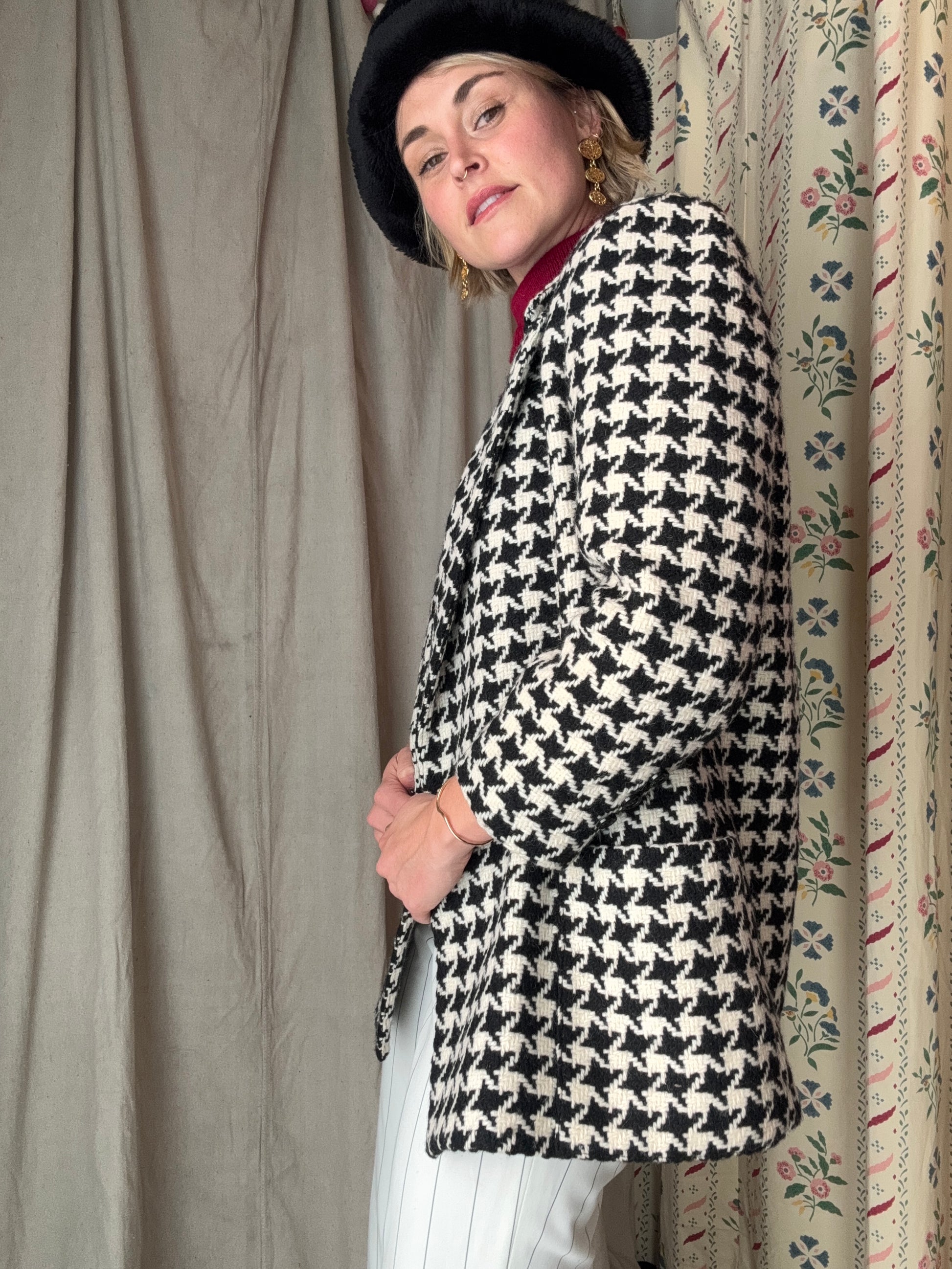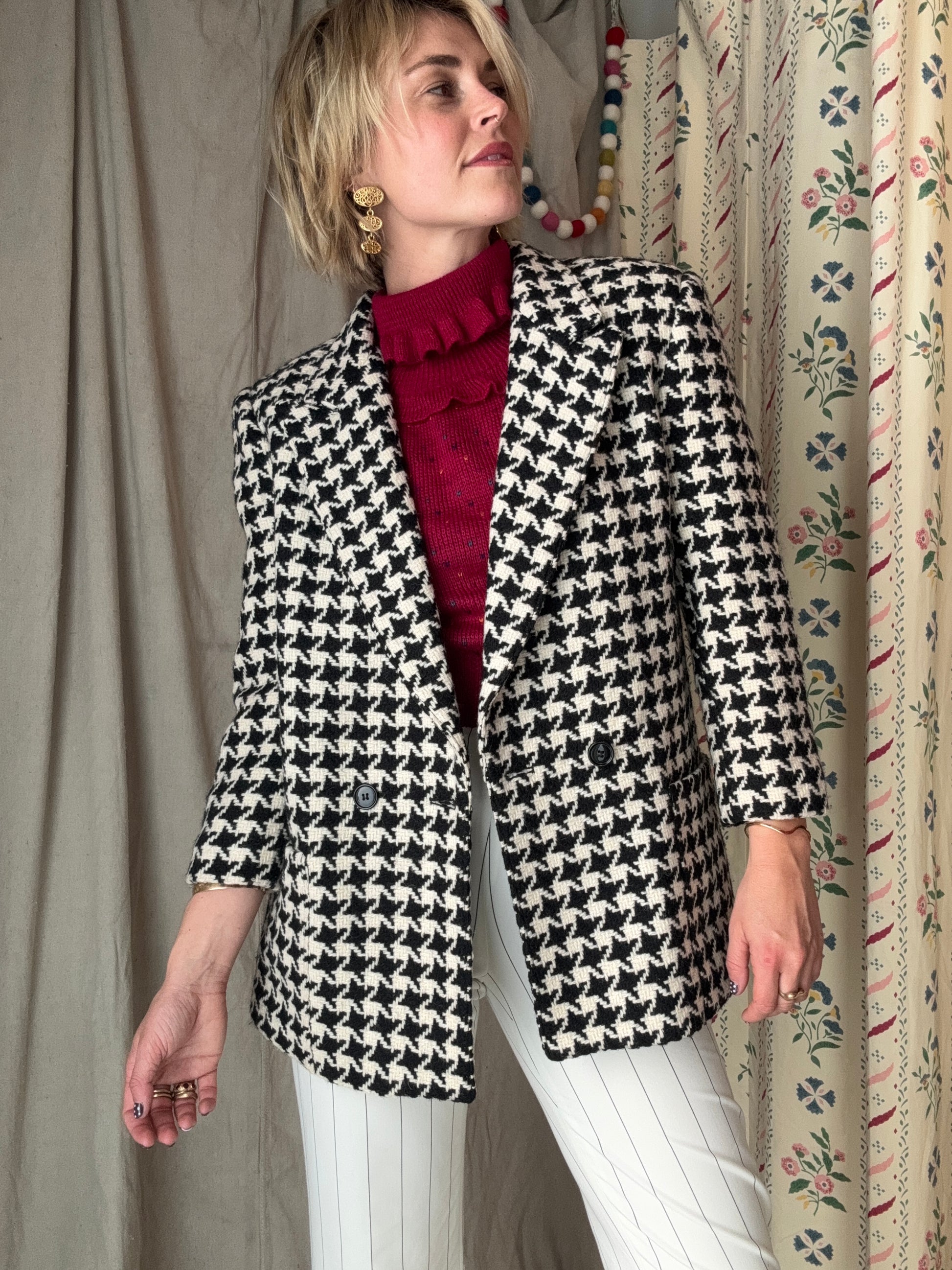 The Bill Blass 1980s Wool Blazer is a striking black-and-ivory houndstooth piece crafted from 100% pure new wool, featuring a structured double-breasted button closure, strong shoulder pads, and a fully lined interior that gives it that classic Bill Blass power-tailored silhouette. The cut hits just past the hip with clean welt pockets and a substantial wool that feels both polished and intentionally bold. Style her over a silk blouse with high-waisted trousers and glossy loafers for a sharp, graphic look, or wear her slightly oversized with a ribbed turtleneck dress and tall leather boots to lean into more dramatic proportions.