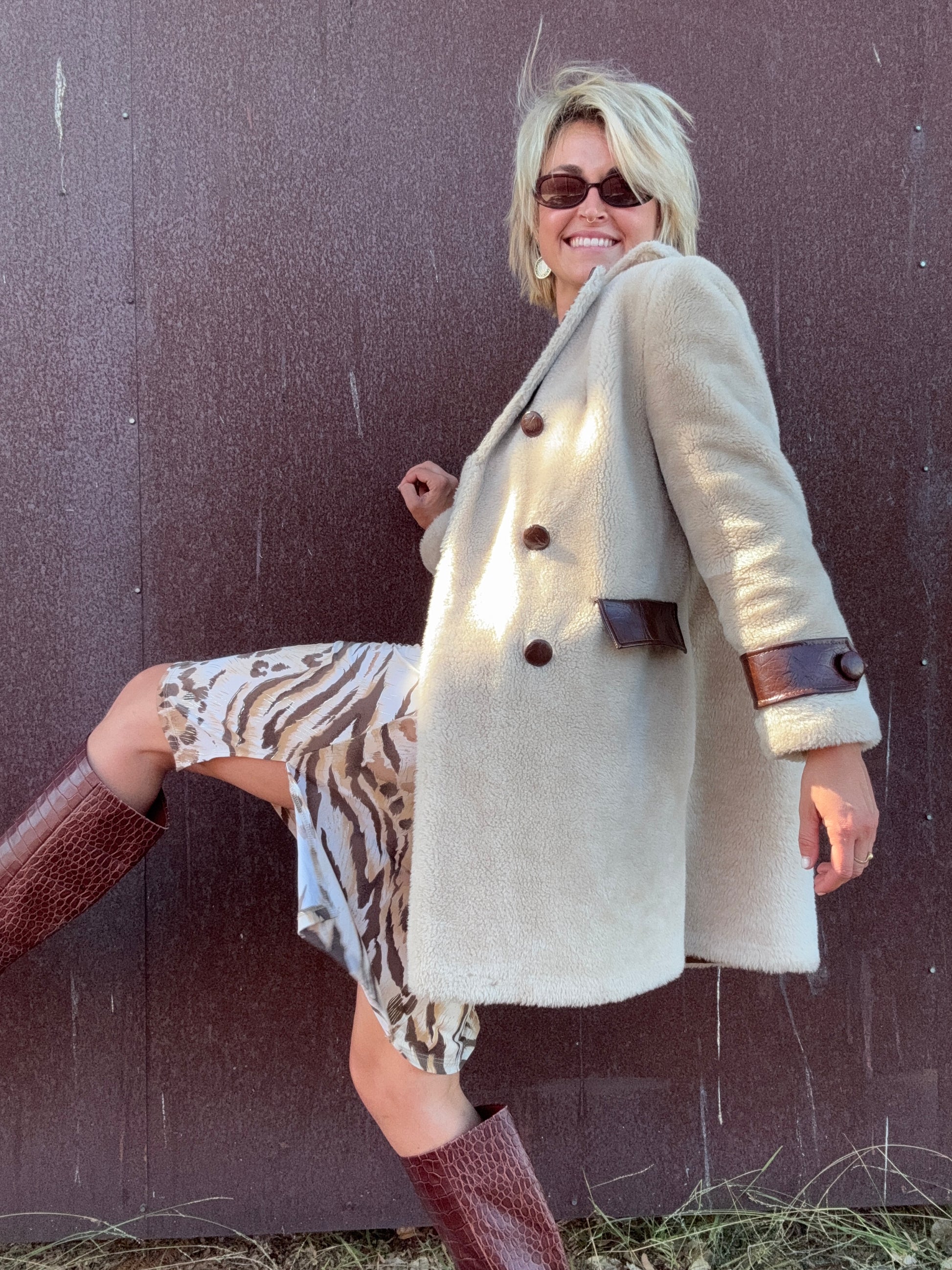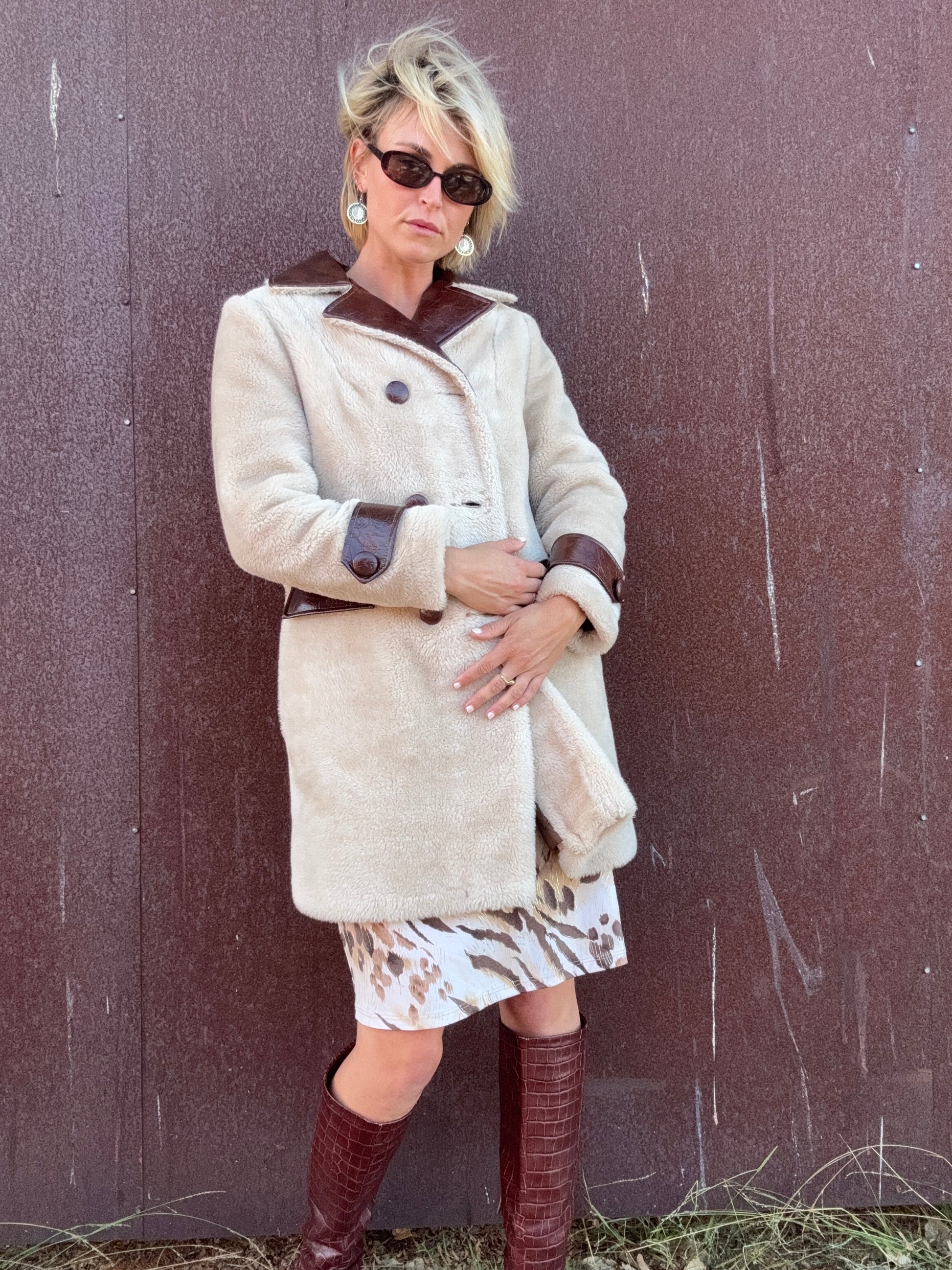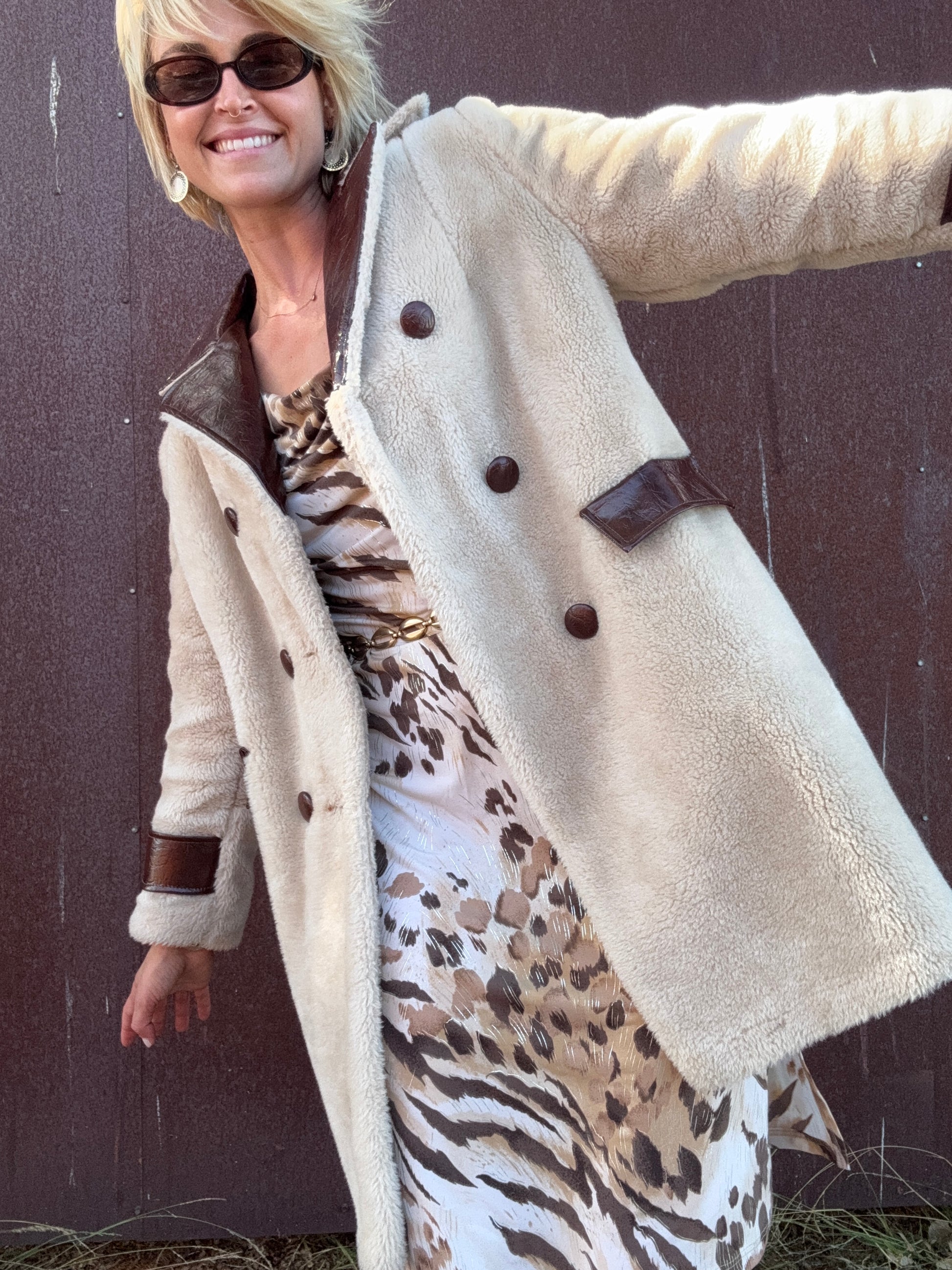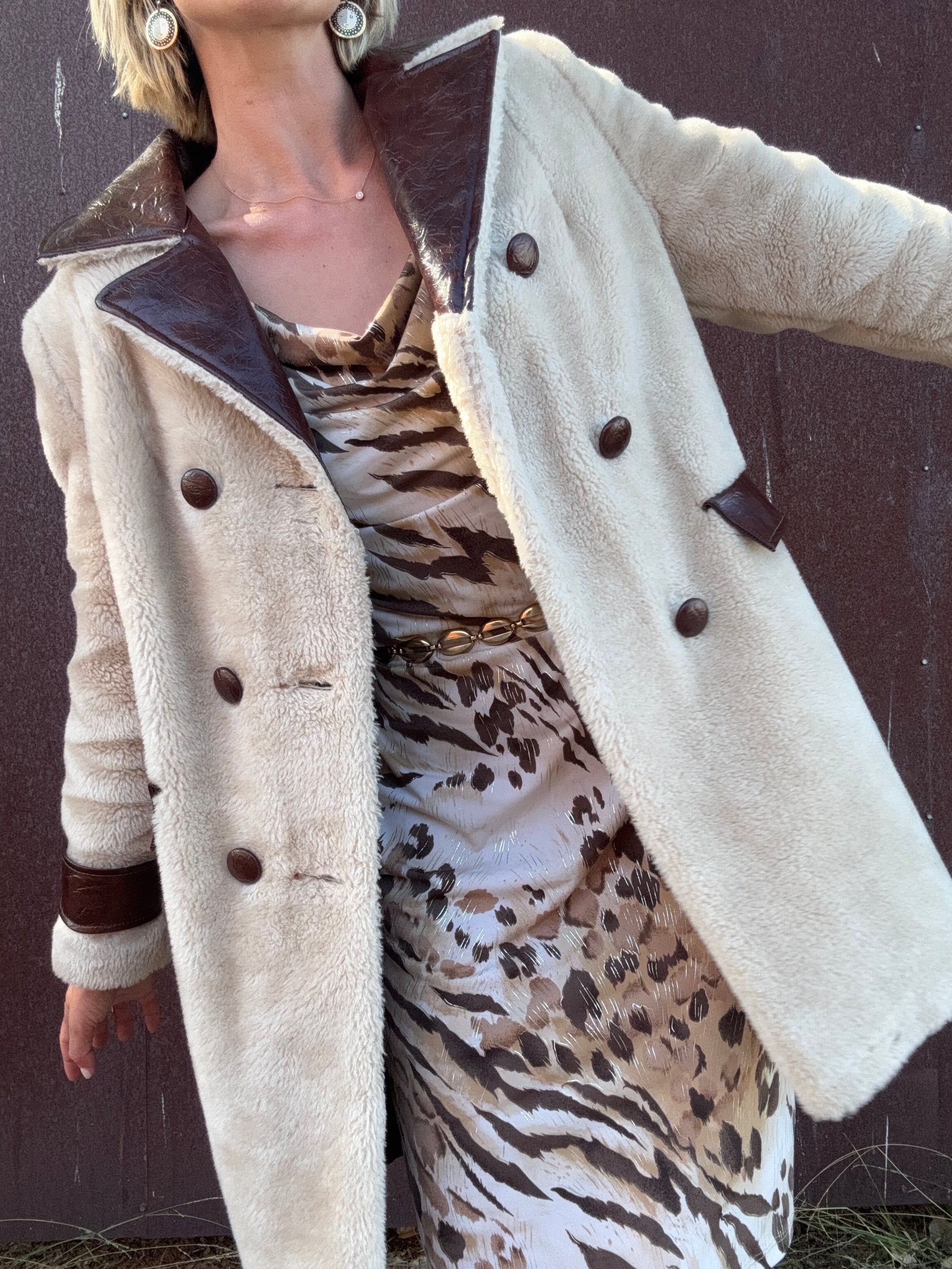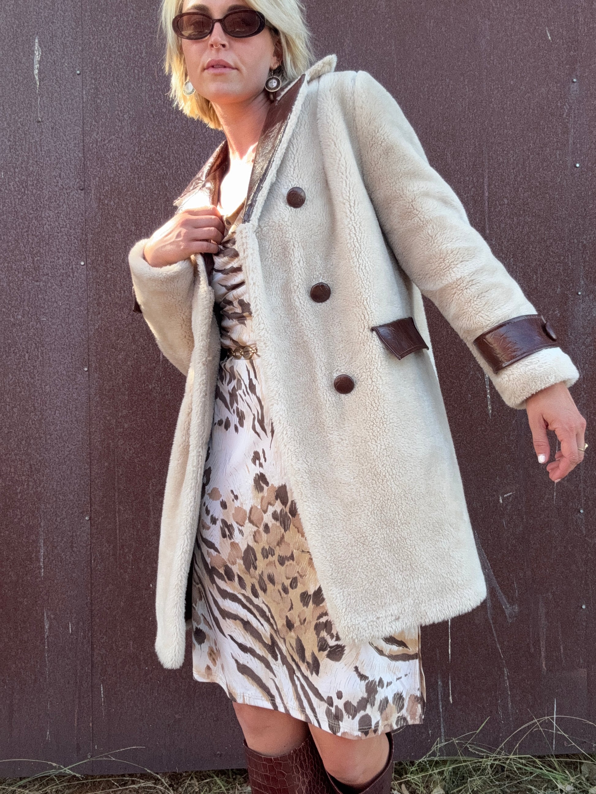 The Daphne 1970s Faux Fur Coat is a double-breasted style in plush cream faux fur, finished with deep brown faux leather accents. The oversized notched collar, sleeve cuffs, and decorative flap pocket details at the waist are all rendered in textured faux leather, giving strong contrast against the softness of the body. Pair this coat with flared trousers or a slim turtleneck dress to let the bold mix of textures stand out.