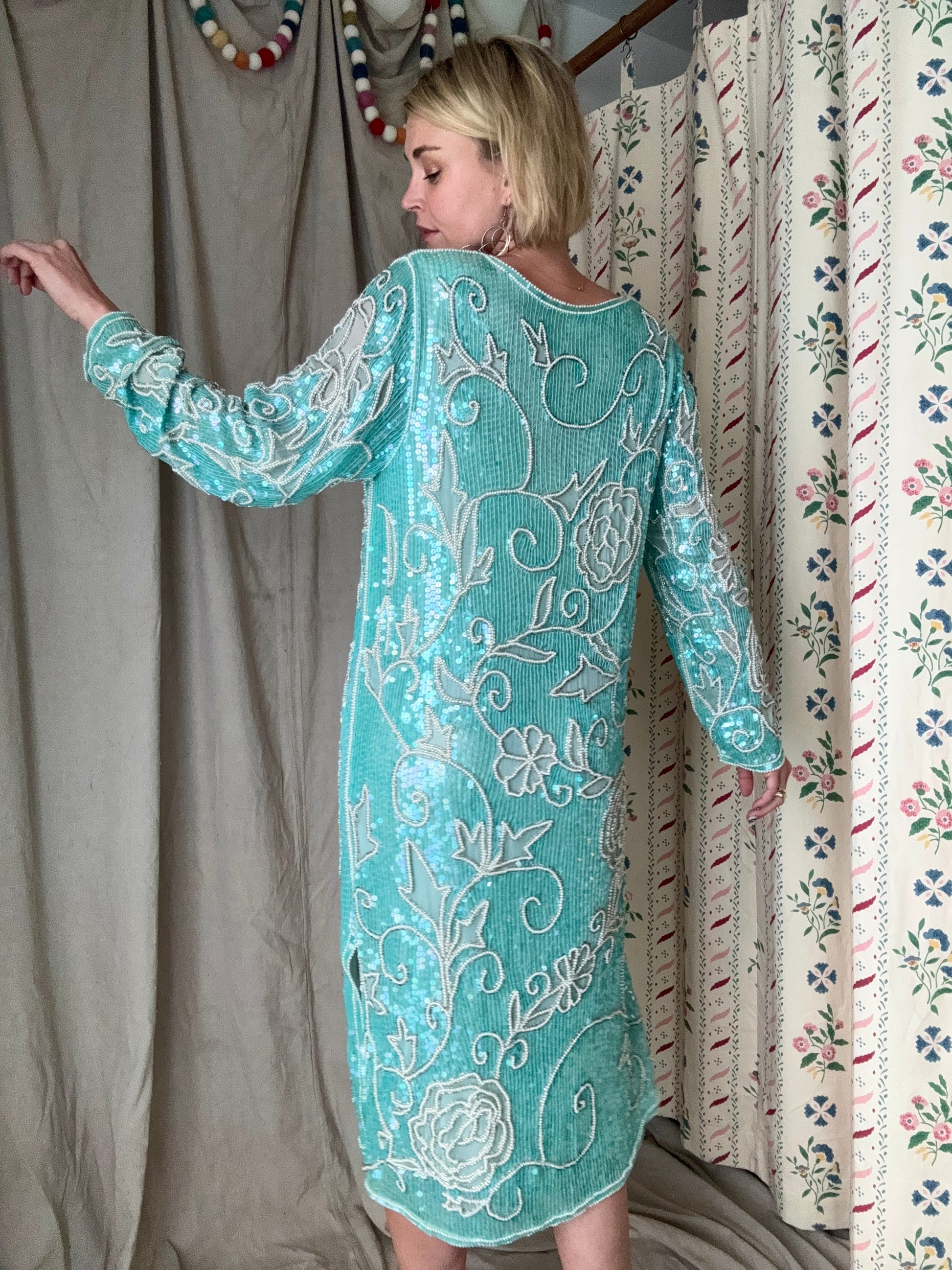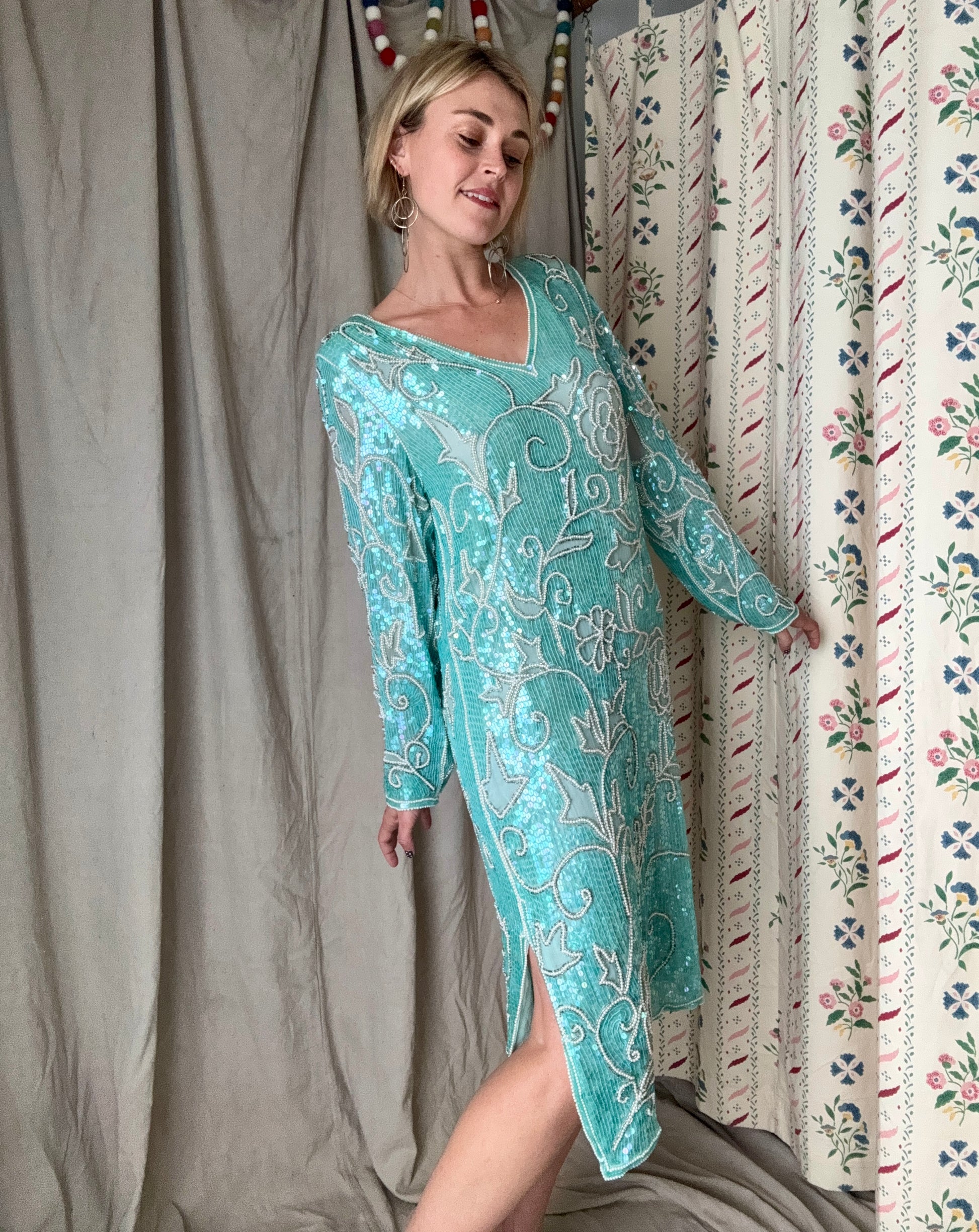 The Delphine 1980s Sequin Silk Gown is a luminous vintage showpiece crafted from 100% pure silk and fully embellished with shimmering sequins and intricate beadwork throughout. Designed with subtle shoulder pads for a softly sculpted silhouette, this gown balances elegance with drama, allowing the ornate surface texture to take center stage while the silk base gives it fluid movement and a luxurious feel. Style her with chunky metallic heels or a bold sculptural earring in an unexpected complimentary color, or put a modern twist on things and casually toss an oversized silk bomber over your shoulders when you head out dancing.