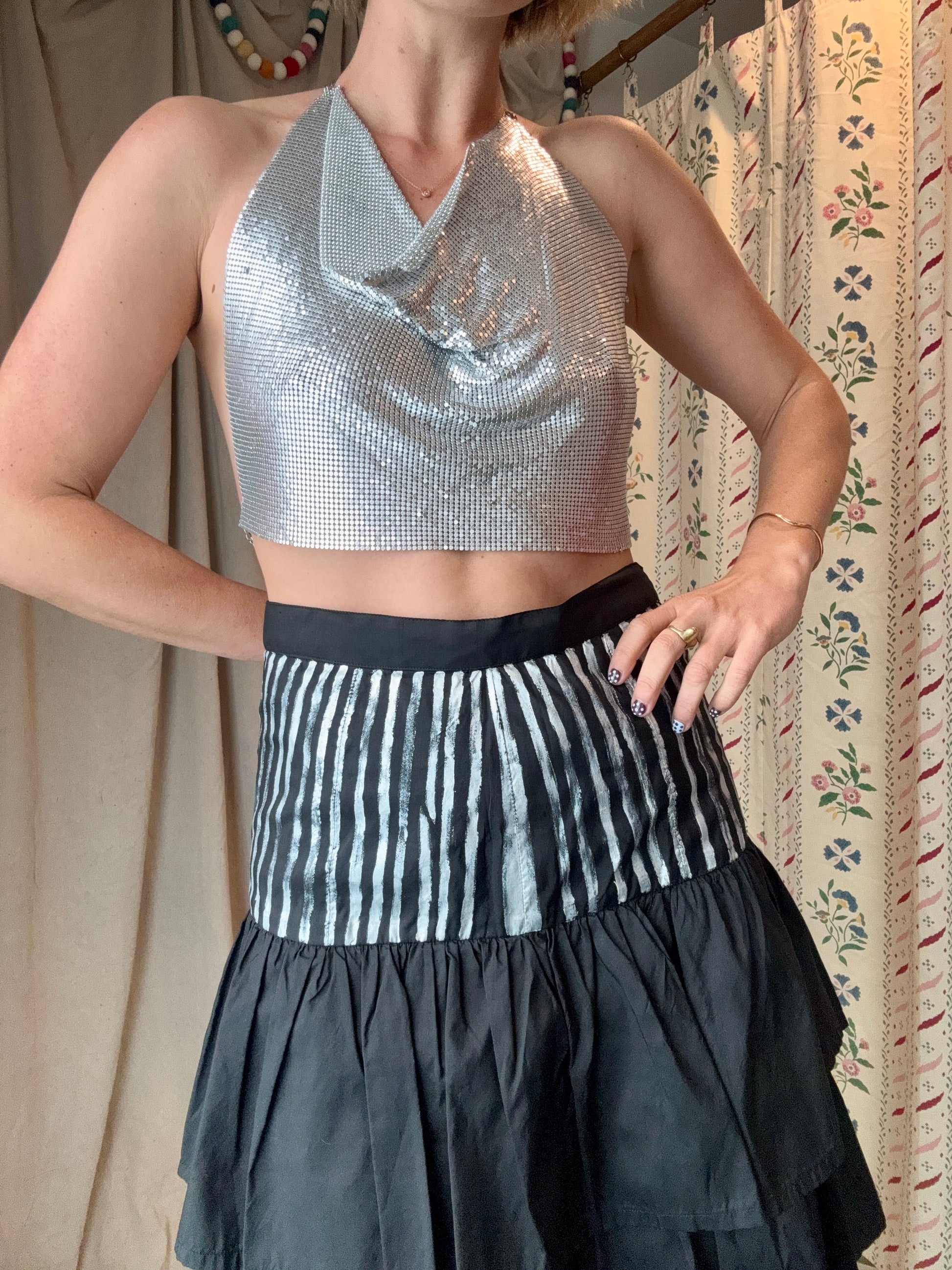 The Eloise 1980s Silk Ruffle Skirt is crafted from 100% Thai silk, featuring tiered ruffles that create movement and volume through the hem. The upper panel is hand-painted with metallic silver vertical striping, done by Kiko herself, adding contrast and subtle sheen against the black silk ground. It fastens in the back with a zipper and button closure, and the fabric has a satisfying weight that helps the ruffles hold their shape. Style her with a fitted knit cashmere top and pointed leather ankle boots, or pair her with a crisp white silk blouse and antique silver drop earrings for an elevated, layered look.
