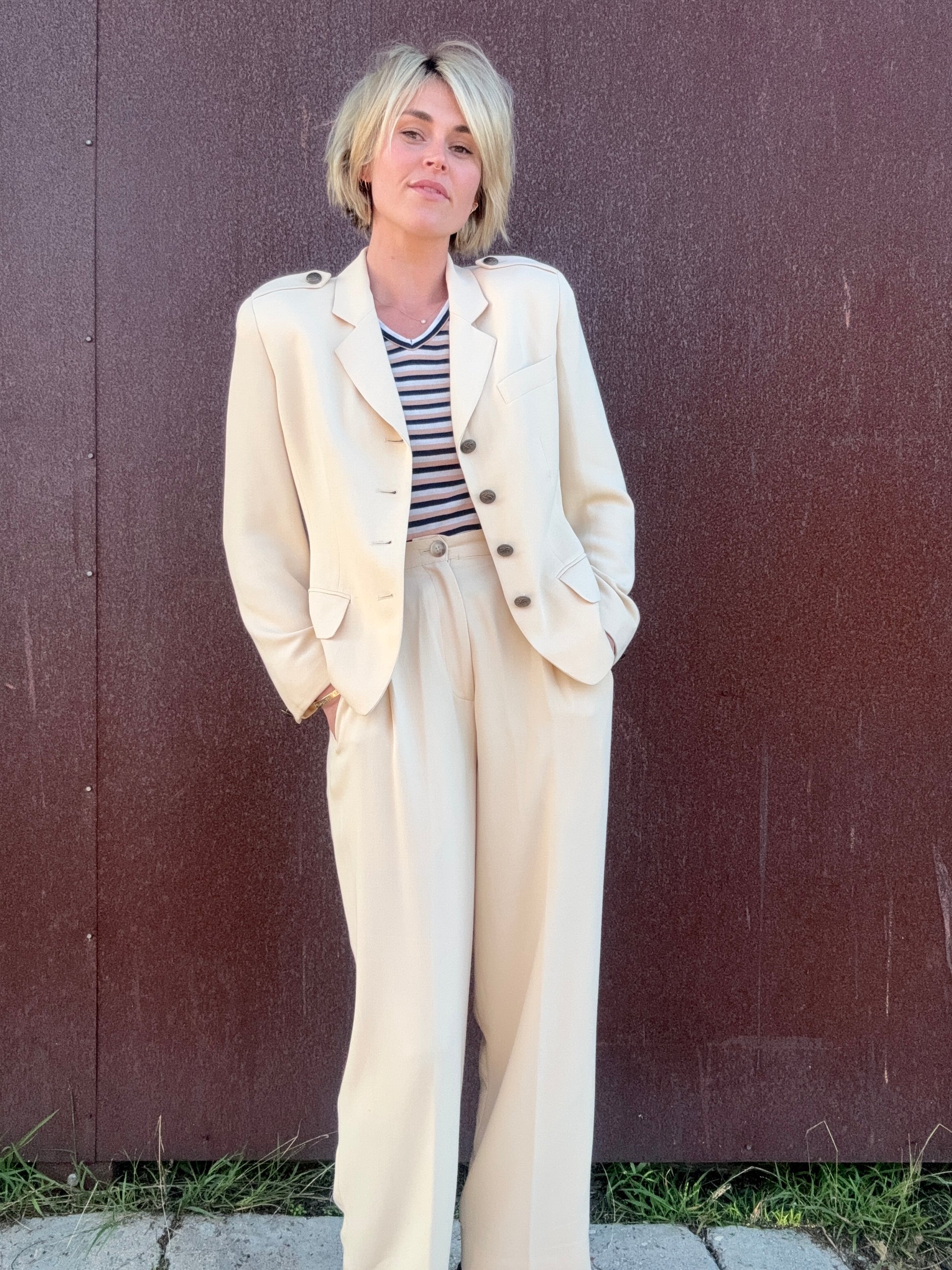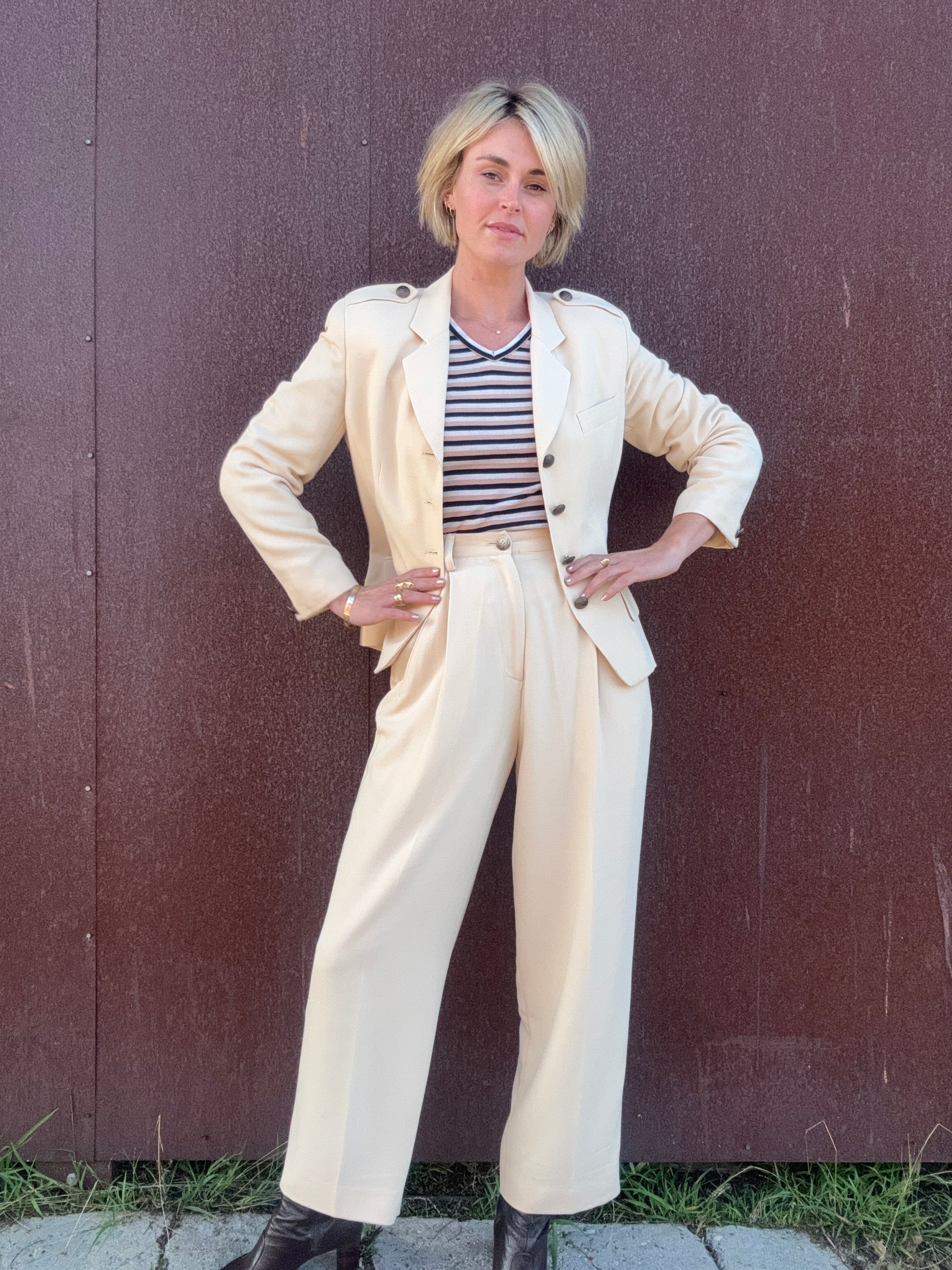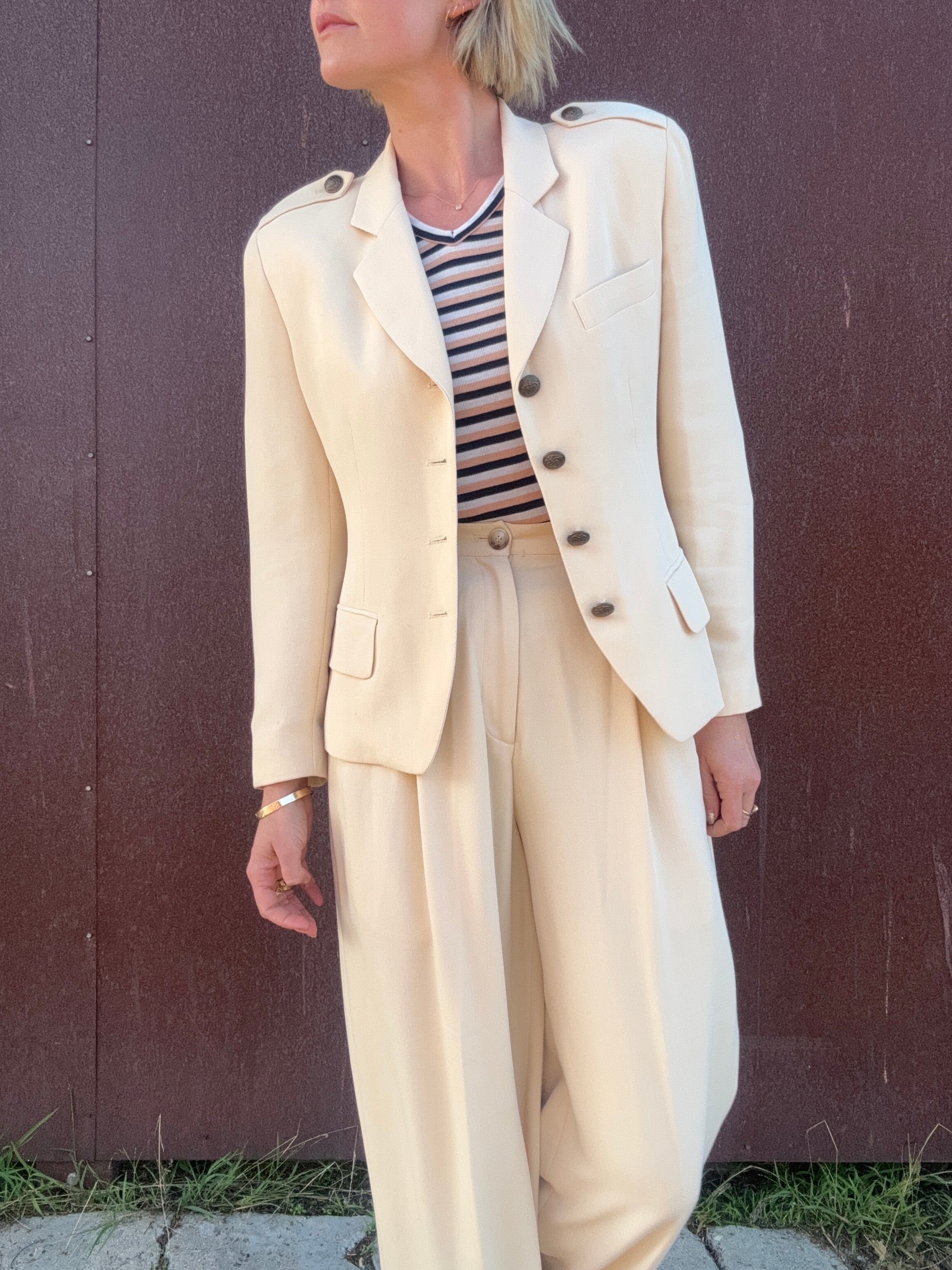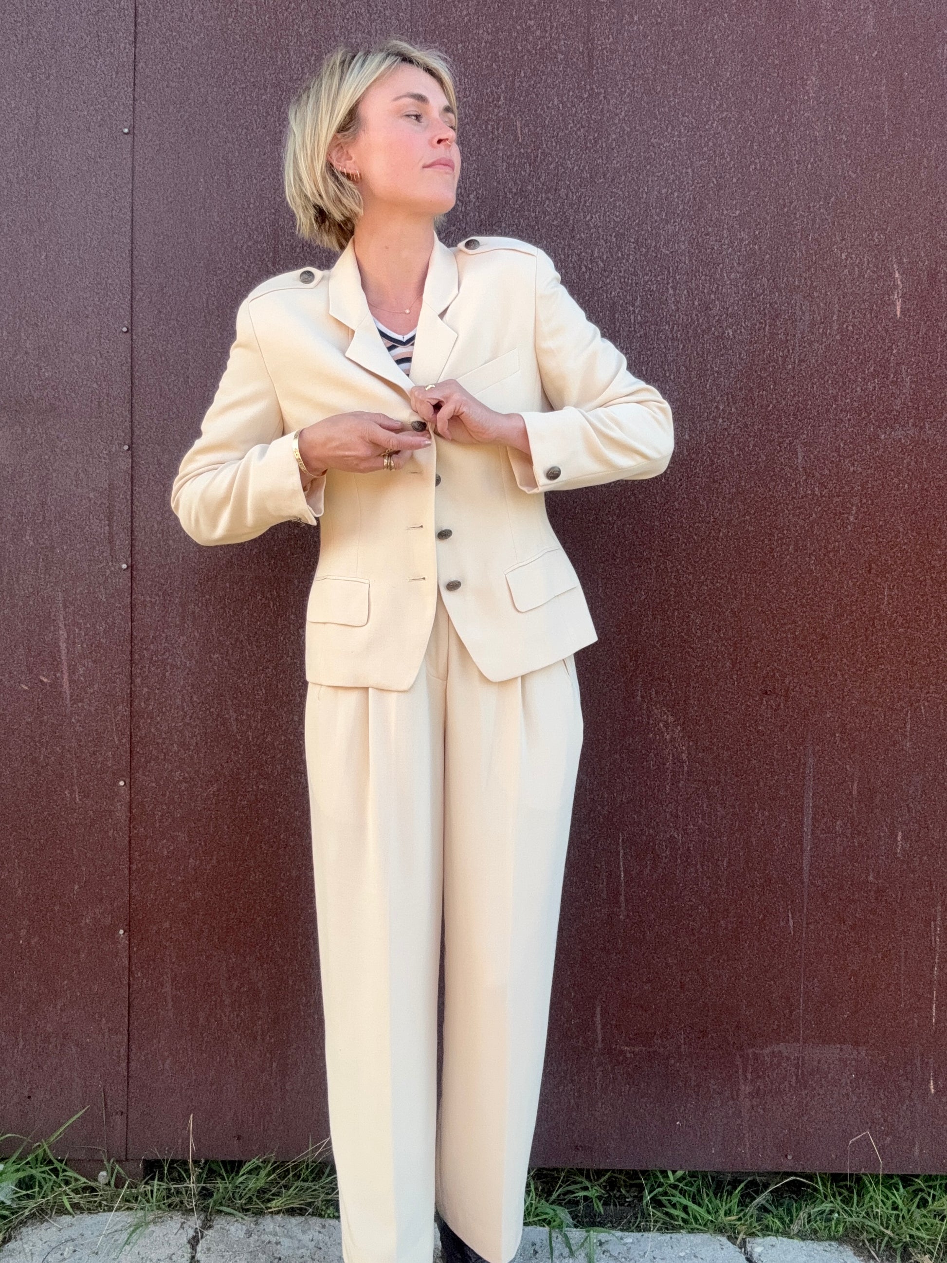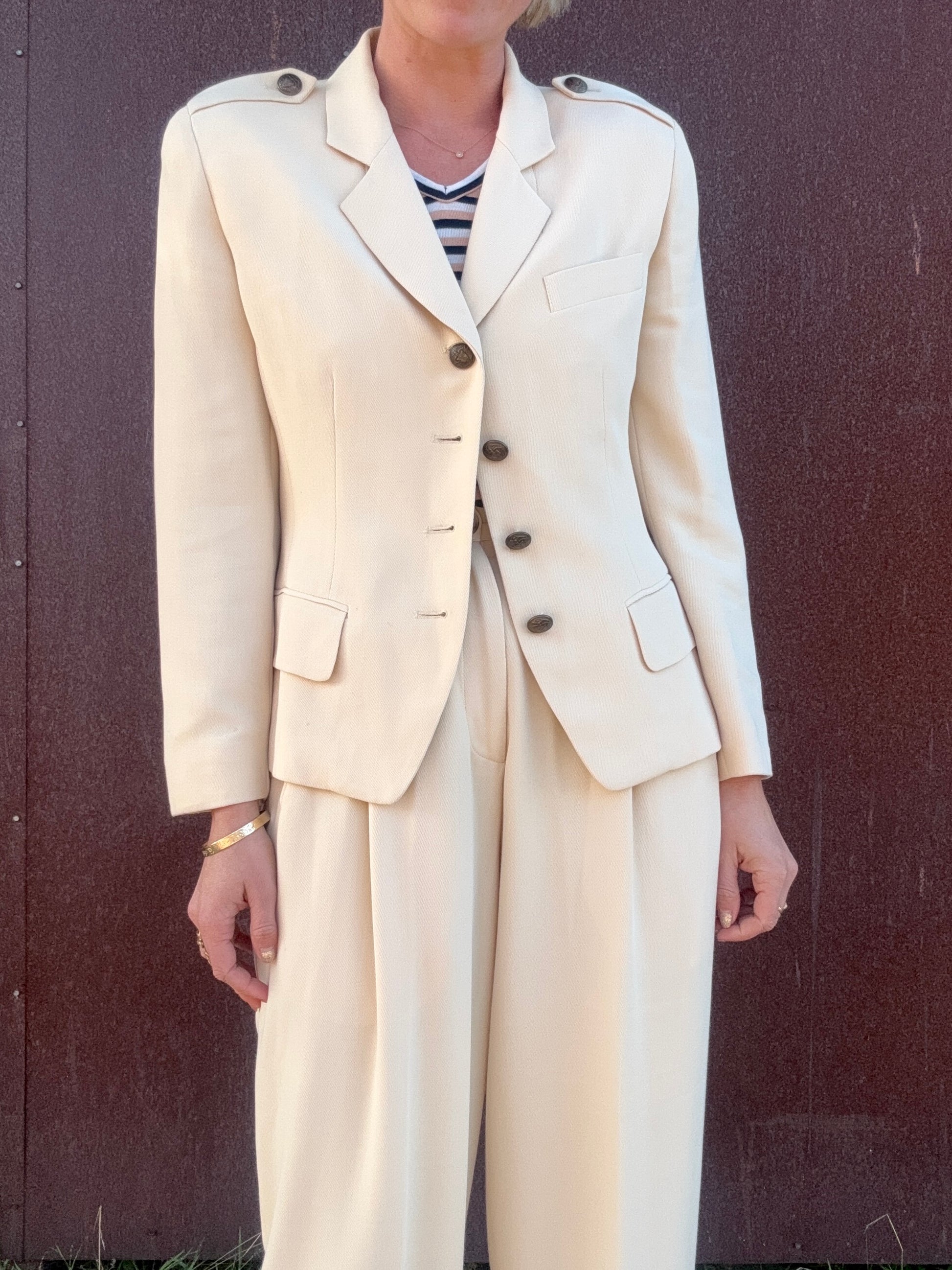 The Emanuel Ungaro 1980s Pant Set is crafted from a soft, structured woven fabric and features a sharply tailored blazer with three front pockets, engraved metal buttons, and lightly padded shoulders. The matching trousers include belt loops, front pockets, and a zipper-and-button closure, with gentle front pleats that shape into a subtly barrel-leg silhouette. Every seam highlights the clean, minimalist lines that define this era of Ungaro tailoring. Style it with a slim mock-neck knit and heeled ankle boots for an easy, elevated pairing, or add a silk blouse and a small shoulder bag for a polished, evening-leaning look.