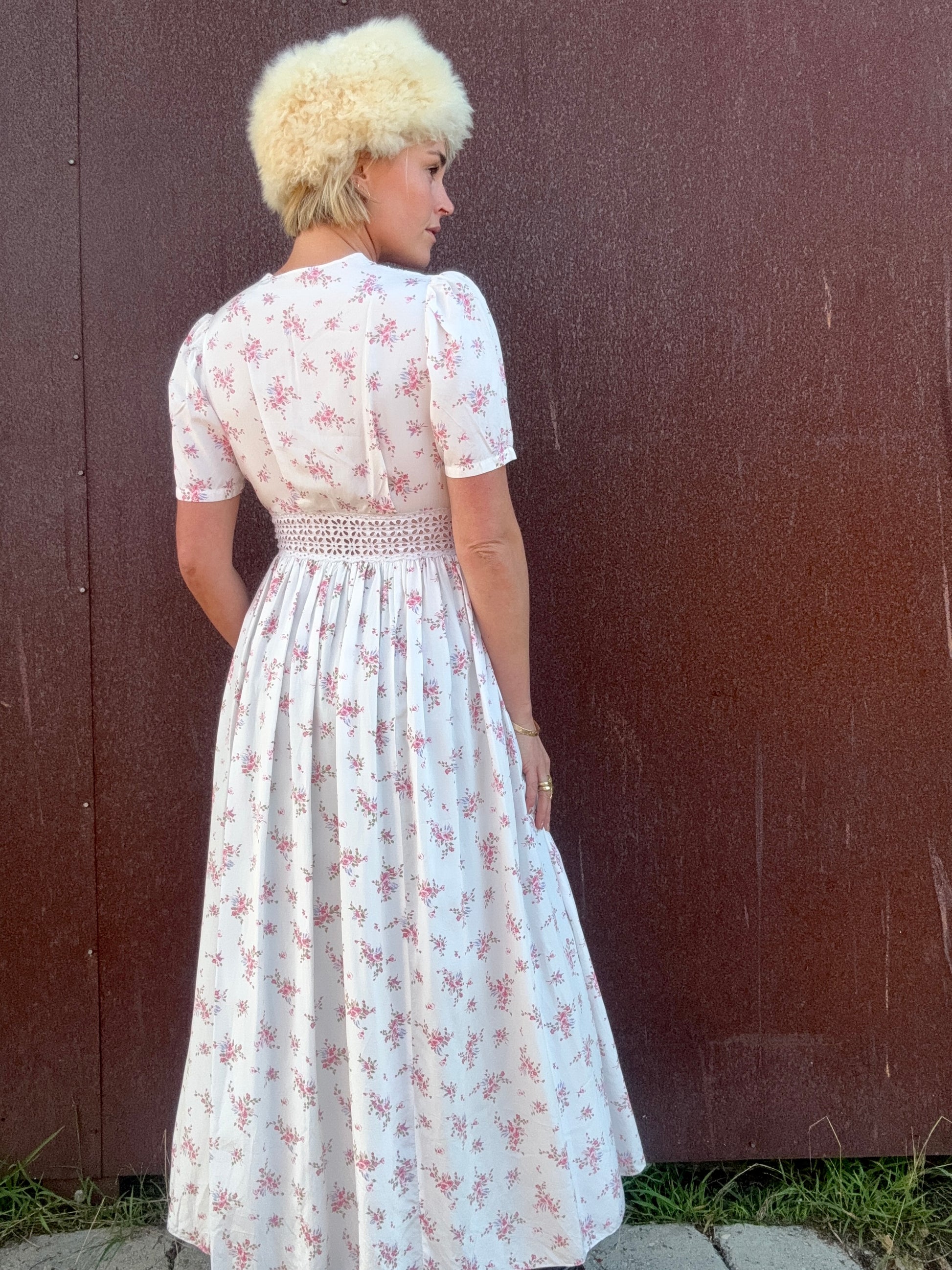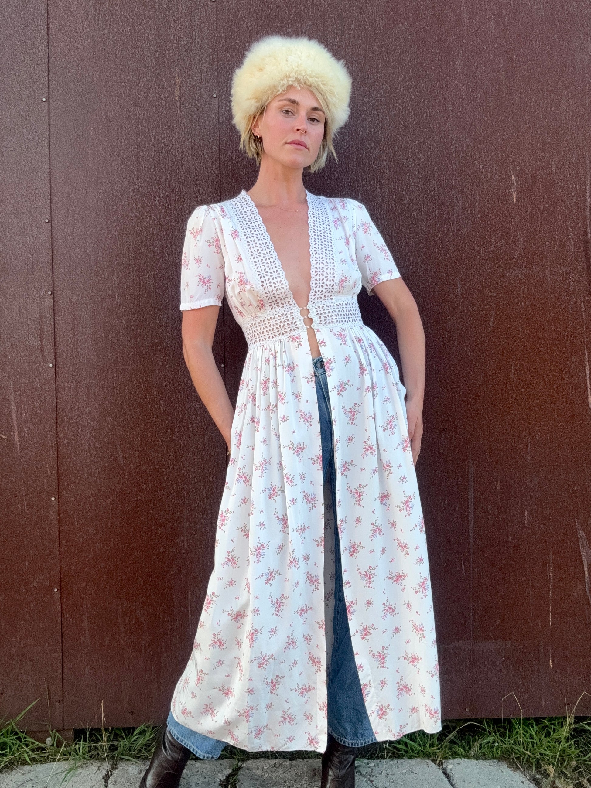 The Estelle 1930’s Eyelet Duster is a rare, dreamy piece featuring airy eyelet panels and a soft floral print, finished with gentle gathers at the sleeves, waist, and chest for that unmistakable vintage romance. The deep V-front is framed in wide floral eyelet lace that continues through the waist, creating a beautiful contrast against the draped body. Short puffed sleeves and the lightly pleated skirt give the silhouette its floaty ease – an effortless layer that moves with you. Style her over a lightweight knit with leather flats, or pair her with silky wide-leg pants and a cotton camisole to make the eyelet detailing feel modern and intentional.