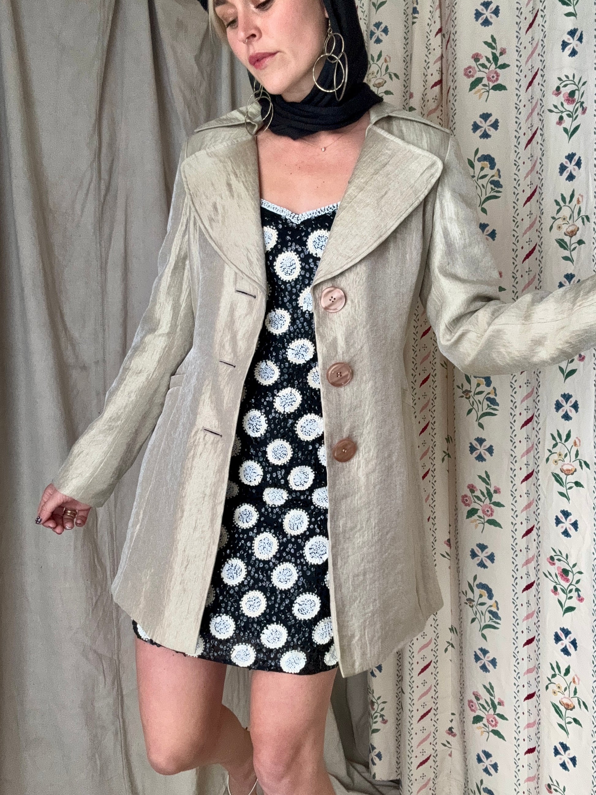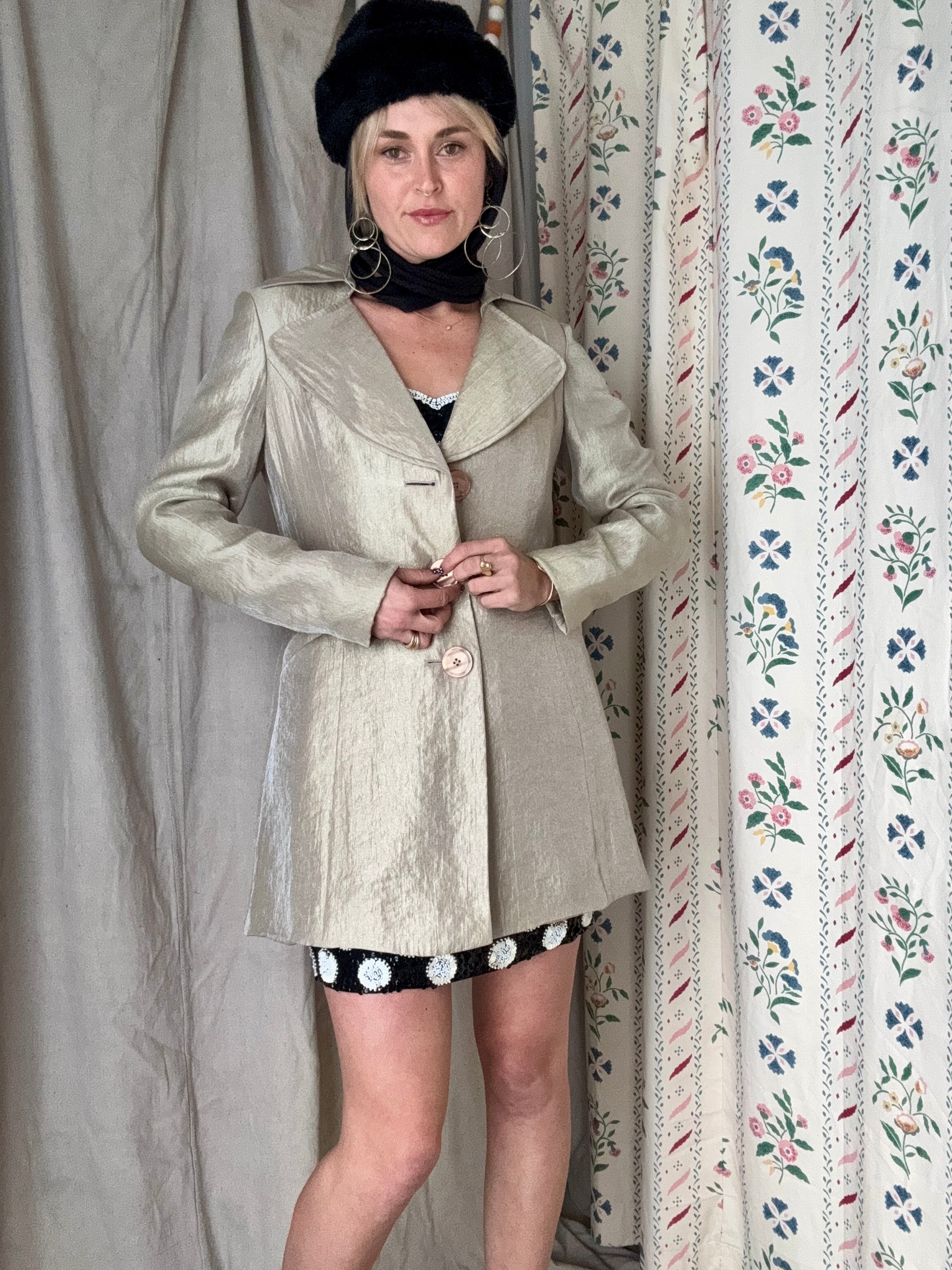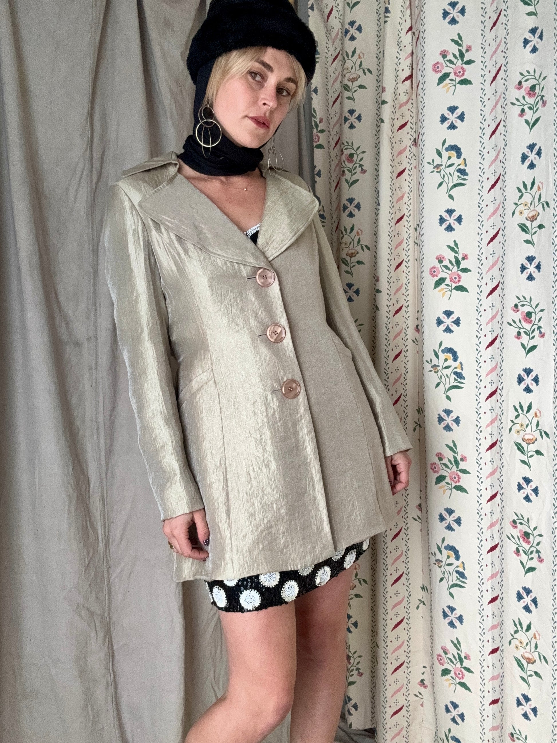 The Evangeline 1990s Trench Coat is an iridescent statement piece with a subtle glimmer that shifts in the light, featuring a front button closure, angled pockets, and a matching waist belt that cinches the silhouette just right. The fabric has a luminous, almost pearlescent finish that elevates the classic trench look, with tailored seams and a slightly longer length that layers beautifully. Style her open with wide-leg charcoal trousers, a jewel-toned satin blouse, and a sculptural metallic clutch. For a more unexpected moment, try her on with glossy white vinyl boots and oversized pearl earrings to play up the coat’s shimmer without overpowering it.