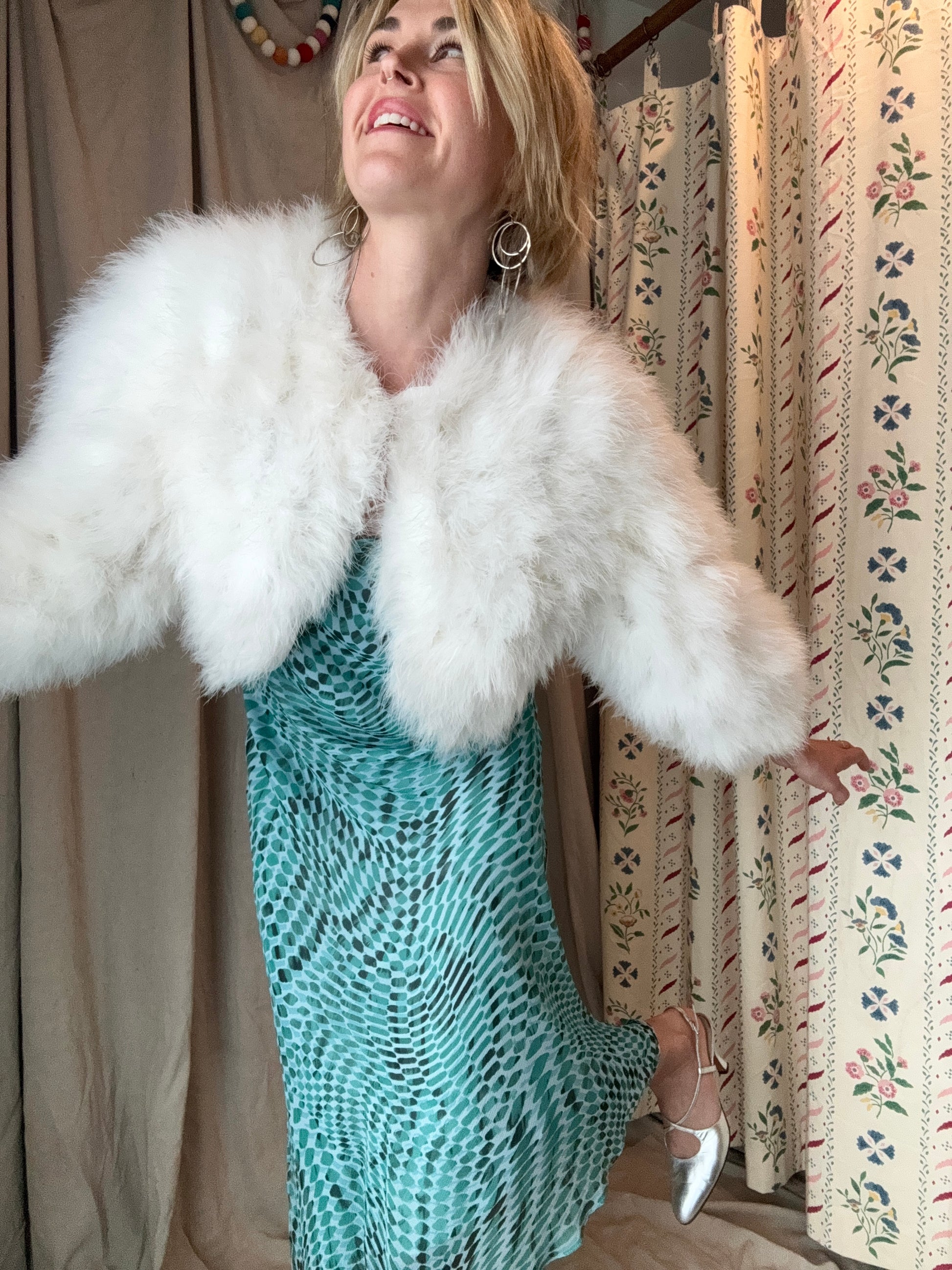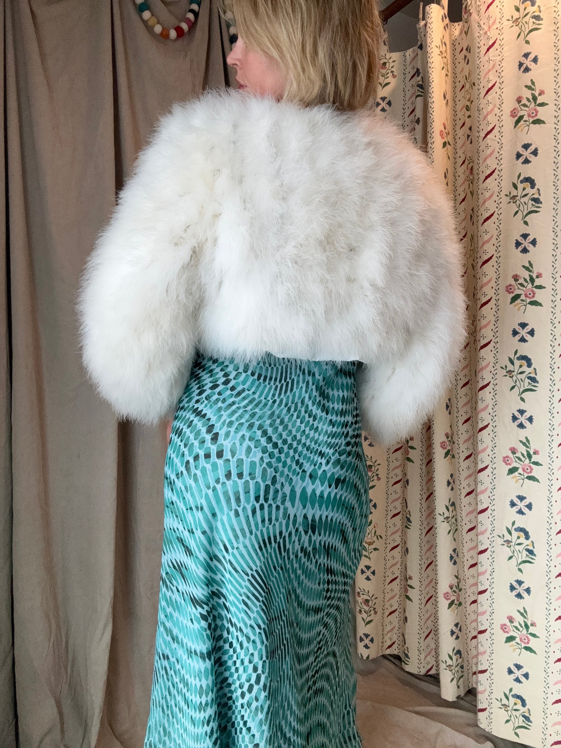 The Ines Marabou Feather Jacket is a soft ivory statement layer crafted from genuine marabou feathers, offering light volume with an airy, cloud-like texture. It features cropped sleeves and two hidden hook front closures that allow the jacket to sit cleanly against the body without interrupting the feathered surface. The silhouette is intentionally short and delicate, making it ideal for adding contrast to longer or more structured pieces. Style it over a black silk slip dress with sheer tights and pointed satin heels, or layer it atop a ribbed turtleneck and tailored wool trousers finished with gold statement earrings.