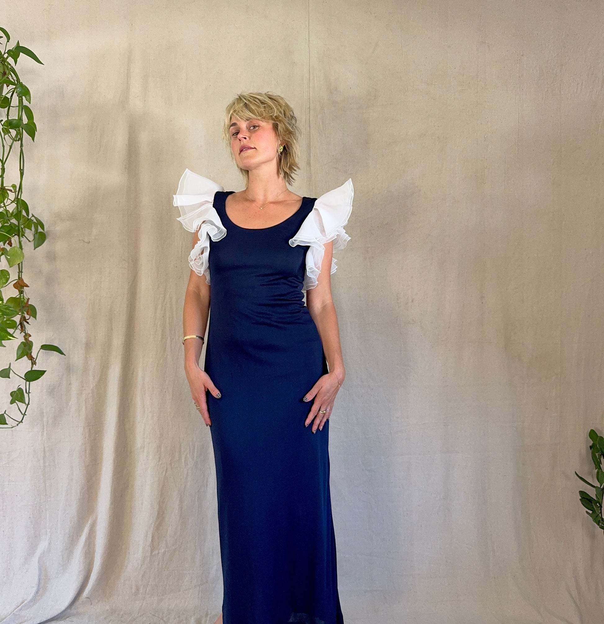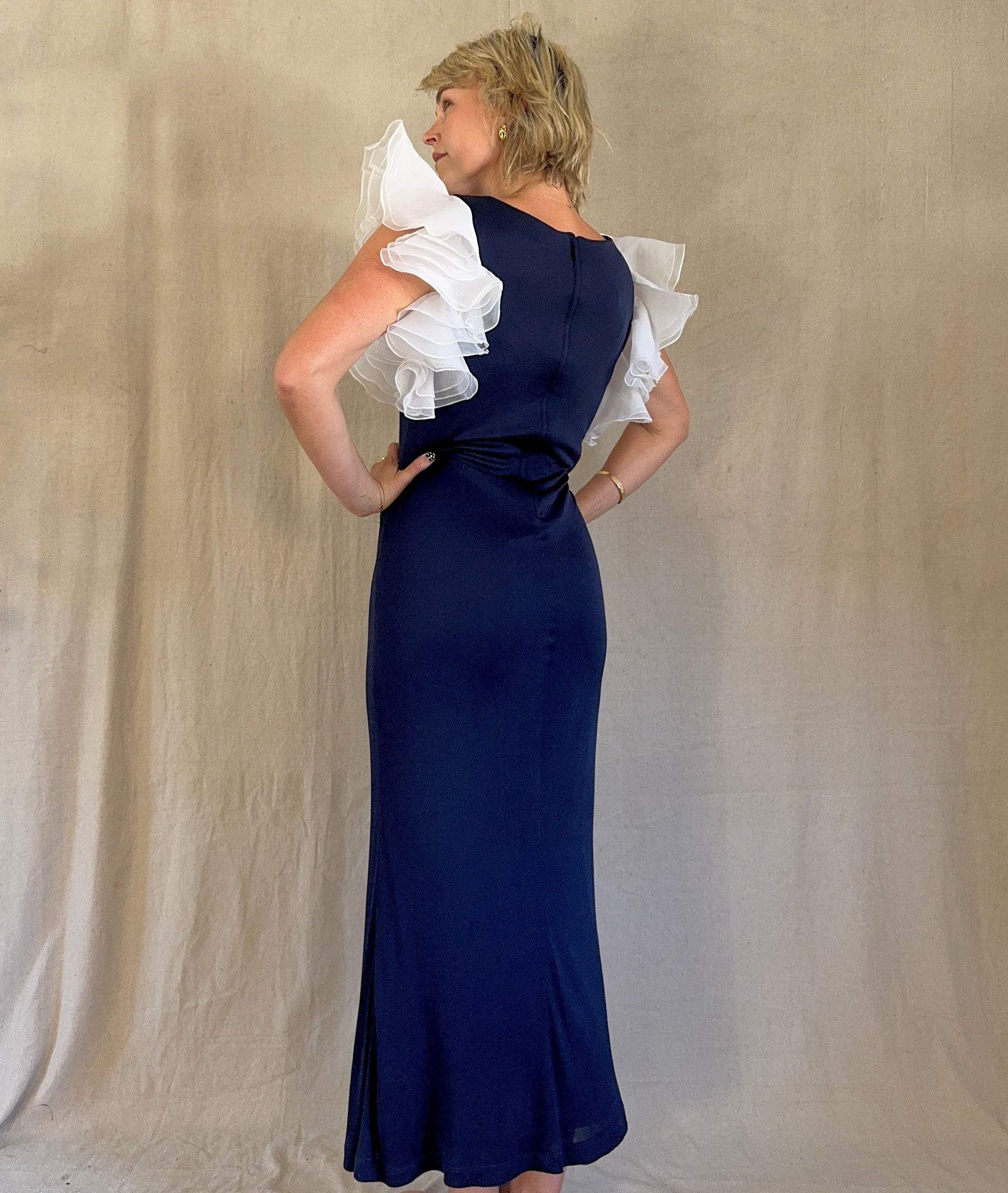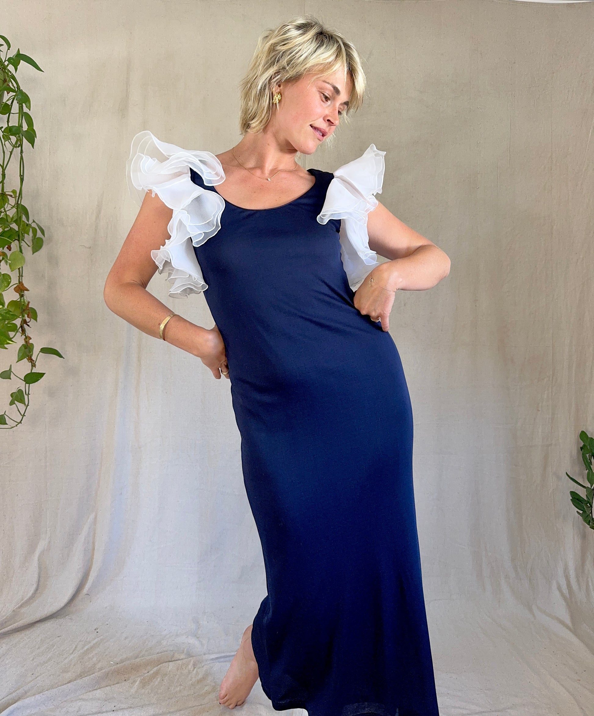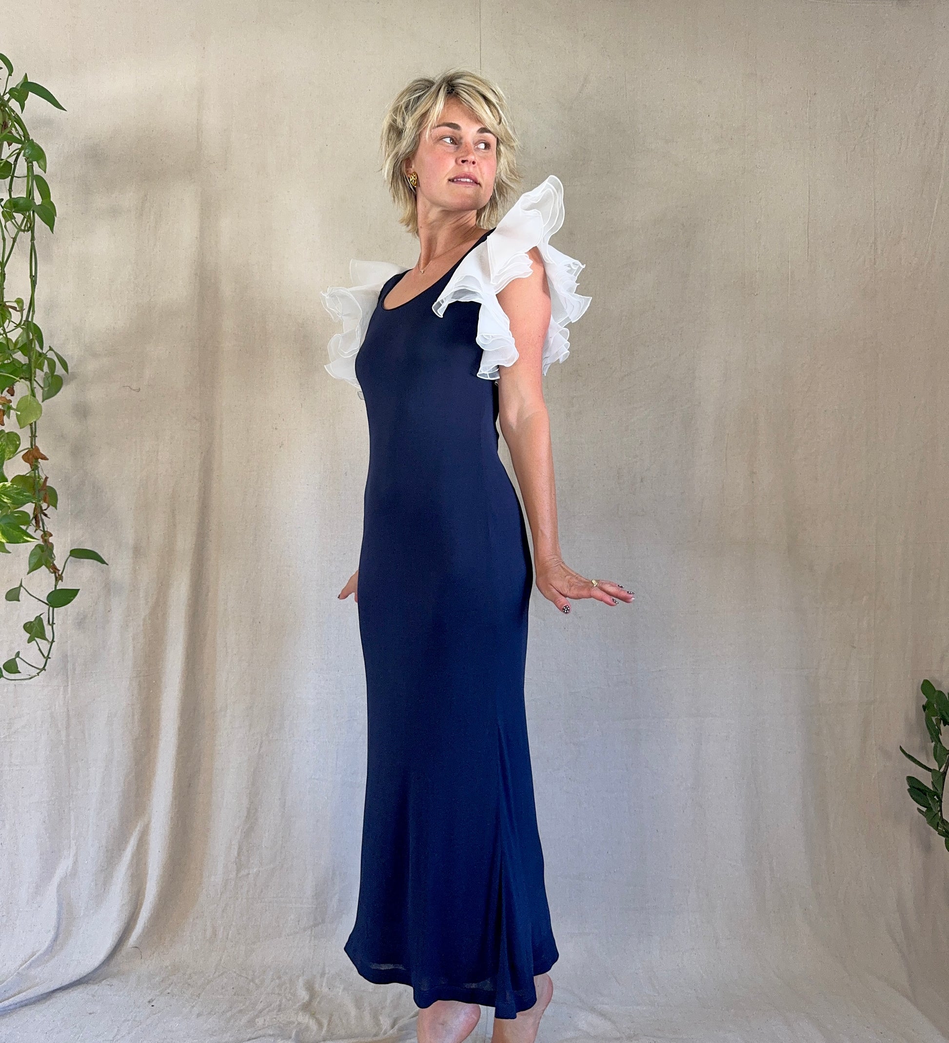 Known for her dramatic evening wear, this bold yet minimal Jill Richards Gown is a striking addition to your wardrobe, in deep navy with a clean column silhouette. Crisp, voluminous white ruffles cap each shoulder, adding drama and playful contrast. The Jill features a scoop neckline, a lot of stretch to the fabric, and a back zipper closure for easy elegance. Style it with vintage heels and a red lip for a night worth remembering.