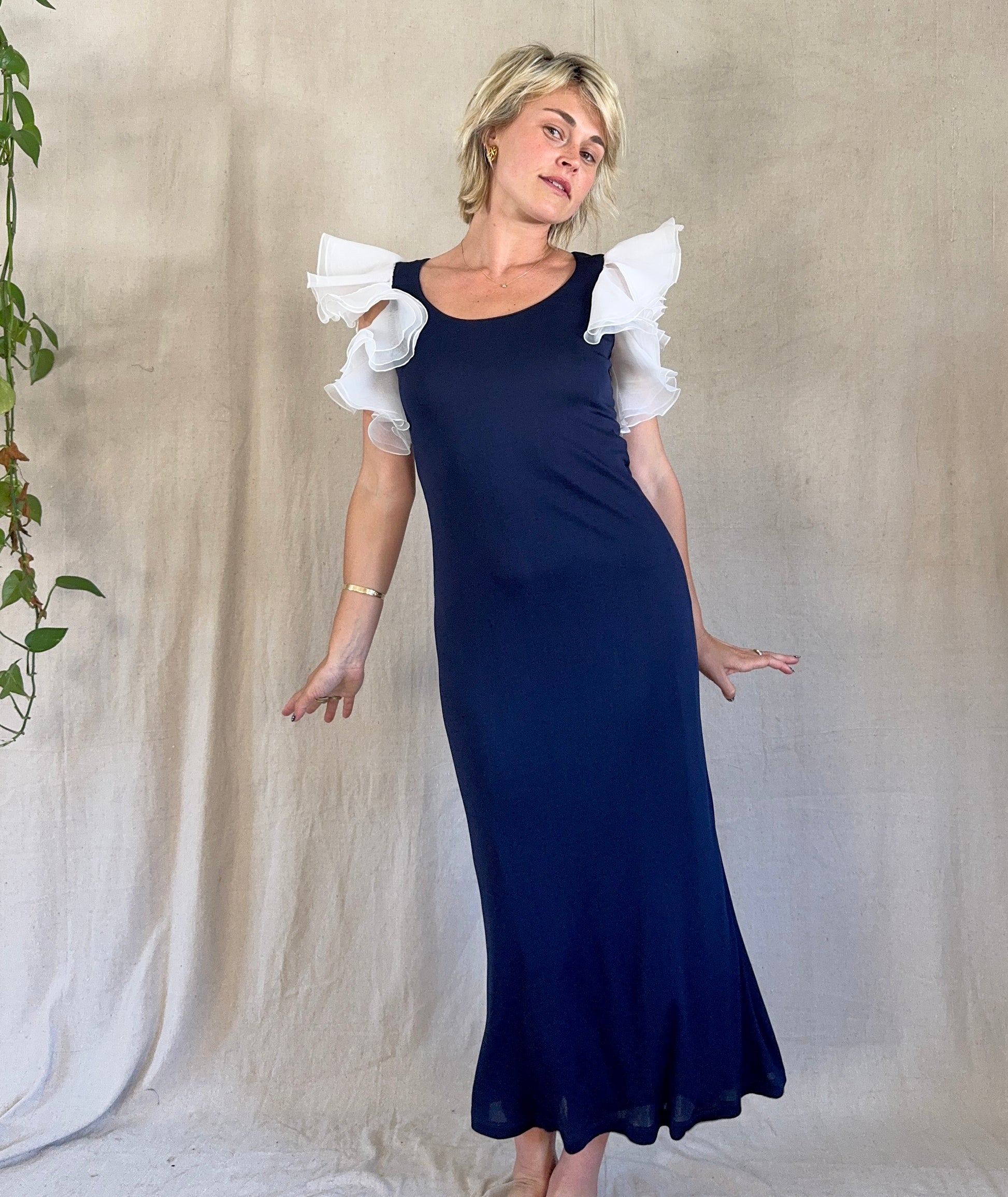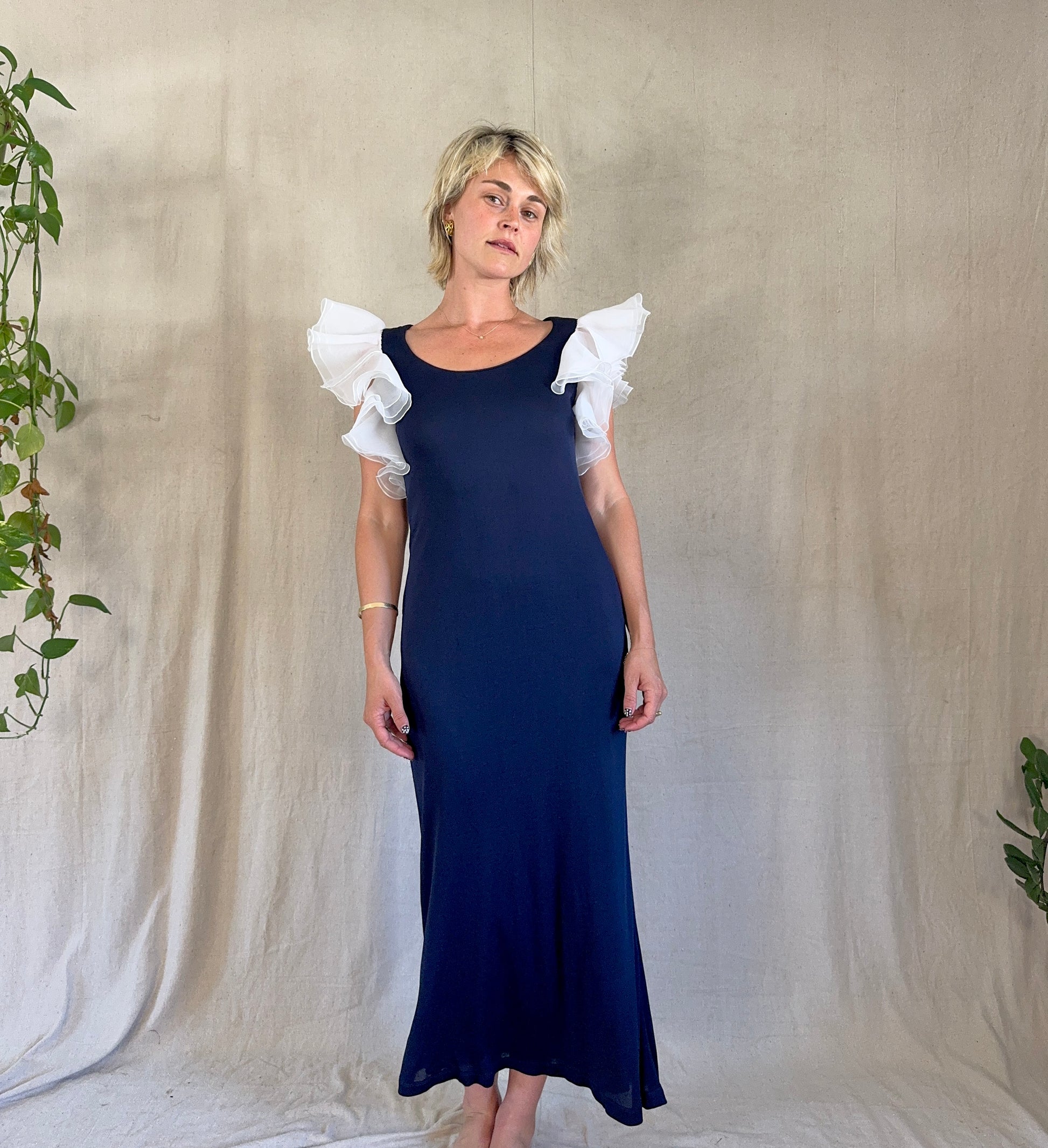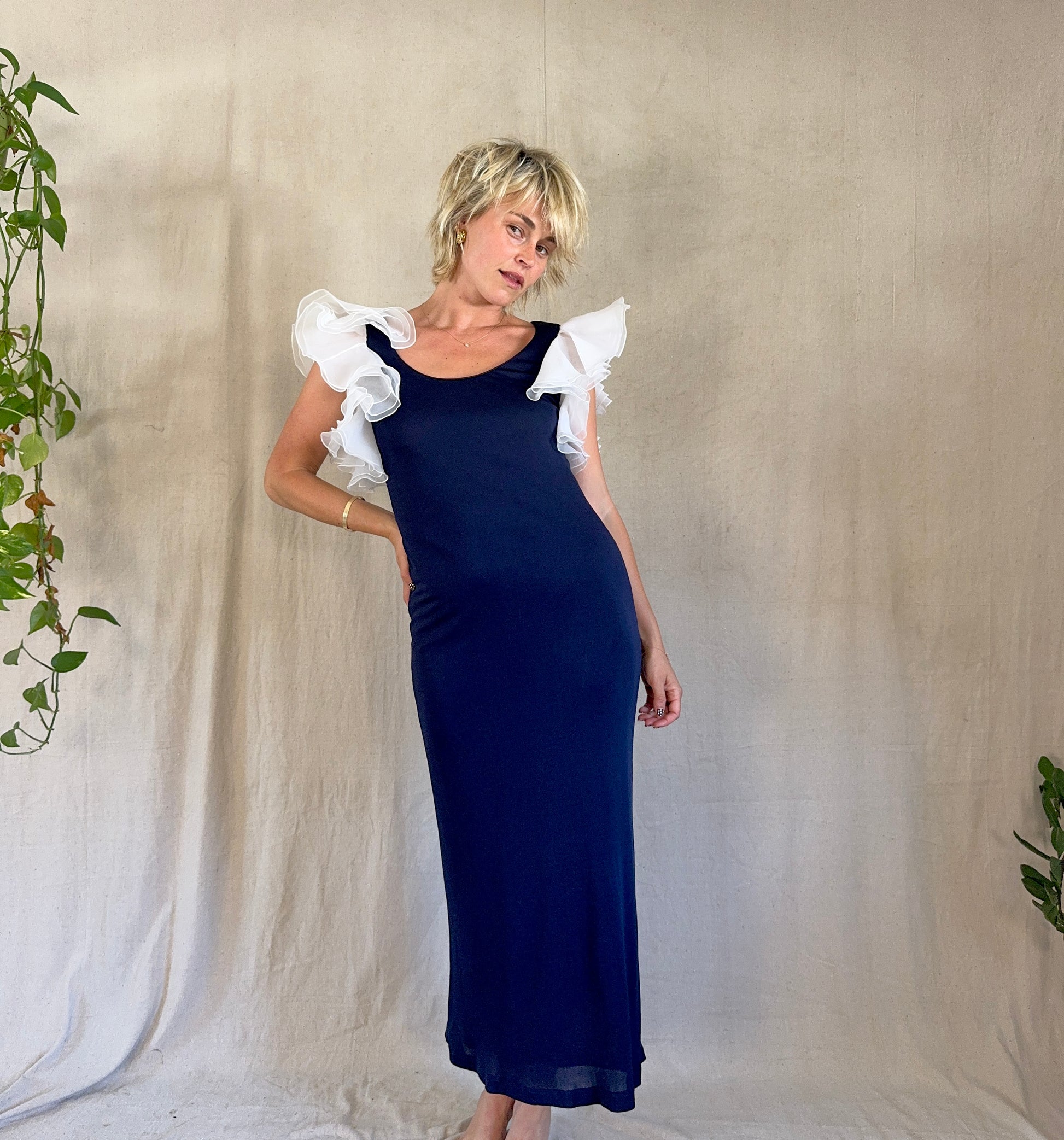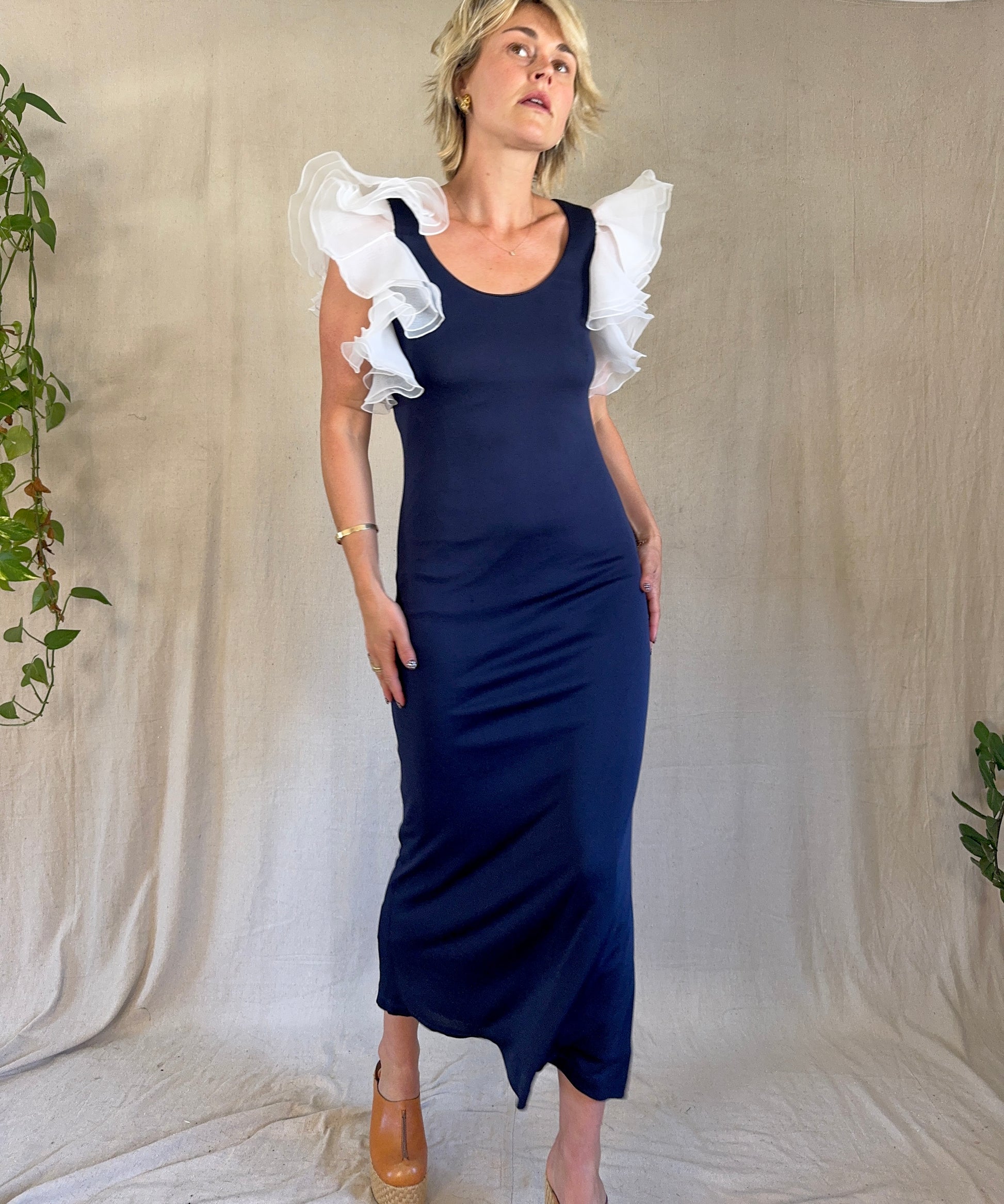 Known for her dramatic evening wear, this bold yet minimal Jill Richards Gown is a striking addition to your wardrobe, in deep navy with a clean column silhouette. Crisp, voluminous white ruffles cap each shoulder, adding drama and playful contrast. The Jill features a scoop neckline, a lot of stretch to the fabric, and a back zipper closure for easy elegance. Style it with vintage heels and a red lip for a night worth remembering.