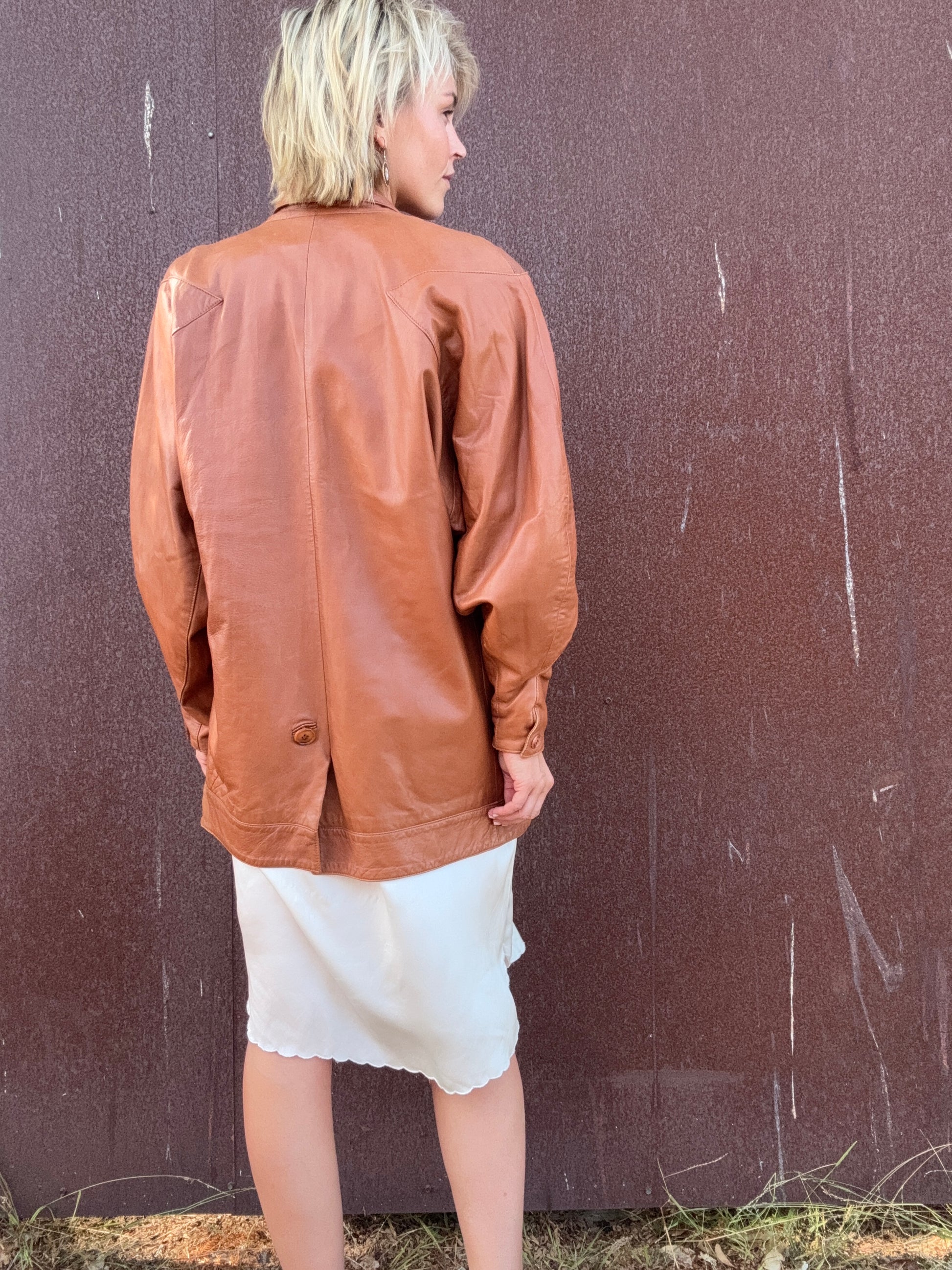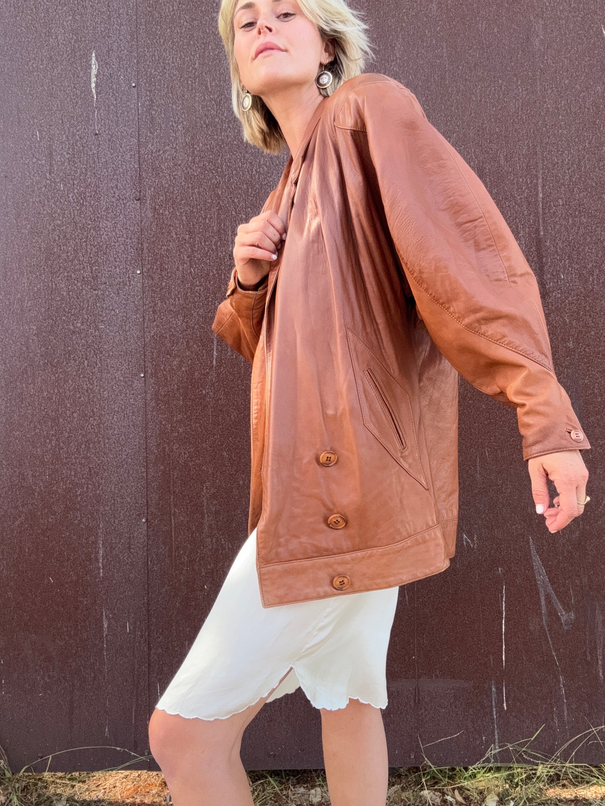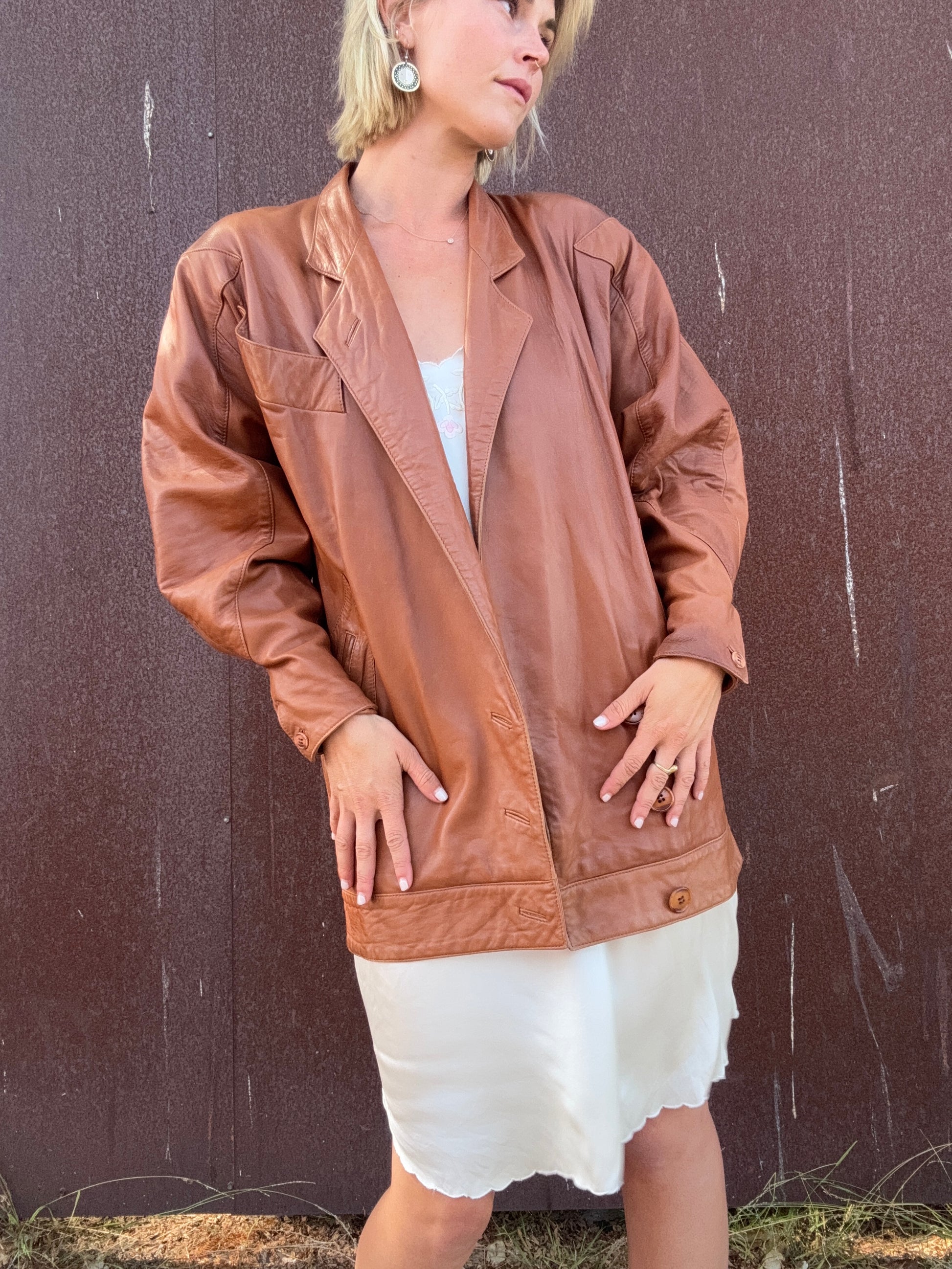 The Josephine 1980s Leather Jacket is cut from supple brown leather with subtle shoulder pads that shape the fit. Its sleeves taper from a wider cut at the upper arm to a narrow wrist, giving it a distinctive silhouette. The leather feels like absolute butter and has the most amazing flexibility to the entire piece. The angled pockets and seams highlight the craftsmanship of this vintage treasure. A three-button closure finishes the design, balancing her elongated silhouette. Style her with high-waist trousers or layered over a patterned midi dress for a refined look. This baby is in absolute perfect condition and great for layering.