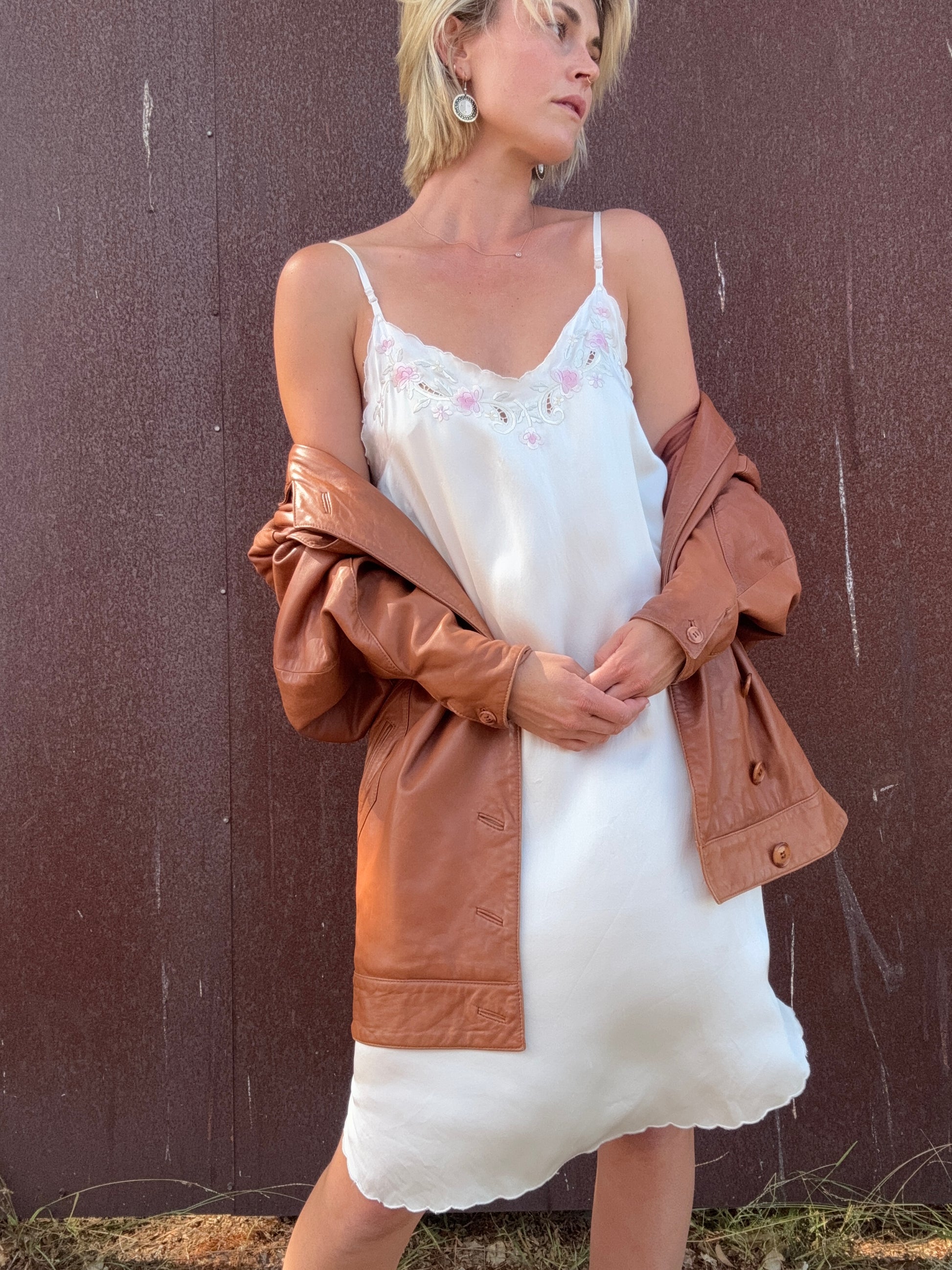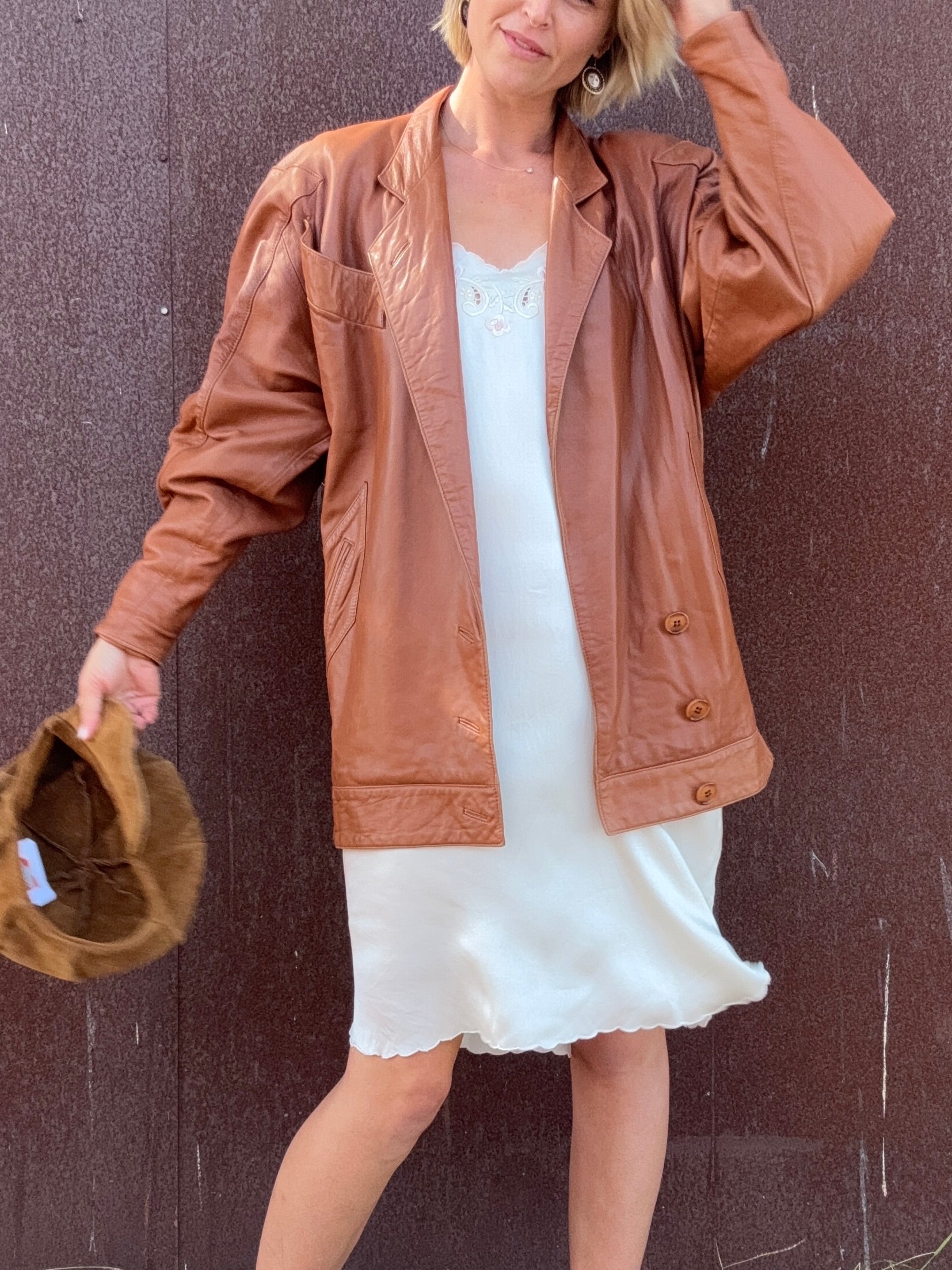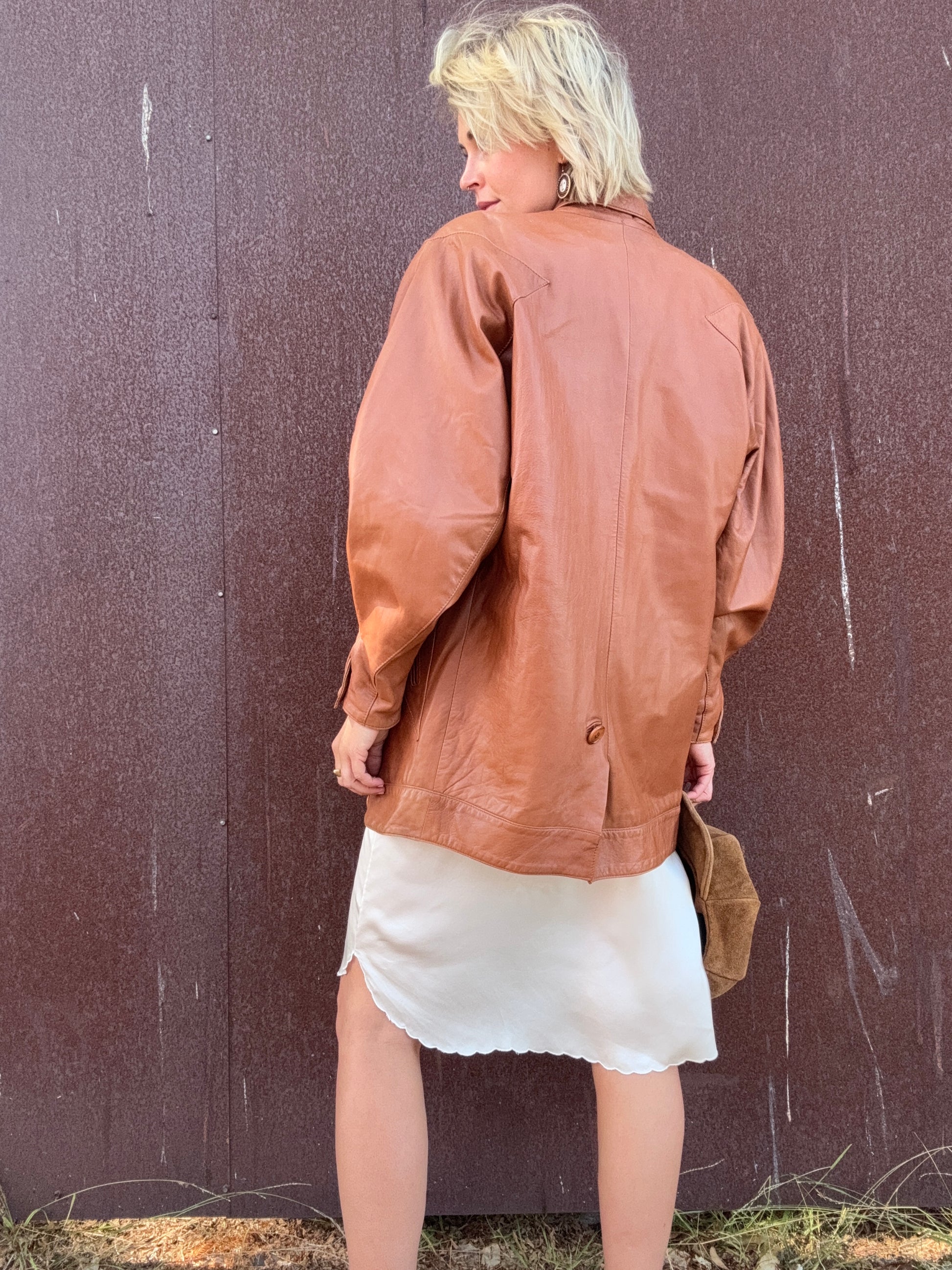 The Josephine 1980s Leather Jacket is cut from supple brown leather with subtle shoulder pads that shape the fit. Its sleeves taper from a wider cut at the upper arm to a narrow wrist, giving it a distinctive silhouette. The leather feels like absolute butter and has the most amazing flexibility to the entire piece. The angled pockets and seams highlight the craftsmanship of this vintage treasure. A three-button closure finishes the design, balancing her elongated silhouette. Style her with high-waist trousers or layered over a patterned midi dress for a refined look. This baby is in absolute perfect condition and great for layering.