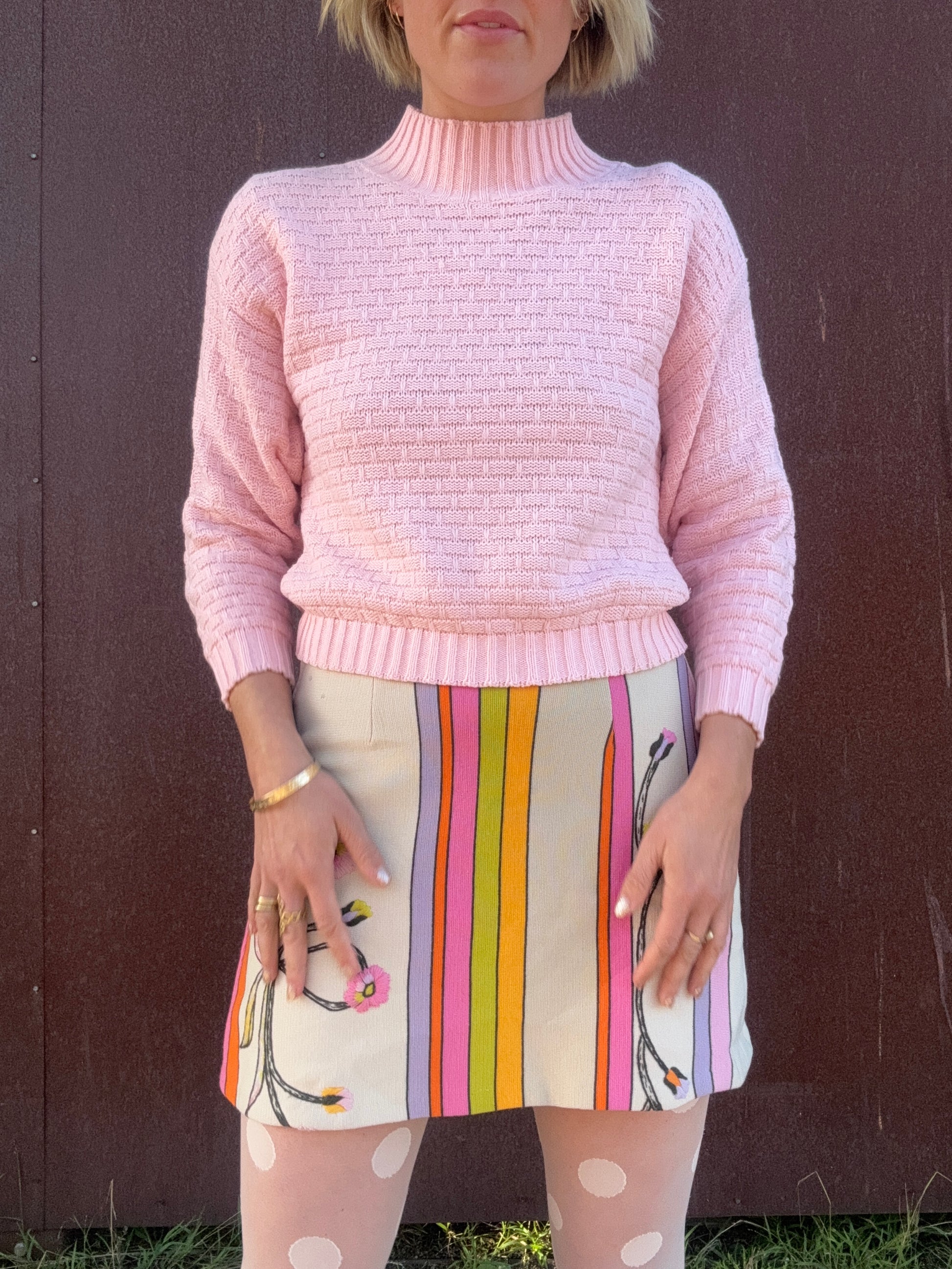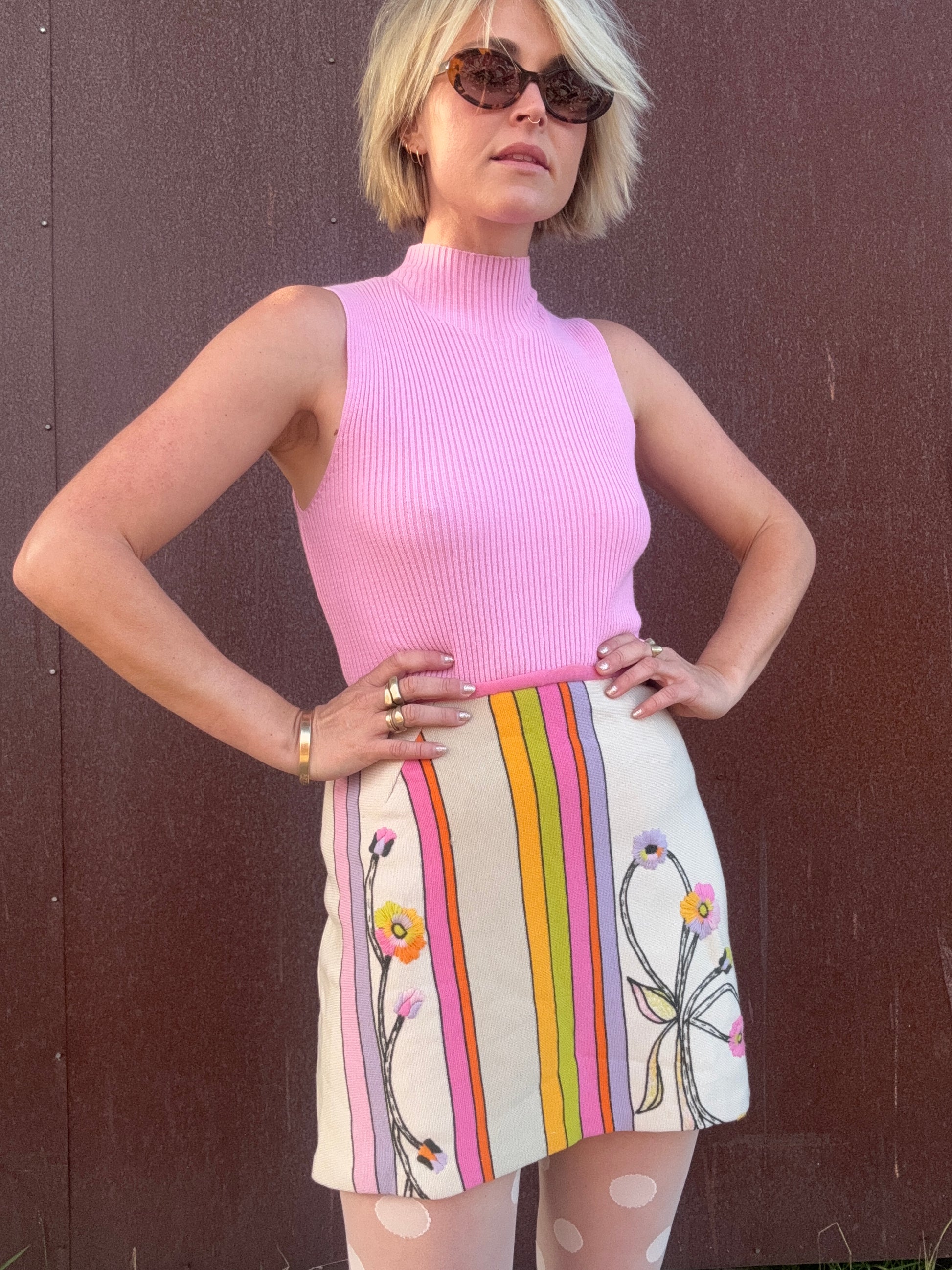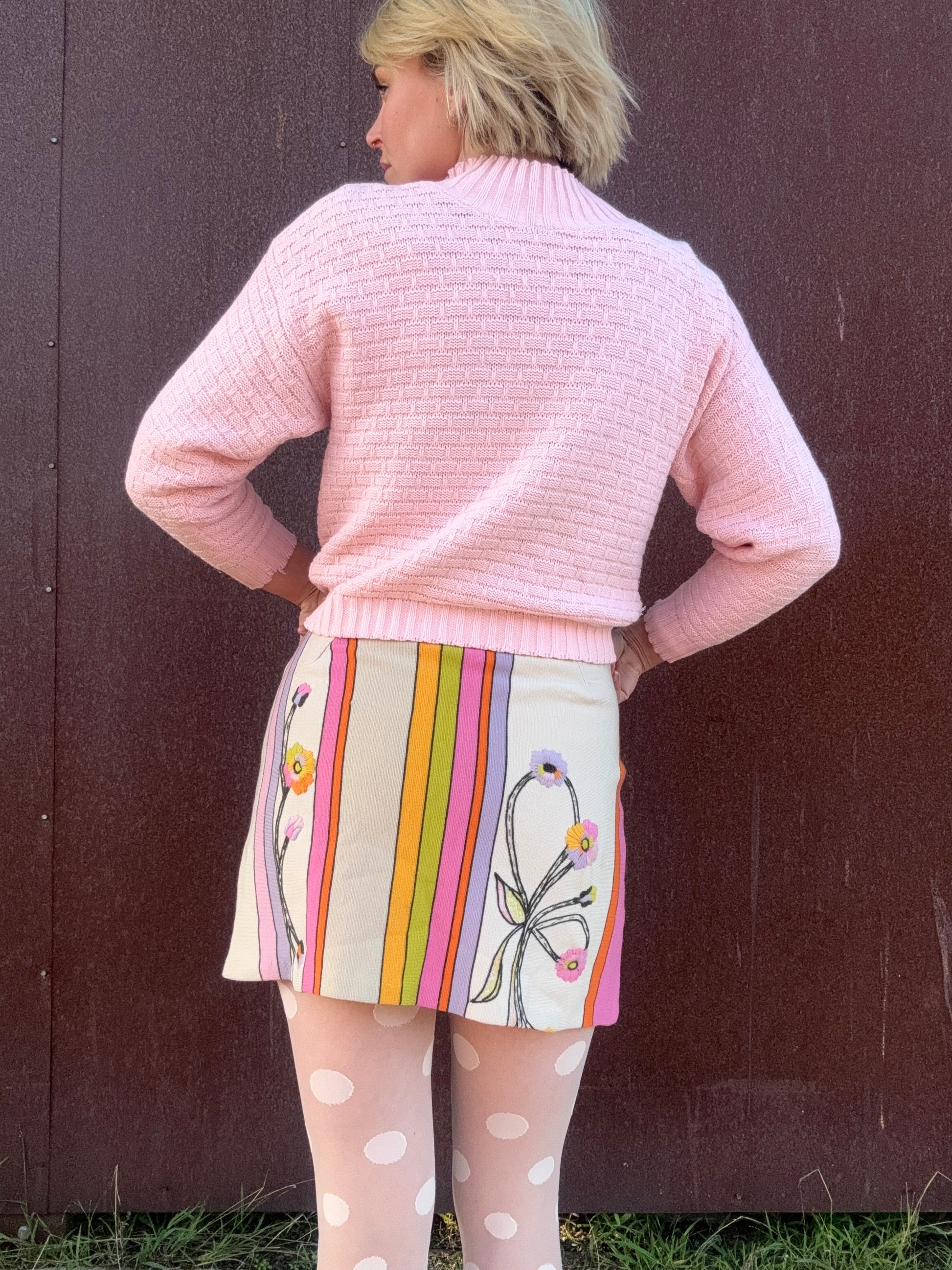 A joyful burst of color and craftsmanship, the Livia 1970s Hand Embroidered Wool Skirt is a celebration of true artisanal detail. Made in Italy from 100% pure wool, it features vibrant hand-embroidered flowers that dance across its striped knit backdrop, with each stitch adding depth, texture, and character. A side metal zipper with a hook-and-clasp closure keeps the silhouette clean while honoring the construction techniques of the era. So fun, so beautifully made, and so rare to find in this condition, it’s a standout piece that brings cheerful vintage charm to any wardrobe.