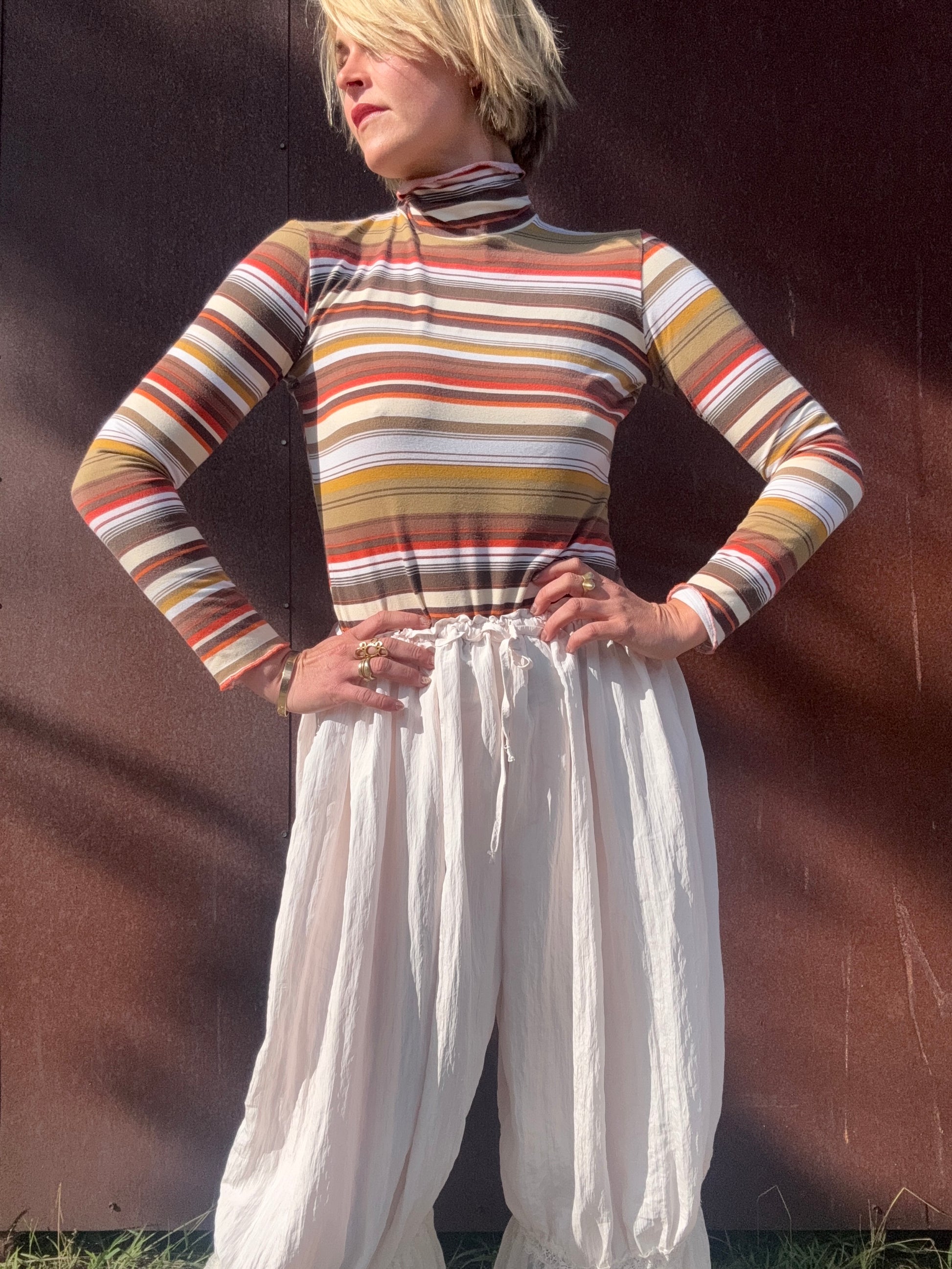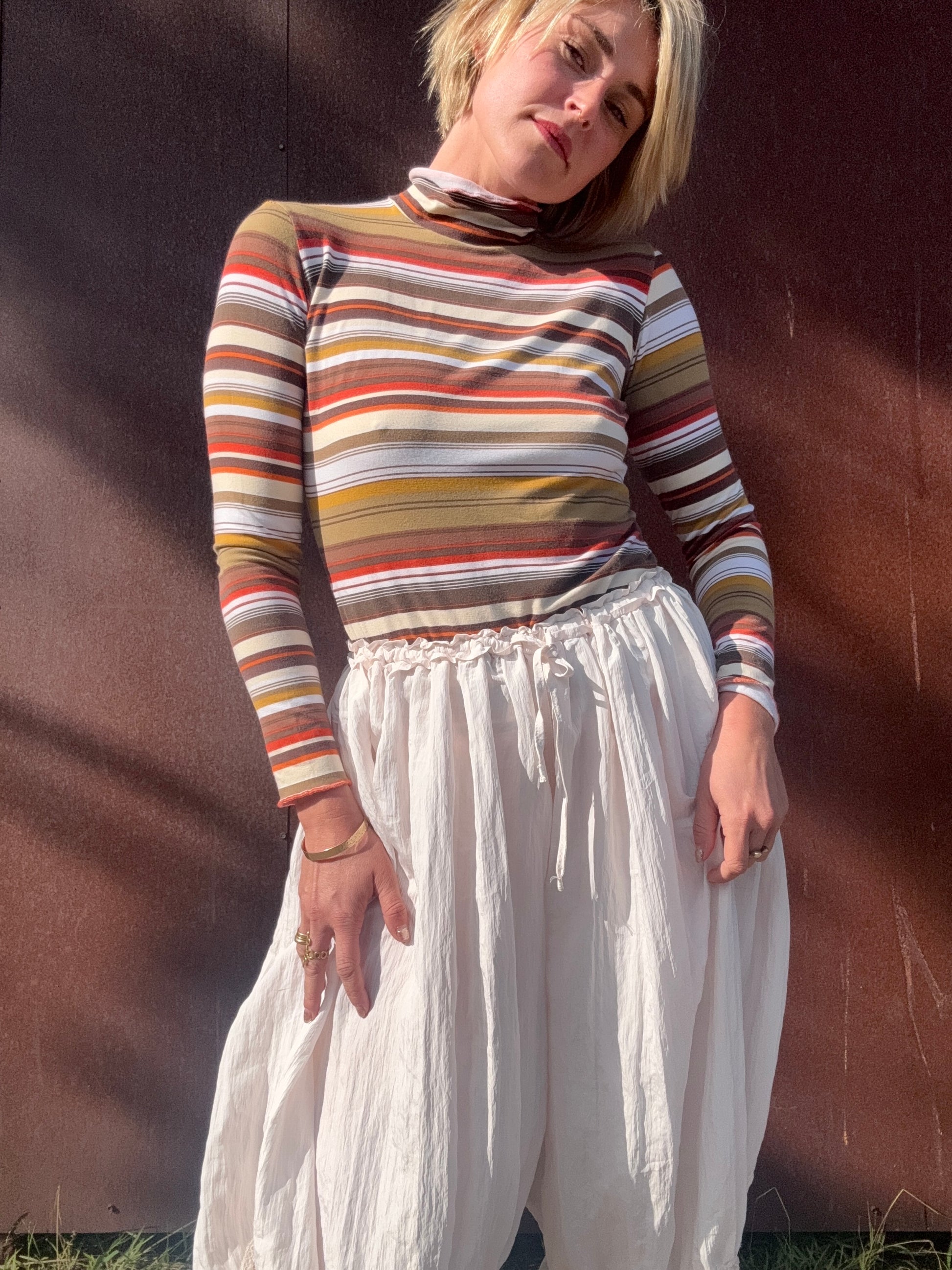 The Lorenza 1990s Striped Turtleneck is a soft, stretchy top with a surprisingly substantial weight that makes it feel instantly comforting to wear. This is the softest turtleneck. Its multicolored stripes are finished with delicate, overlocked hemlines that give the cuffs, neckline and bottom edge a subtle, easy drape. The turtleneck stands up naturally with no bulk, and the Conte of Florence label adds that distinctly elevated ’90s European sportswear touch. Pair it with high-waisted trousers and a long coat for a clean, pulled-together look, or tuck it into a corduroy midi skirt with a leather belt for something a bit cozier.