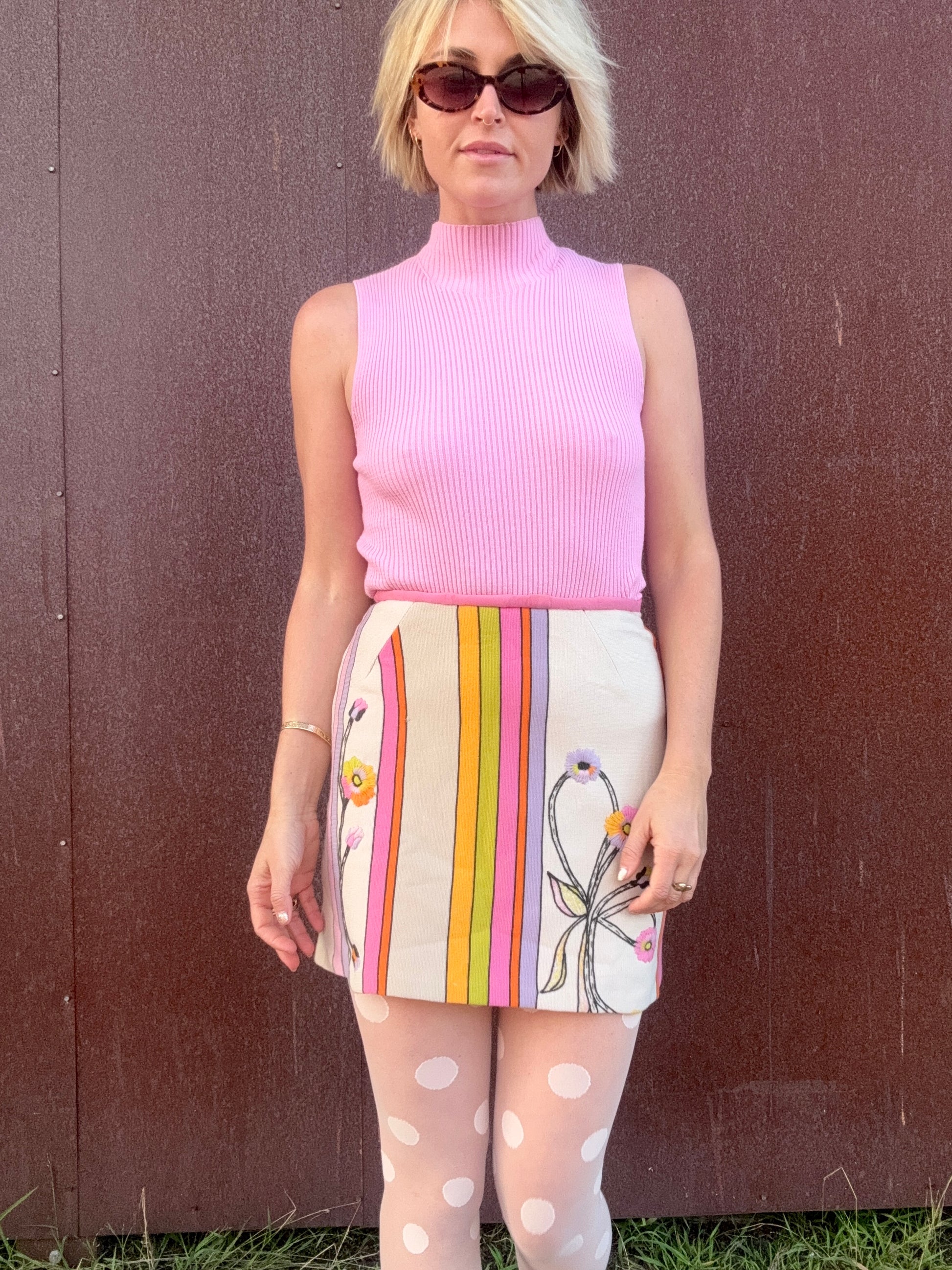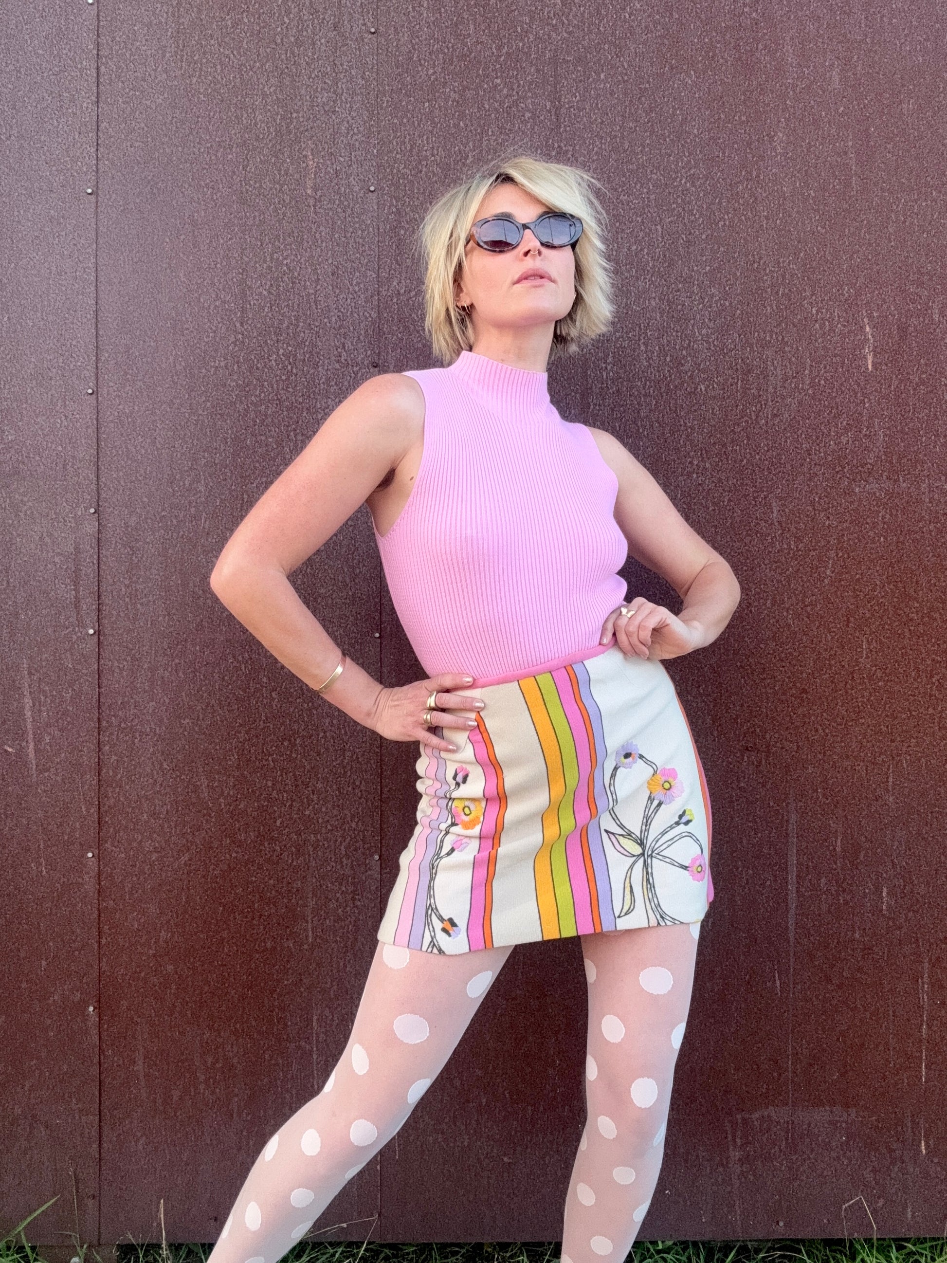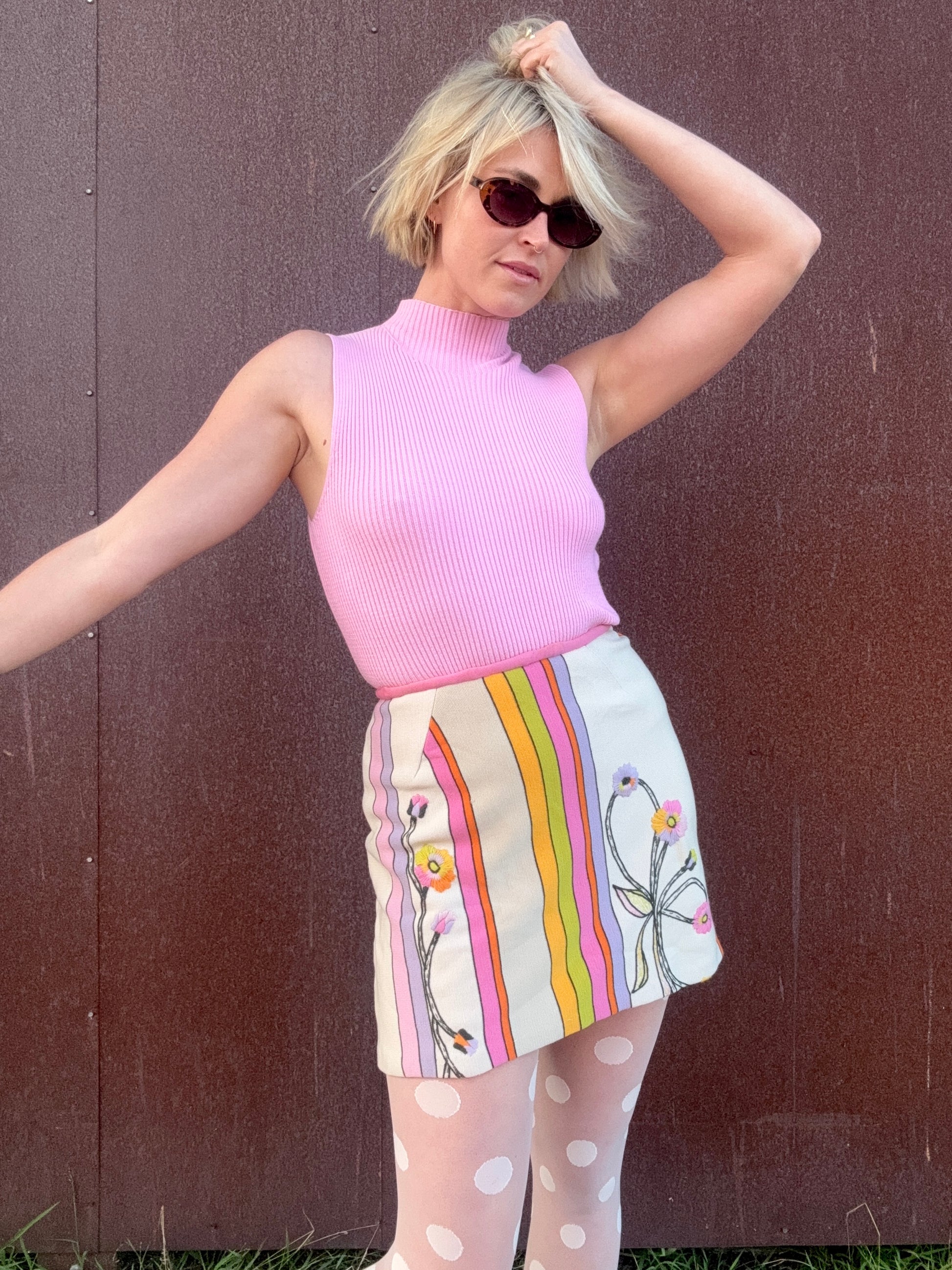 The Mireille 1990s Ribbed Mock-Neck Knit is that perfect minimalist staple the decade was known for: sleek, stretchy, and softly structured. The wide ribbing creates a clean, vertical line that skims the body without clinging, while the mock neckline adds a subtle architectural lift. Lightweight but substantial, it’s the kind of piece that layers effortlessly and still holds its own when worn alone. The soft pink tone gives it a sweet, modern edge that plays beautifully with both neutrals and deeper tones. Pair her with a leather jacket, slouchy vintage trousers and a sharp belt for a polished look, or wear her tucked into dark denim with an oversized blazer to bring out her 90s simplicity.
