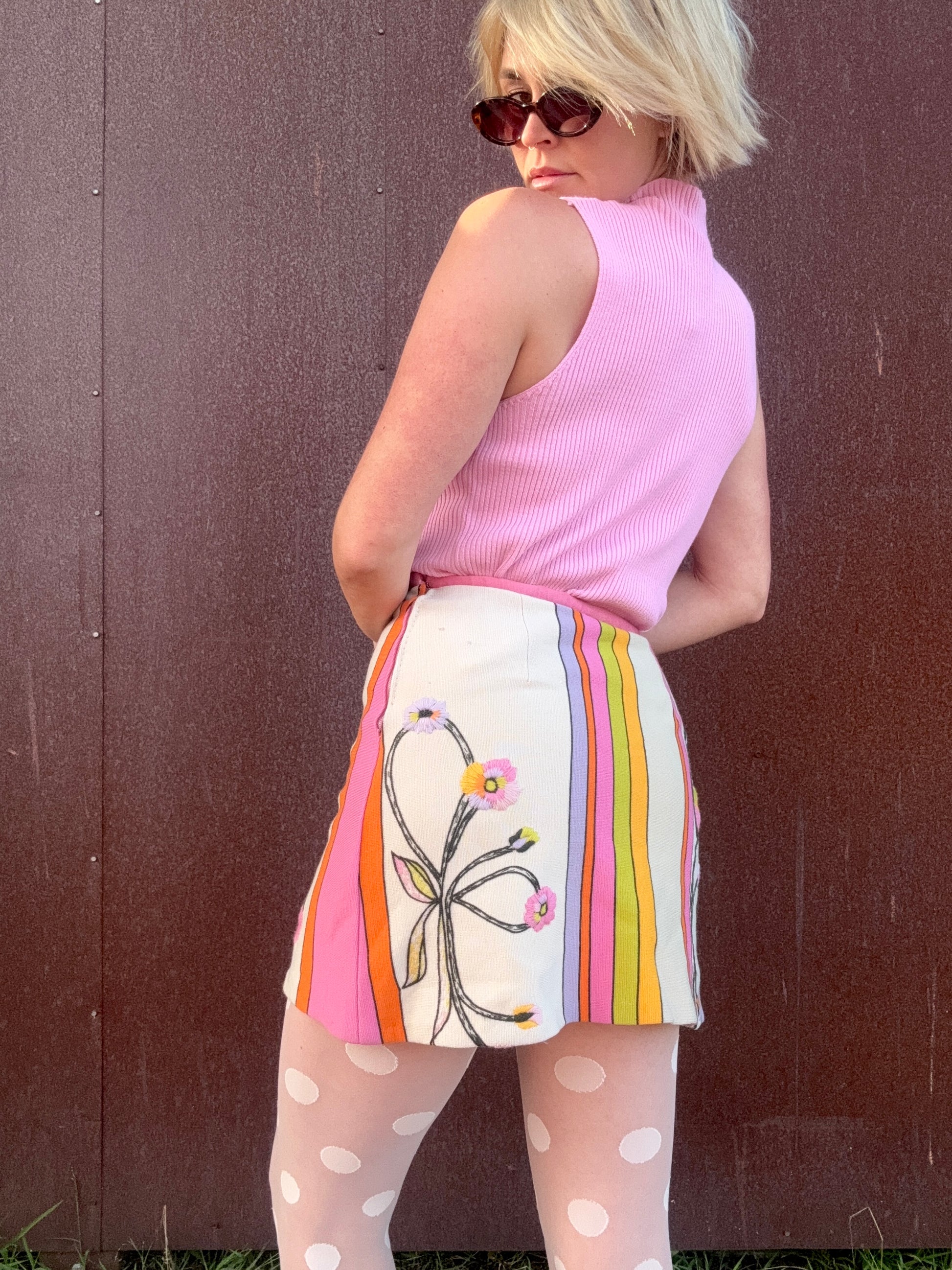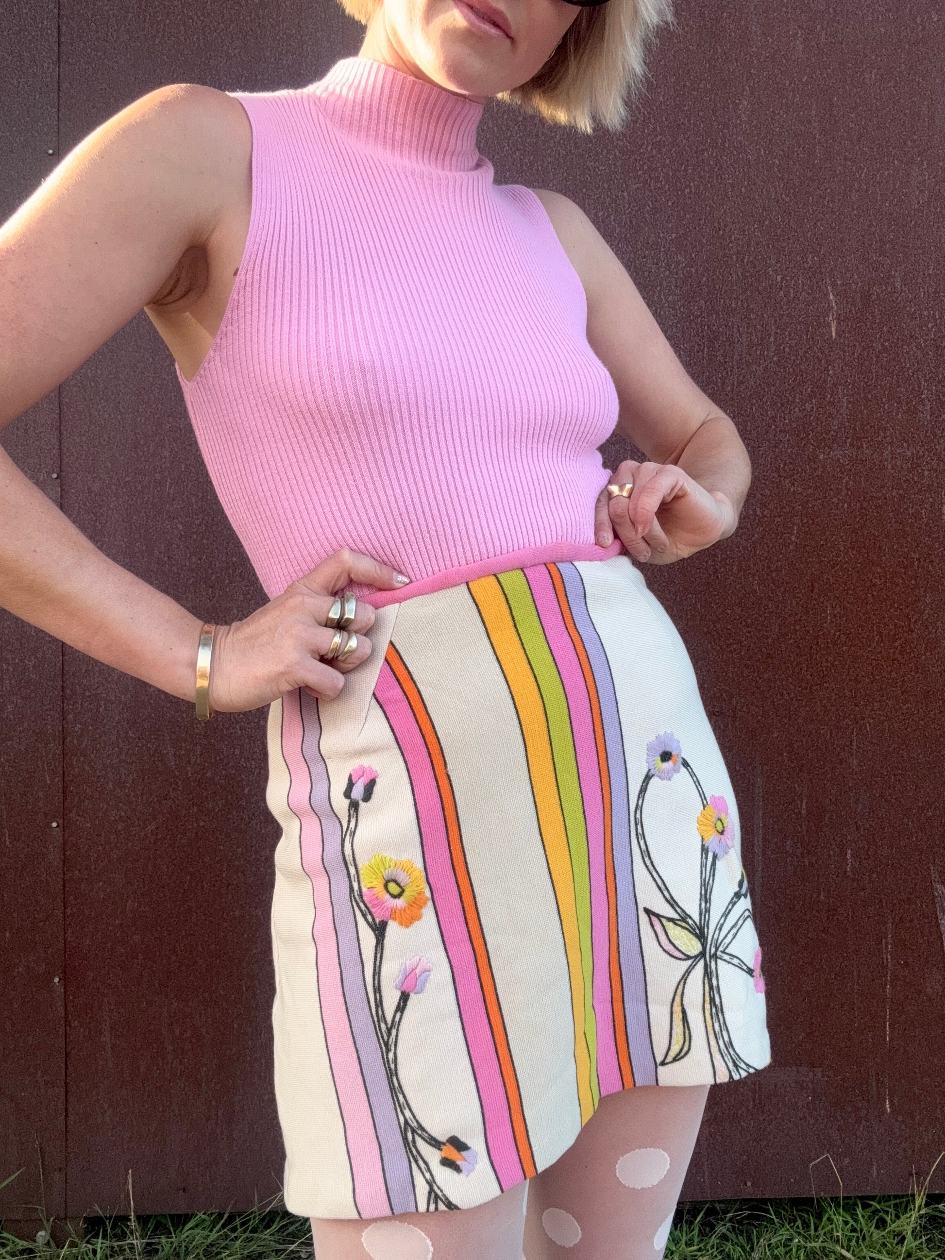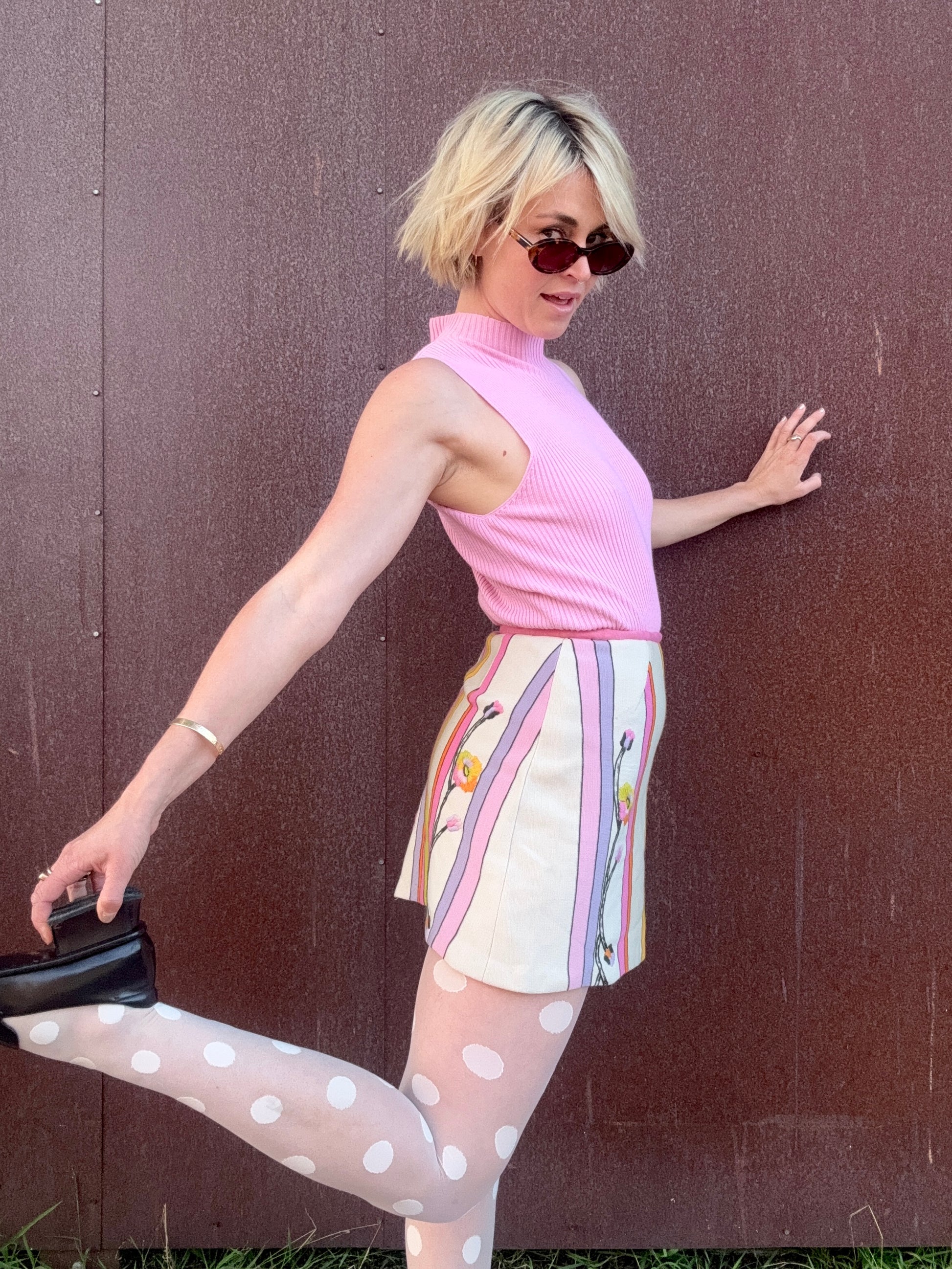 The Mireille 1990s Ribbed Mock-Neck Knit is that perfect minimalist staple the decade was known for: sleek, stretchy, and softly structured. The wide ribbing creates a clean, vertical line that skims the body without clinging, while the mock neckline adds a subtle architectural lift. Lightweight but substantial, it’s the kind of piece that layers effortlessly and still holds its own when worn alone. The soft pink tone gives it a sweet, modern edge that plays beautifully with both neutrals and deeper tones. Pair her with a leather jacket, slouchy vintage trousers and a sharp belt for a polished look, or wear her tucked into dark denim with an oversized blazer to bring out her 90s simplicity.
