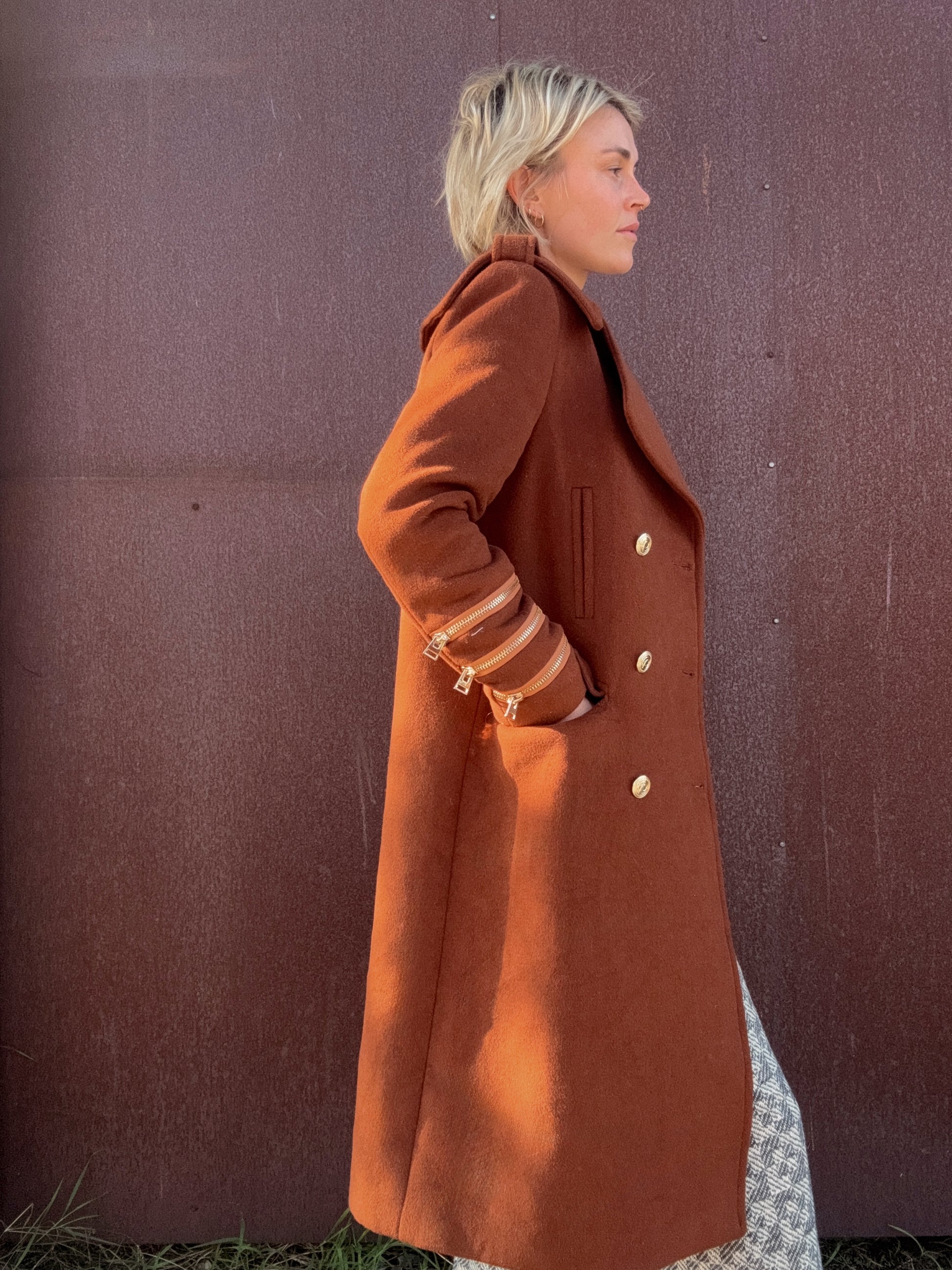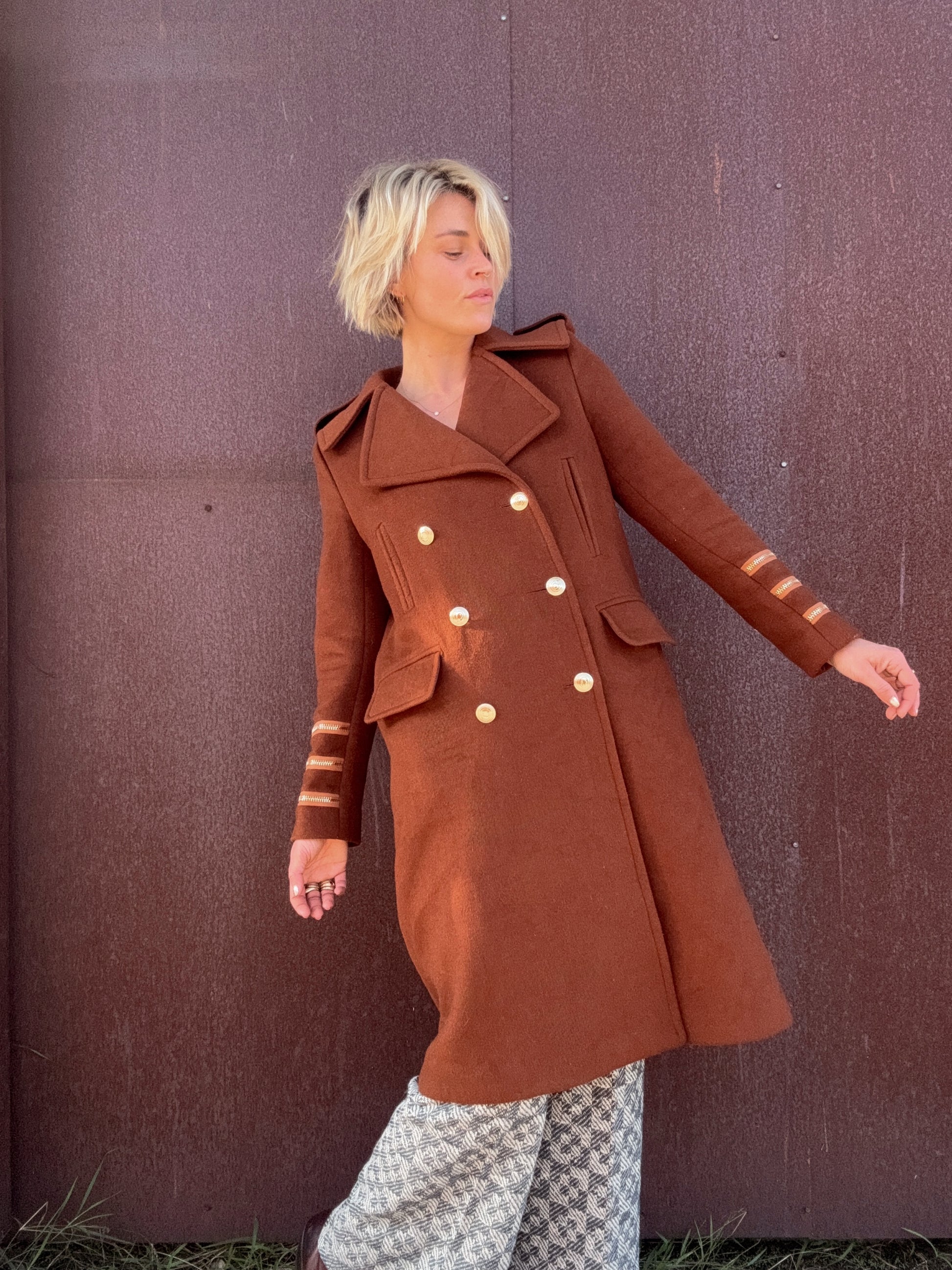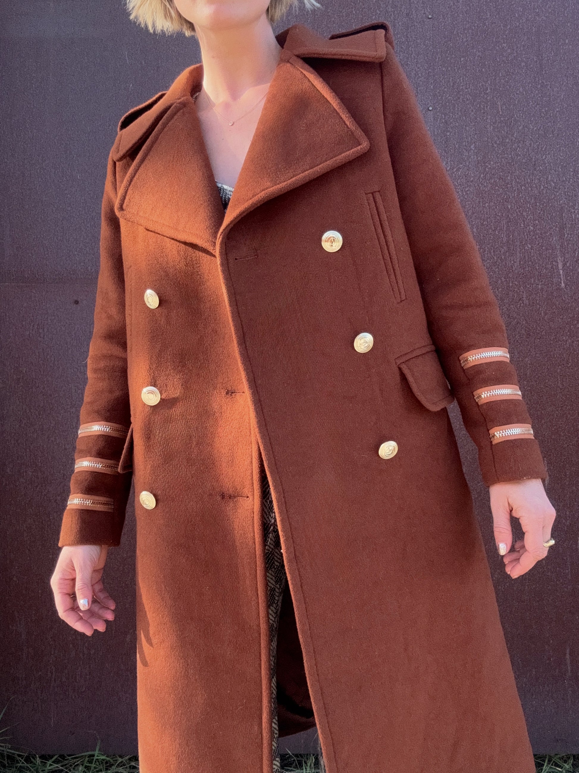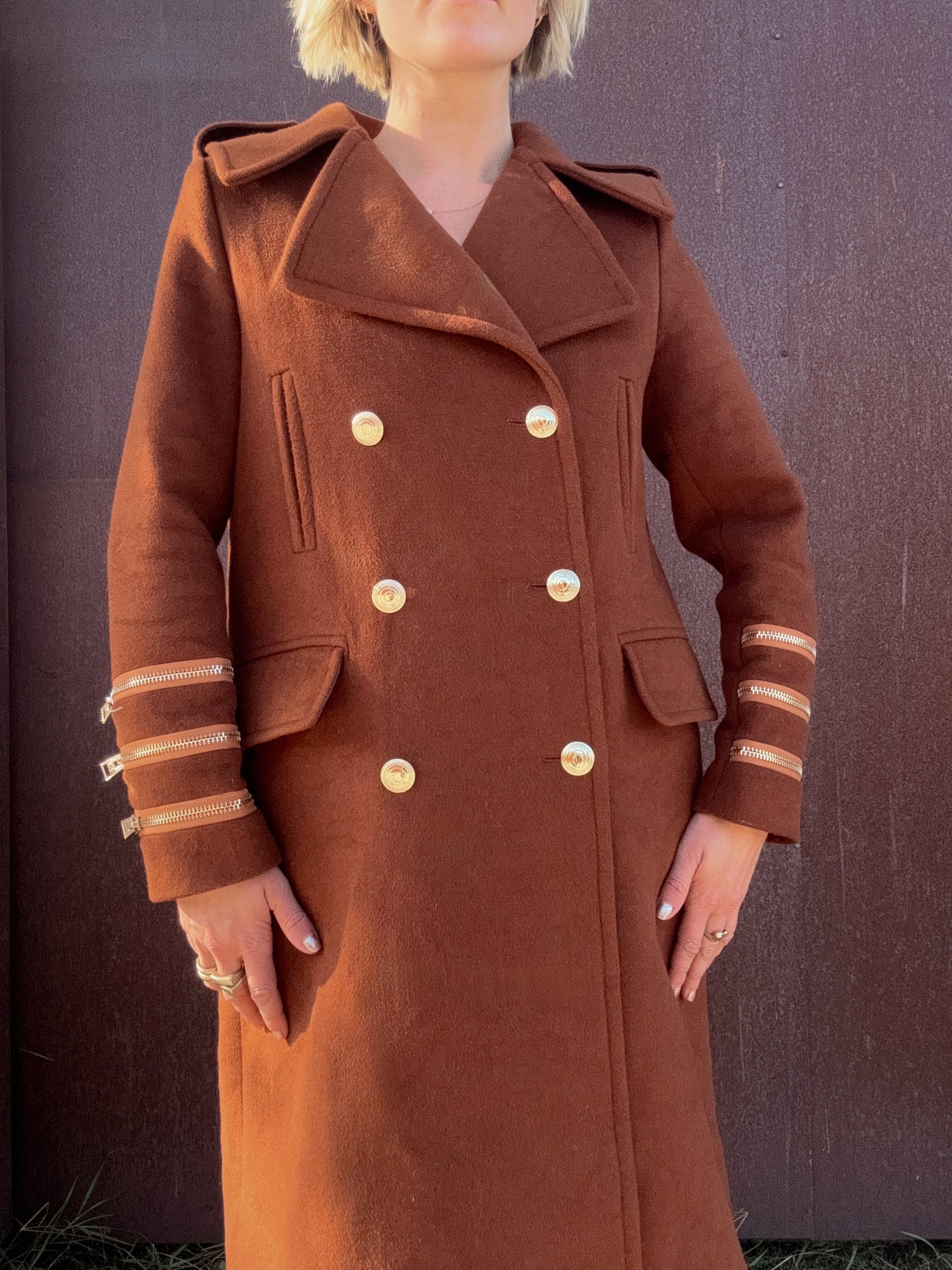 The Noelle 1980s Wool Coat is a sharply tailored, fully lined wool and cashmere blend with a structured double-breasted front and two sets of functional front pockets. Its standout details include triple zipper accents on each sleeve, bold gold buttons throughout, and a back collar flap that adds a sculptural touch from behind. The rich brown wool holds its shape beautifully, giving the coat a clean, elongated line without feeling stiff. Style it with wide-leg trousers and heeled boots for an elevated day look, or drape it over a turtleneck dress with your favorite leather gloves for something more refined.