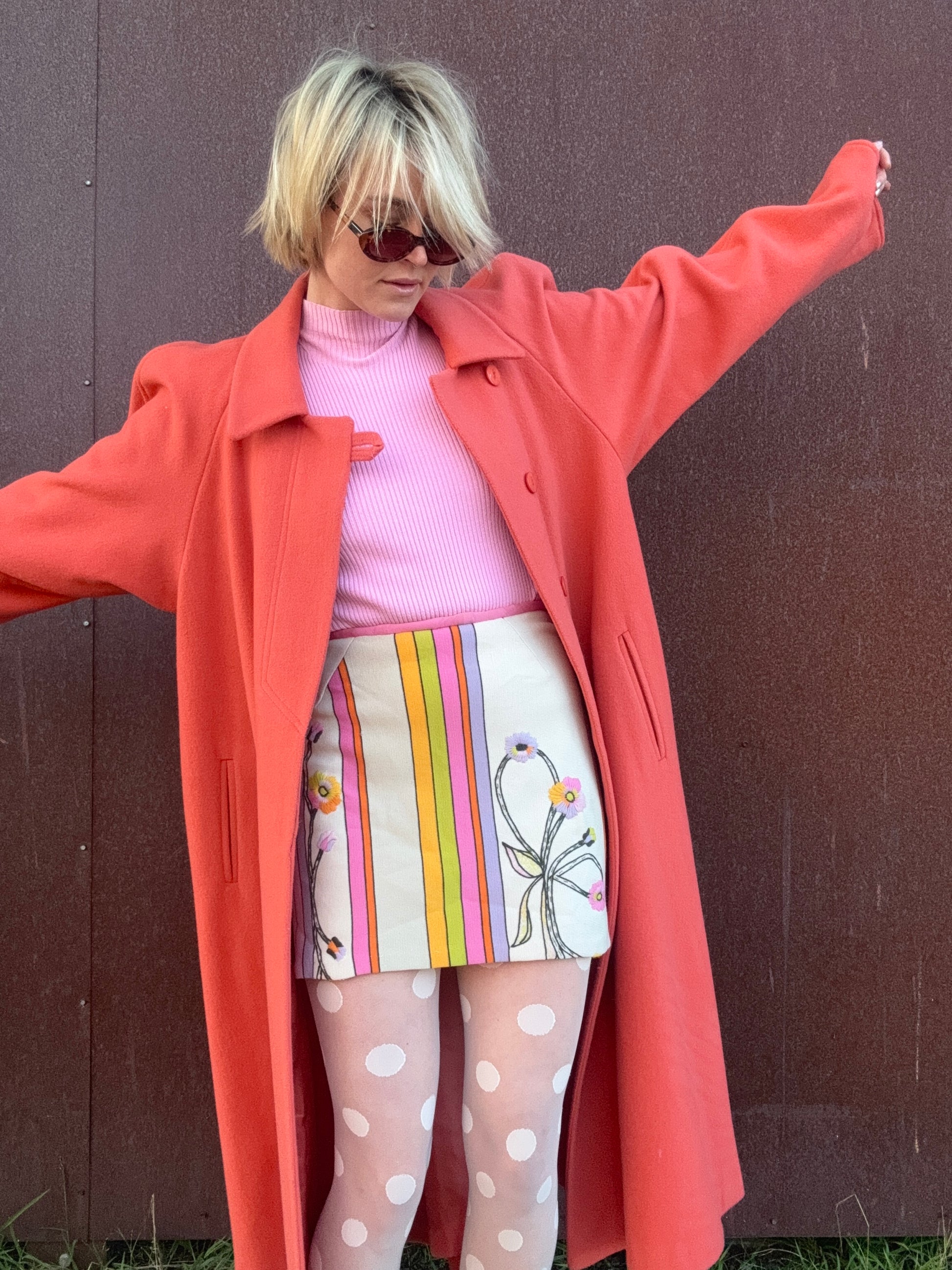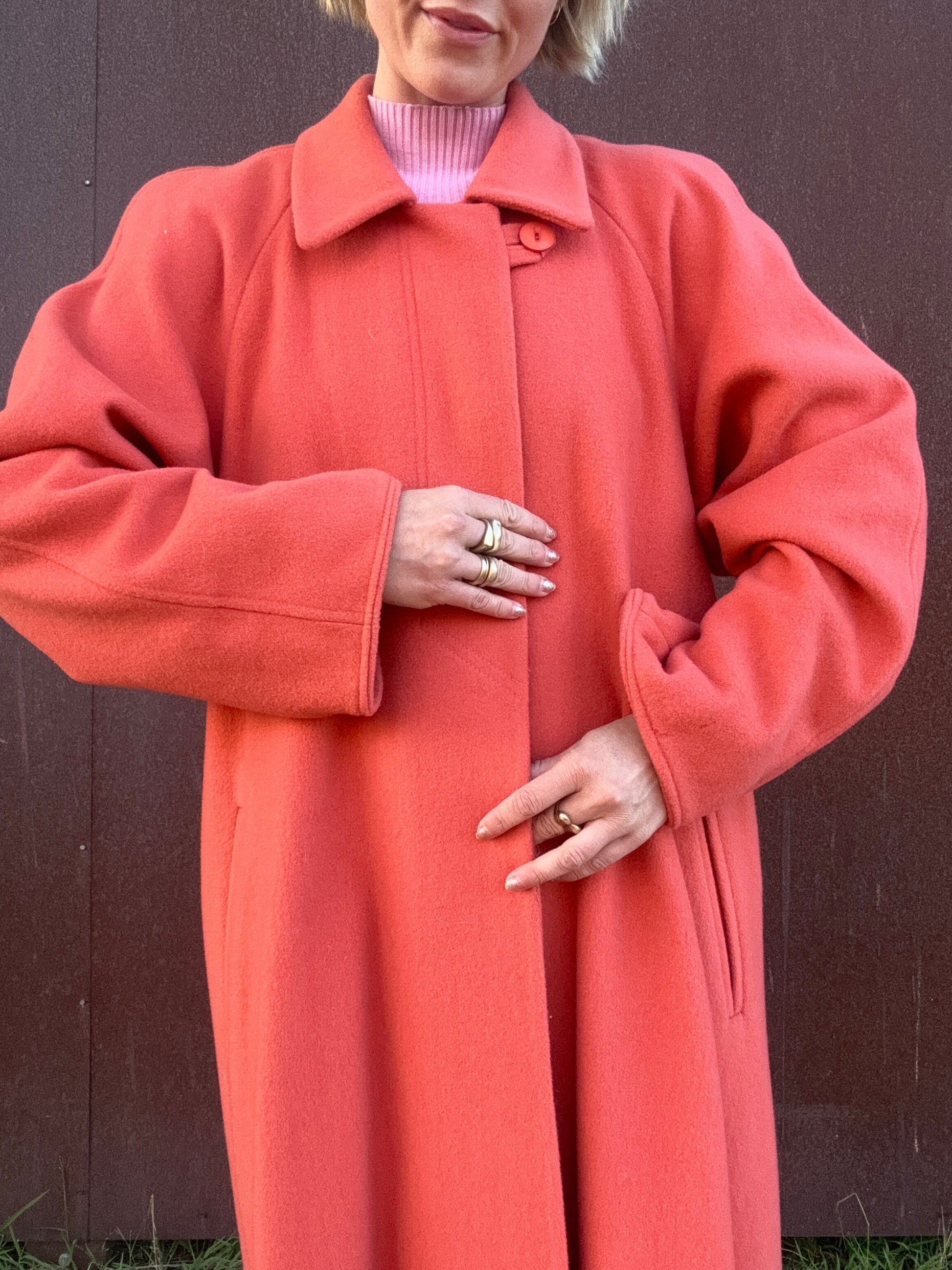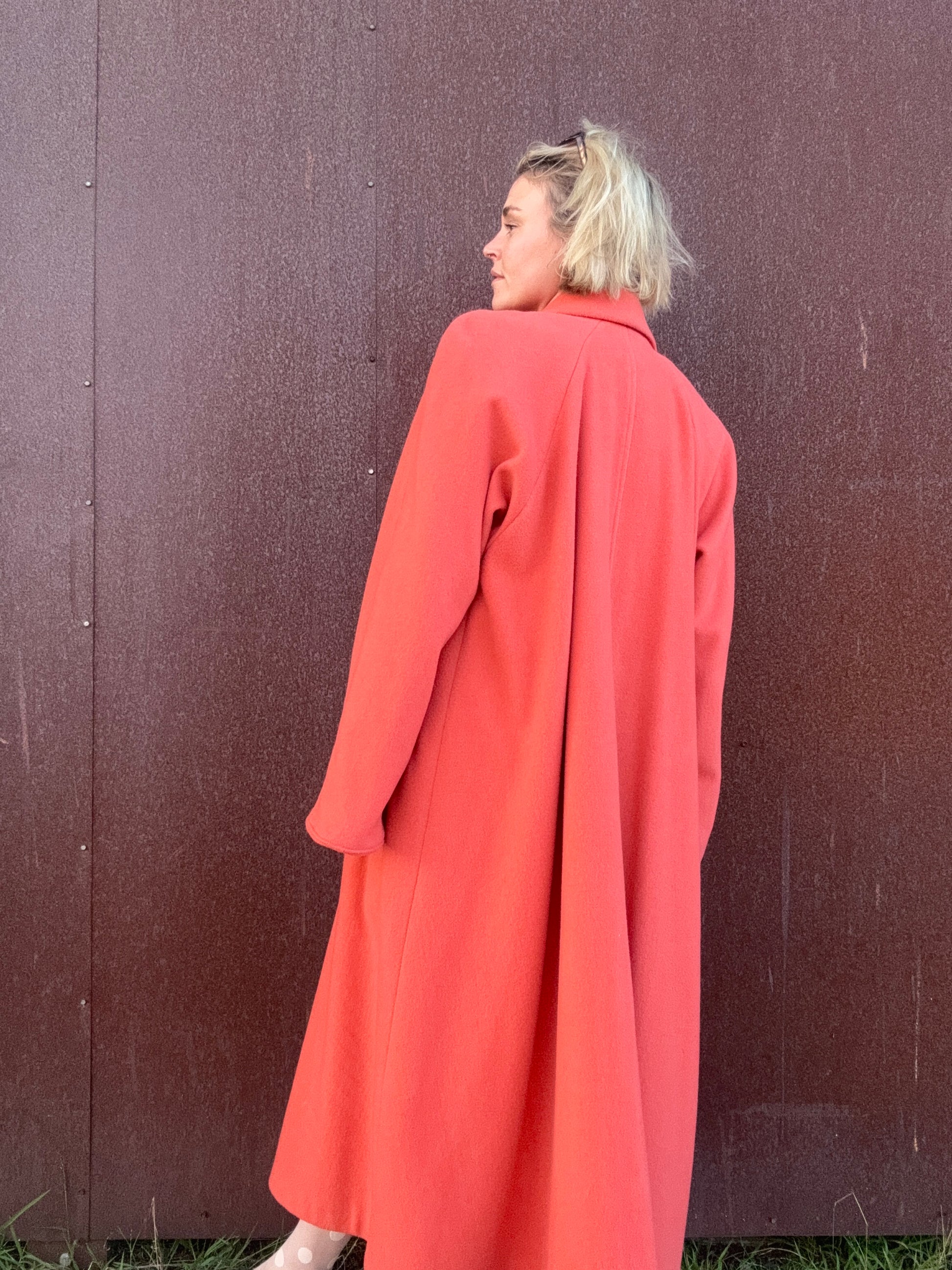 The Paloma 1980s Trench Coat is a union-made, USA-crafted wool blend in a rich persimmon tone with a full inner lining. Its A-line shape is set off by sculptural shoulder piping that creates a defined silhouette without padding, giving it that unmistakable 1980s architectural finish. The coat features a button-front closure where all but the top button are hidden when fastened, plus practical side pockets that blend cleanly into the seaming. Style it with a slim turtleneck and tall boots, or layer it over wide-leg trousers with a soft scarf for contrast.