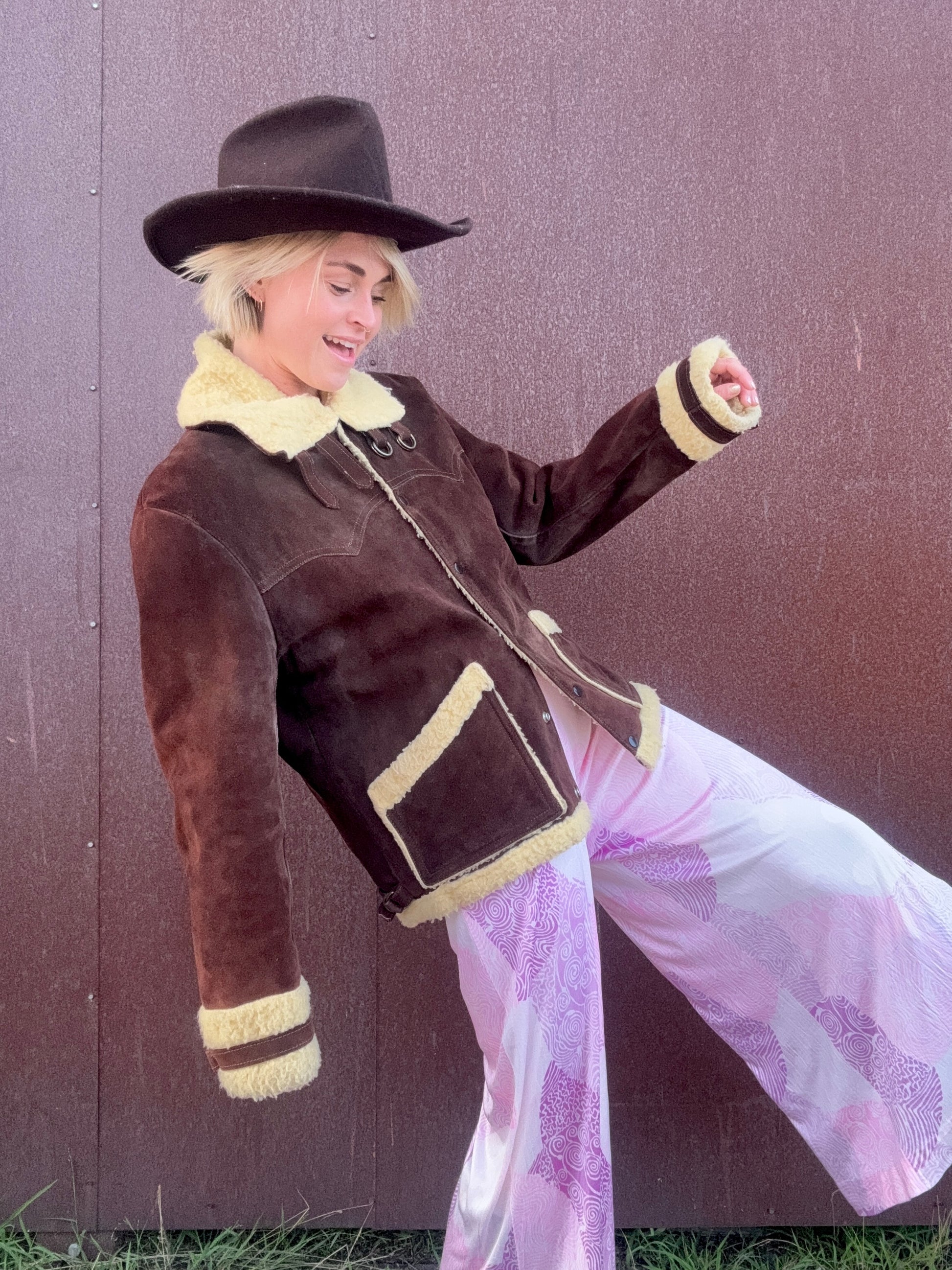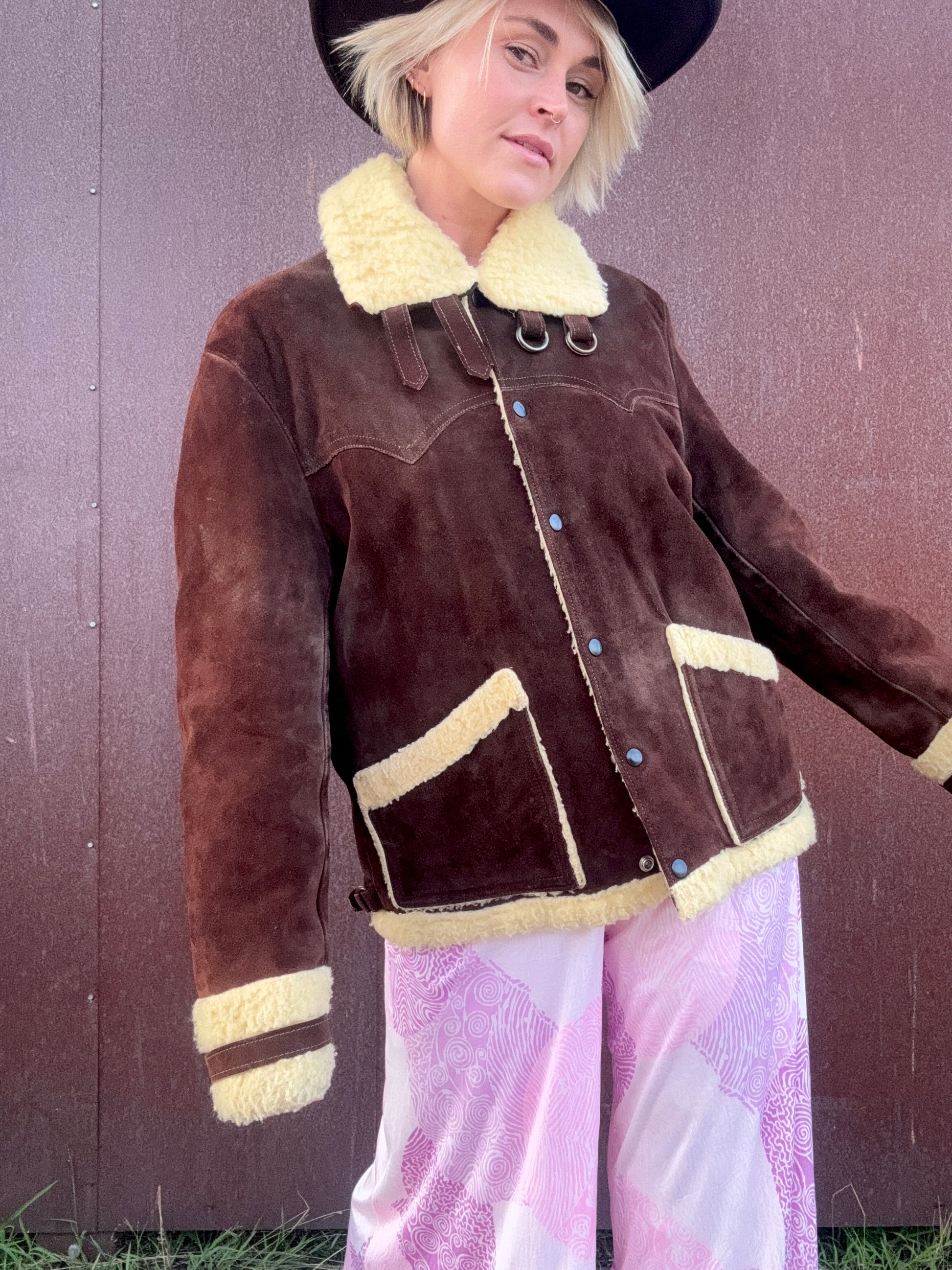 The Rochelle 1970s Suede Jacket is crafted from beautifully patinated genuine suede with a faux-sherpa lining that runs through the interior, collar, cuffs, and pockets. It closes with a row of metal snaps and features buckle straps at the collar, sleeves, and hem to refine the fit. Oversized front patch pockets trimmed in faux-sherpa add both warmth and dimension. Style it with wide-leg cords and a fitted turtleneck, or layer it over a wool mini skirt with tall leather boots for a cold-weather look.