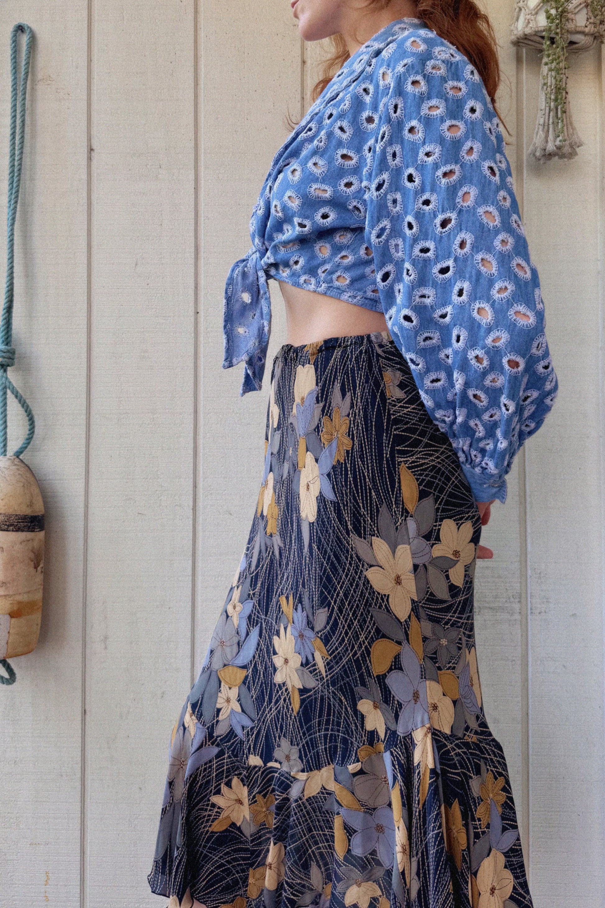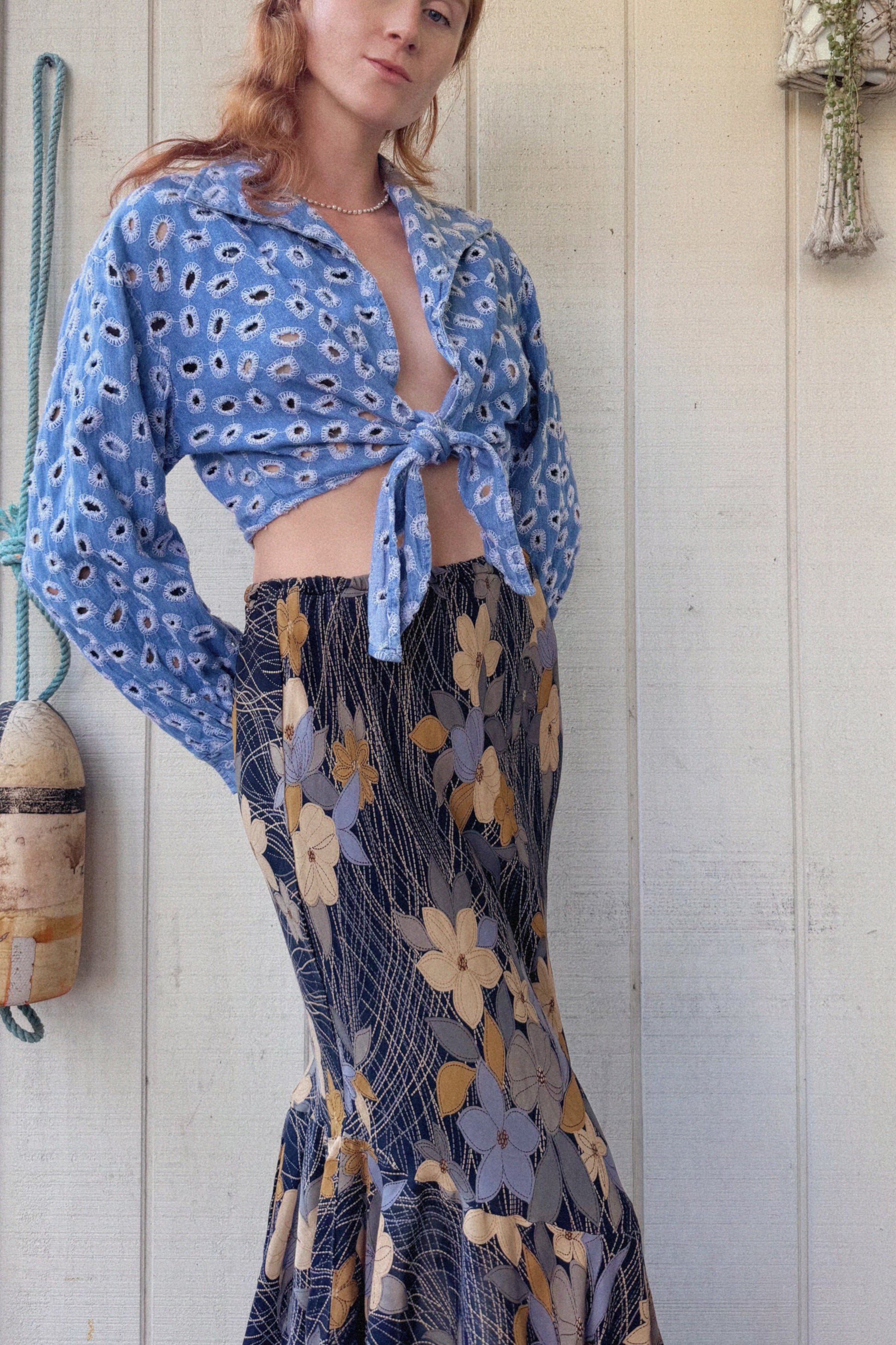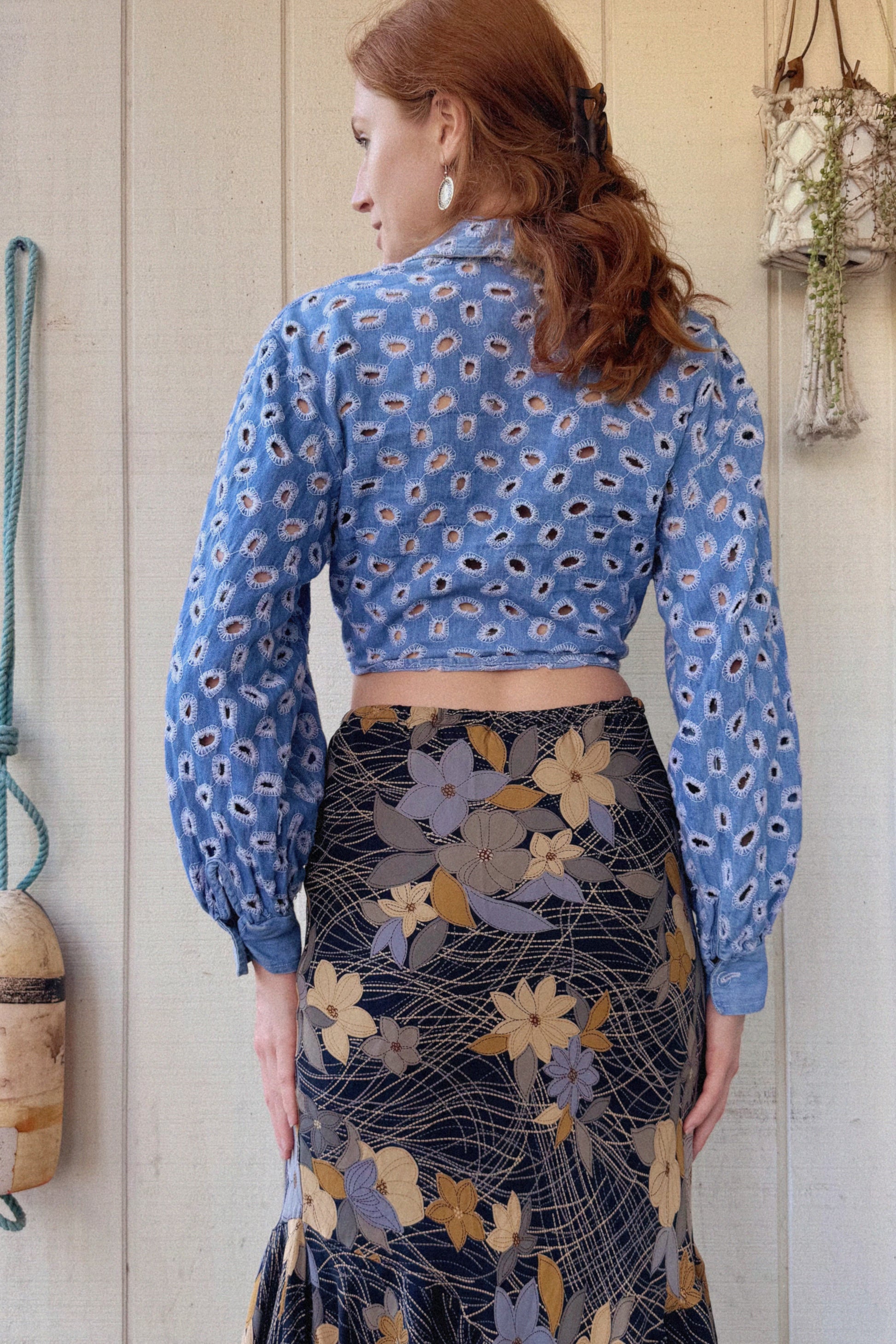 The Alexandra Denim Top is a standout piece crafted from soft, lightweight denim with an allover eyelet-style design. Each cutout is individually outlined with dense contrast stitching, creating a dimensional, almost hand-finished texture throughout. The collar adds a tailored touch, balancing the playful openness of the fabric. It features a front tie closure and slightly puffed sleeves that gather into defined cuffs, giving the silhouette subtle volume and shape.