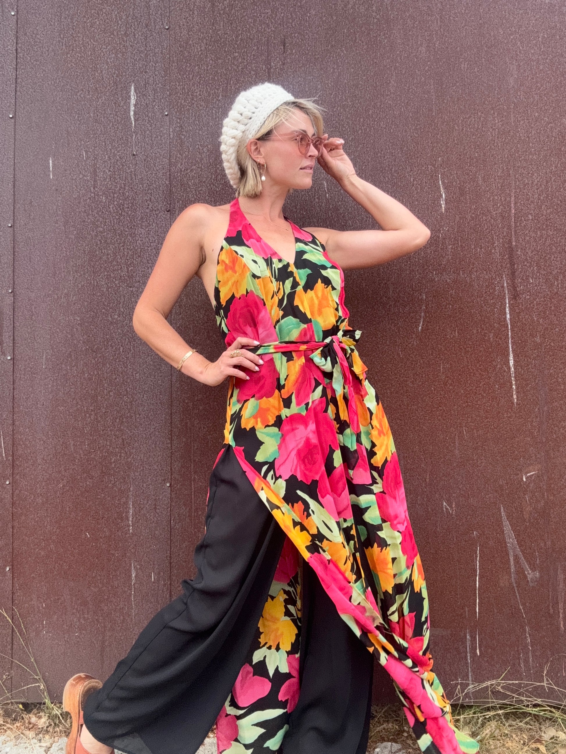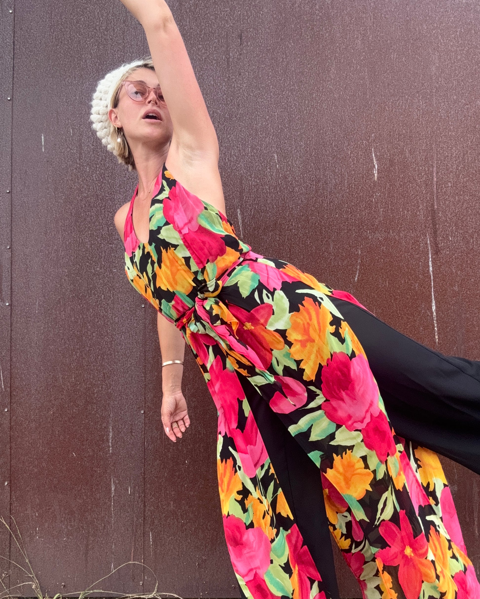The Anastasia 1990s Halter Jumpsuit is a striking piece by Caché, with bold floral overlays that flow dramatically over the pant legs. Yes, this is a jumpsuit...and it's fabulous. The floral fabric is cut like long, open panels that move independently of the solid black trousers underneath, giving the effect of a skirt in motion while still being a jumpsuit. It features a halter neckline, a back zipper closure, and a matching belt to define the waist. Pair it with gold hoops and strappy heels for an evening look, or combat boots. Imagine layering this with suede or fur!