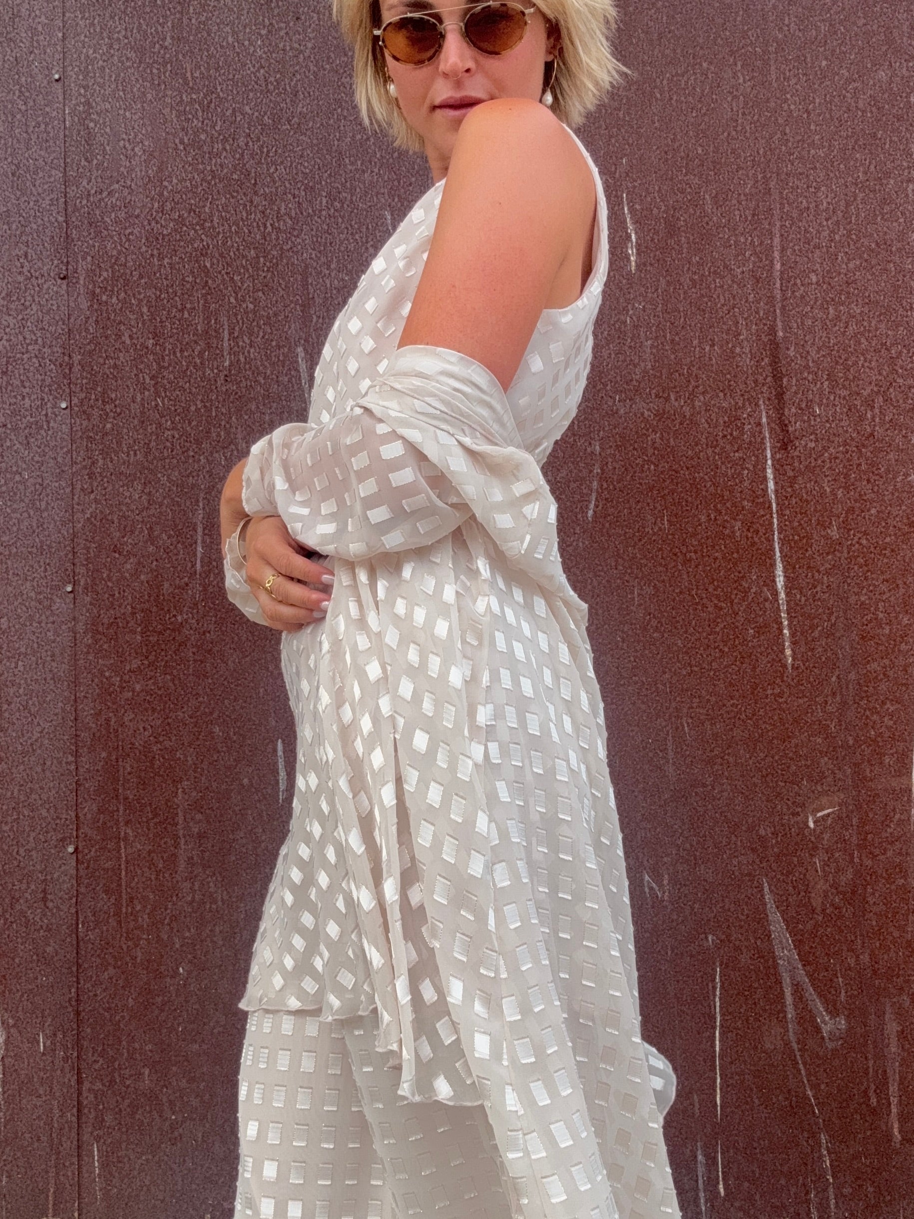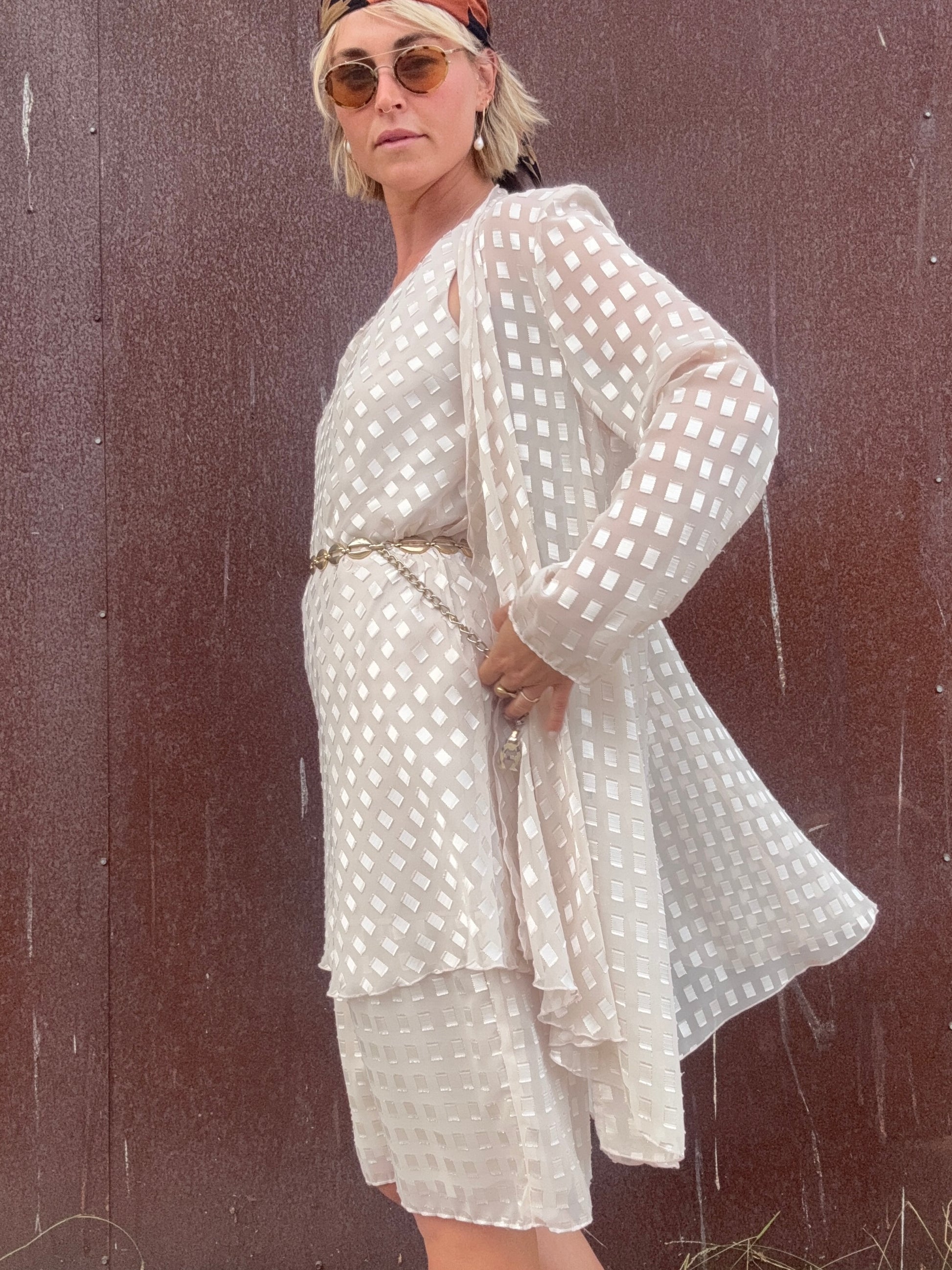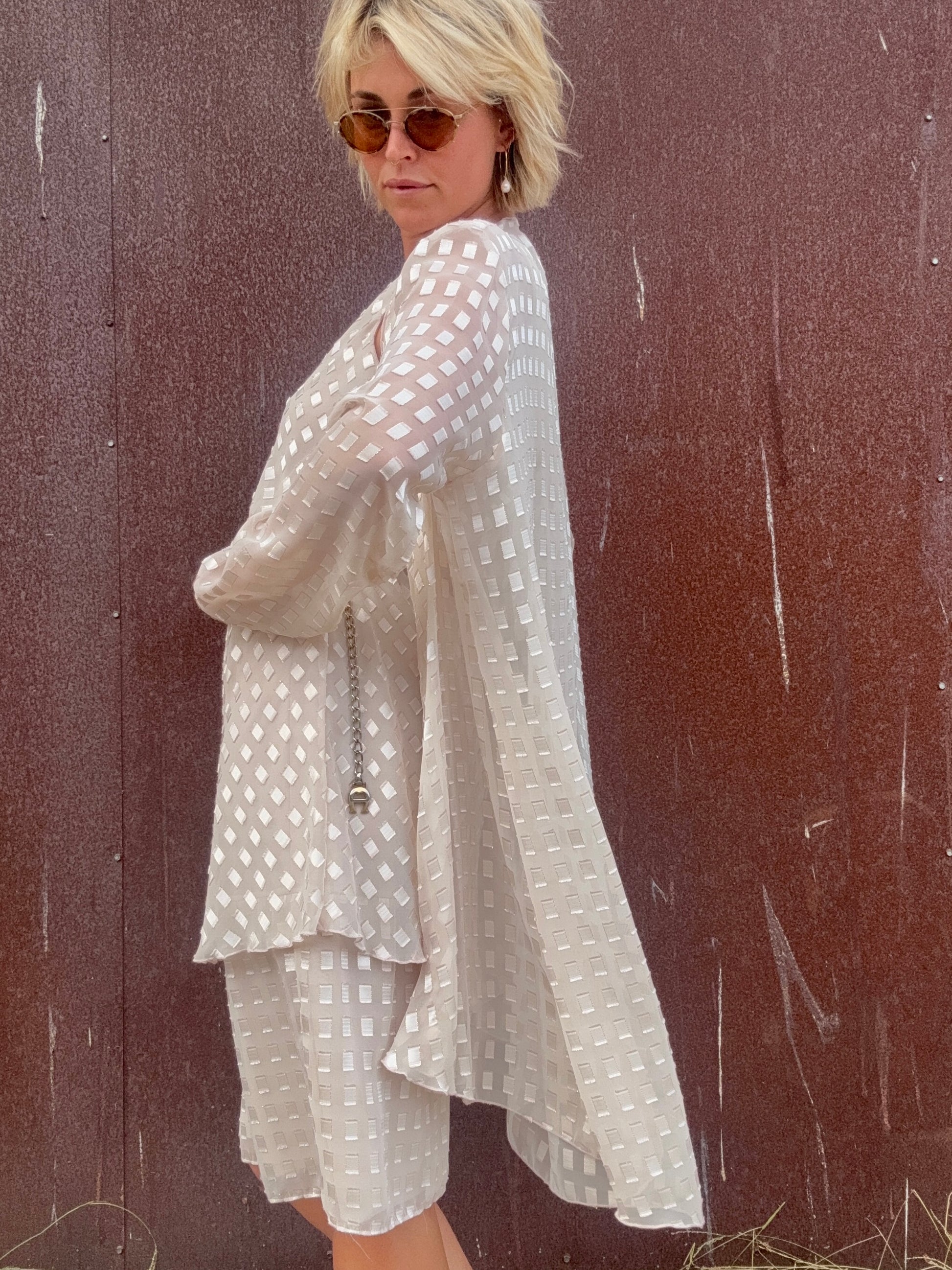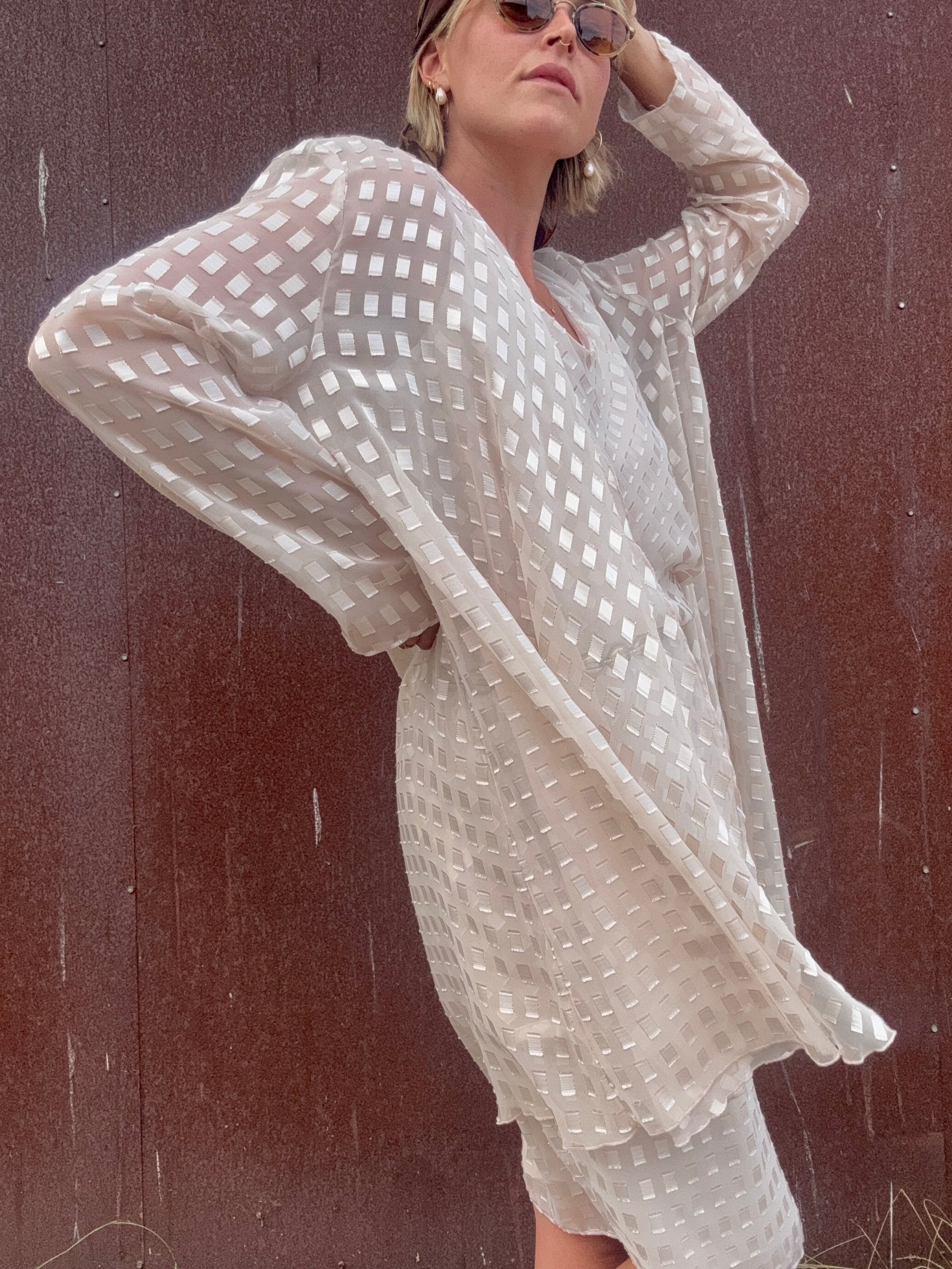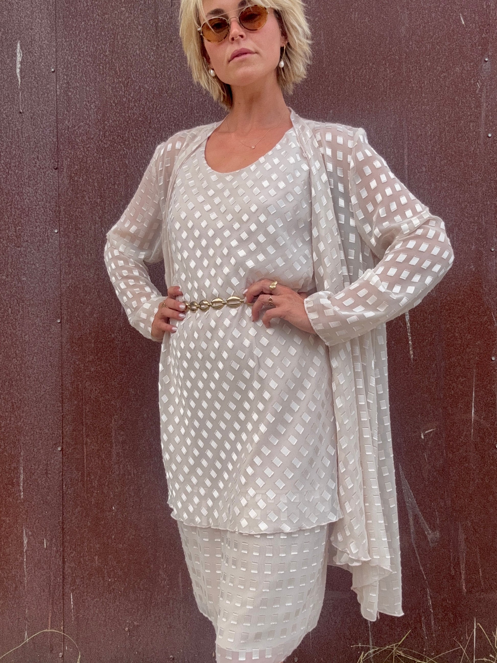 The Camille Checkered Dress and Duster Set pairs a sleeveless shift dress with a matching longline duster for a coordinated, textural look. The sheer overlay fabric features a checkered burnout pattern in soft ivory, creating dimension and lightness. The duster offers an easy, open-front silhouette, while the dress falls straight with a two-tiered hem for subtle movement. Style the pieces together for a statement or separately with other layers to extend their versatility across seasons.