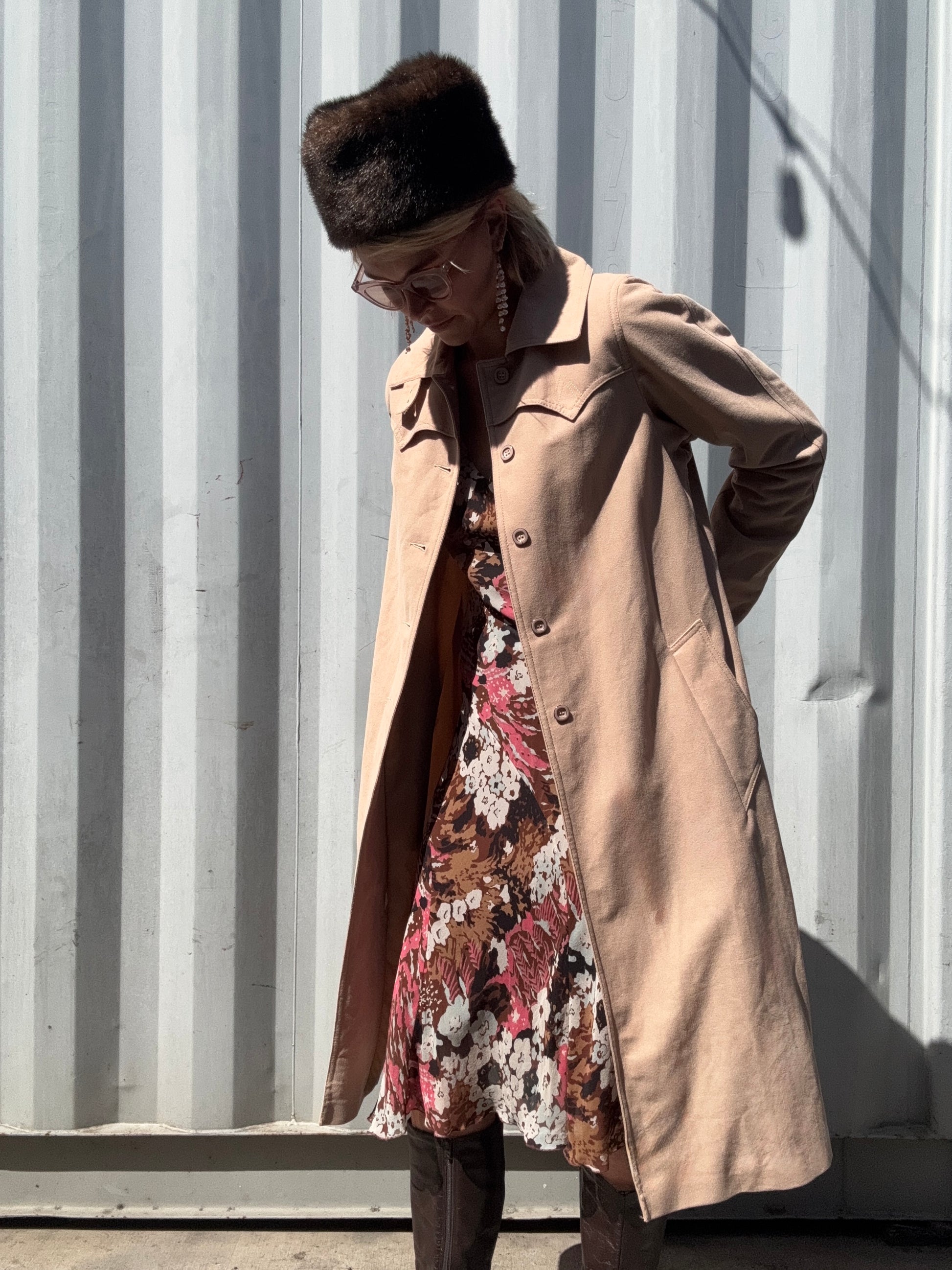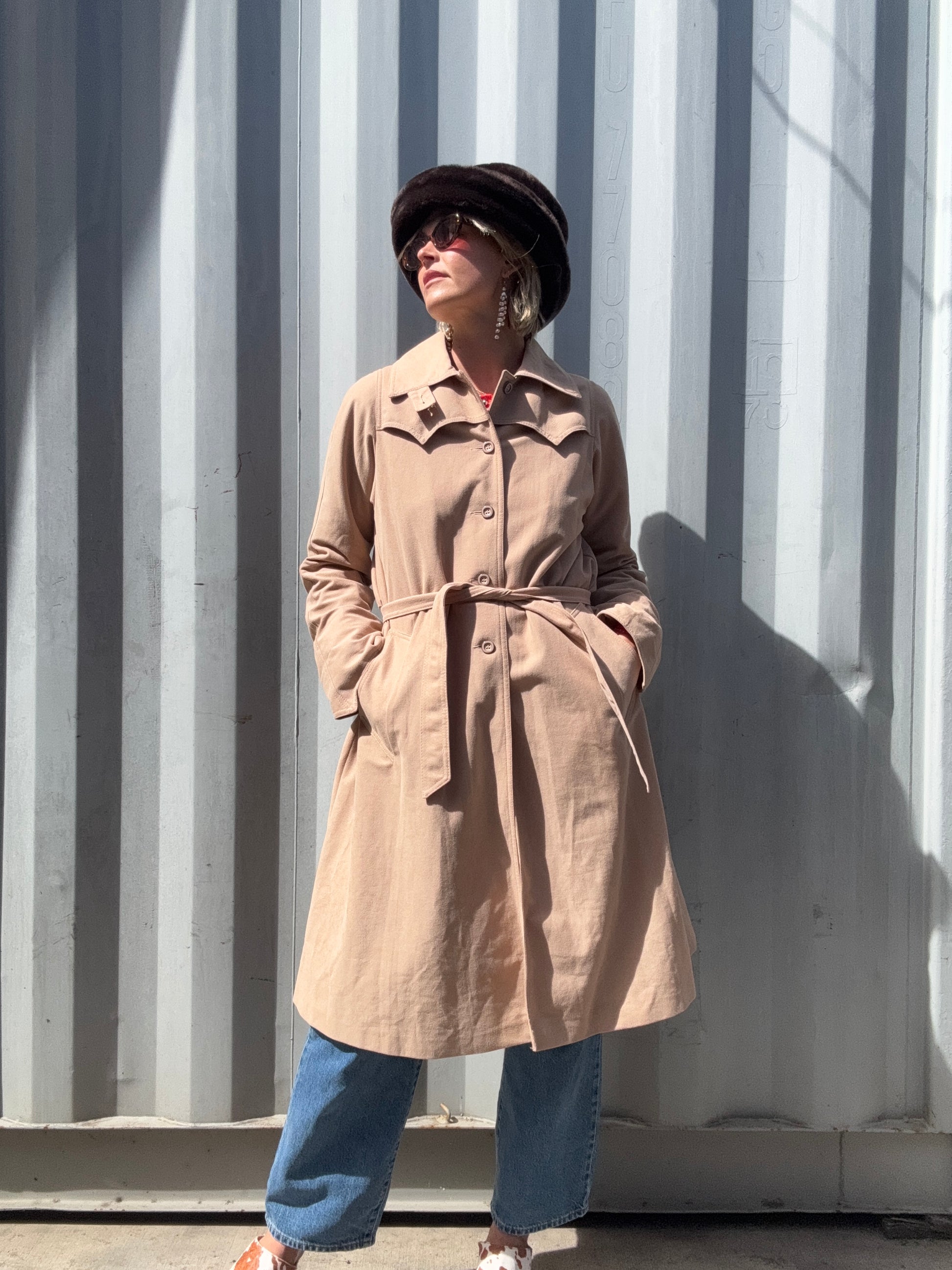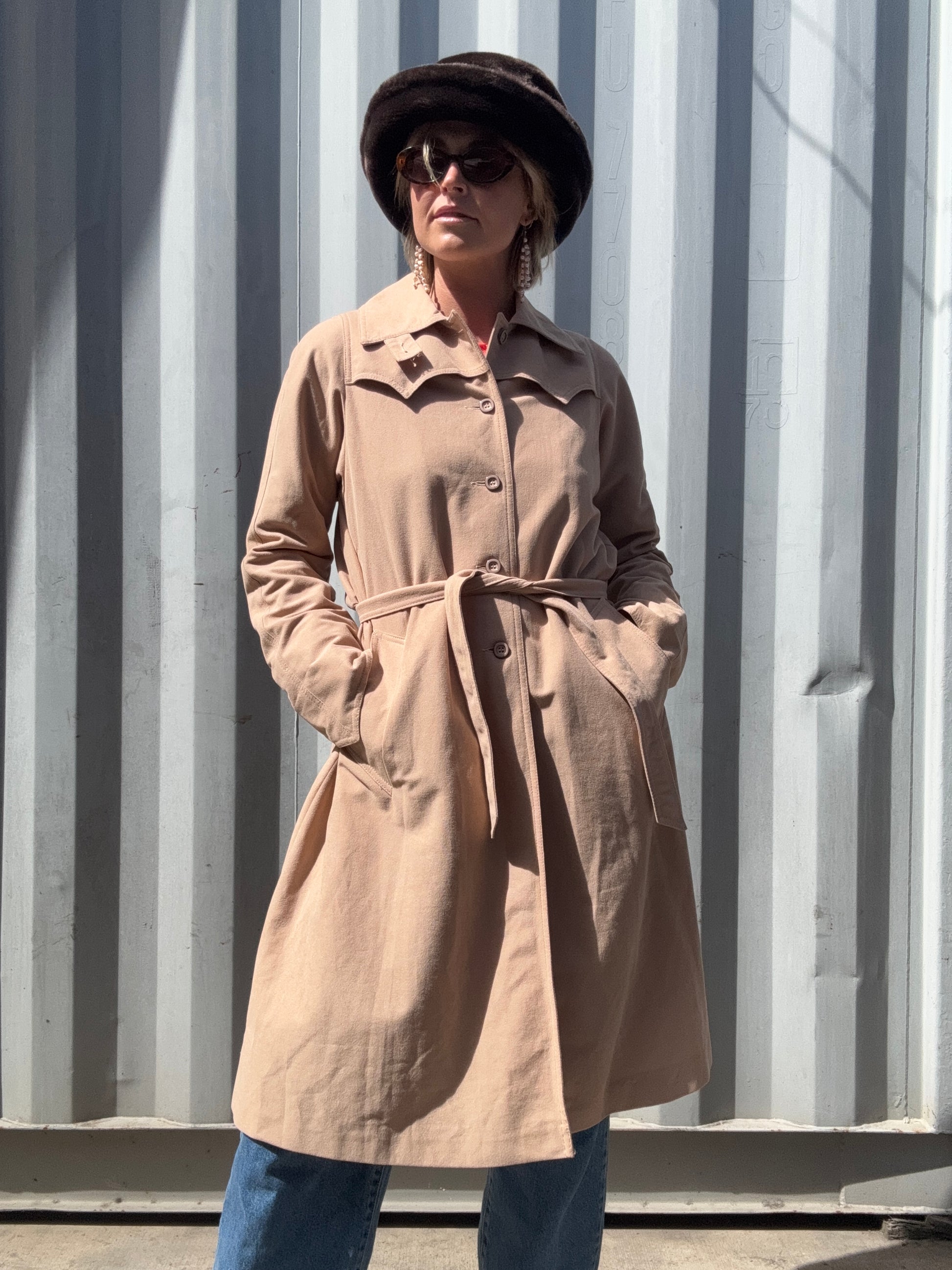 The Carina 1970s Trench Coat features clean tailoring with striking stitched detailing across the front and back yoke. Its tie belt allows for cinched shaping at the waist, while the pointed sleeve ends add a sharp finish to the silhouette. The collar can be worn wide and relaxed or buttoned up to stand tall for a structured neckline. With two front pockets for ease, this coat is perfect layered over wide-leg trousers for a sleek day look or styled with tall boots and a scarf for crisp fall evenings.