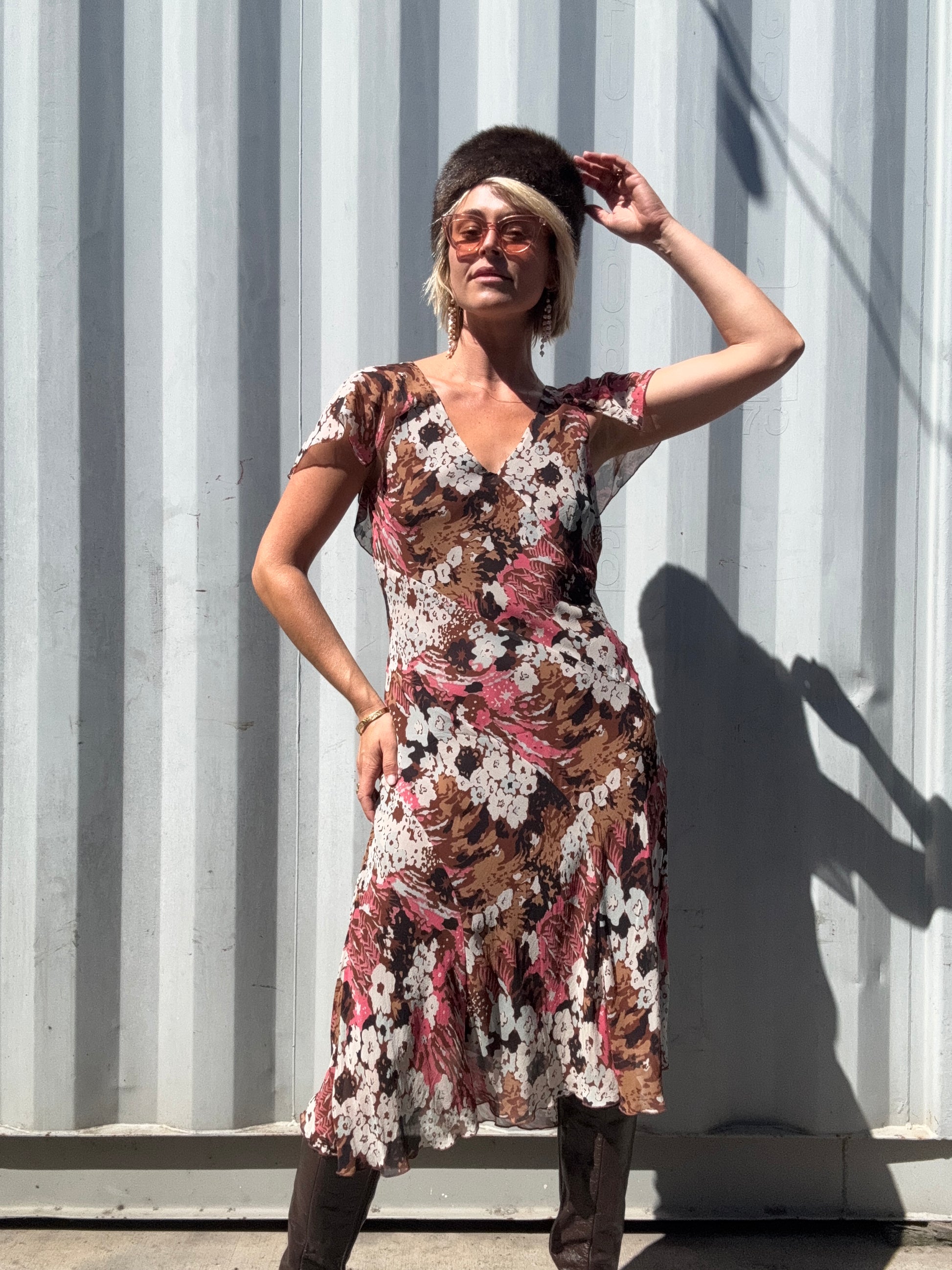 The Caroline 1990s does 1930s Dress is cut on the bias for a fluid, body-skimming drape that highlights its intricate seamwork throughout the bodice and skirt. Its sheer ruffle neckline extends into a cape-like overlay that floats over the shoulders, adding soft movement to the floral print. The short sleeves are airy and semi-sheer, balancing the deep neckline and fitted waist. Style her with brown peeptoe heels and a vintage beaded clutch for an evening look, or layer a cropped cardigan and ankle boots for daytime wear.