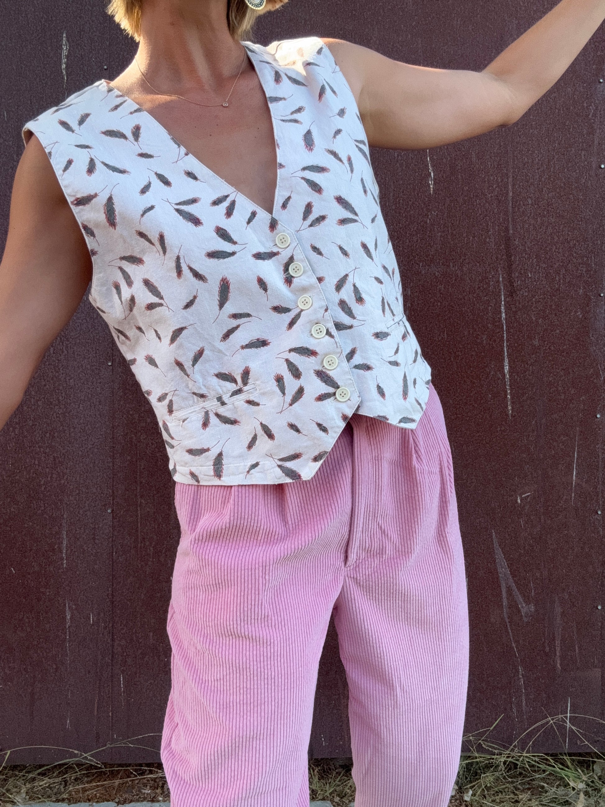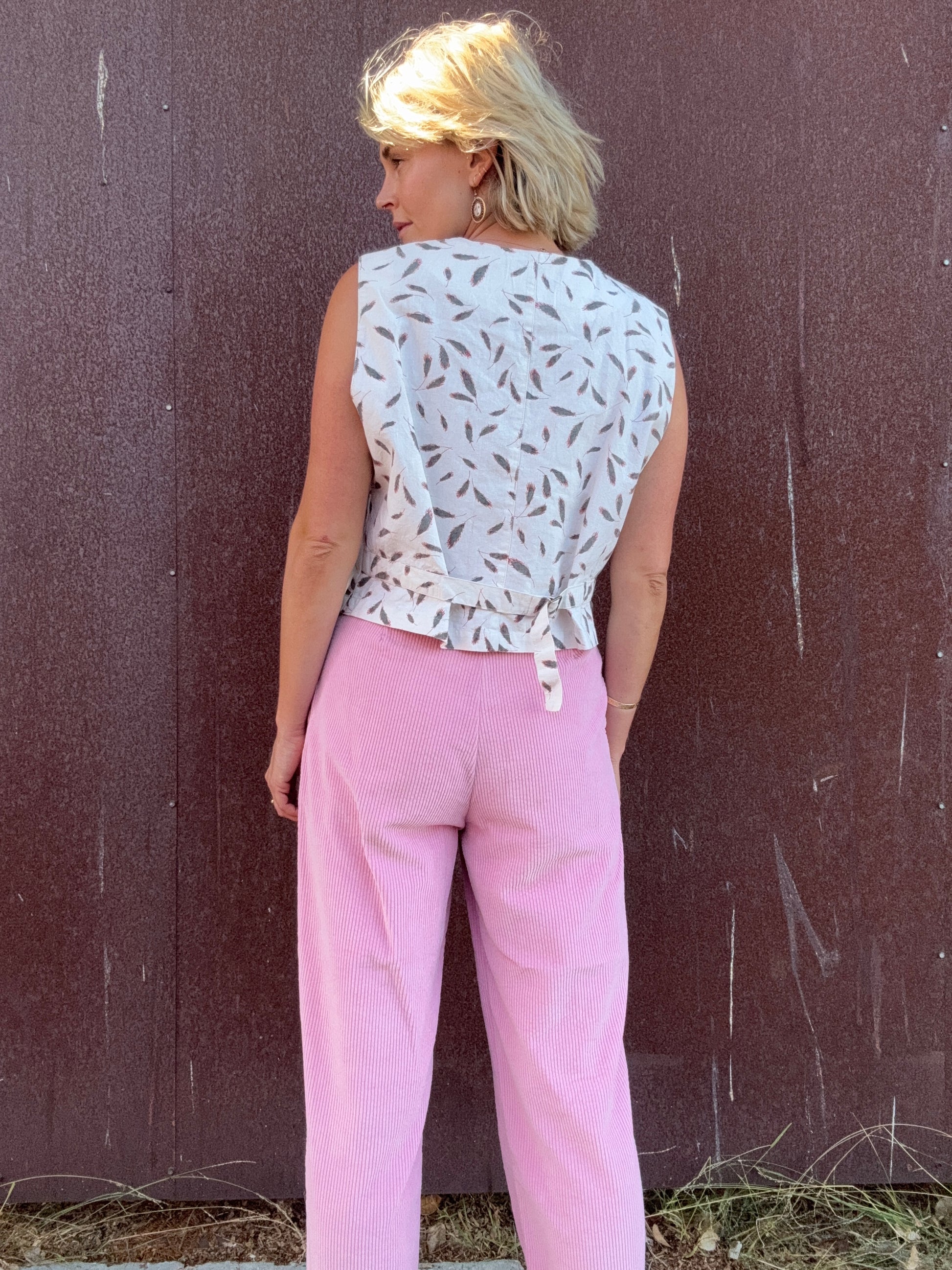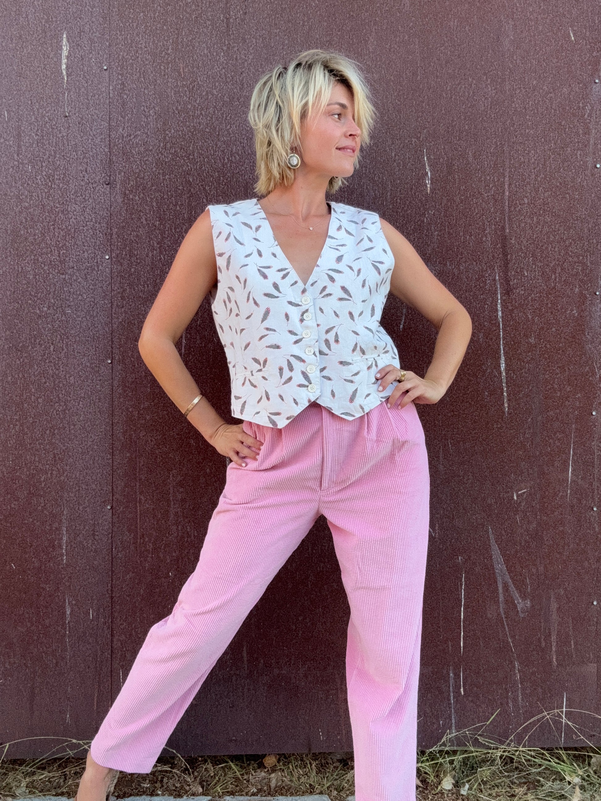 The Cassandra Vest is made from a blend of cotton and ramie, a natural, renewable plant fiber that’s wrinkle resistant, giving it both breathability and structure. It features a neat row of buttons down the front, two small welt pockets, and a pointed hemline for a tailored finish. The back includes an adjustable buckle strap, allowing for a more fitted or relaxed drape depending on how you wear it. Style her layered over a crisp blouse with trousers, or pair her with denim and a tissue turtleneck for a more casual look. This would even be epic over a chunky hand knit turtleneck to add a little pattern to your outfit.