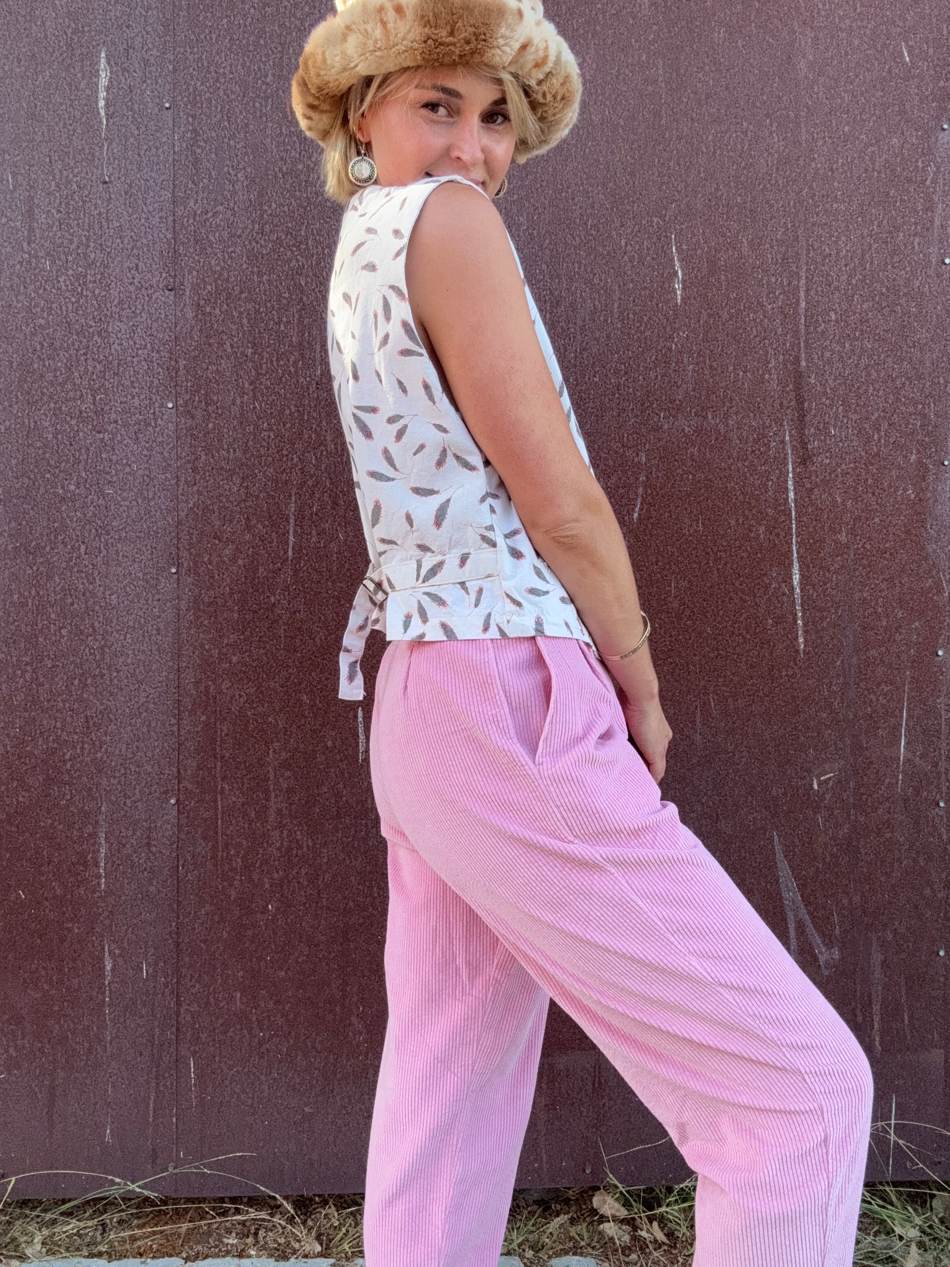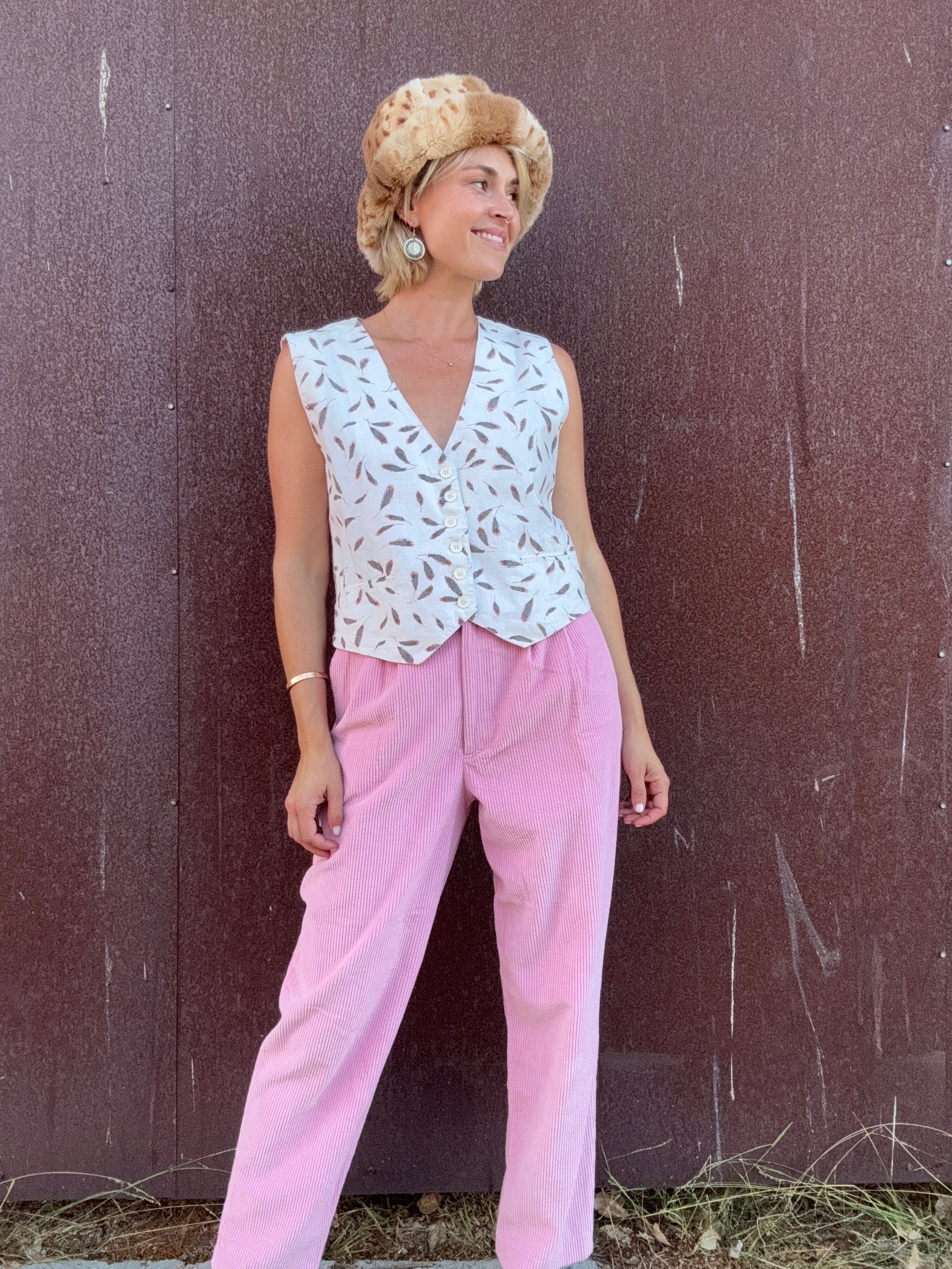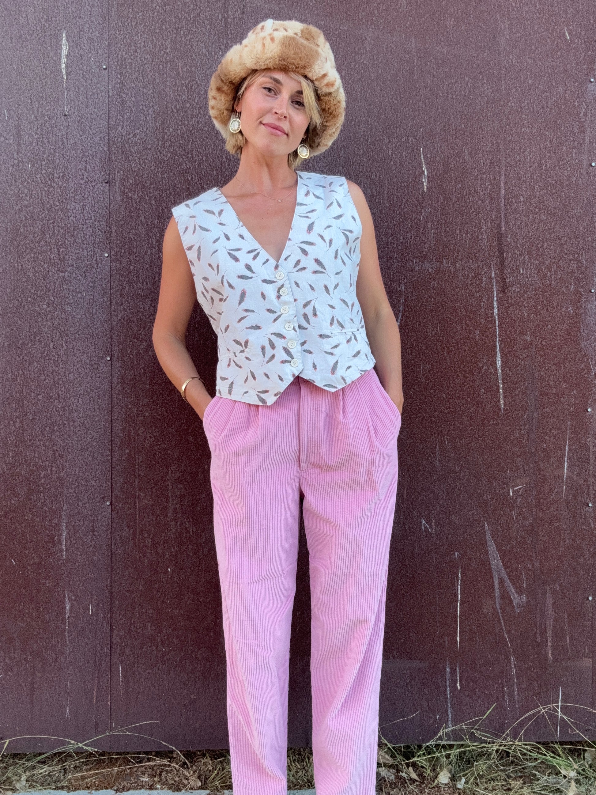 The Cassandra Vest is made from a blend of cotton and ramie, a natural, renewable plant fiber that’s wrinkle resistant, giving it both breathability and structure. It features a neat row of buttons down the front, two small welt pockets, and a pointed hemline for a tailored finish. The back includes an adjustable buckle strap, allowing for a more fitted or relaxed drape depending on how you wear it. Style her layered over a crisp blouse with trousers, or pair her with denim and a tissue turtleneck for a more casual look. This would even be epic over a chunky hand knit turtleneck to add a little pattern to your outfit.