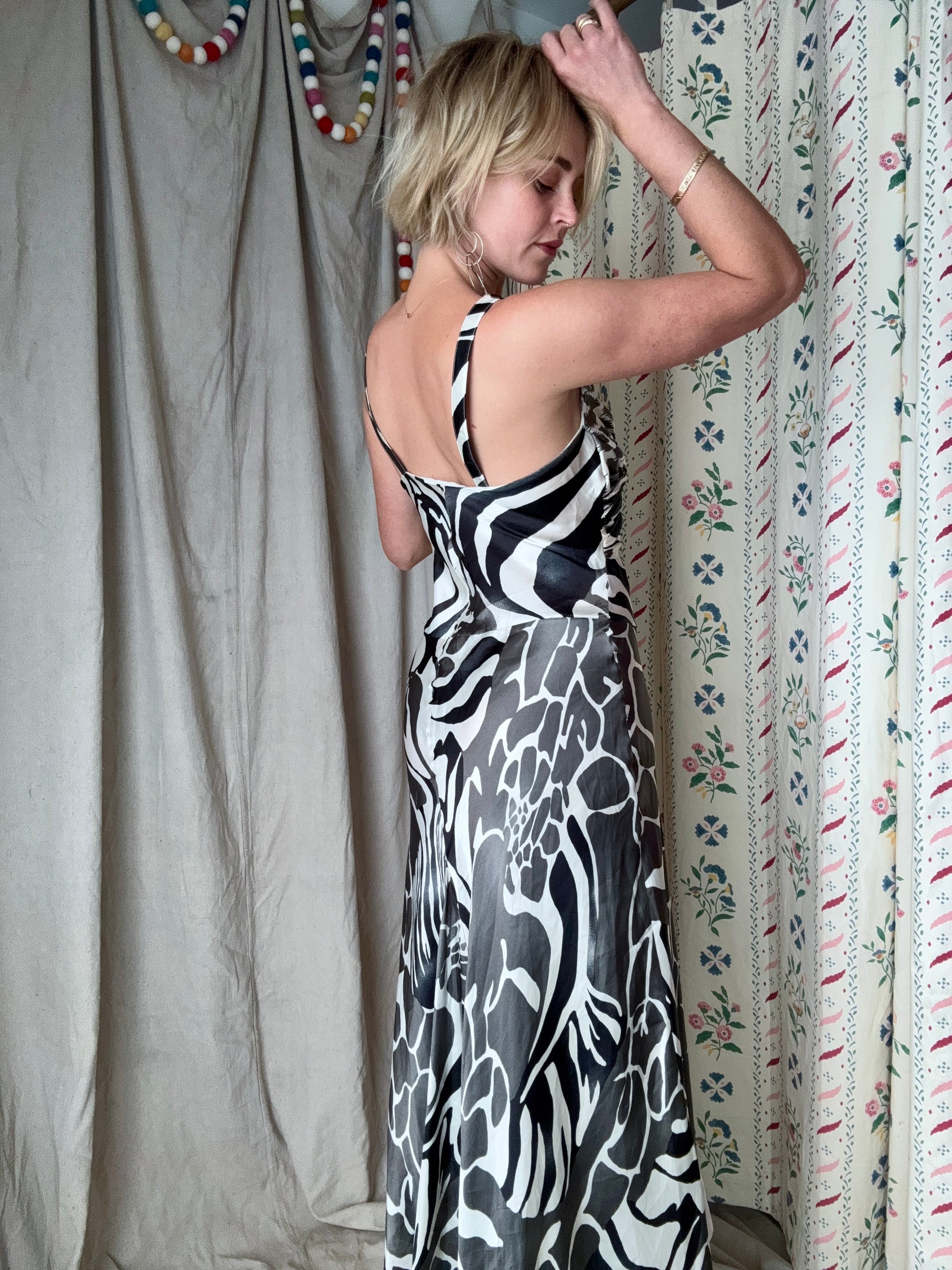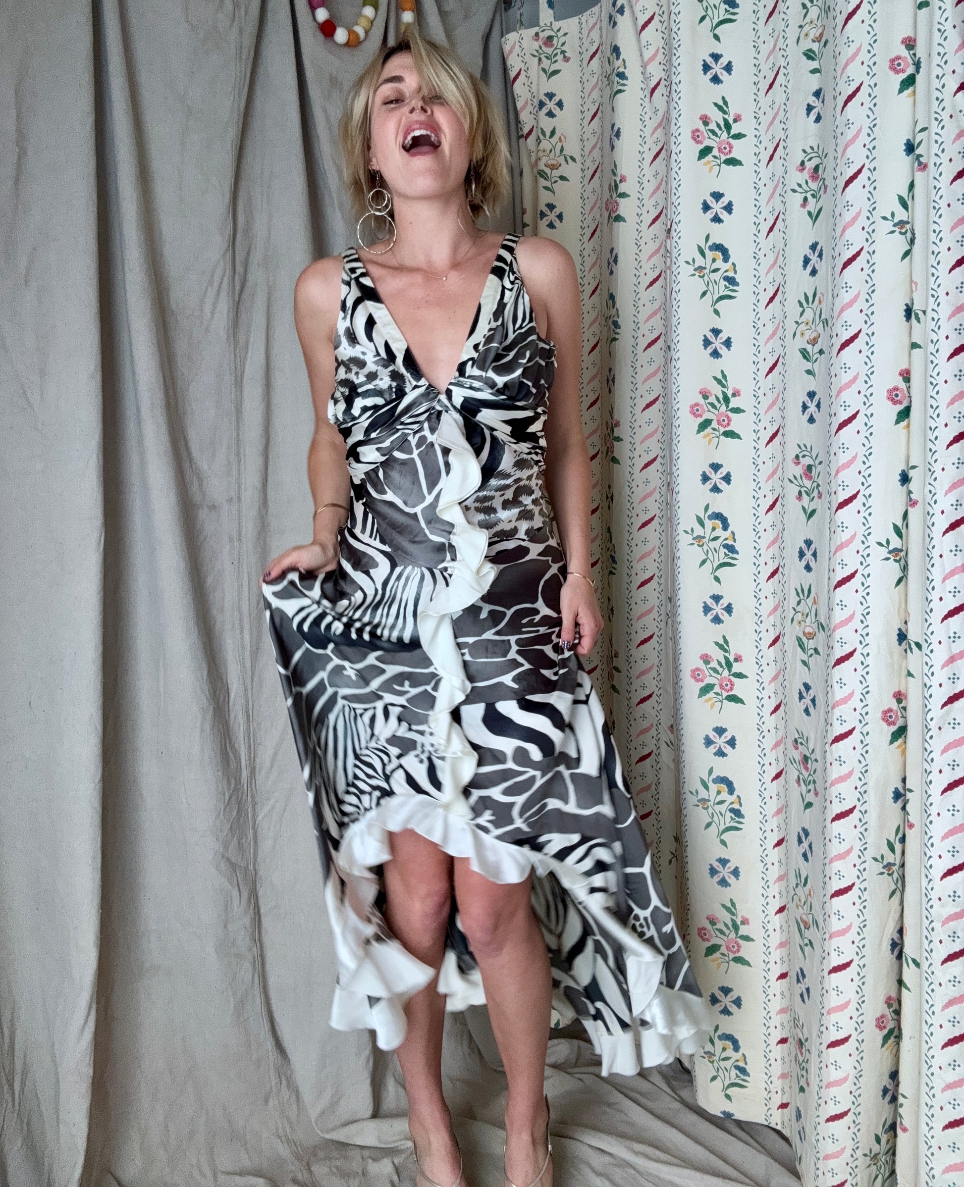 The Caterina 1990s High-Low Dress was sourced in Paris and has a slip silhouette rendered in a graphic black, white, and charcoal animal-inspired print. She features a plunging neckline, softly ruched bust, and a fluid high-low hem lined with a continuous ruffle that moves beautifully with the body. The lightweight fabric drapes on the bias for a flattering, body-skimming fit, and the dress finishes with a discreet side zipper closure for clean lines through the waist and hip. Style her with a cropped leather jacket and sheer black tights for a classic city girl look, or lean into contrast by pairing her with a jewel-colored marabou feather jacket and a complimentary clutch to add fun pops of color.