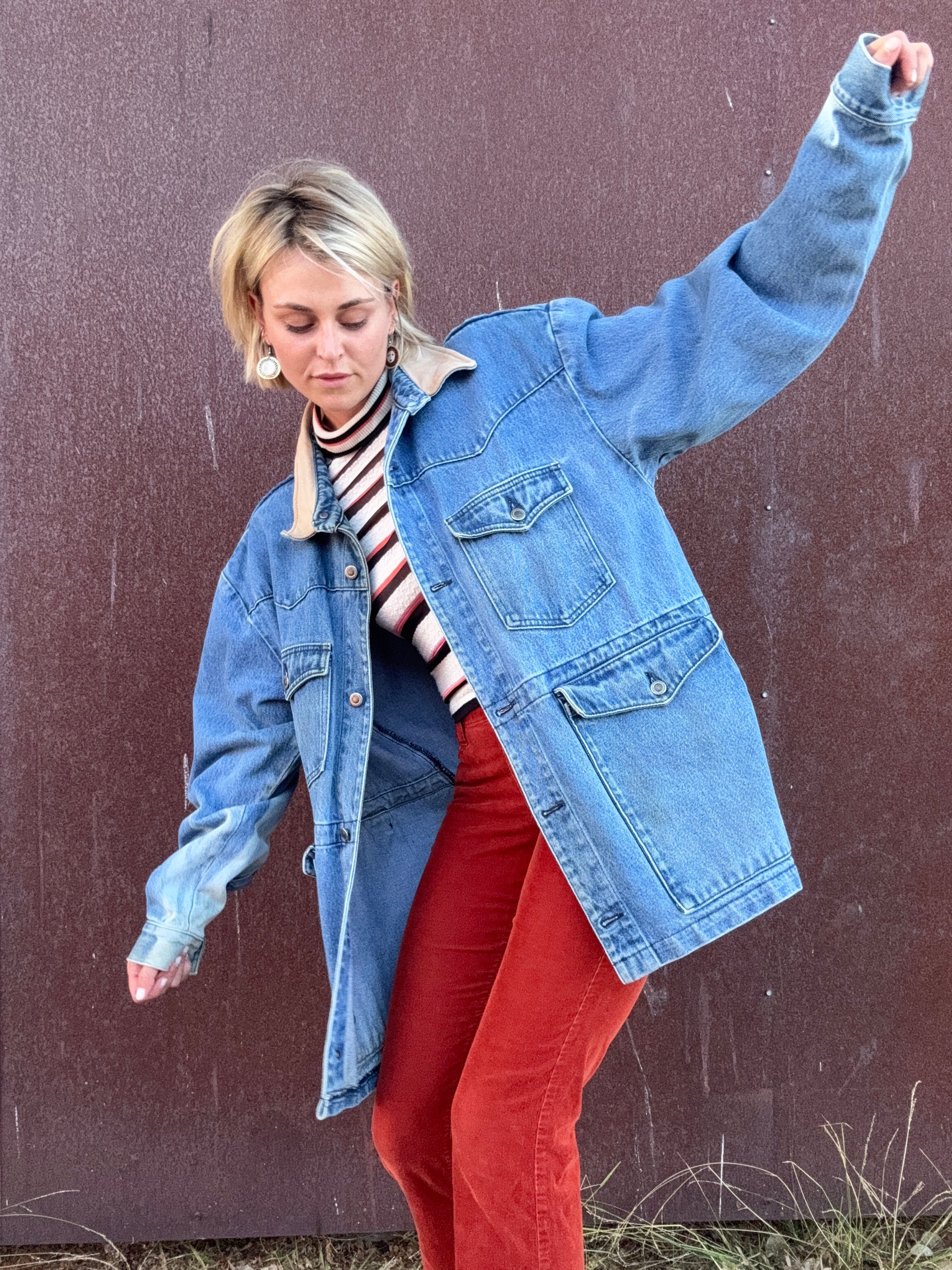 The Delphine 1990s Denim Jacket is a sturdy vintage staple that’s crafted with a 100% cotton shell and a contrasting tan leather collar. Natural sunspots throughout the denim give it a lived-in, authentic patina that speaks to its age. The wash of this denim is spectacular and goes with all colors. The jacket features internal drawstrings that allow you to cinch the waist for shape and adjustability, while button tab details at the back hem nod to its Western roots. Style her open over a floral prairie dress with cowboy boots for a soft-meets-rugged look, or cinch her at the waist and pair with wide-leg trousers and clogs for an effortless late fall uniform.