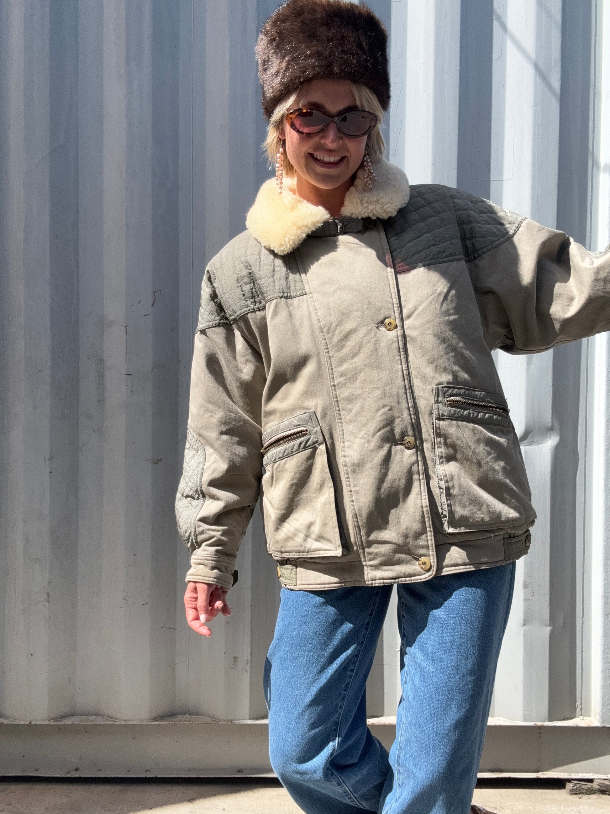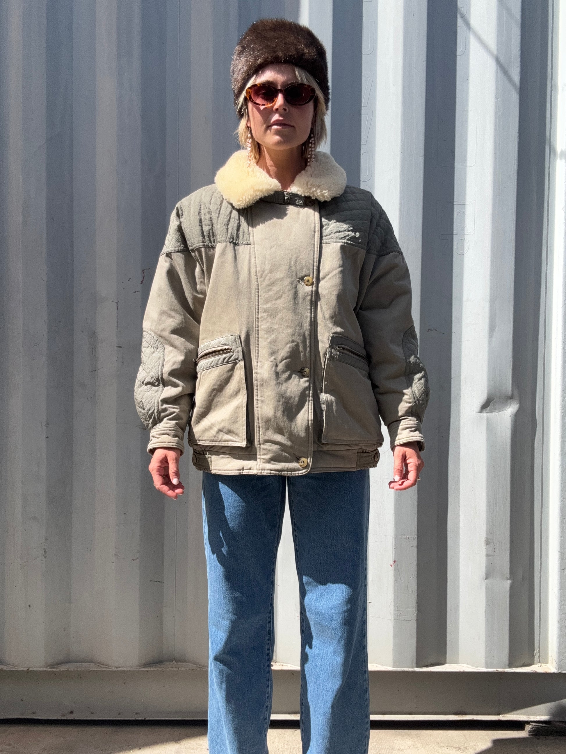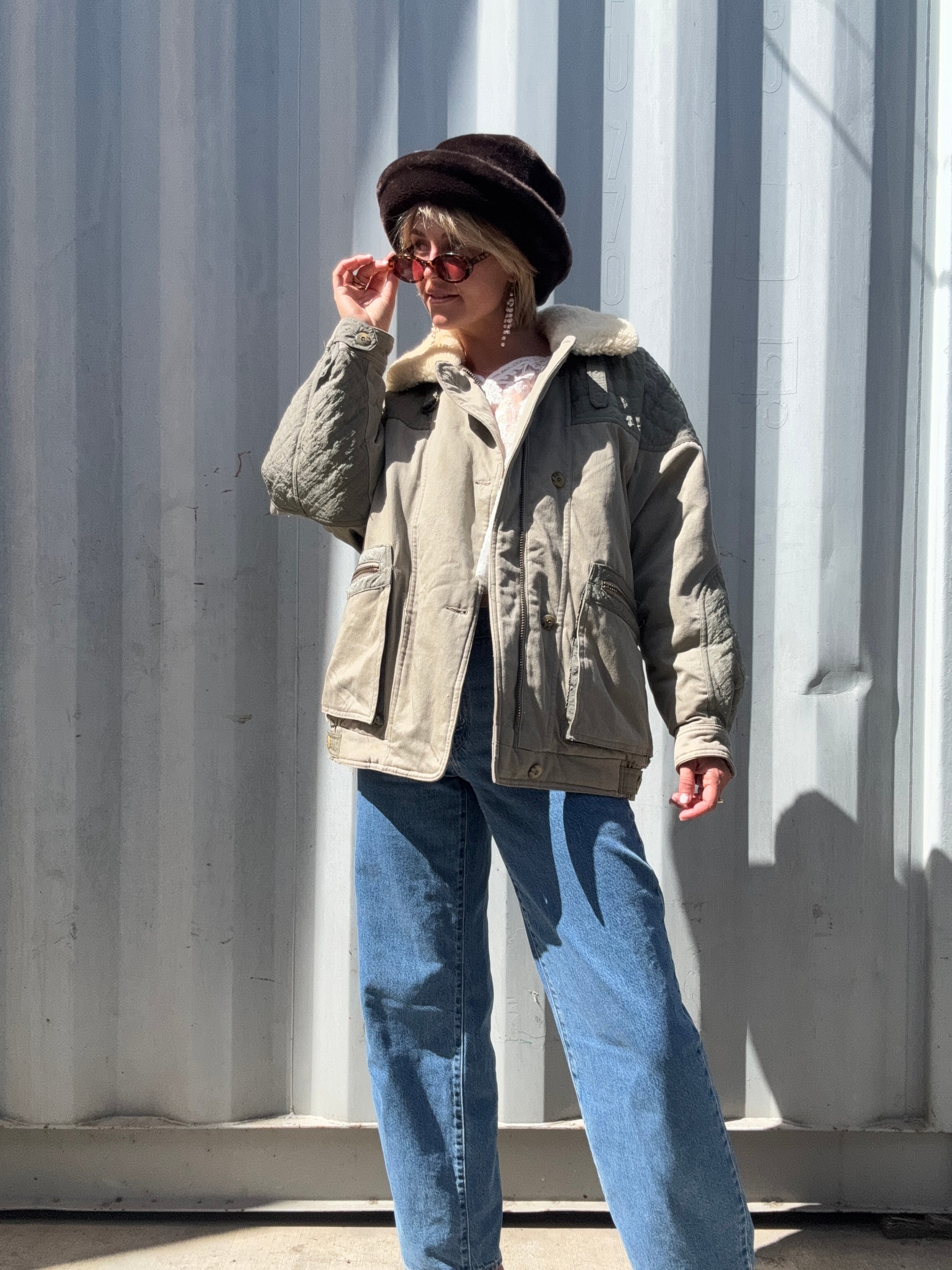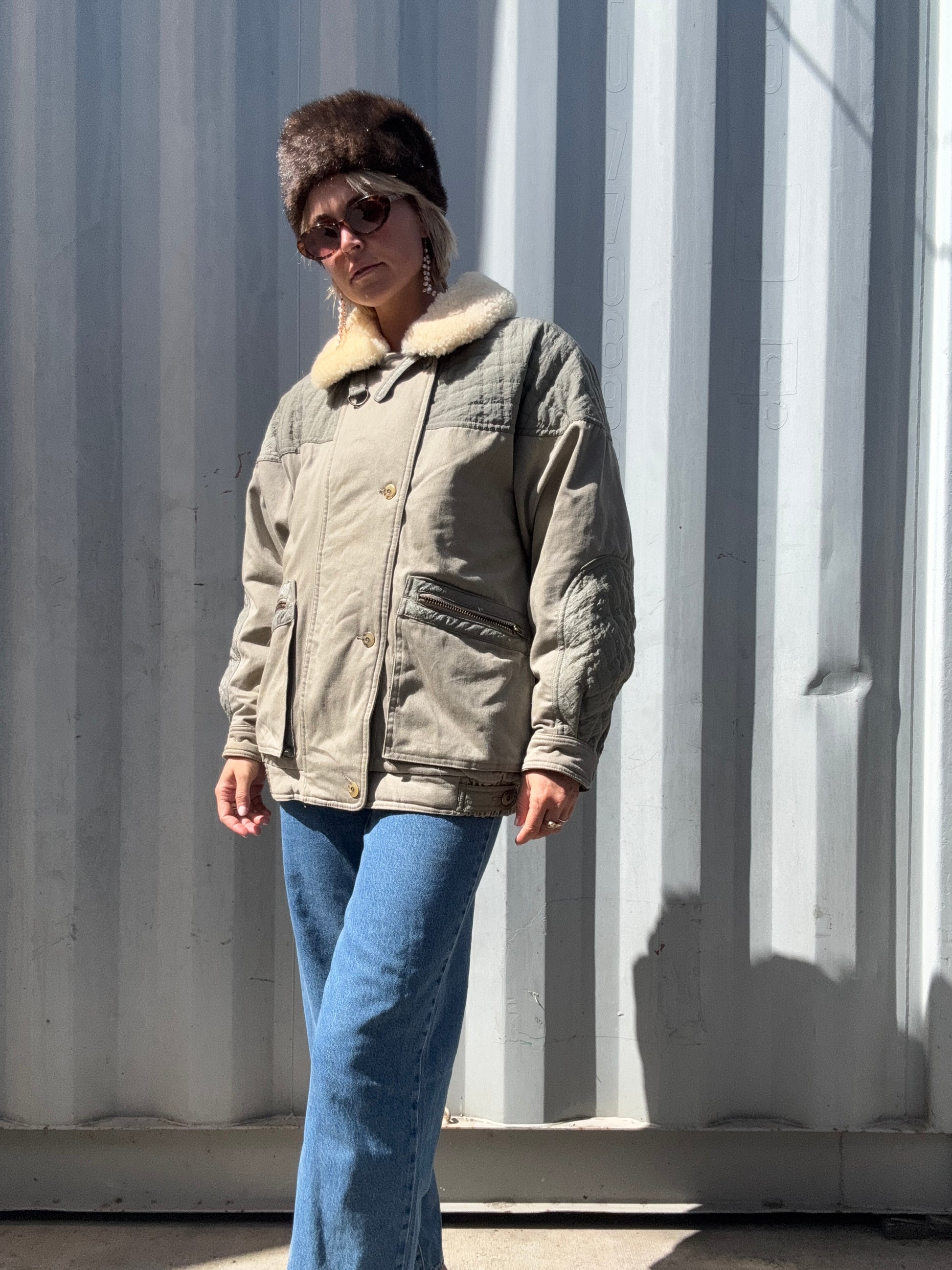 A true outdoor classic, The Eddie Bauer 1970s Coat is built for warmth and utility with its 100% cotton shell and warm goose down filling. This jacket is in pristine condition and looks like it's never been worn. The alternating quilted panels and soft sherpa collar give it both texture and comfort. Multiple front and side-entry pockets, a button-and-zipper closure, adjustable waist tabs, and a buckled neck strap bring in all the functional details you could dream of. Style it with faded denim and lace-up boots for a utilitarian winter look, or layer it over corduroys and a fisherman sweater for classic cold-weather wear.