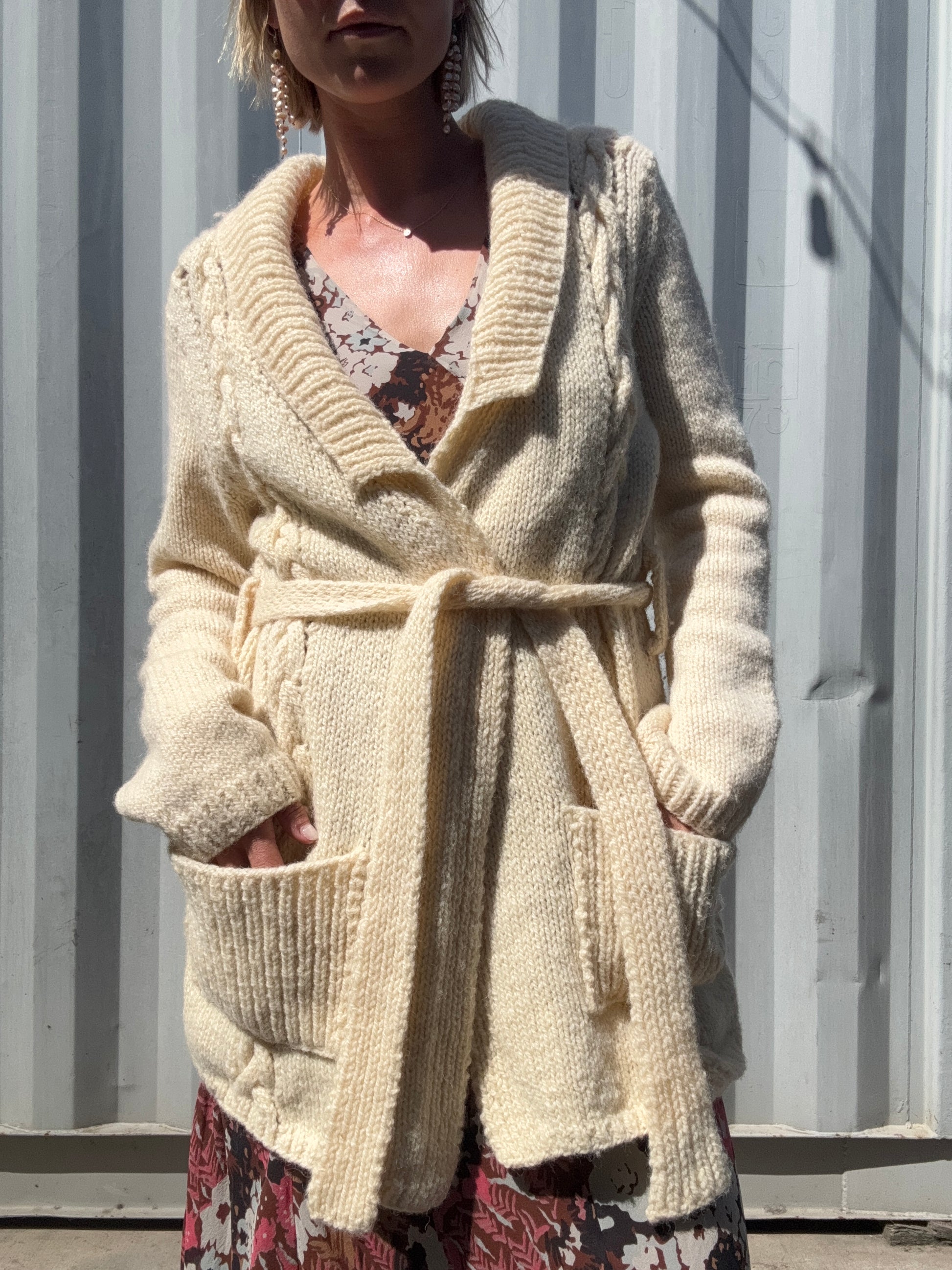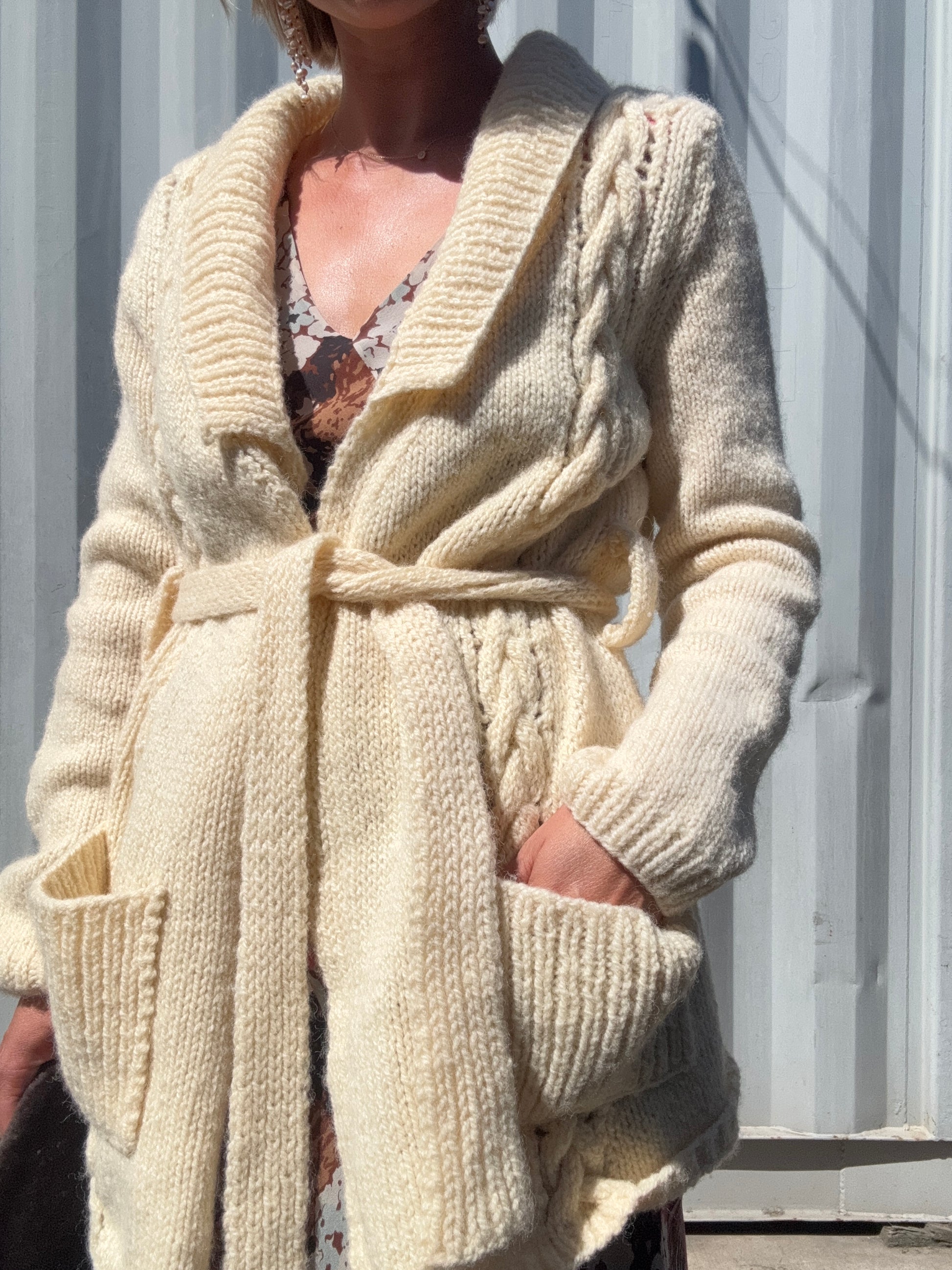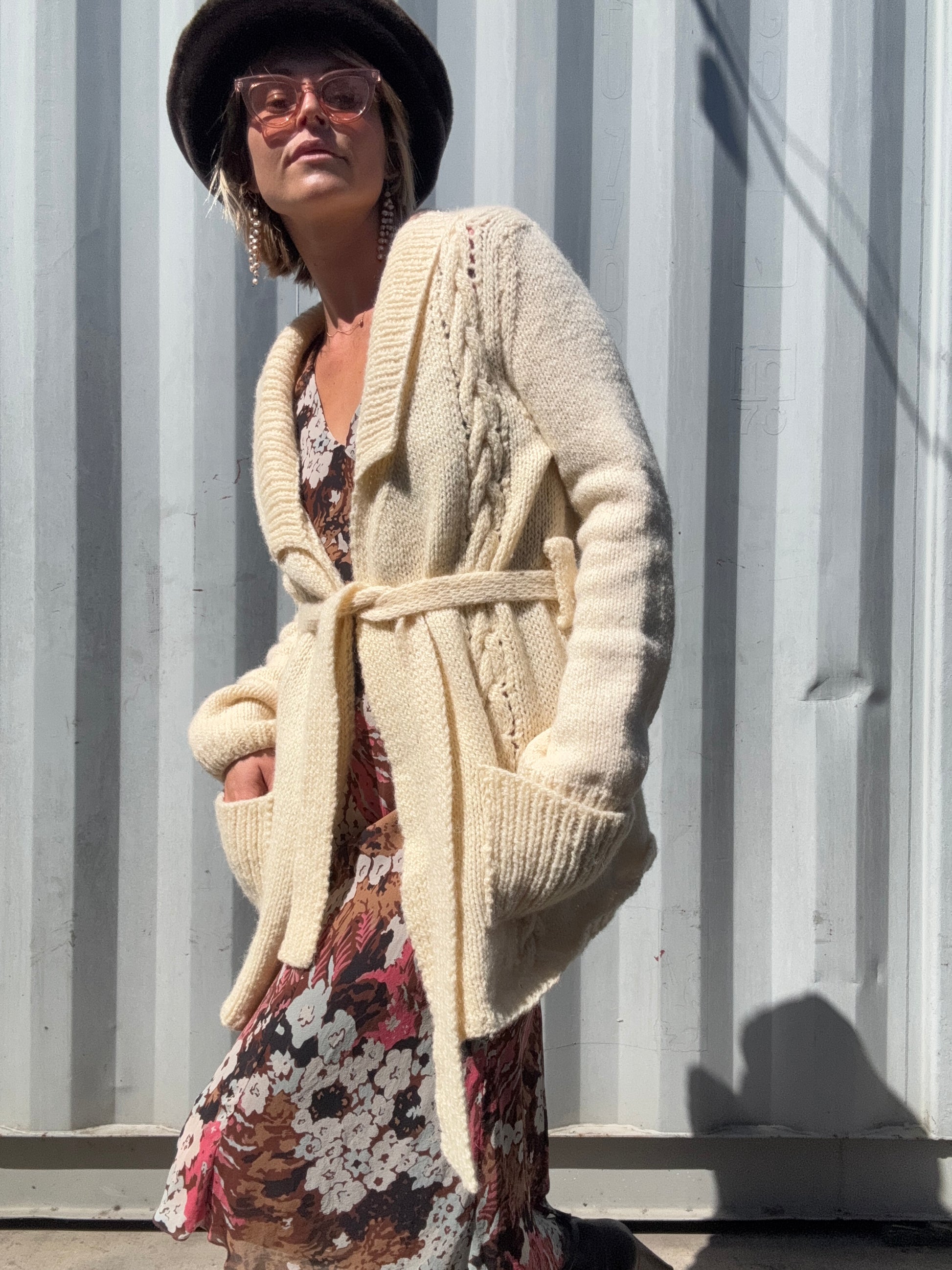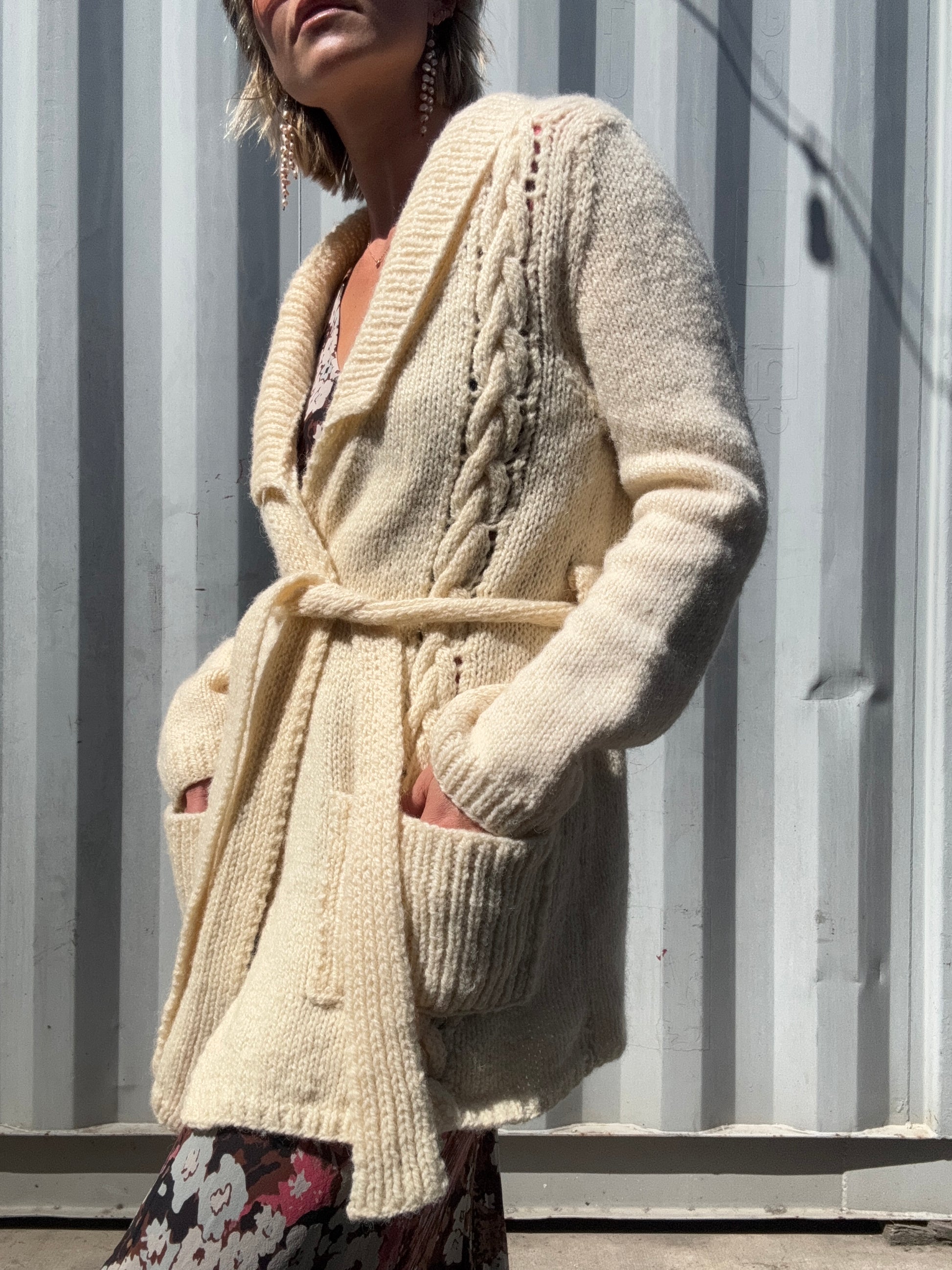 Hand-knit from Irish wool, The Florence Wool Cardigan is full of artisanal detail. The open front design includes wide-gauge cable knit panels lined with subtle see-through texture, front pockets, and a belt tie for an adjustable fit. Its soft cream hue makes it endlessly versatile. Wear it belted over a turtleneck and skirt with knee-high boots, or throw it on loose over jeans and leather loafers for cozy everyday layering.