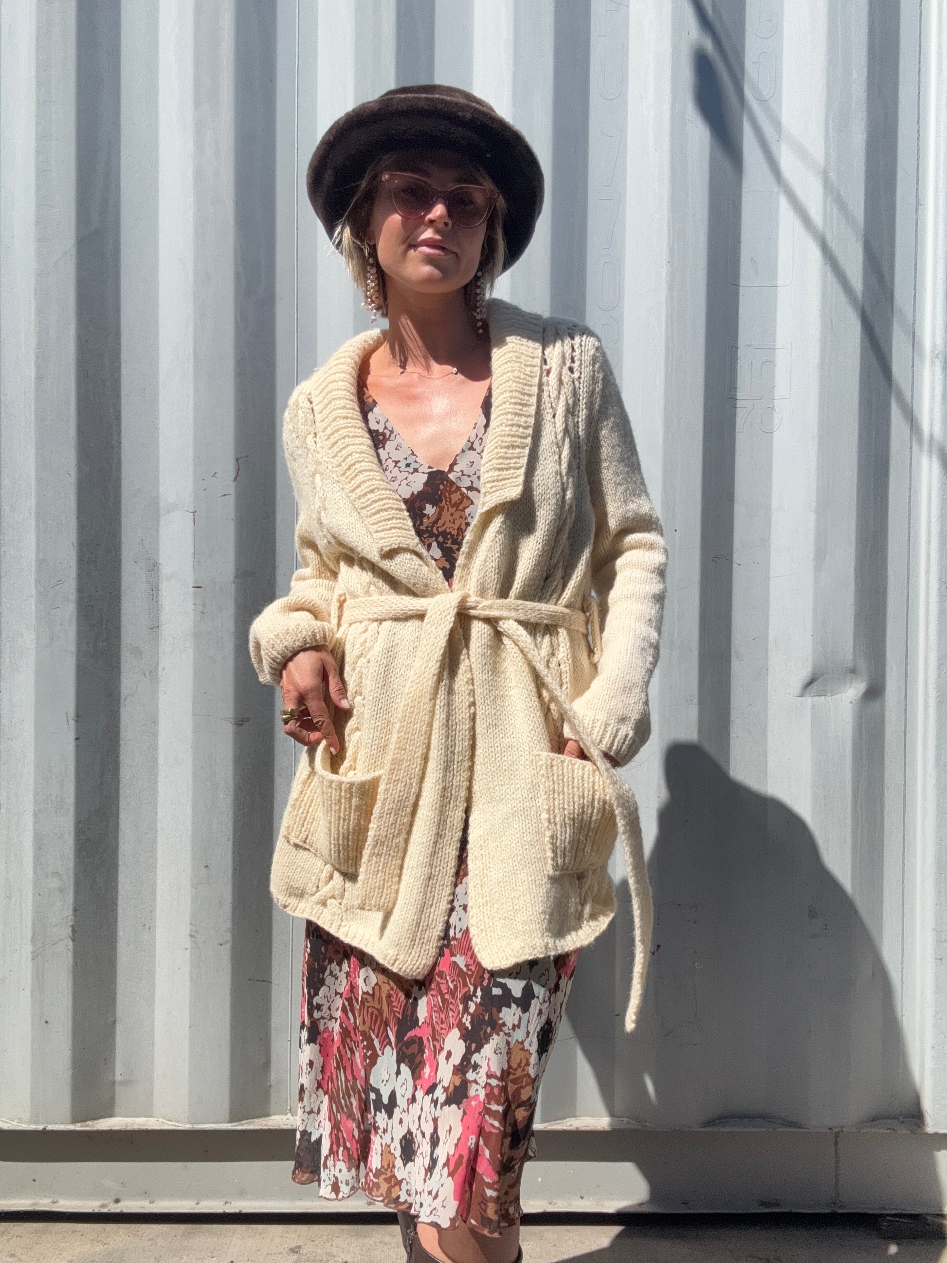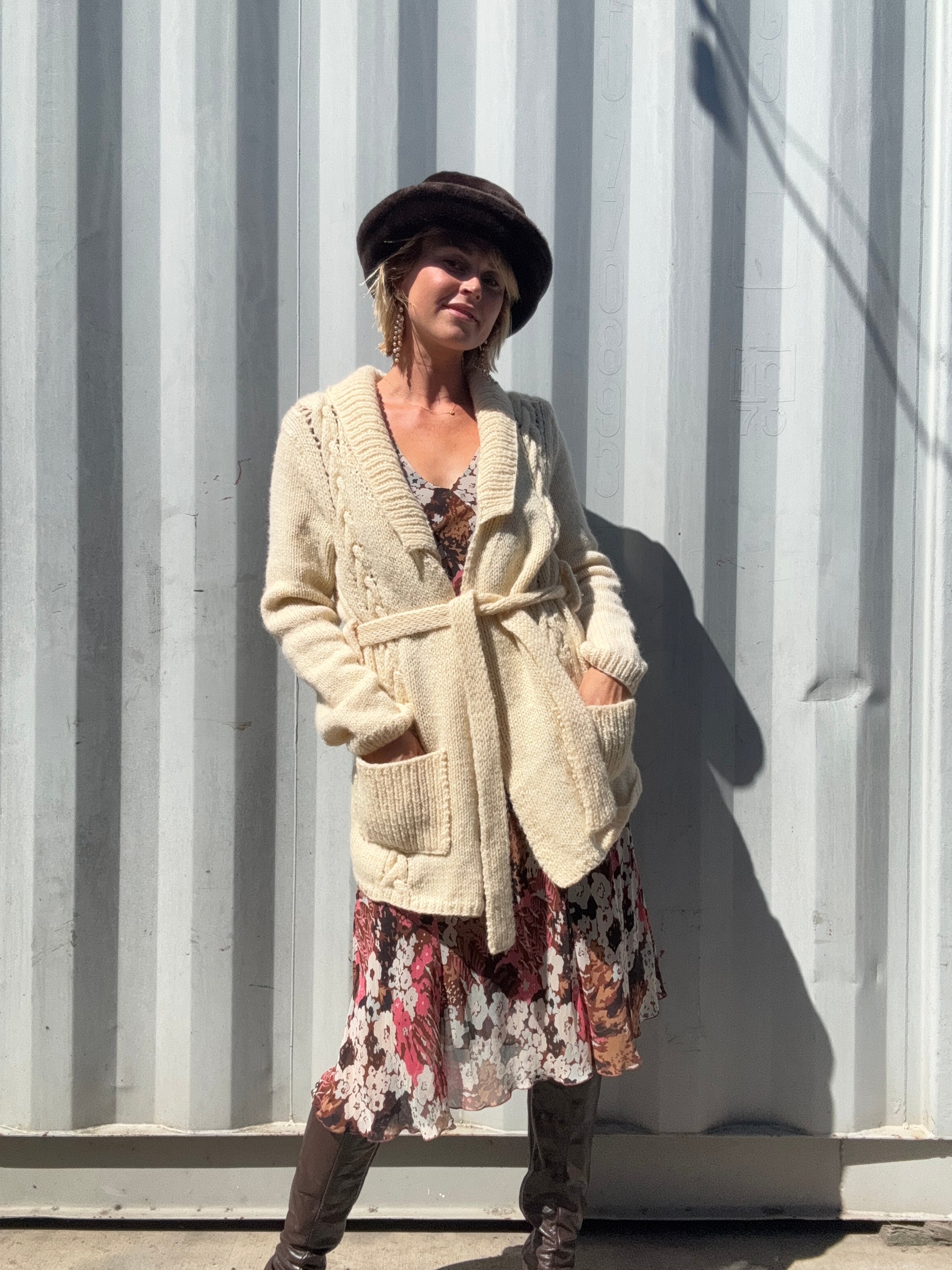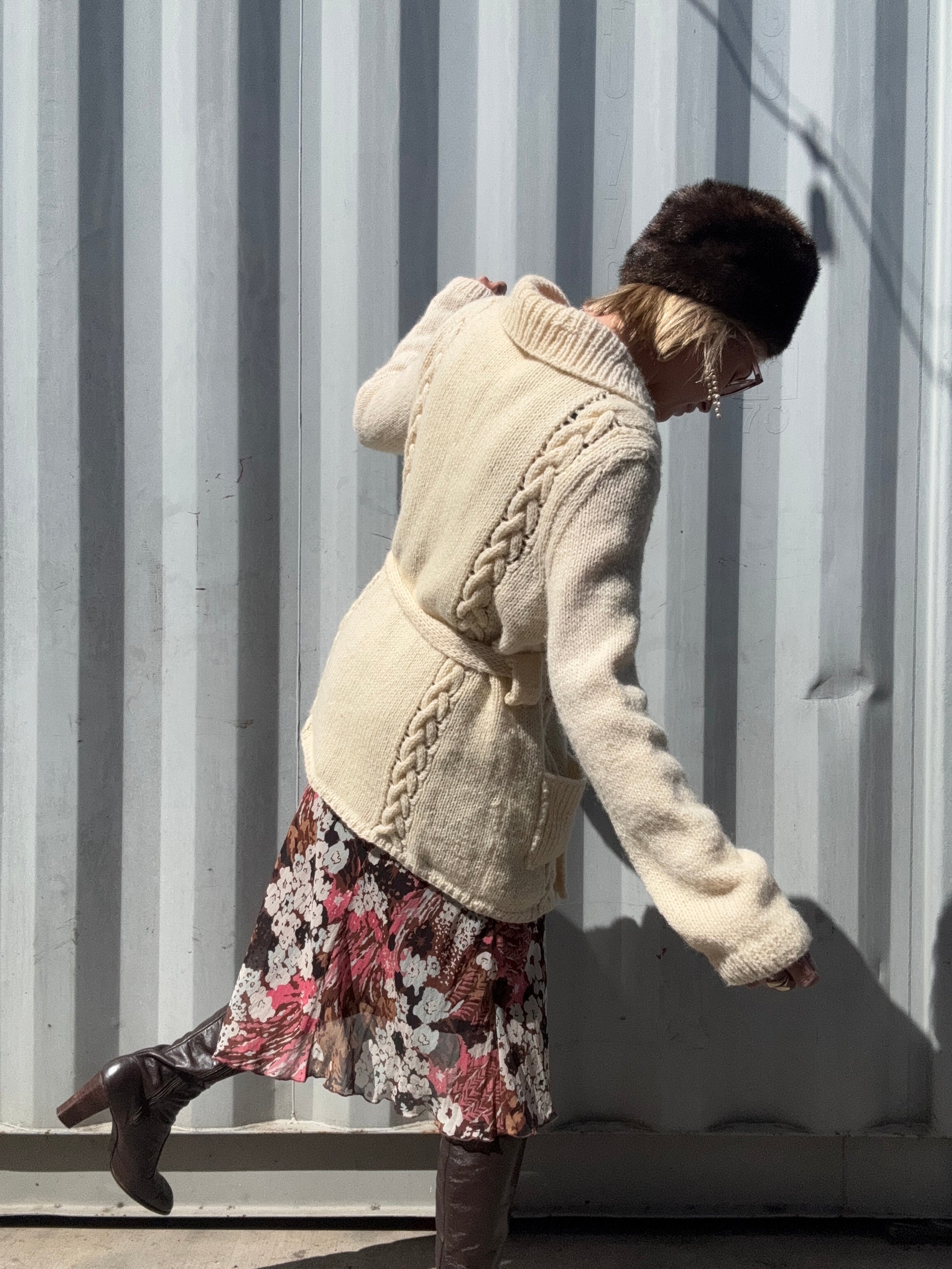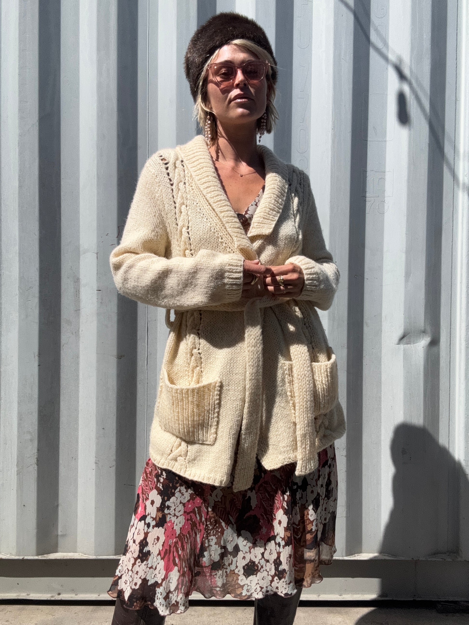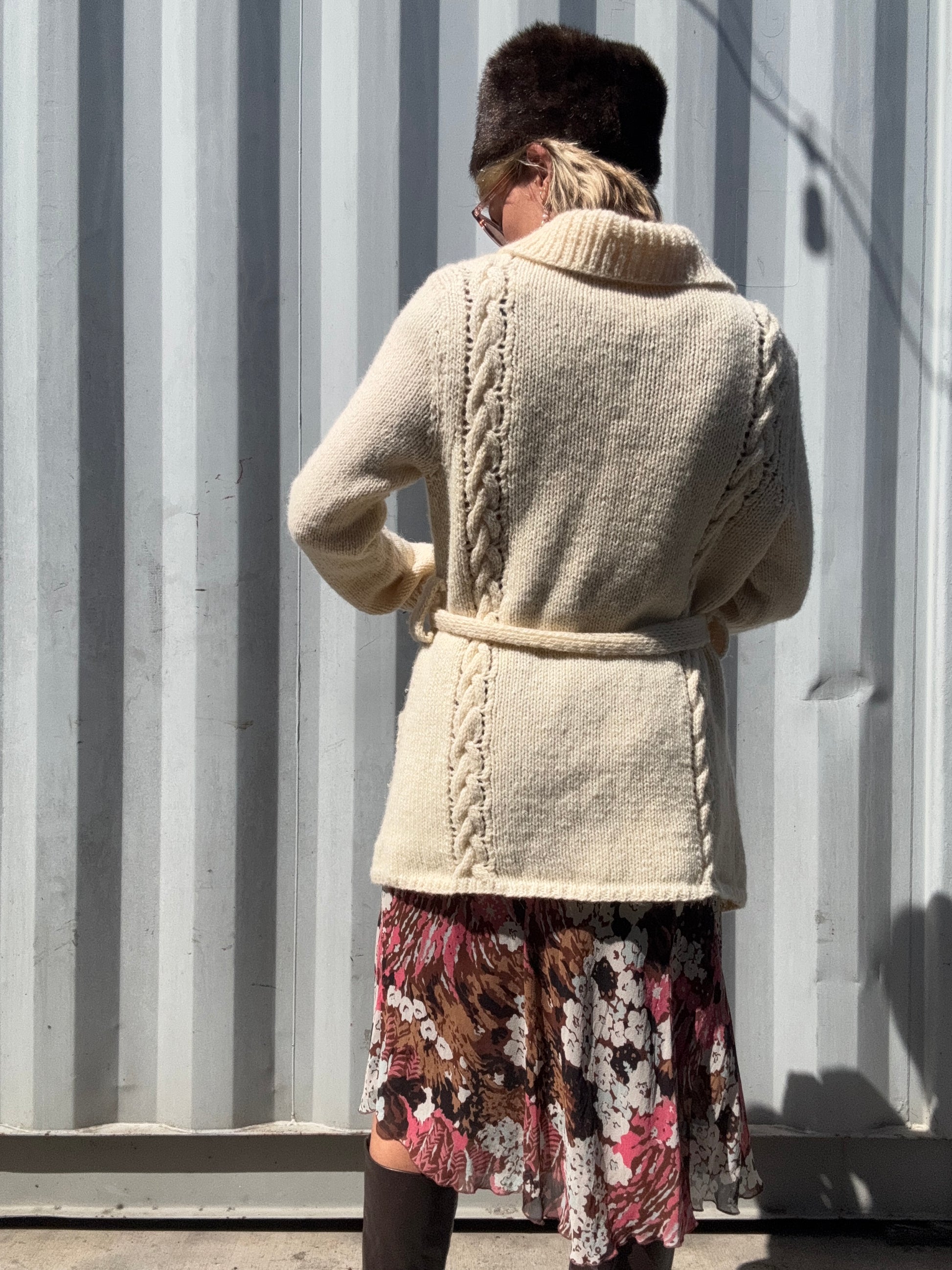 Hand-knit from Irish wool, The Florence Wool Cardigan is full of artisanal detail. The open front design includes wide-gauge cable knit panels lined with subtle see-through texture, front pockets, and a belt tie for an adjustable fit. Its soft cream hue makes it endlessly versatile. Wear it belted over a turtleneck and skirt with knee-high boots, or throw it on loose over jeans and leather loafers for cozy everyday layering.