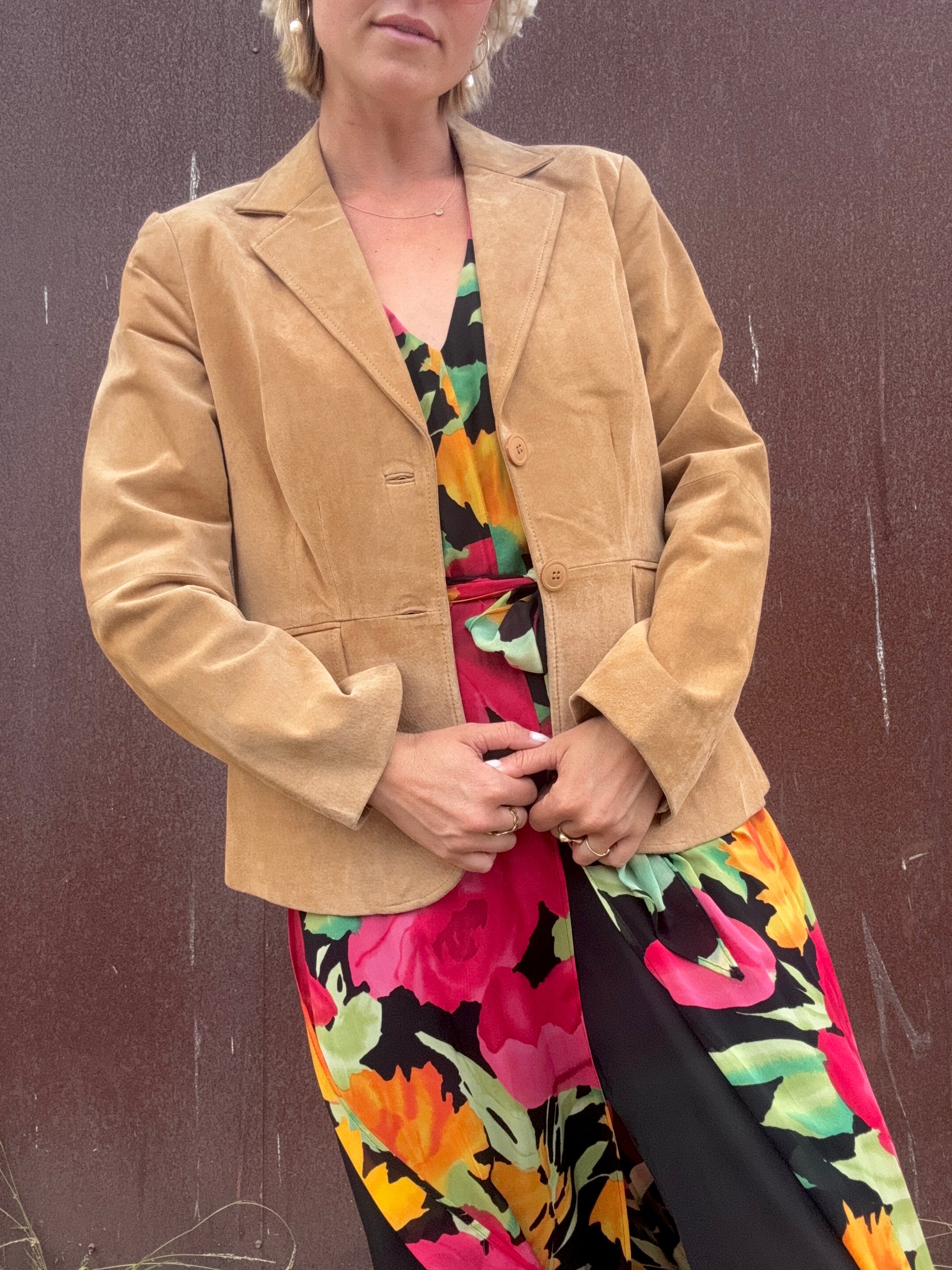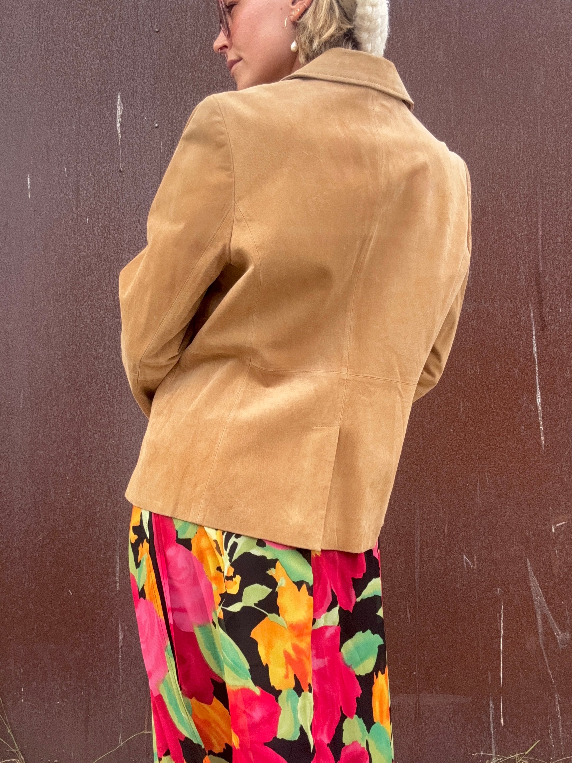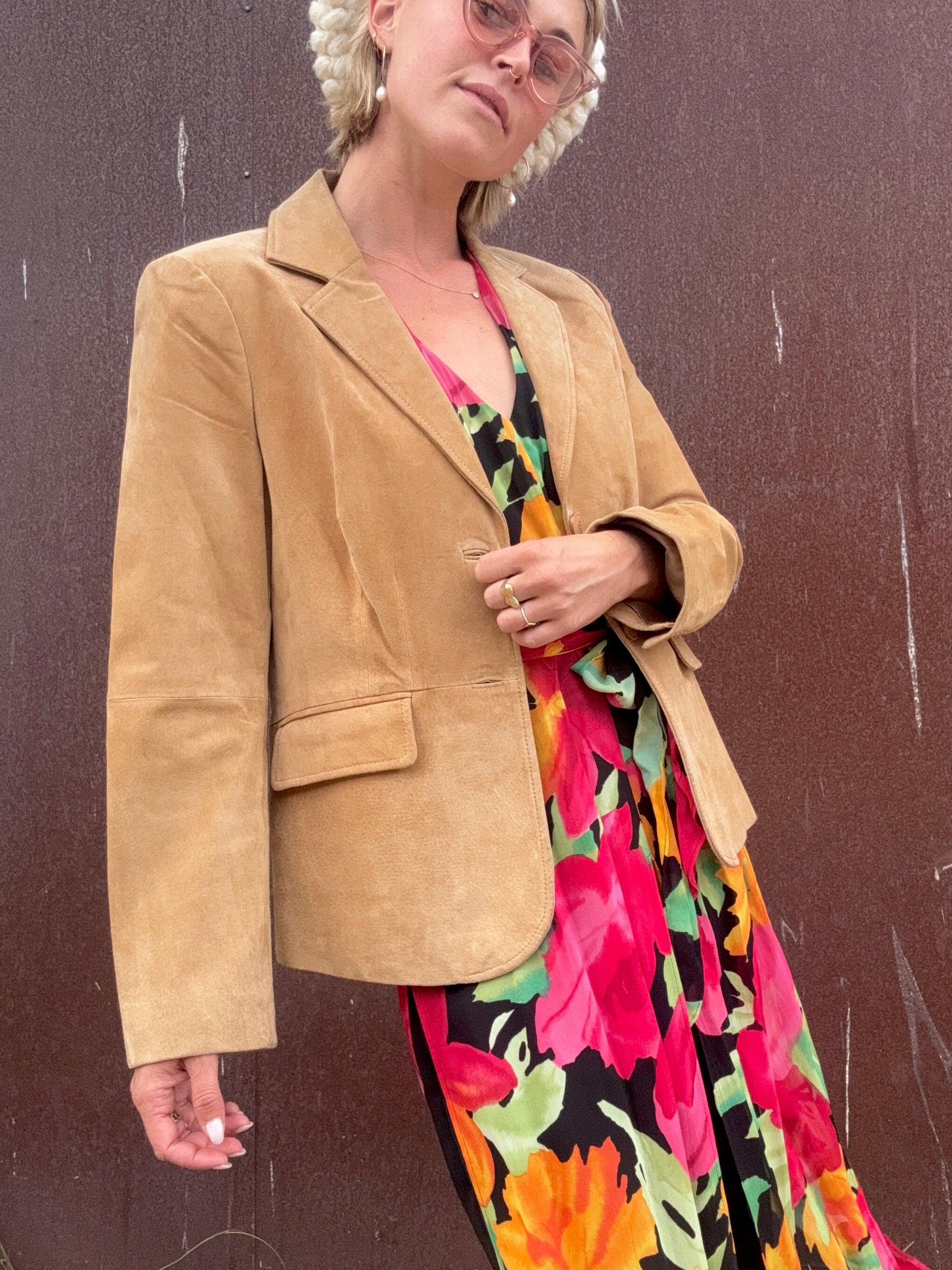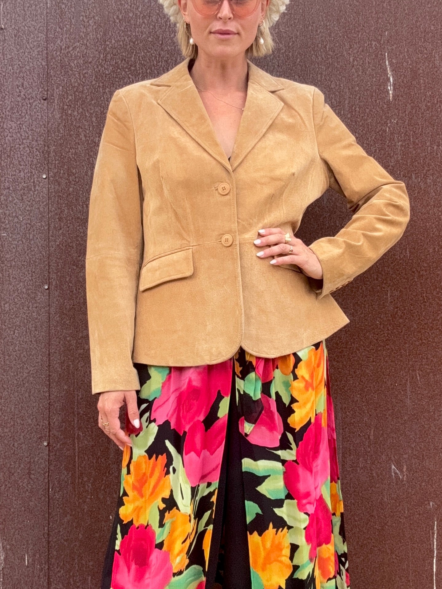 The Kyle Suede Leather Jacket is a sharp, structured piece crafted from genuine suede leather. Its tailored front seams and subtle shoulder pads give it a clean, defined silhouette, while the wooden buttons and flap pockets add practical detail. Fully lined for comfort, it closes with a two-button front and features four stacked buttons at each cuff. Pair it with wide-leg trousers and a silk blouse for a polished look, or throw it over a patterned midi dress to ground it with soft structure.