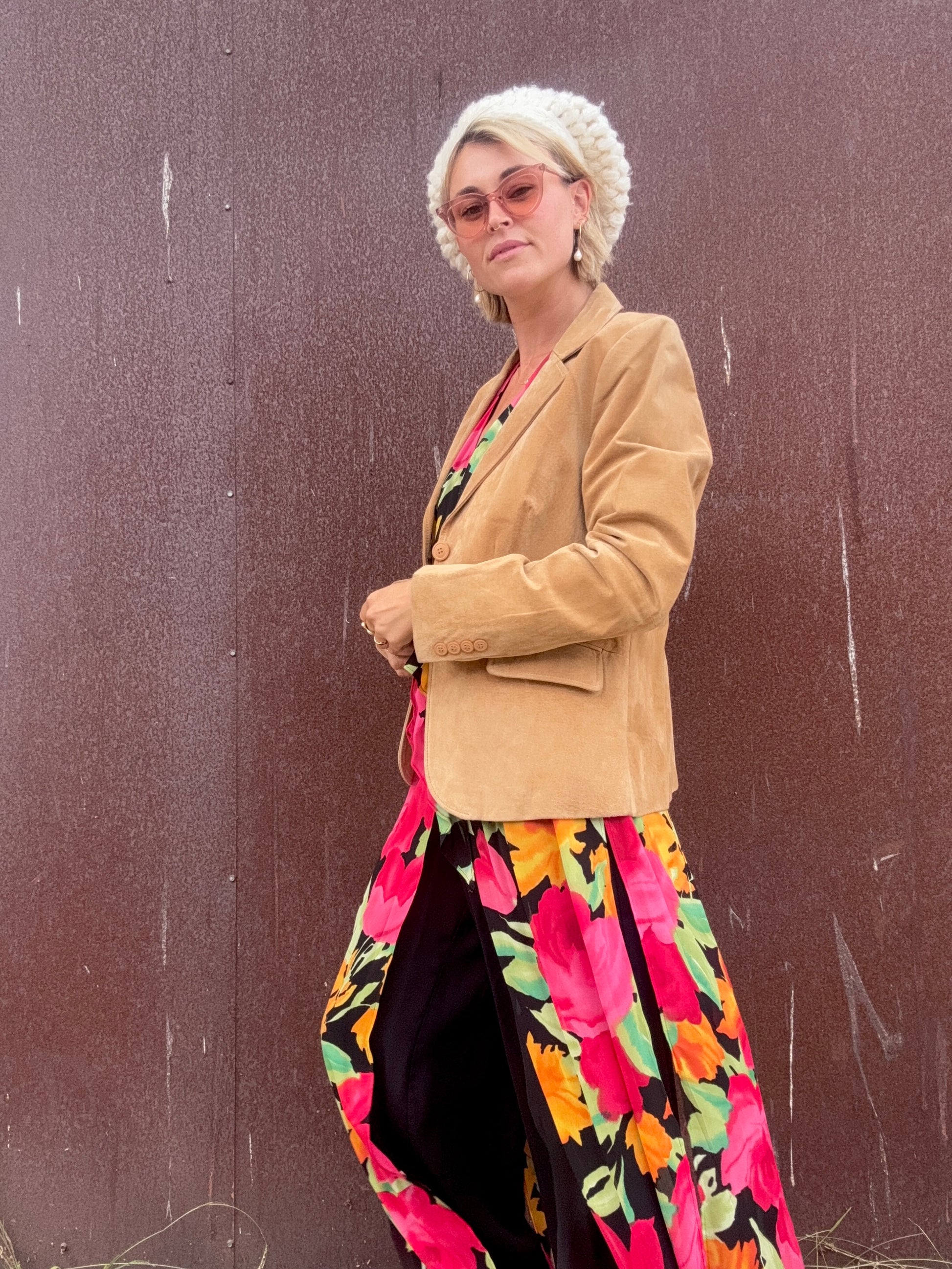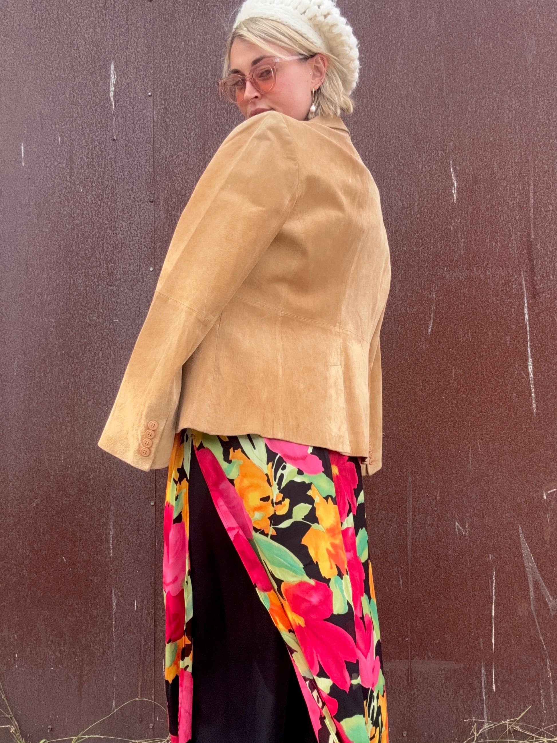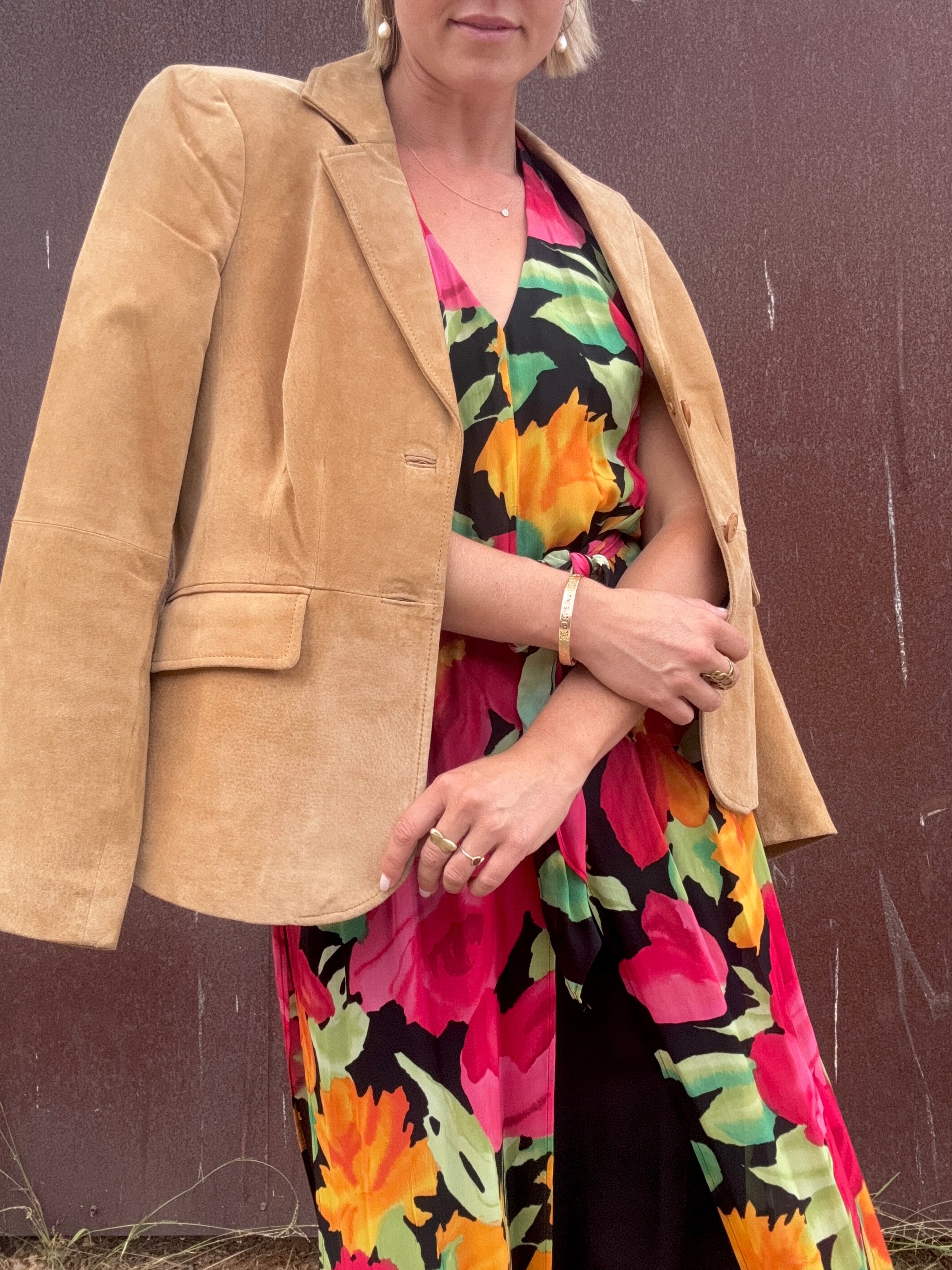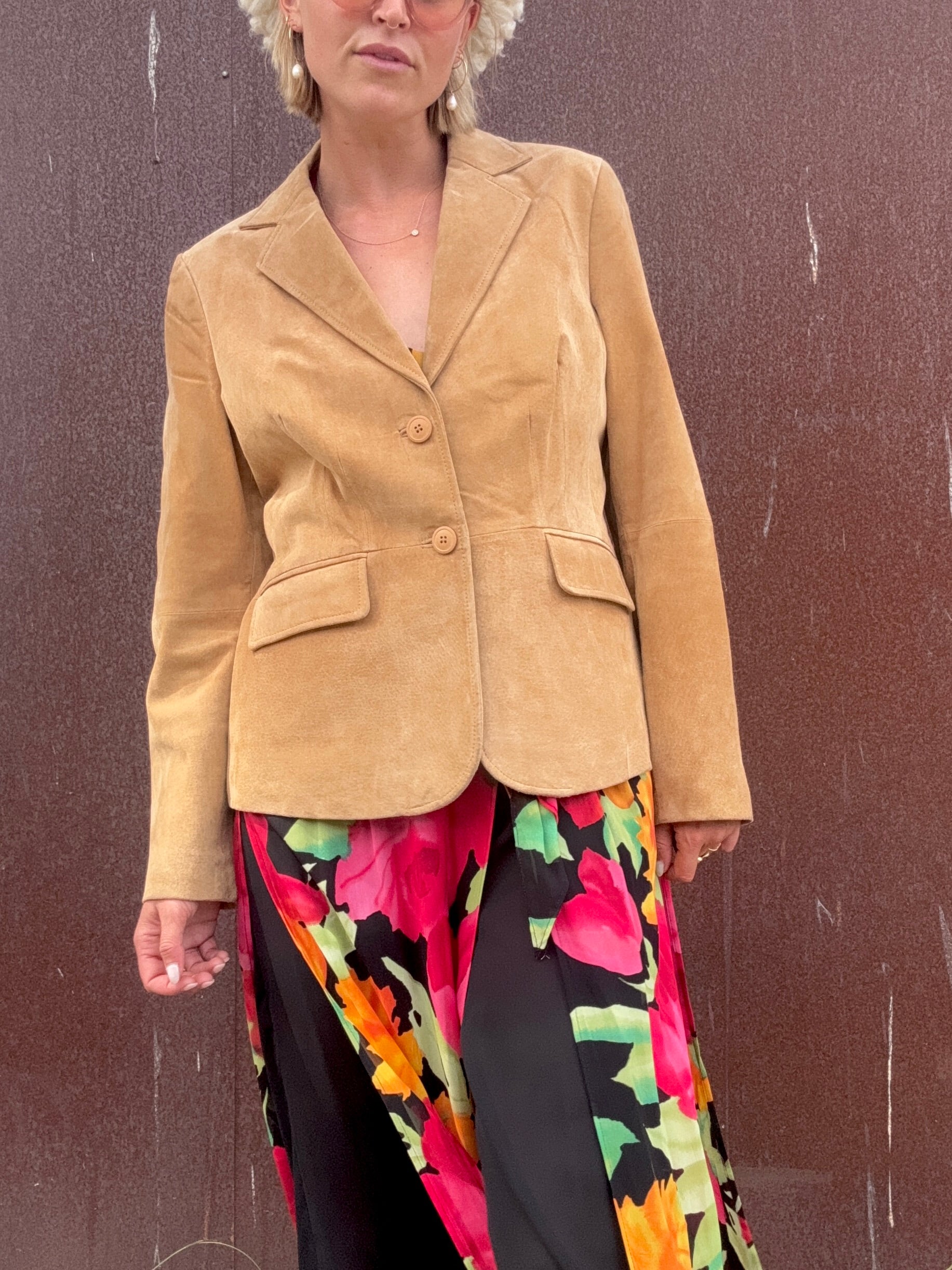 The Kyle Suede Leather Jacket is a sharp, structured piece crafted from genuine suede leather. Its tailored front seams and subtle shoulder pads give it a clean, defined silhouette, while the wooden buttons and flap pockets add practical detail. Fully lined for comfort, it closes with a two-button front and features four stacked buttons at each cuff. Pair it with wide-leg trousers and a silk blouse for a polished look, or throw it over a patterned midi dress to ground it with soft structure.