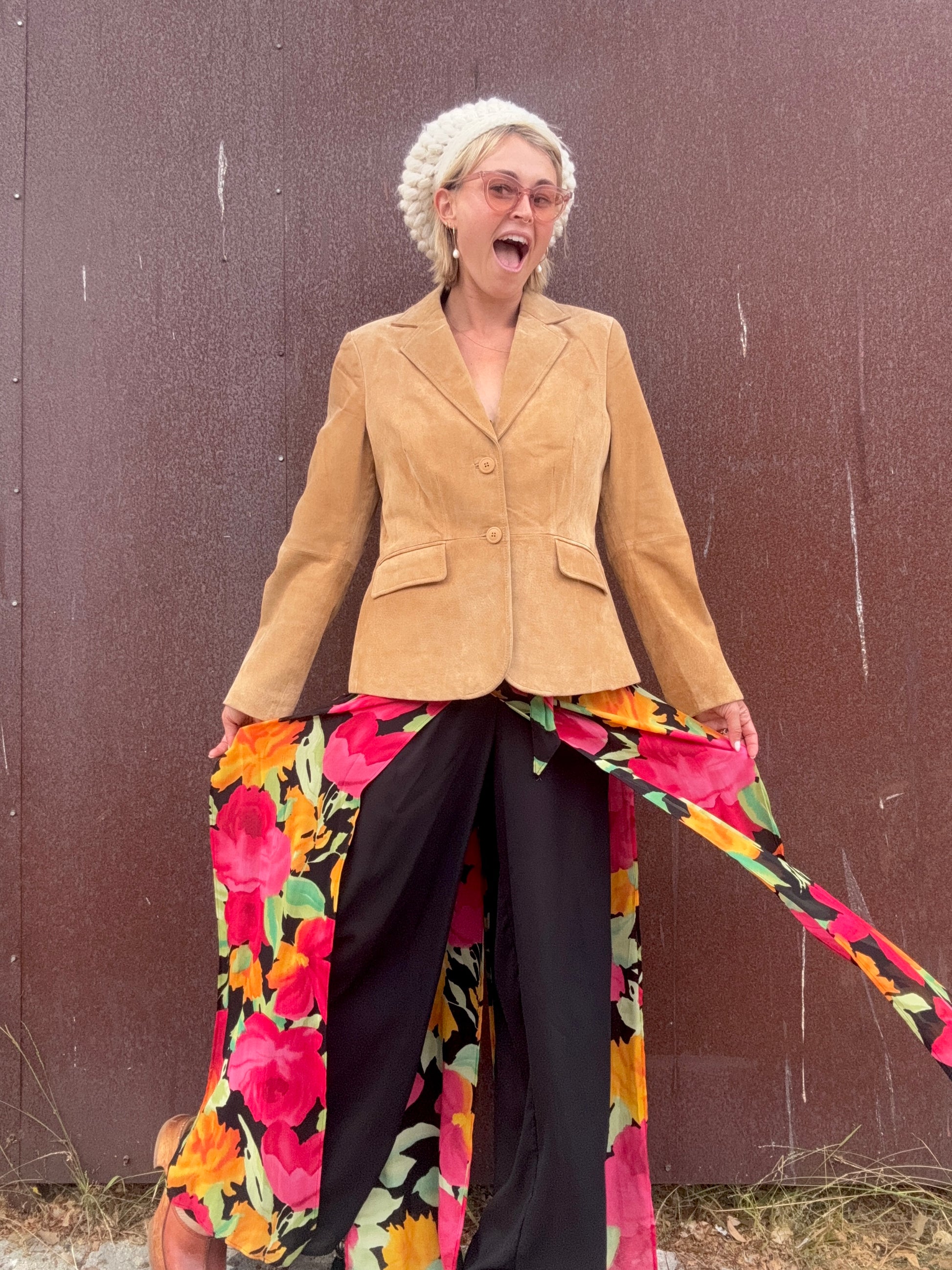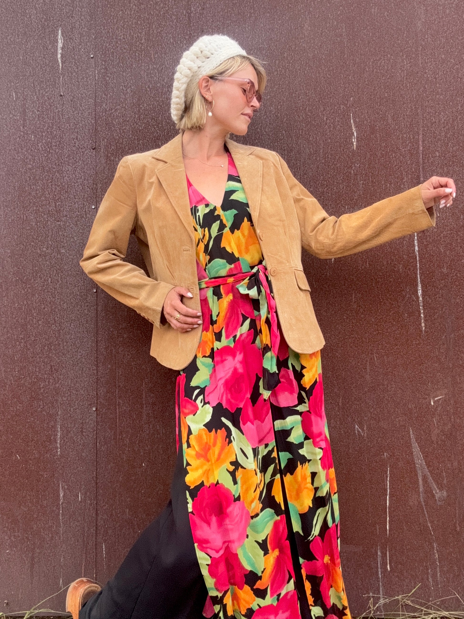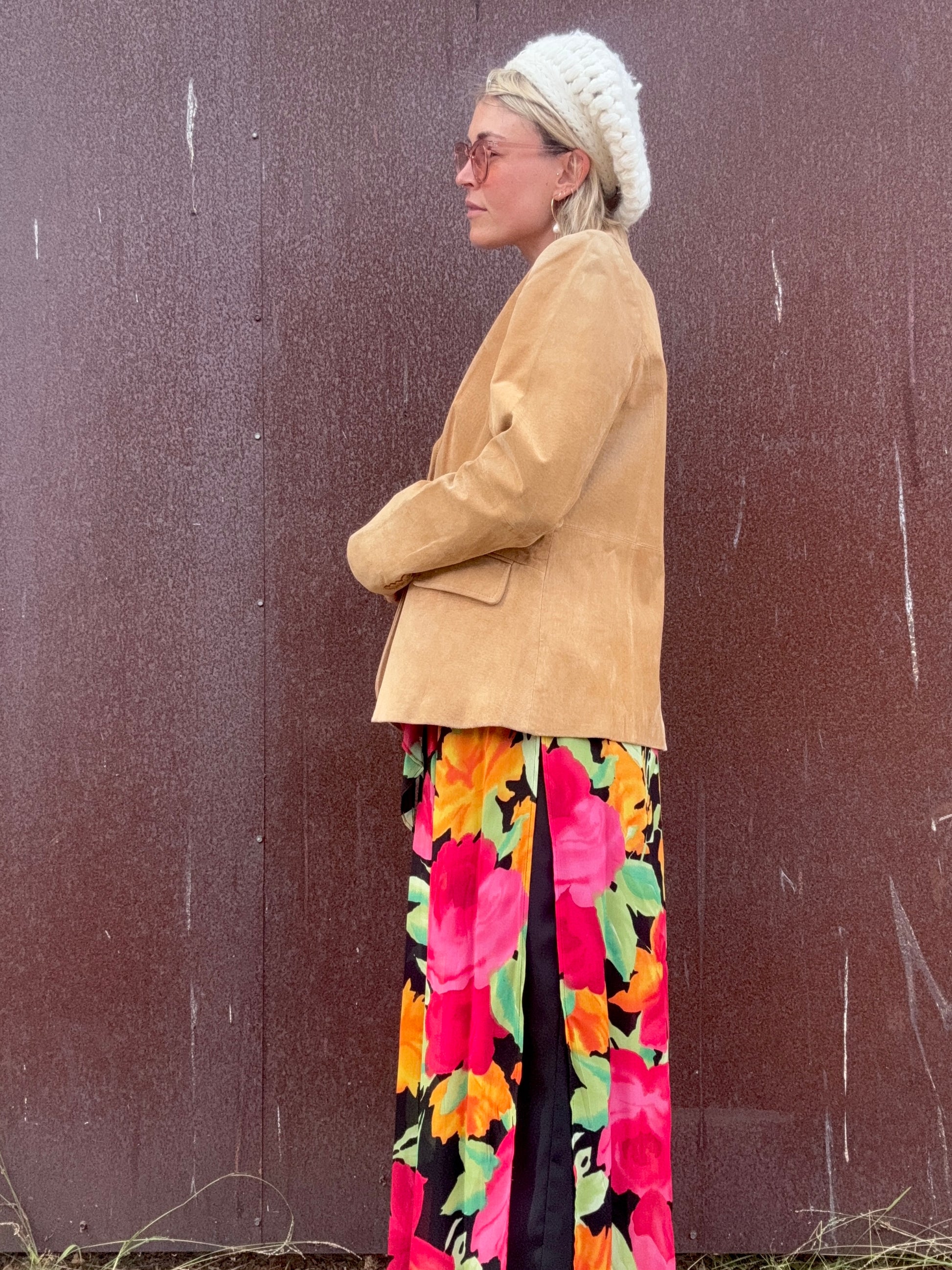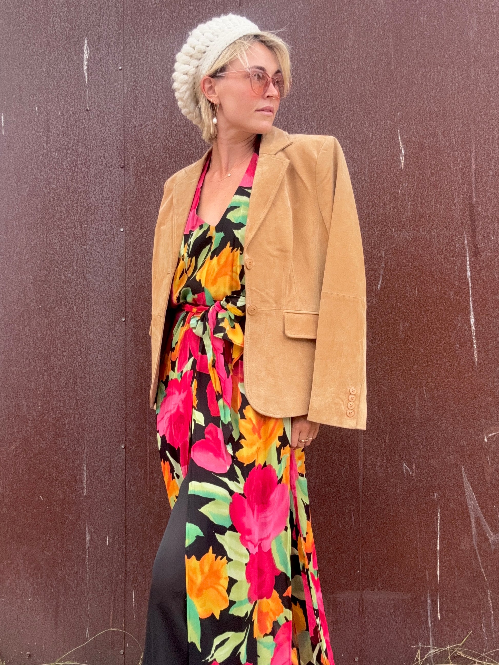 The Kyle Suede Leather Jacket is a sharp, structured piece crafted from genuine suede leather. Its tailored front seams and subtle shoulder pads give it a clean, defined silhouette, while the wooden buttons and flap pockets add practical detail. Fully lined for comfort, it closes with a two-button front and features four stacked buttons at each cuff. Pair it with wide-leg trousers and a silk blouse for a polished look, or throw it over a patterned midi dress to ground it with soft structure.