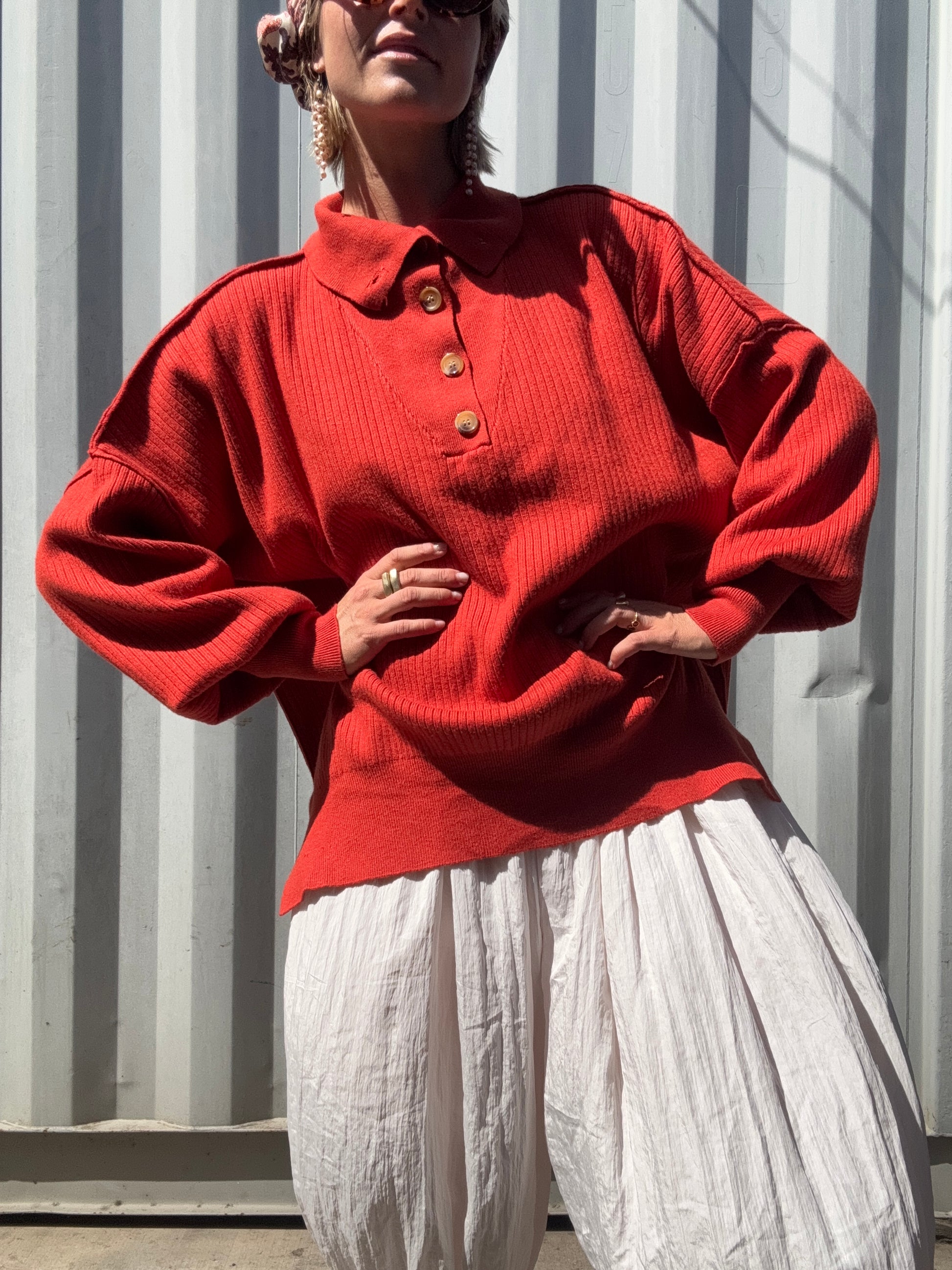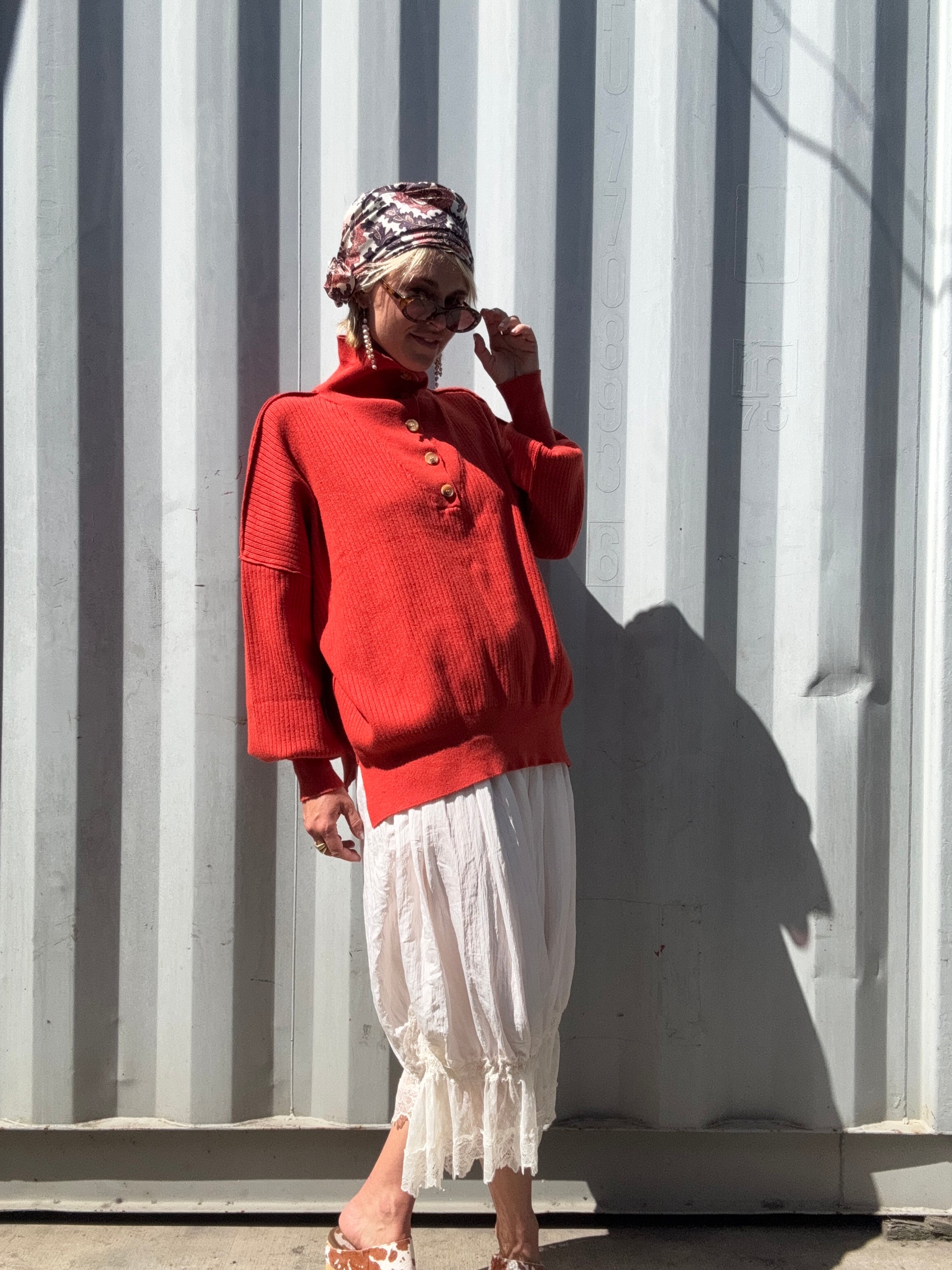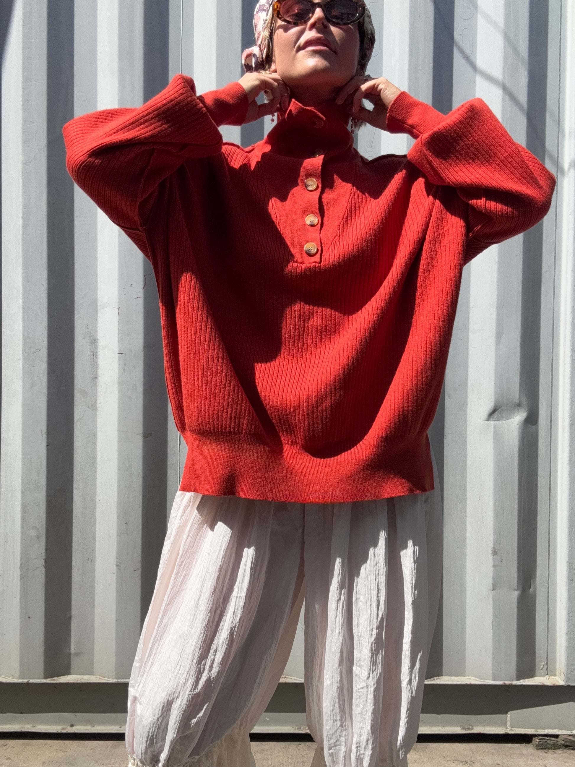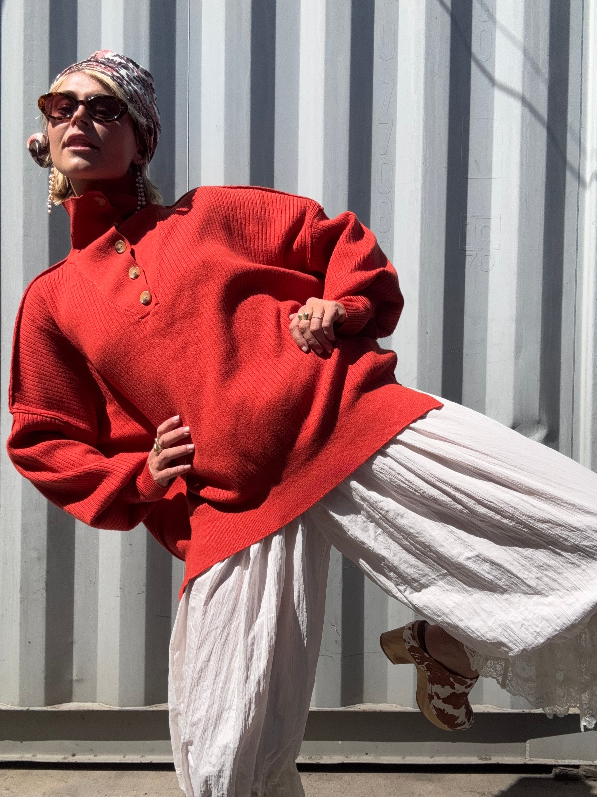 The Liliane Ribbed Sweater is a striking piece in a rich, burnt orange hue, designed with a dramatic ribbed knit that feels truly soft and wonderfully stretchy. Its high button-up neckline can be worn fully fastened or casually open, giving it versatility in styling. Also...we have to mention that this is the softest sweater ever! The relaxed sleeves taper into wide cuffs, balancing ease with structure. Pair it with denim and suede boots for a casual late-fall look, or layer it over a midi skirt and tights with ankle boots for an elevated winter ensemble.