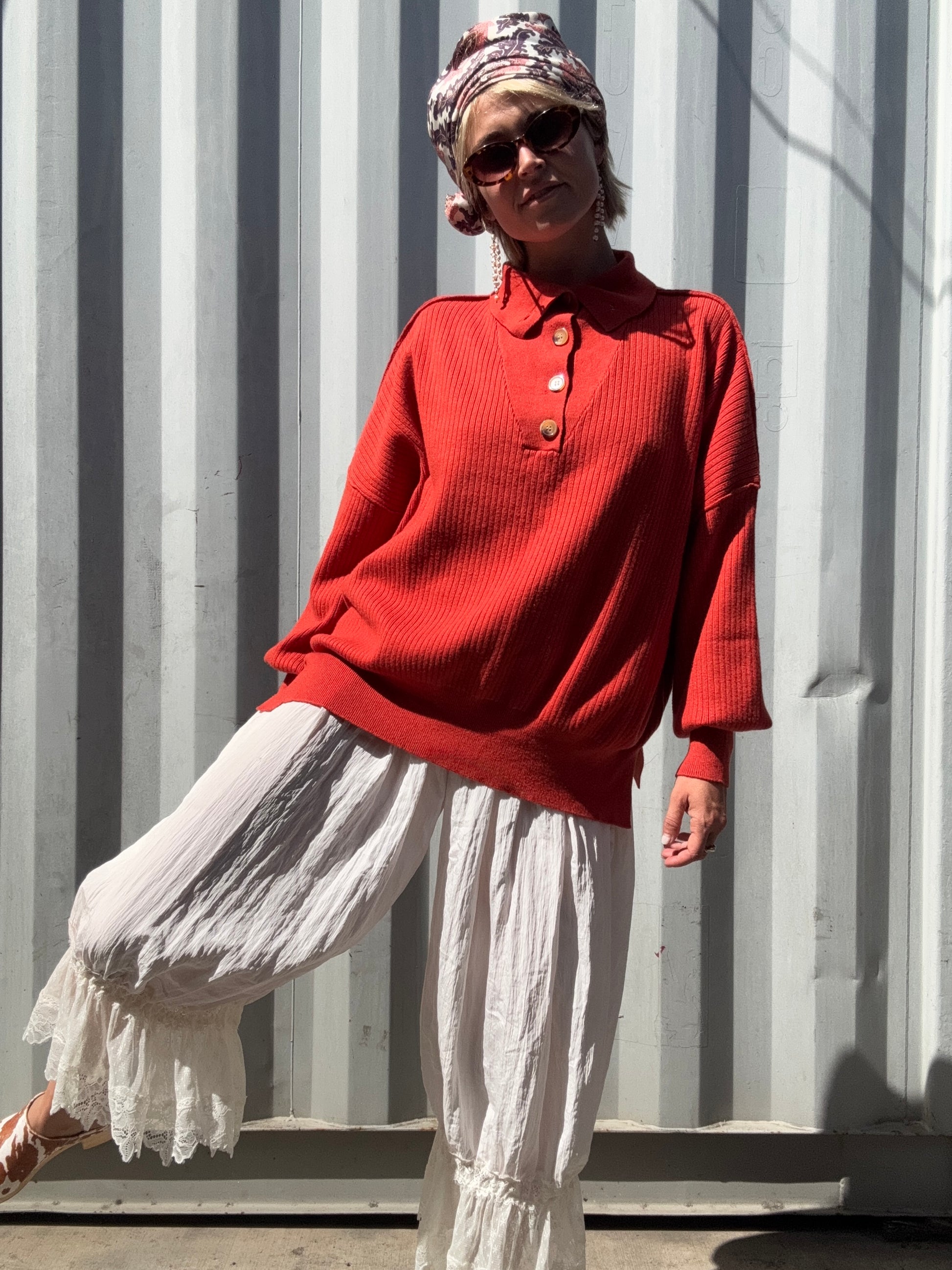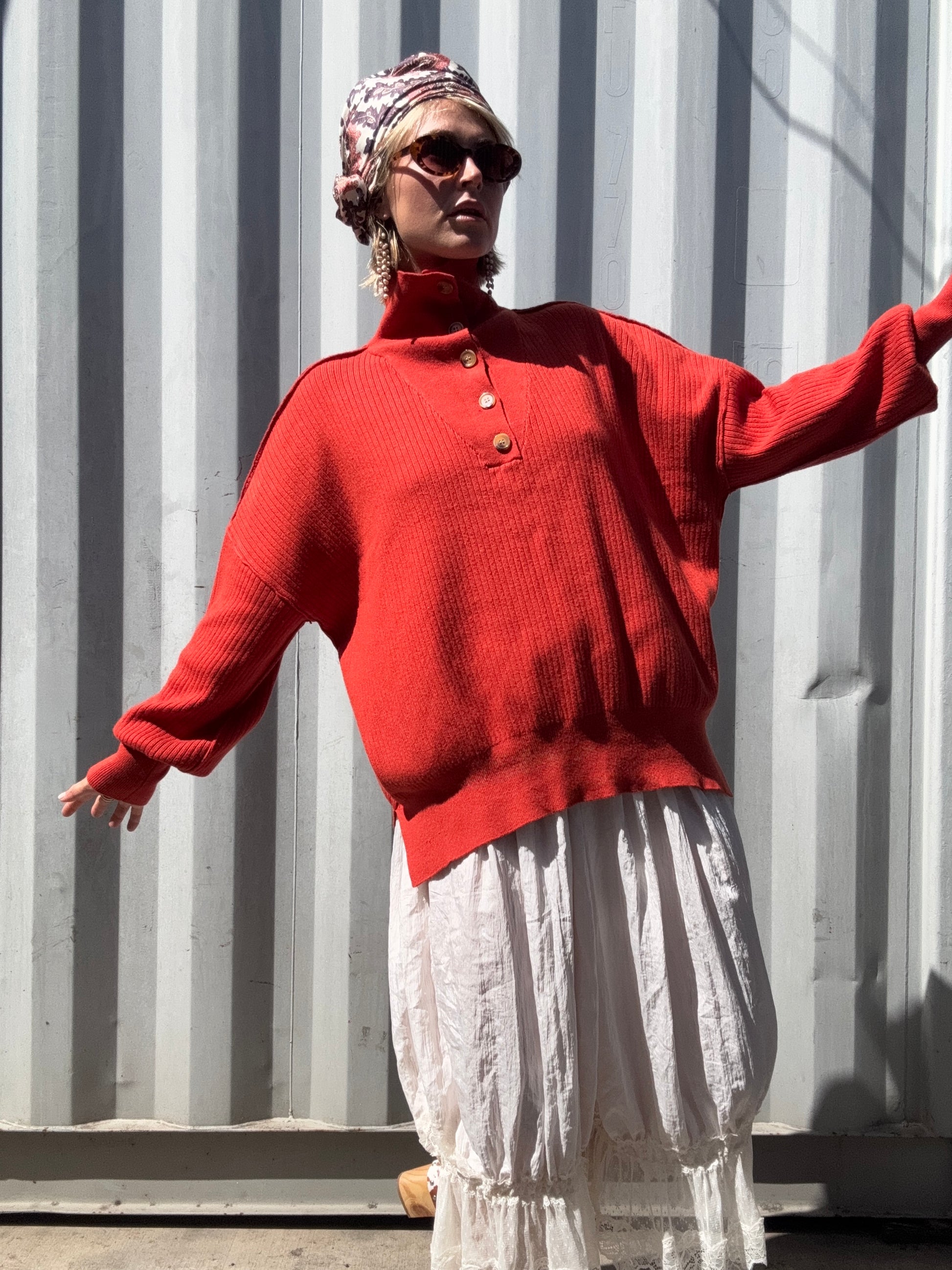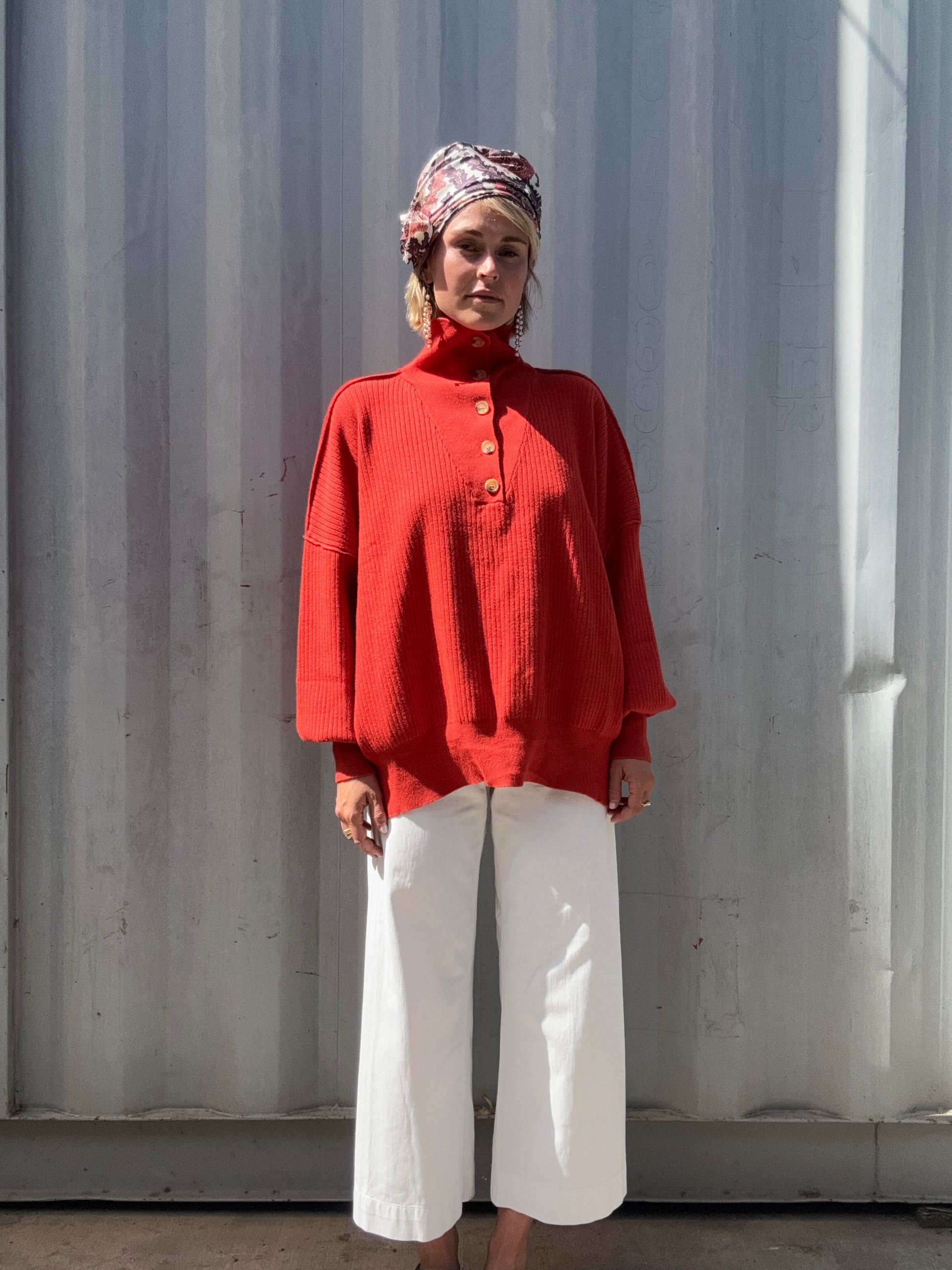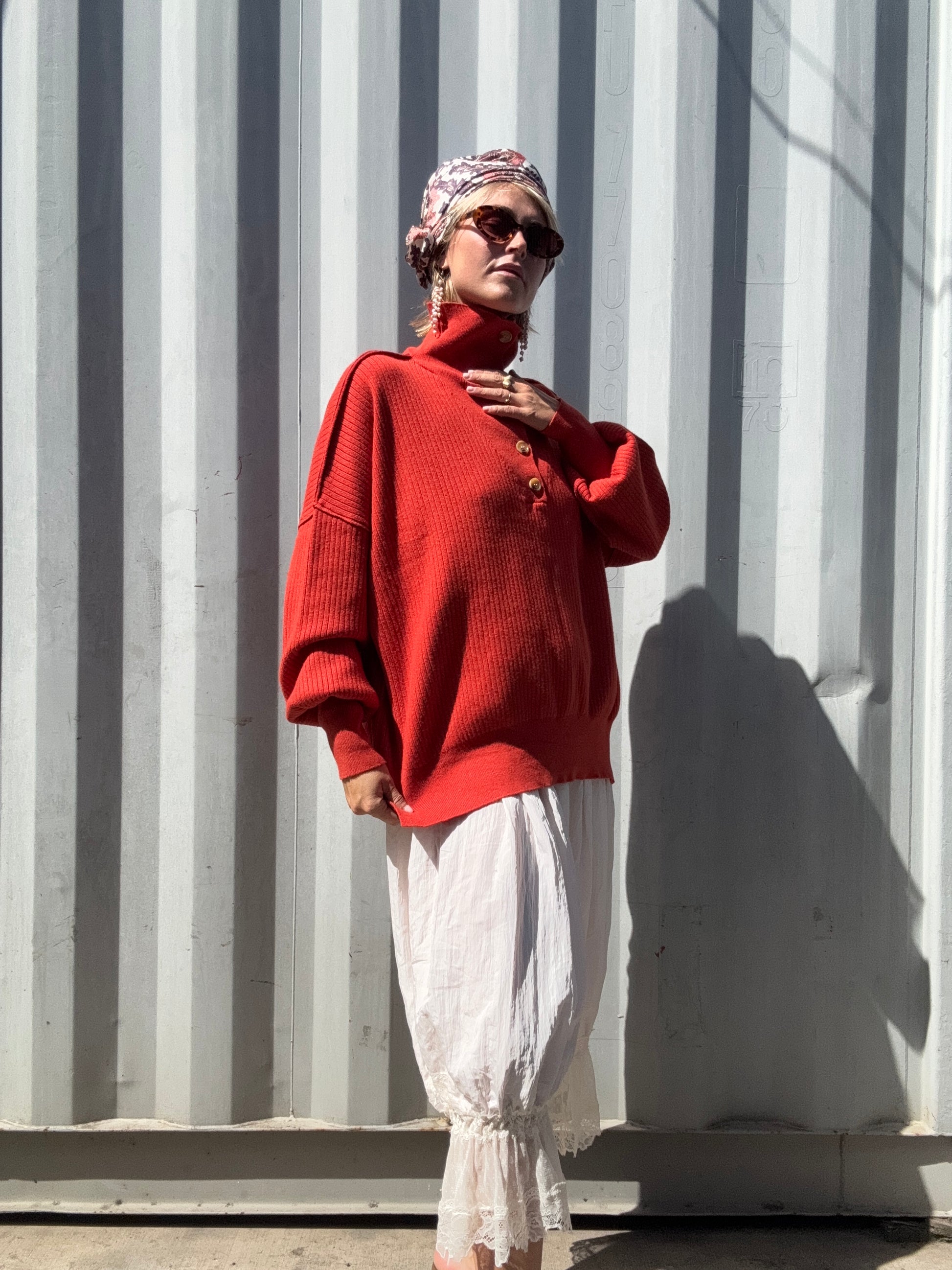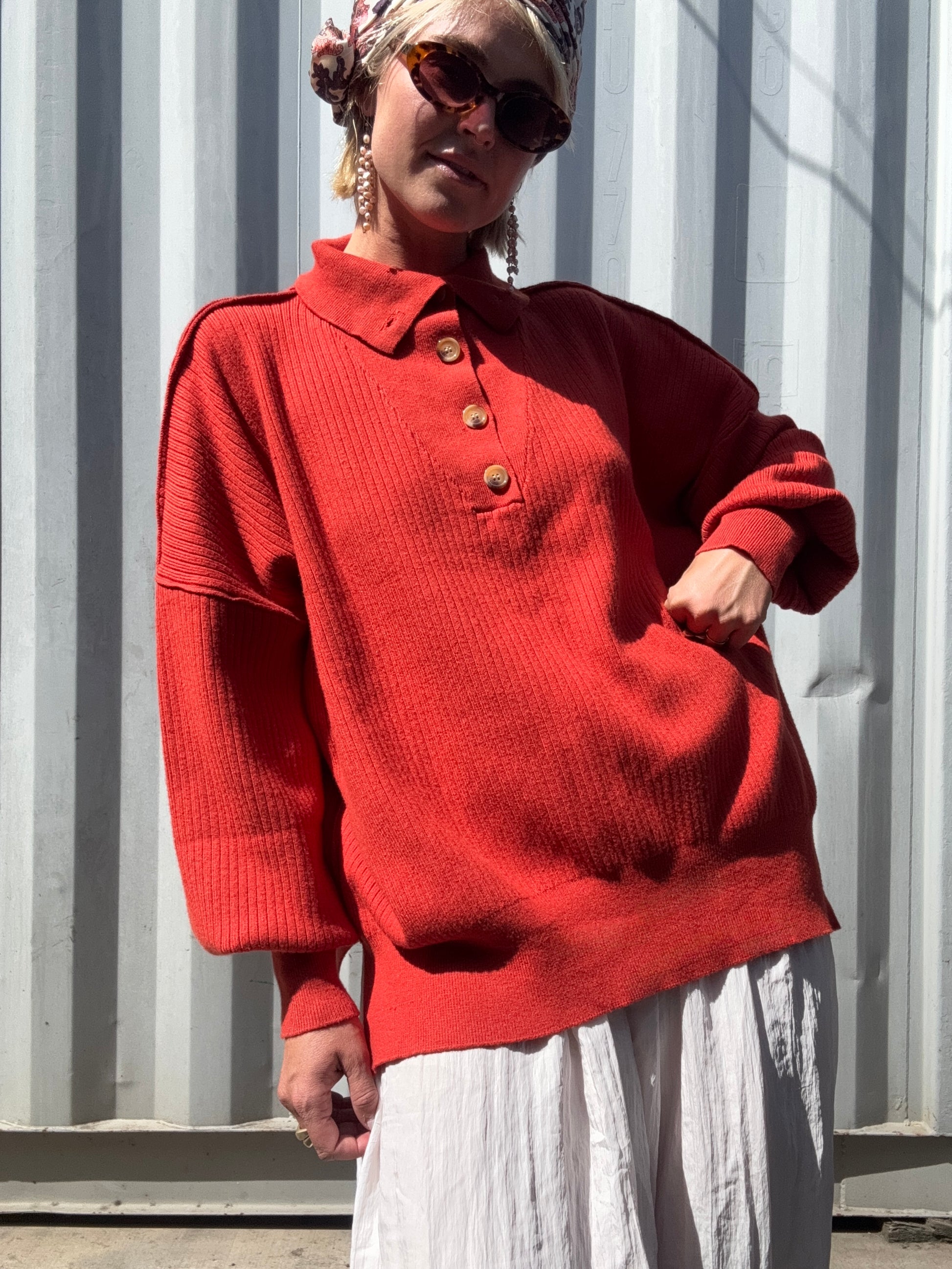 The Liliane Ribbed Sweater is a striking piece in a rich, burnt orange hue, designed with a dramatic ribbed knit that feels truly soft and wonderfully stretchy. Its high button-up neckline can be worn fully fastened or casually open, giving it versatility in styling. Also...we have to mention that this is the softest sweater ever! The relaxed sleeves taper into wide cuffs, balancing ease with structure. Pair it with denim and suede boots for a casual late-fall look, or layer it over a midi skirt and tights with ankle boots for an elevated winter ensemble.