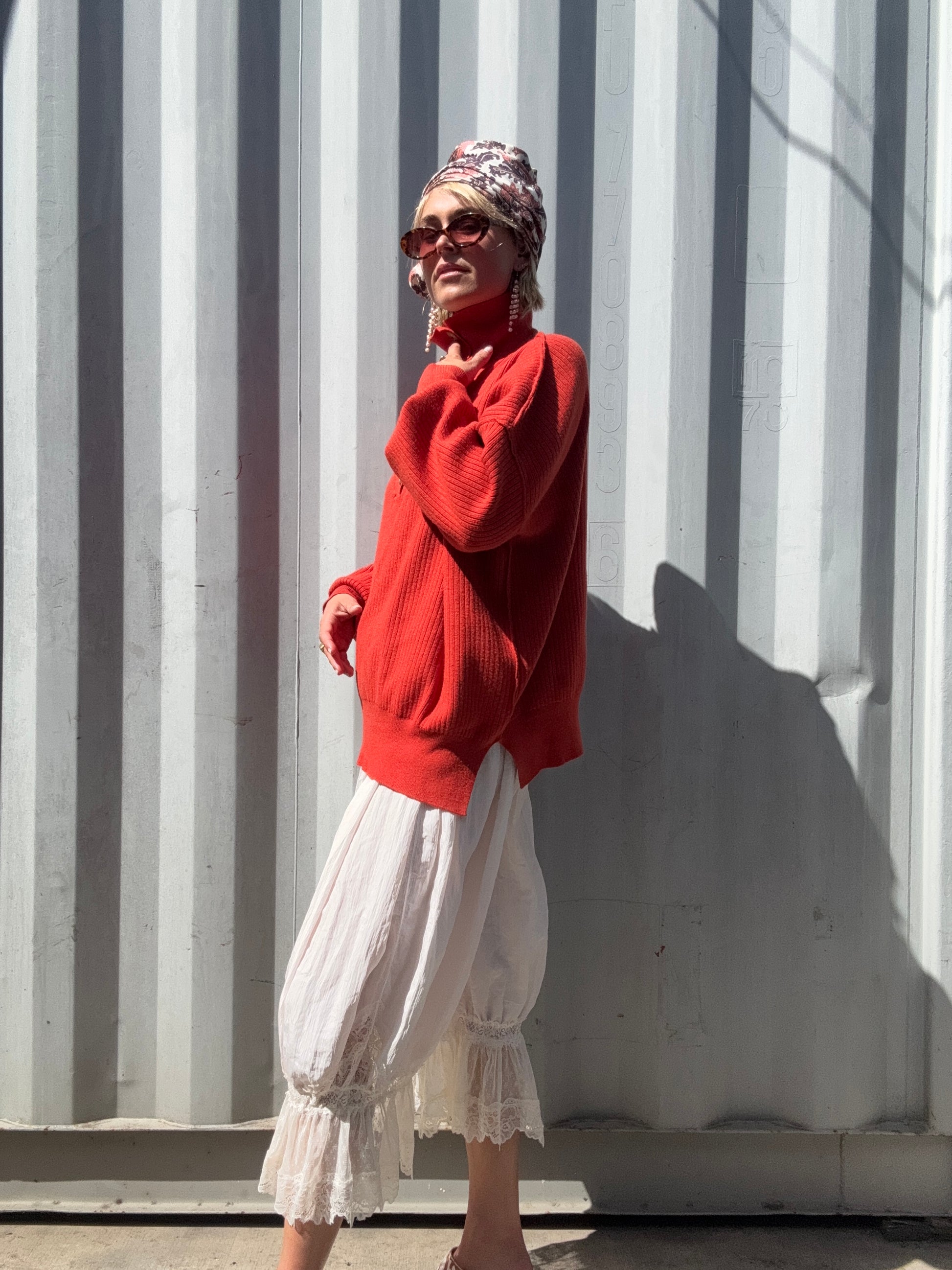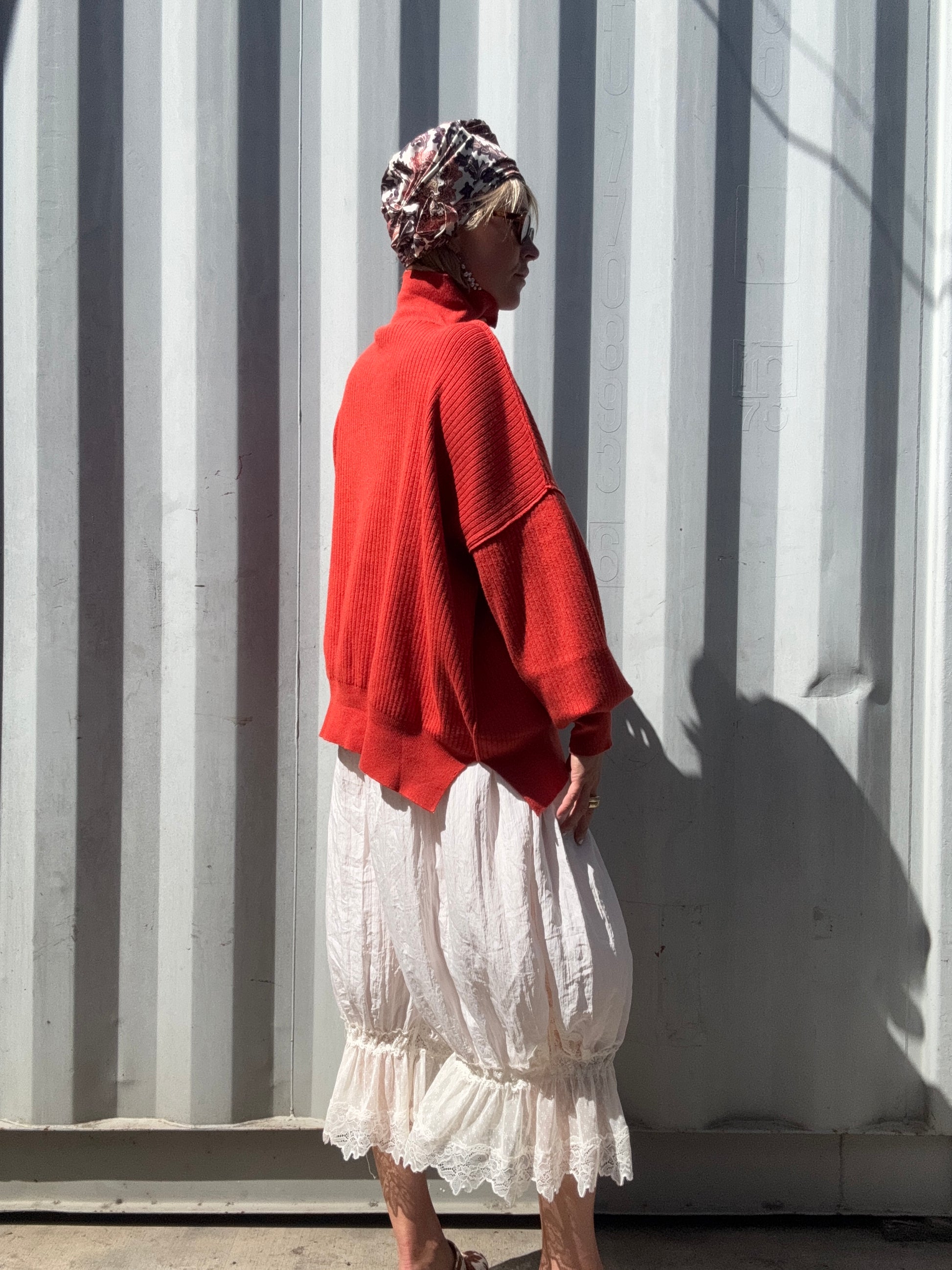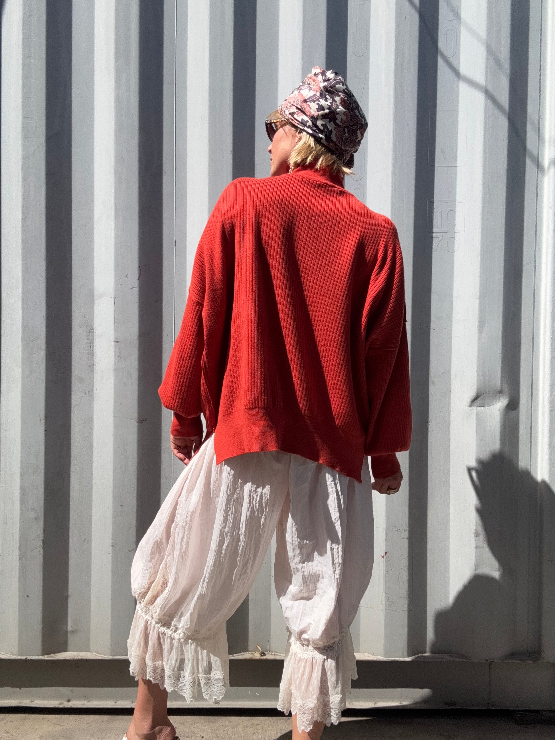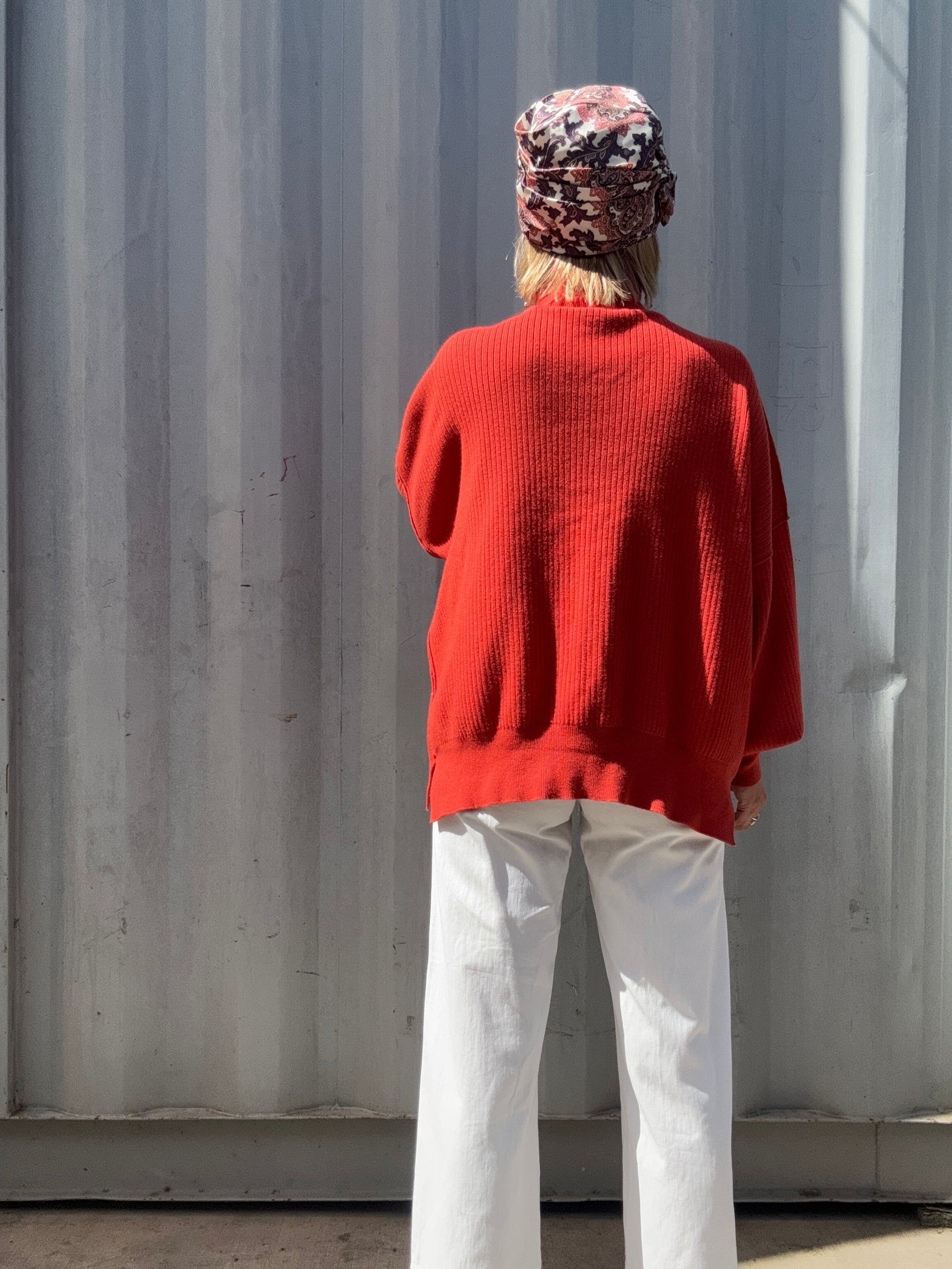 The Liliane Ribbed Sweater is a striking piece in a rich, burnt orange hue, designed with a dramatic ribbed knit that feels truly soft and wonderfully stretchy. Its high button-up neckline can be worn fully fastened or casually open, giving it versatility in styling. Also...we have to mention that this is the softest sweater ever! The relaxed sleeves taper into wide cuffs, balancing ease with structure. Pair it with denim and suede boots for a casual late-fall look, or layer it over a midi skirt and tights with ankle boots for an elevated winter ensemble.