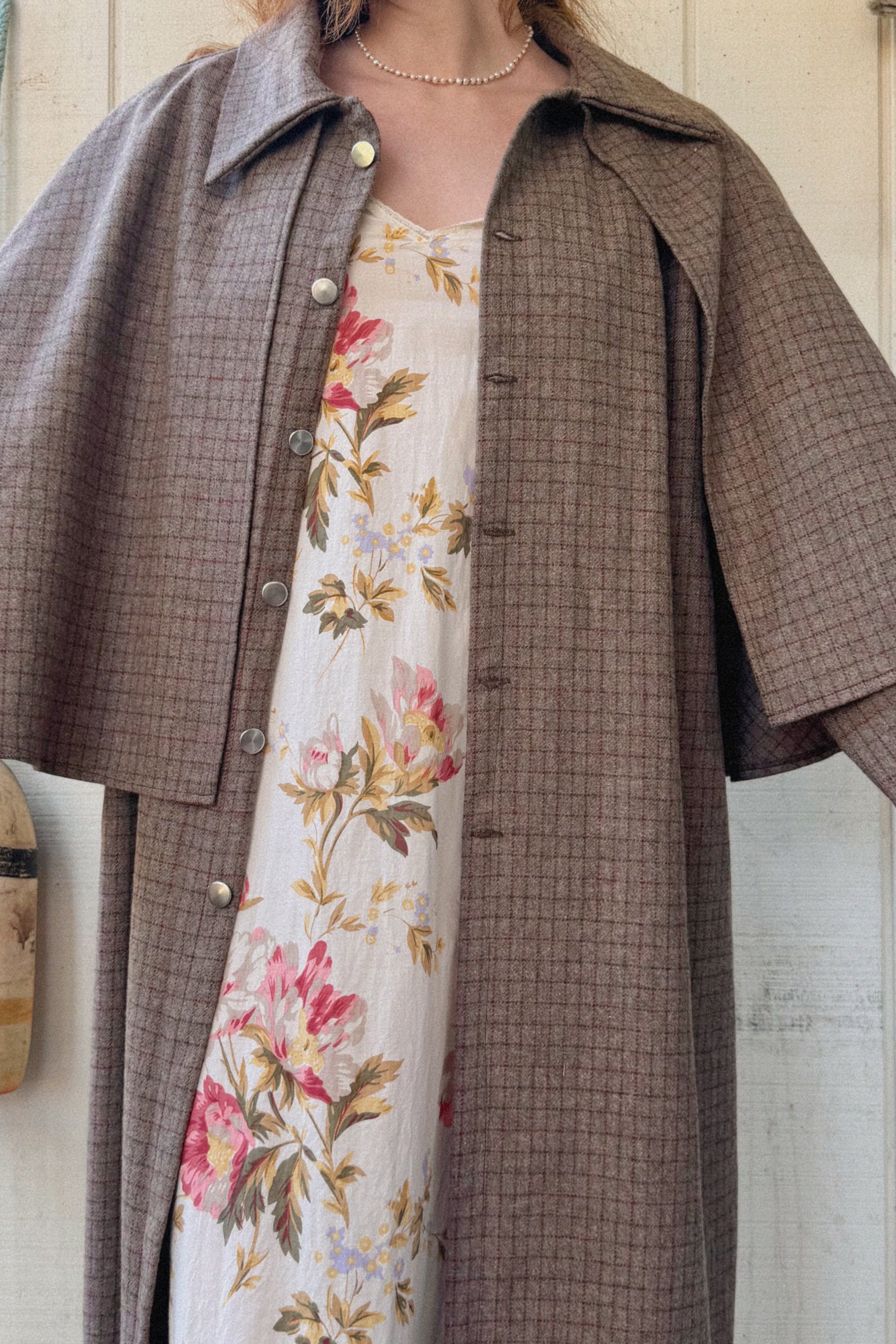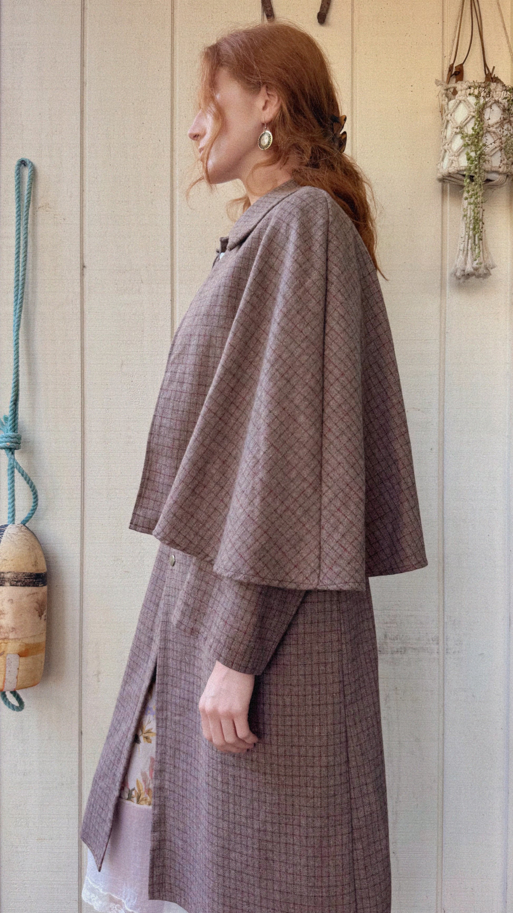 The Madeleine Wool Coat is softly structured and crafted from lightweight wool in a subtle windowpane check. Designed with a relaxed, cape-like overlay that drapes over the shoulders, it creates a fluid silhouette with gentle movement through the sleeves. The front closes with a row of matte metal buttons, adding a clean, understated contrast to the textured fabric.