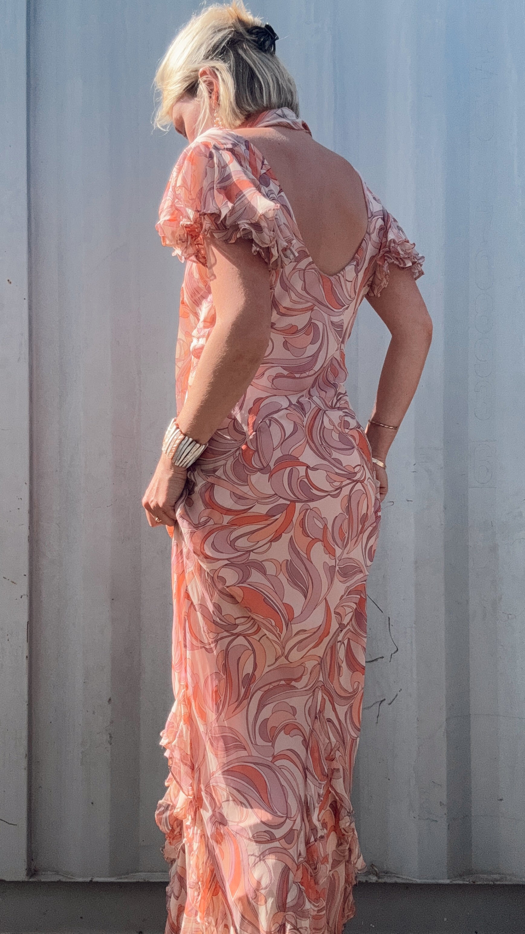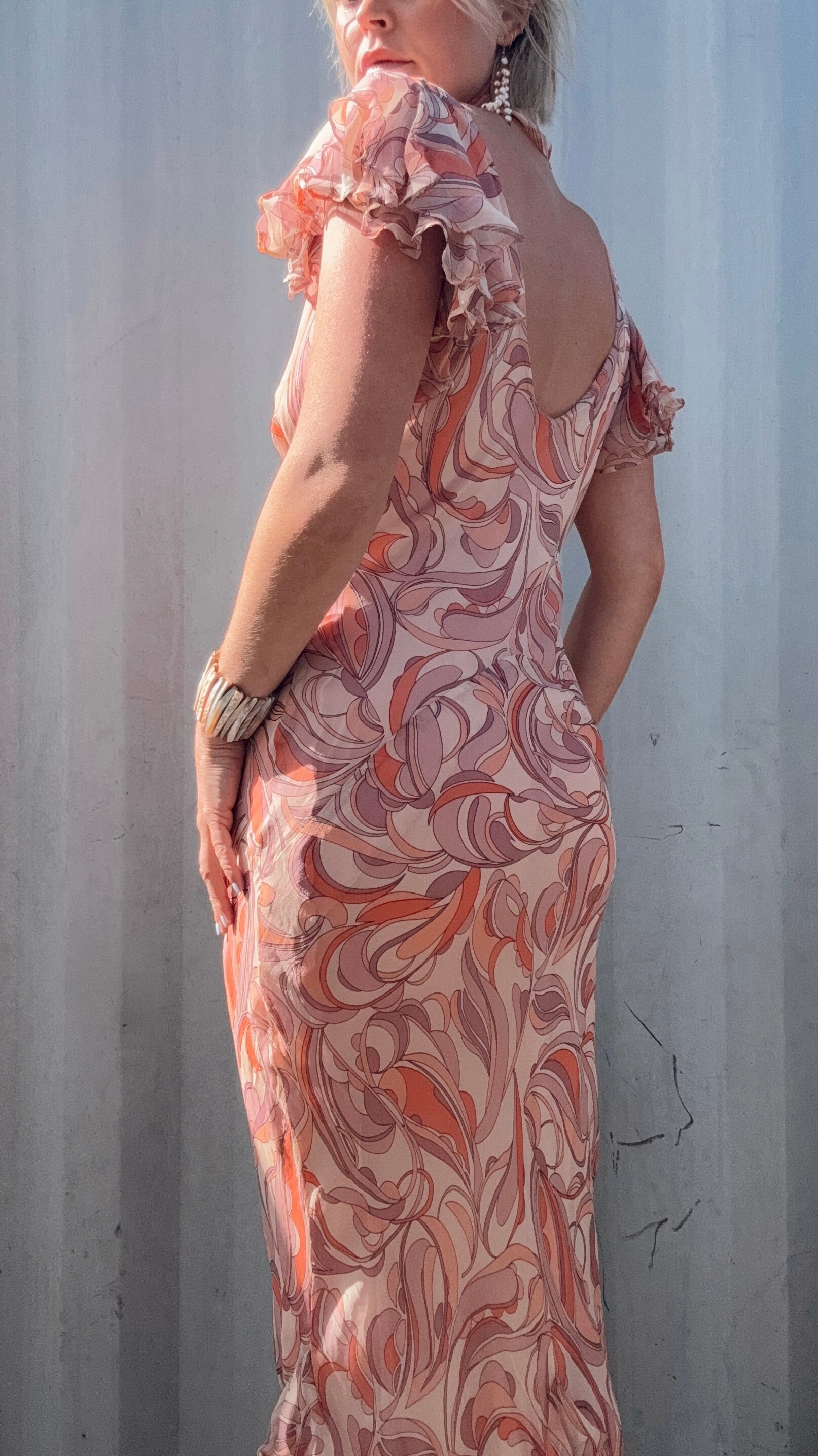 The Miranda Silk Handmade Maxi Dress is a dreamy bias-cut gown in lightweight printed silk, designed with a softly draped V-neckline and a fluid silhouette that skims the body. The fabric is sheer with a full lining beneath, while the airy sleeves are constructed from two layers of silk that flutter with delicate ruffled edges. The skirt opens into a striking inverted V at the front, finished with cascading ruffles arranged in upside-down chevrons that add movement through the hem. She also comes with a matching silk scarf to wrap loosely around the neck or tie in a soft bow.