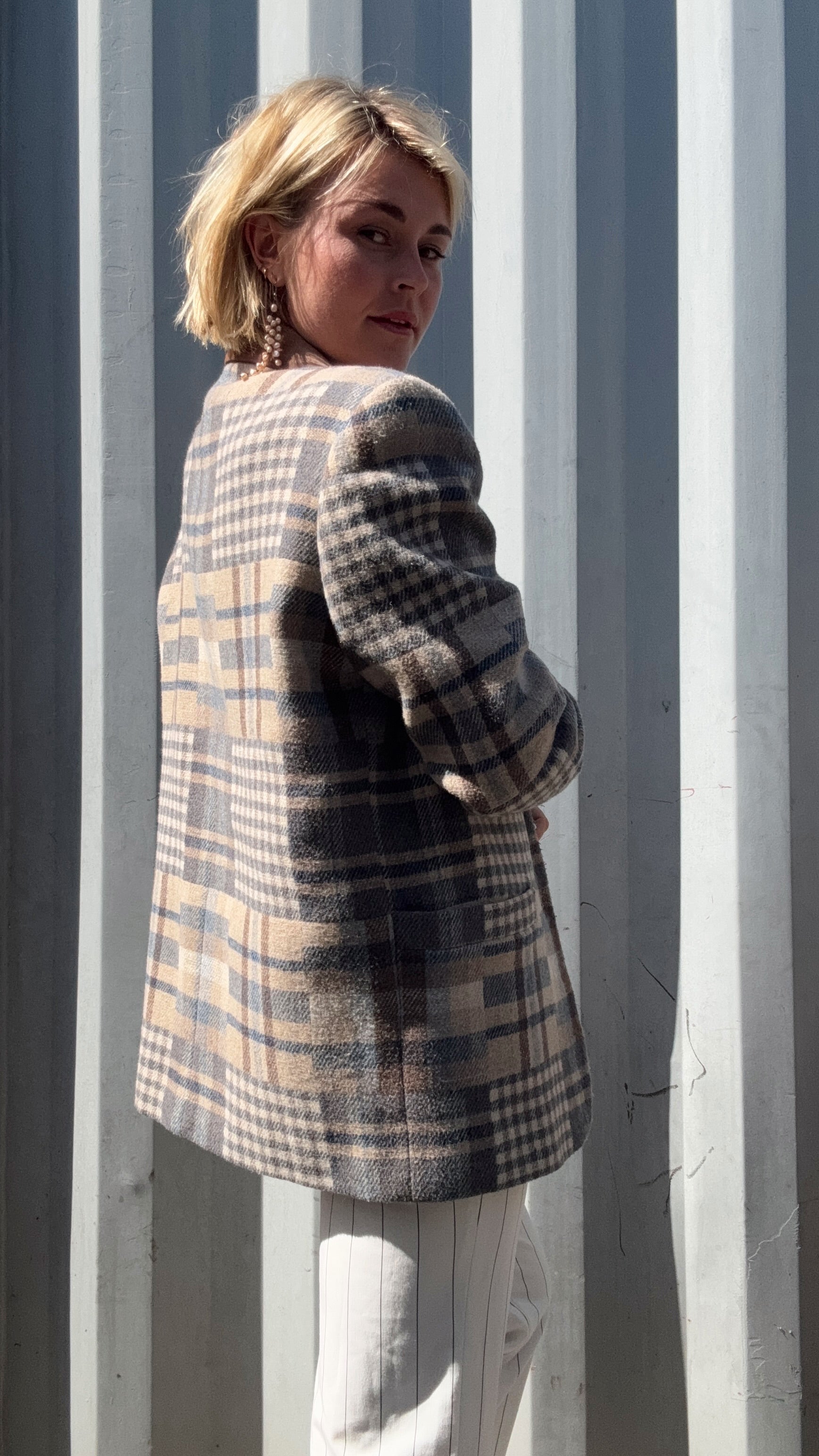 The Pippa Plaid Blazer is a tailored wool-blend jacket in a classic plaid pattern, accented with a partial suede collar that adds subtle texture and contrast along the neckline. The structured silhouette features a single front breast pocket, two front patch pockets, and distinctive leather buttons running down the front closure for a warm, heritage-inspired finish. Softly shaped shoulder padding and clean lines give the piece an easy fit that layers beautifully.