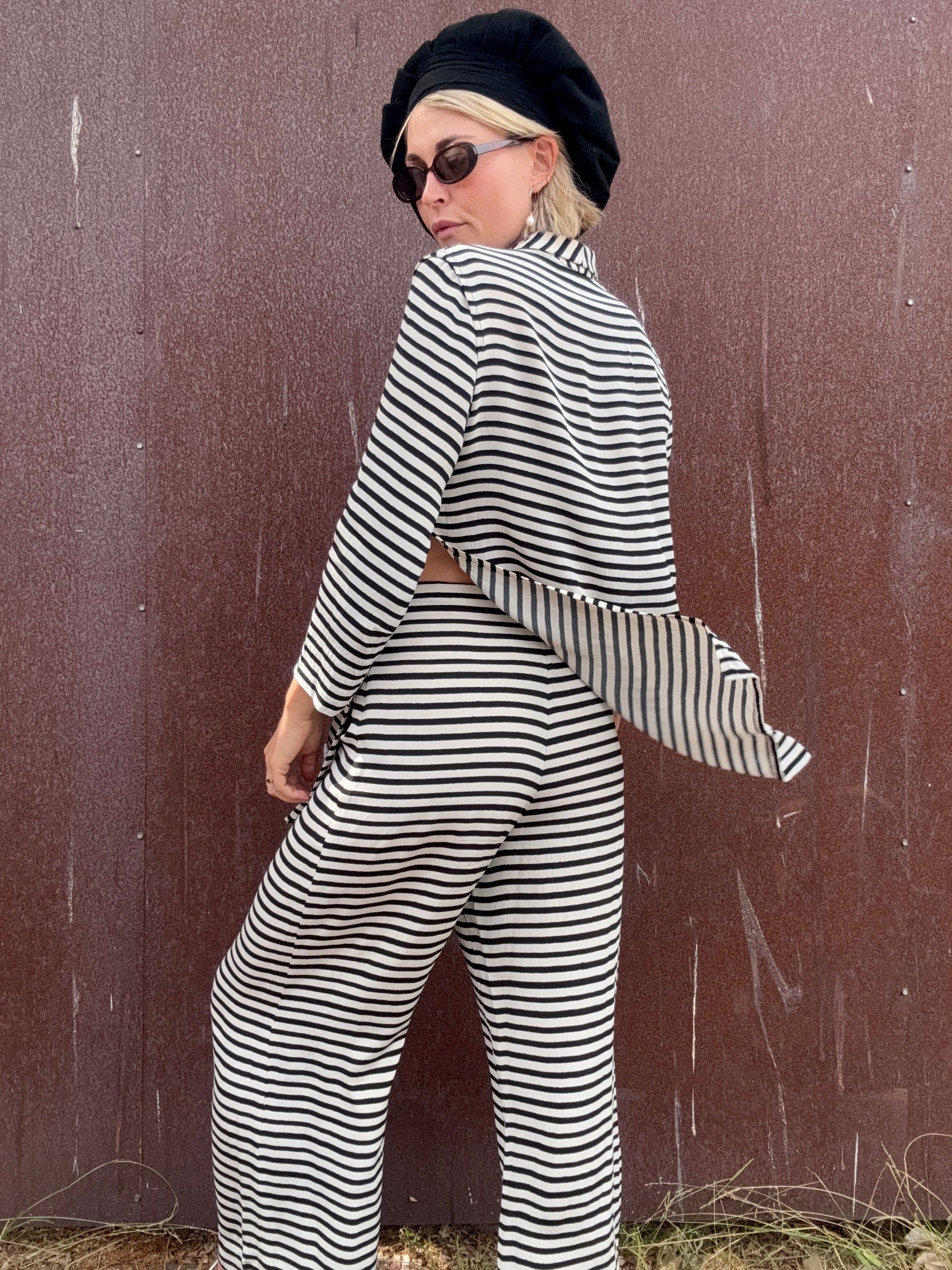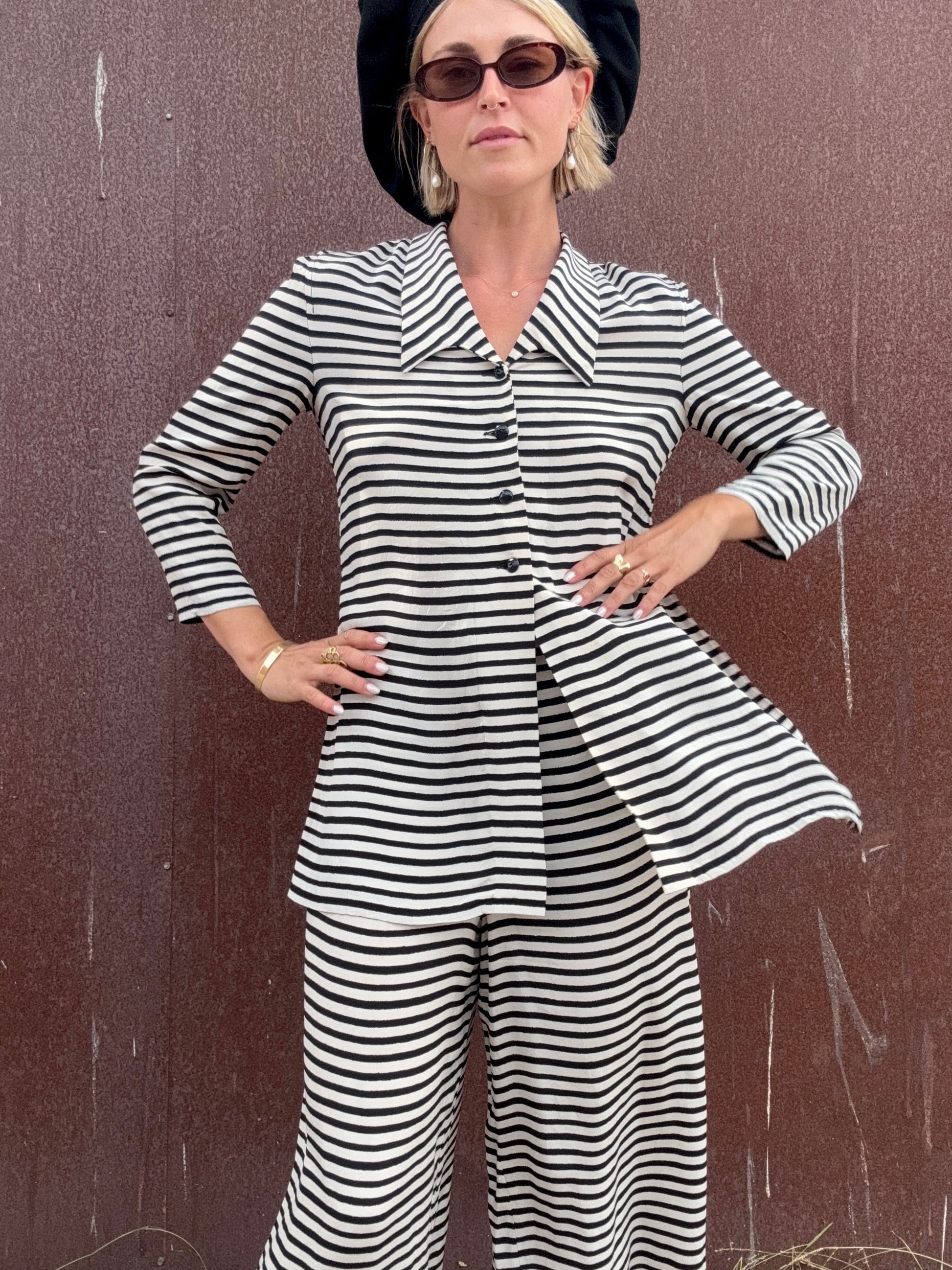 The Sonia Rykiel 1990s Striped Pant Set embodies vintage Parisian style with its effortless yet refined details. The blouse showcases a uniquely pointed collar, a button-up front, and panels that separate and open toward the bottom for added movement. The tailoring of this piece is what makes it so phenomenal and rare. This piece captures the heart of her 90s era: wearable art that’s both timeless and unconventional. Designed for the woman who values individuality, comfort, and a touch of wit, it’s as collectible as it is wearable. The matching wide-leg pants feature a front zipper and ties, functional front pockets, and a fluid drape that creates both comfort and elegance. Rendered in black-and-ivory stripes, this set offers timeless versatility for both day and night.