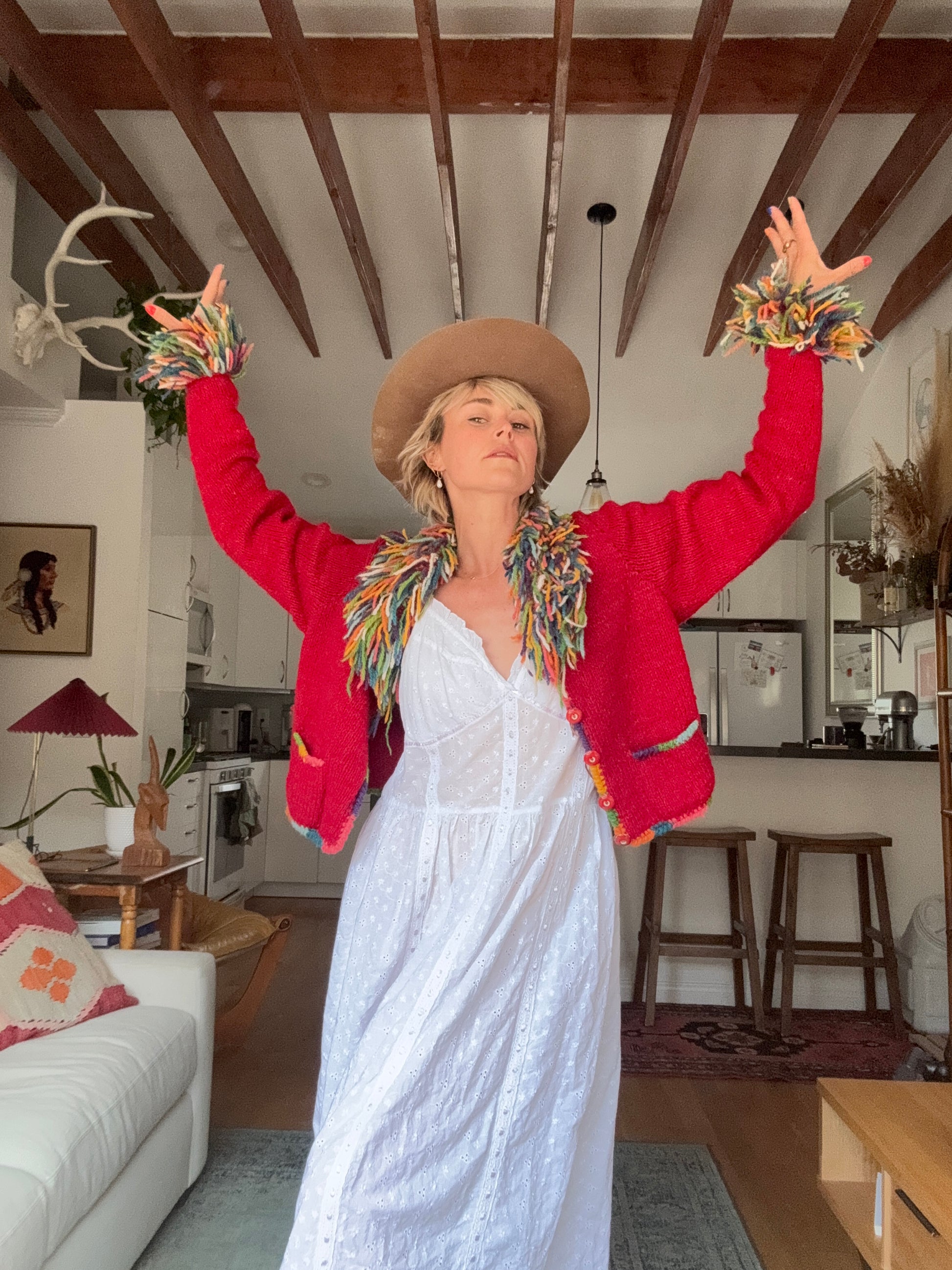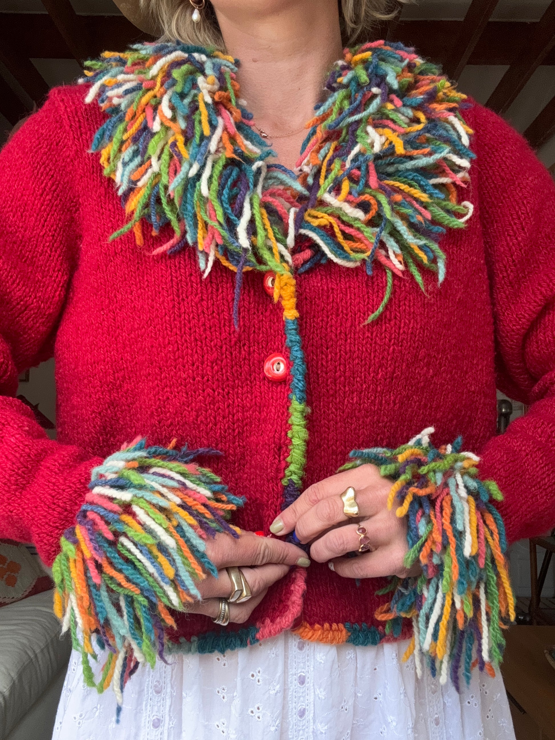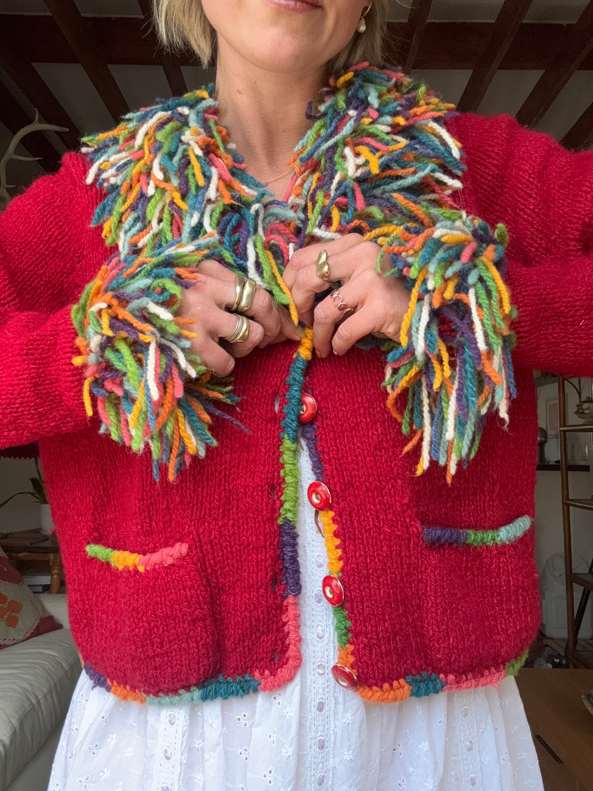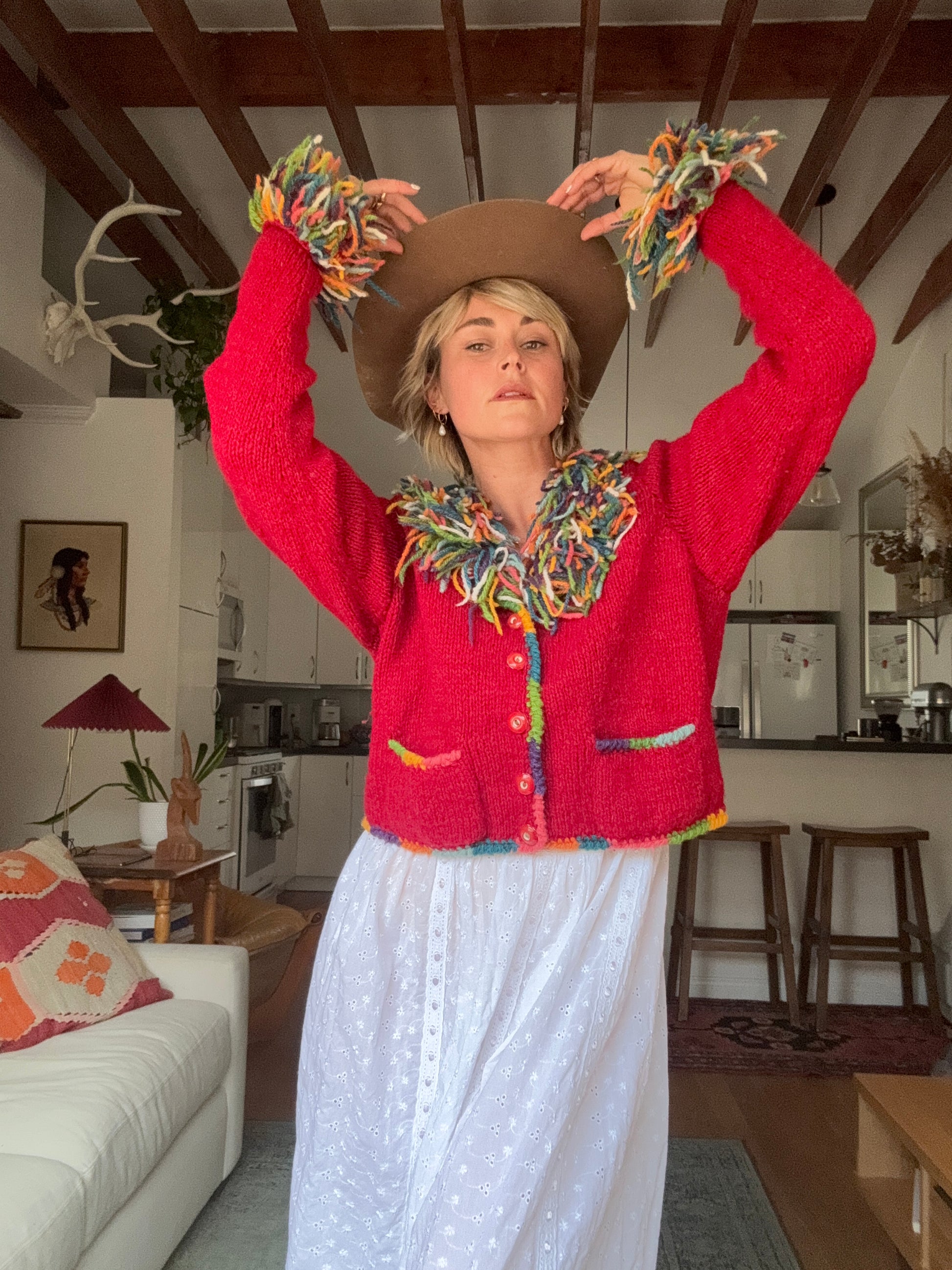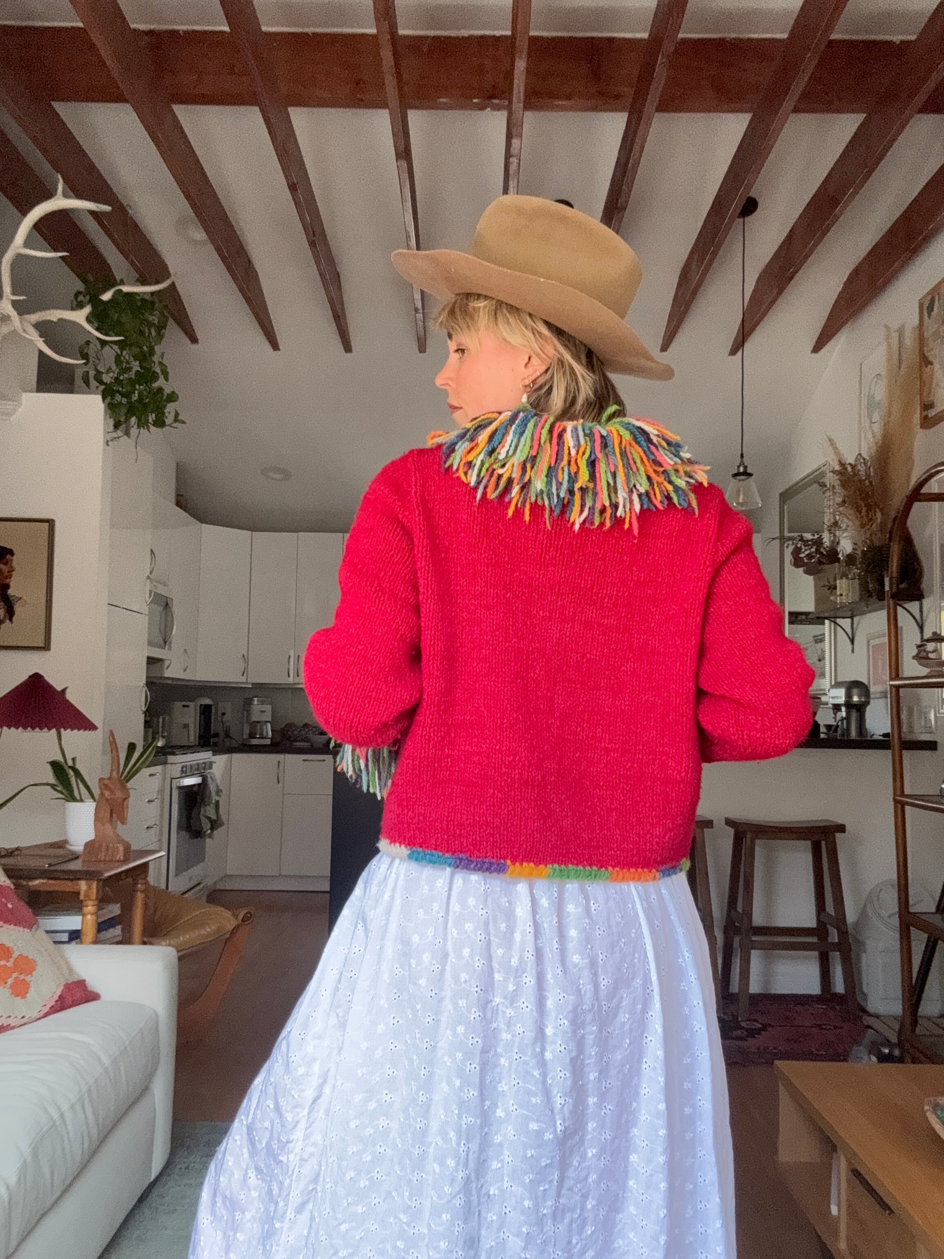 The Tessa 1980s Wool Cardigan Sweater is a joyful statement piece knit from 100% wool by Amano. Bright rainbow fringe trims the collar and cuffs, adding playful texture against the vibrant cherry red body. Finished with handpainted ceramic buttons and front patch pockets, this soft, cozy cardigan brings major color and character. Layer it over a vintage slip dress and tall leather boots for early spring, or pair with wide-leg trousers and a simple tank for a colorful yet balanced day look.