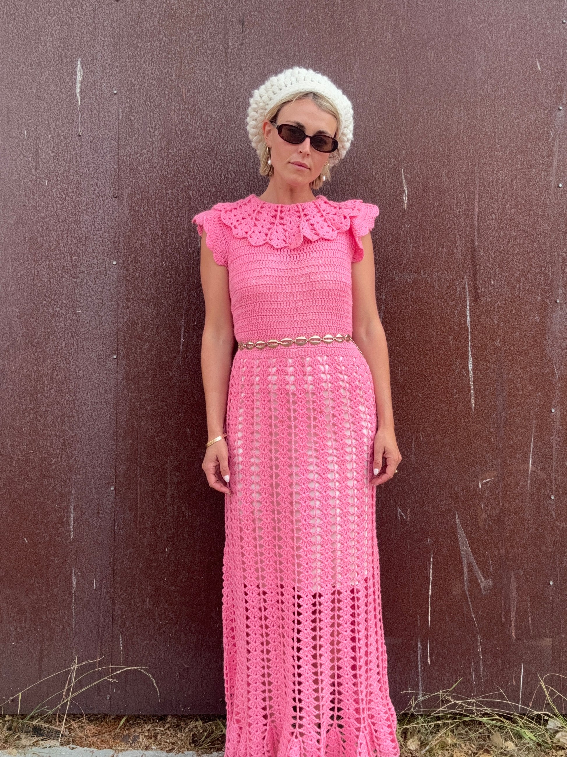 The Valentina 1960s Crochet Maxi Dress is hand-crocheted in a soft wool that feels gentle against the skin. It features a beautifully detailed floral yoke and a vertical open-stitch skirt that gives the piece graceful movement. The dress is unlined with a clean back zipper closure for easy wear. Style it layered over a silk slip with heeled sandals, or embrace the heavyweight crochet texture by pairing it with a wide leather belt and boots.